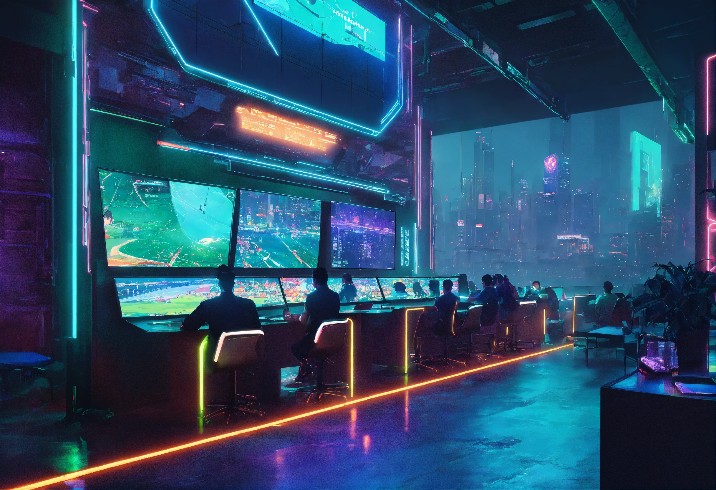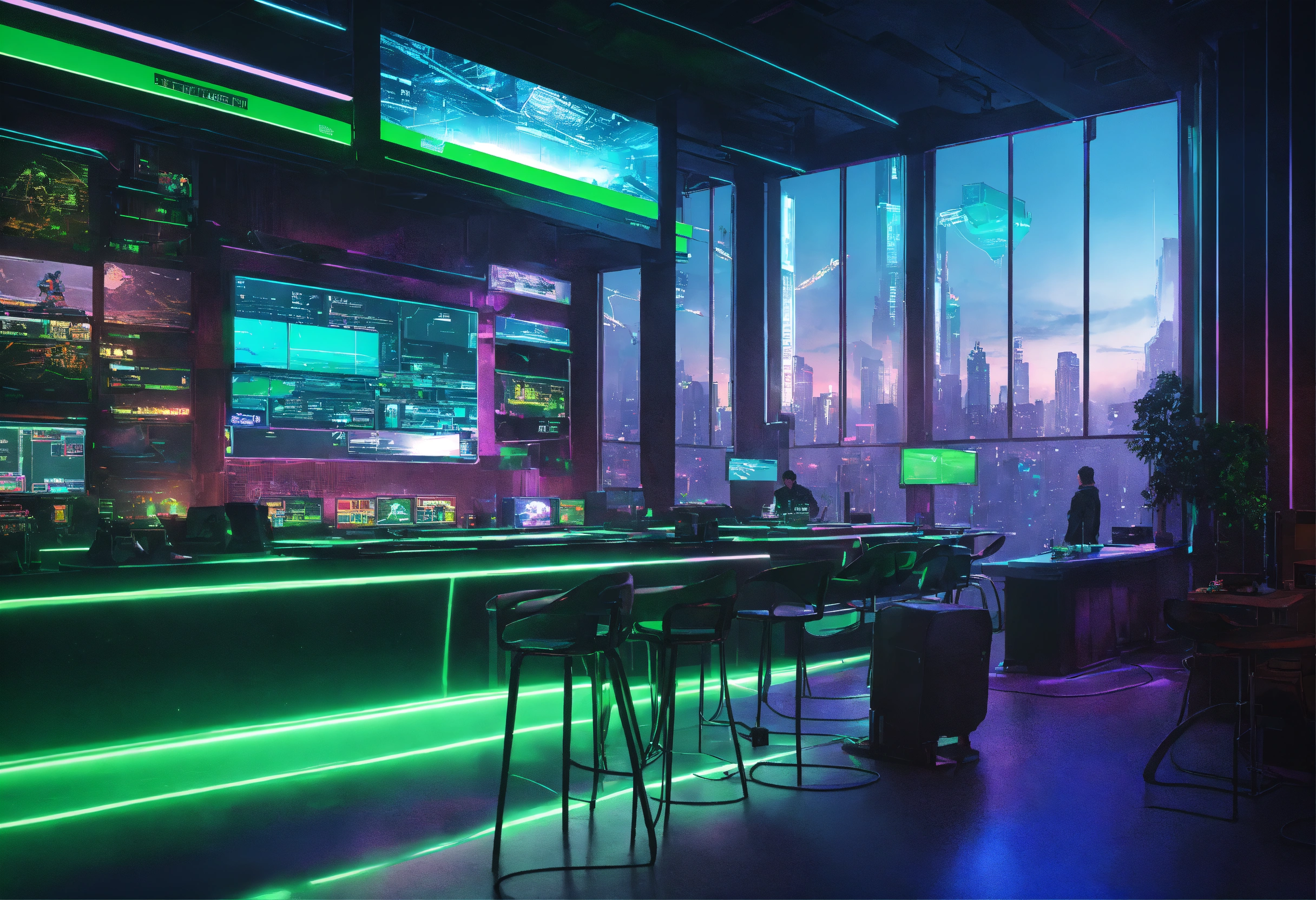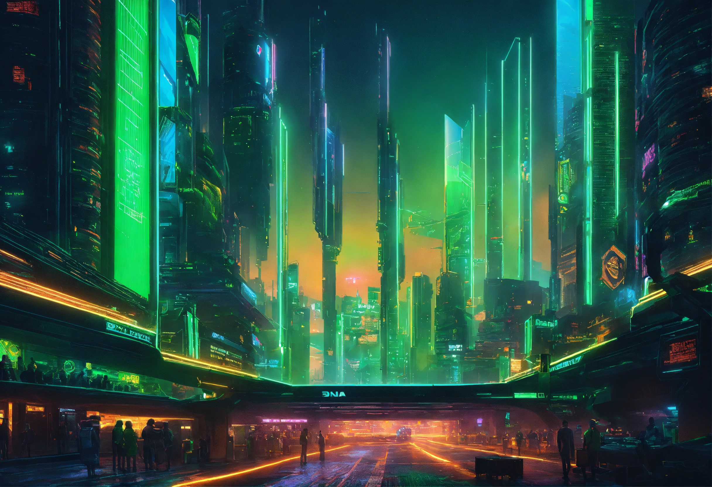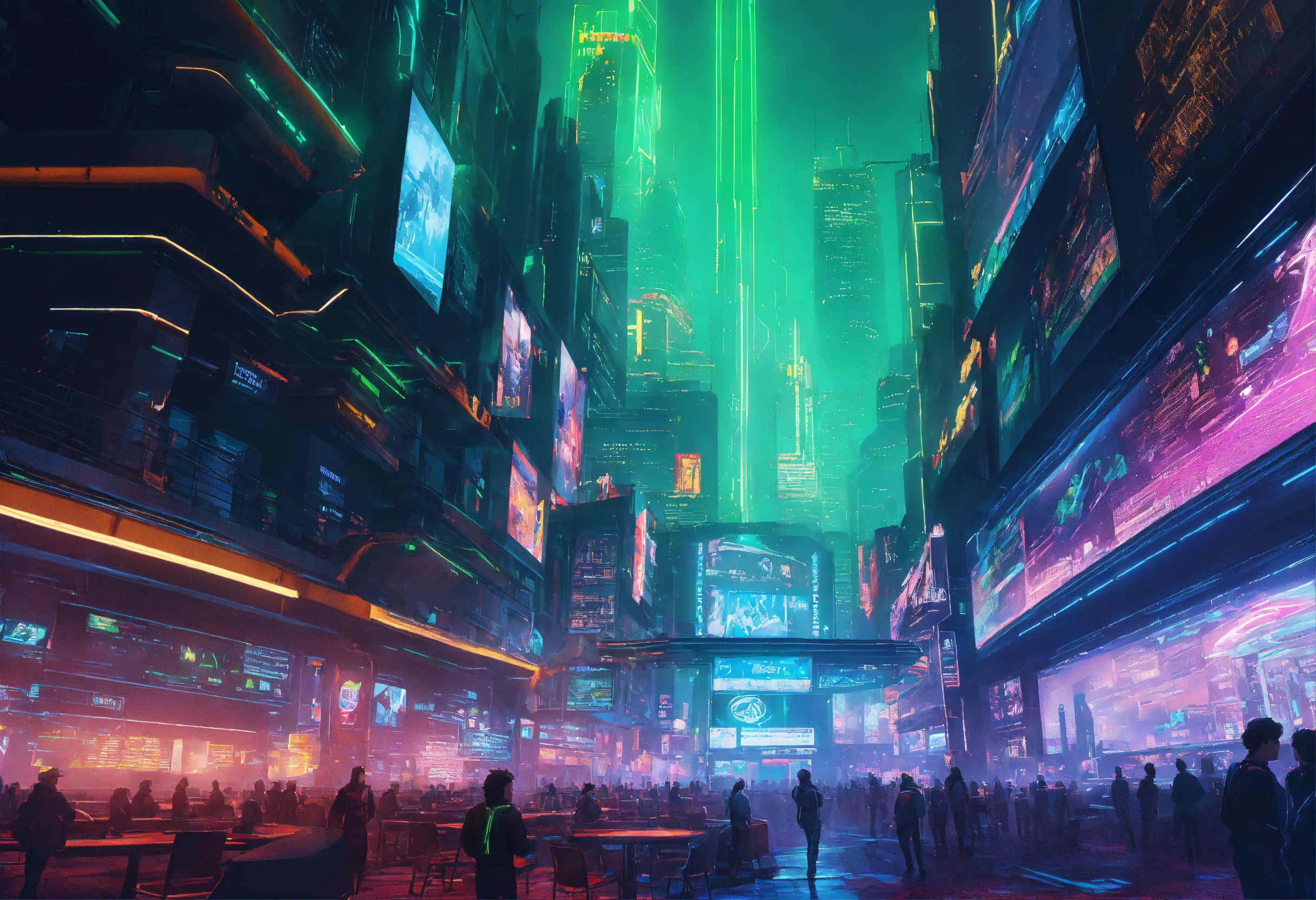 Create an image that embodies a cyberpunk aesthetic for an exclusive community of sports bettors as part of my course. the image should combine elements of a futuristic cityscape at night, with electric neon lights in green and blue, it must have a crowd. feature futuristic screens and displays that show sports analytics and trading data. the overall atmosphere should be dynamic, sophisticated. 8k