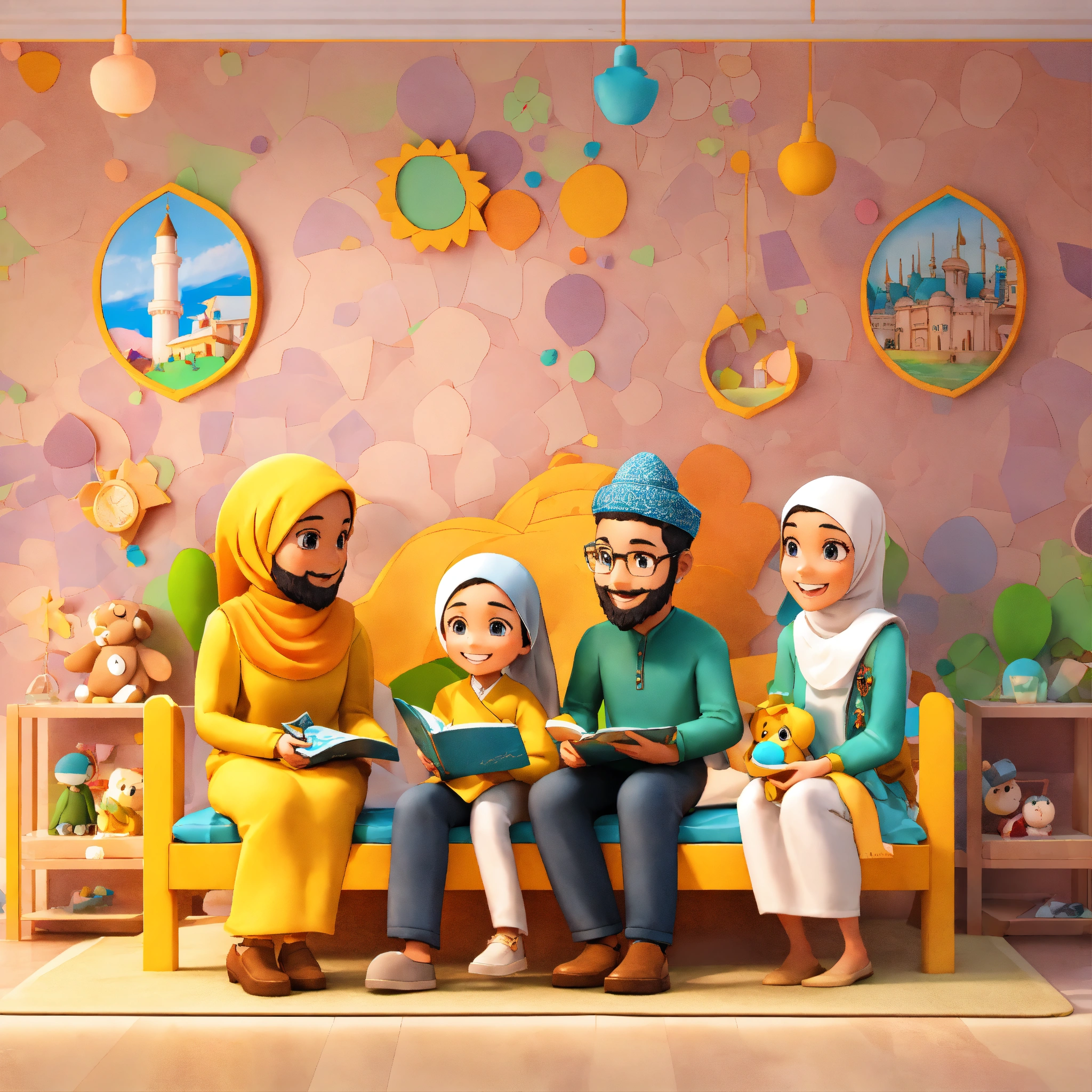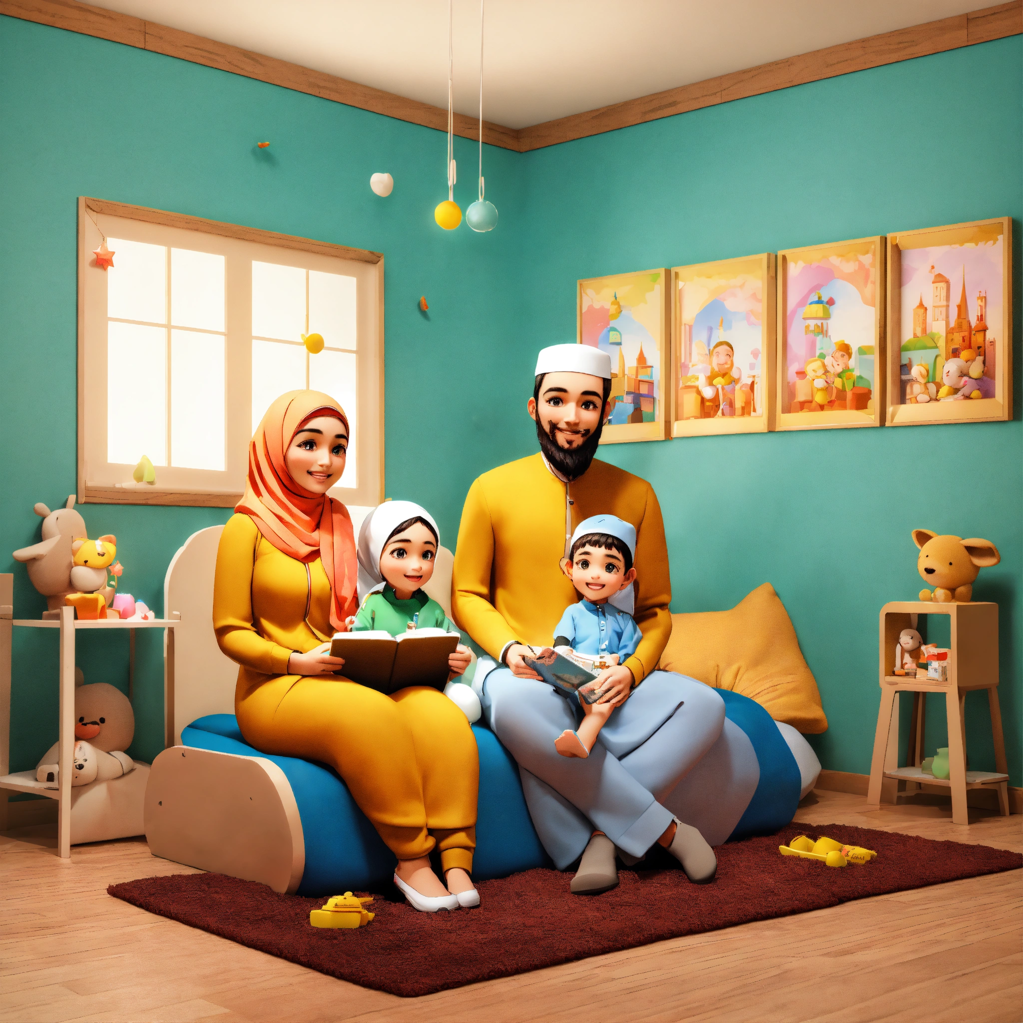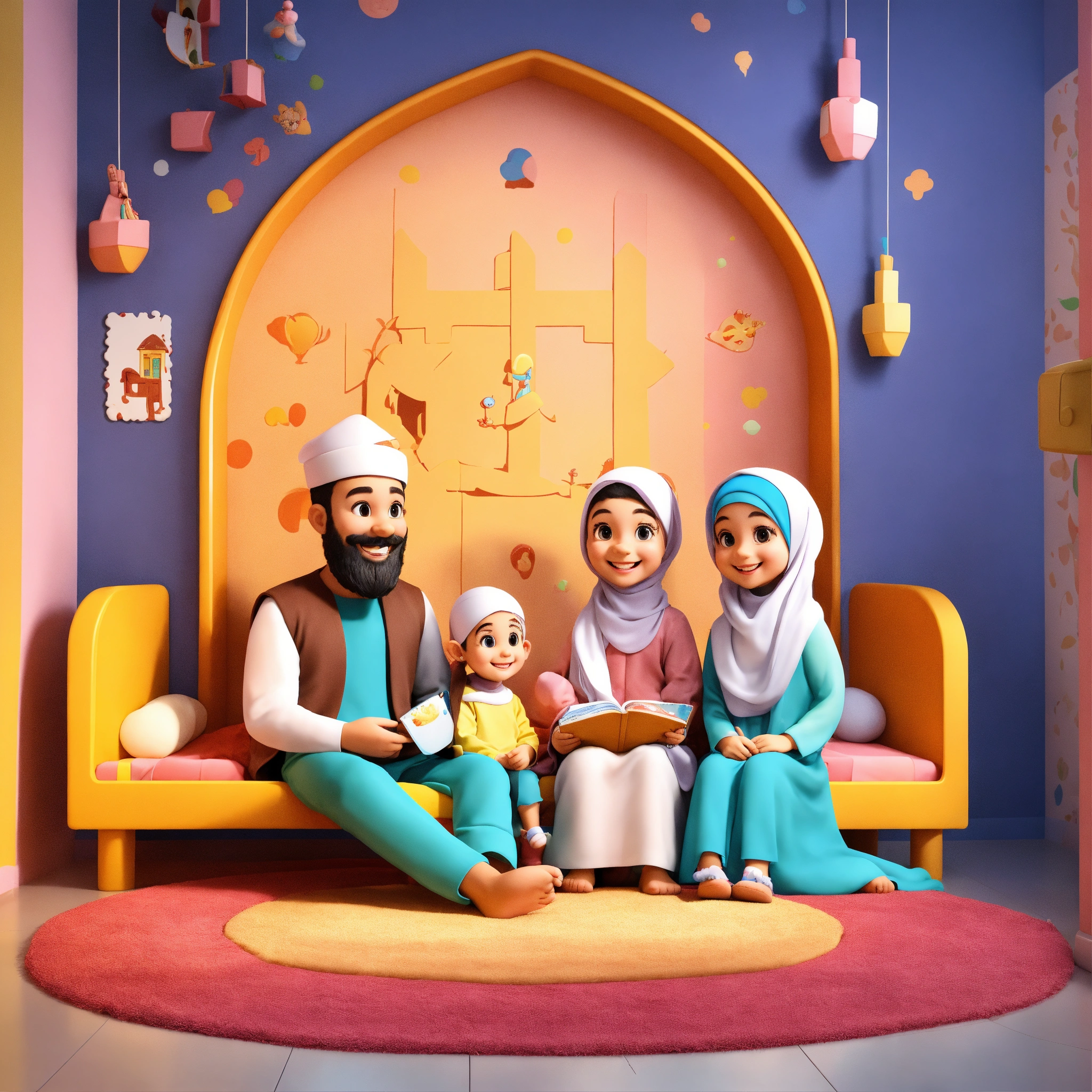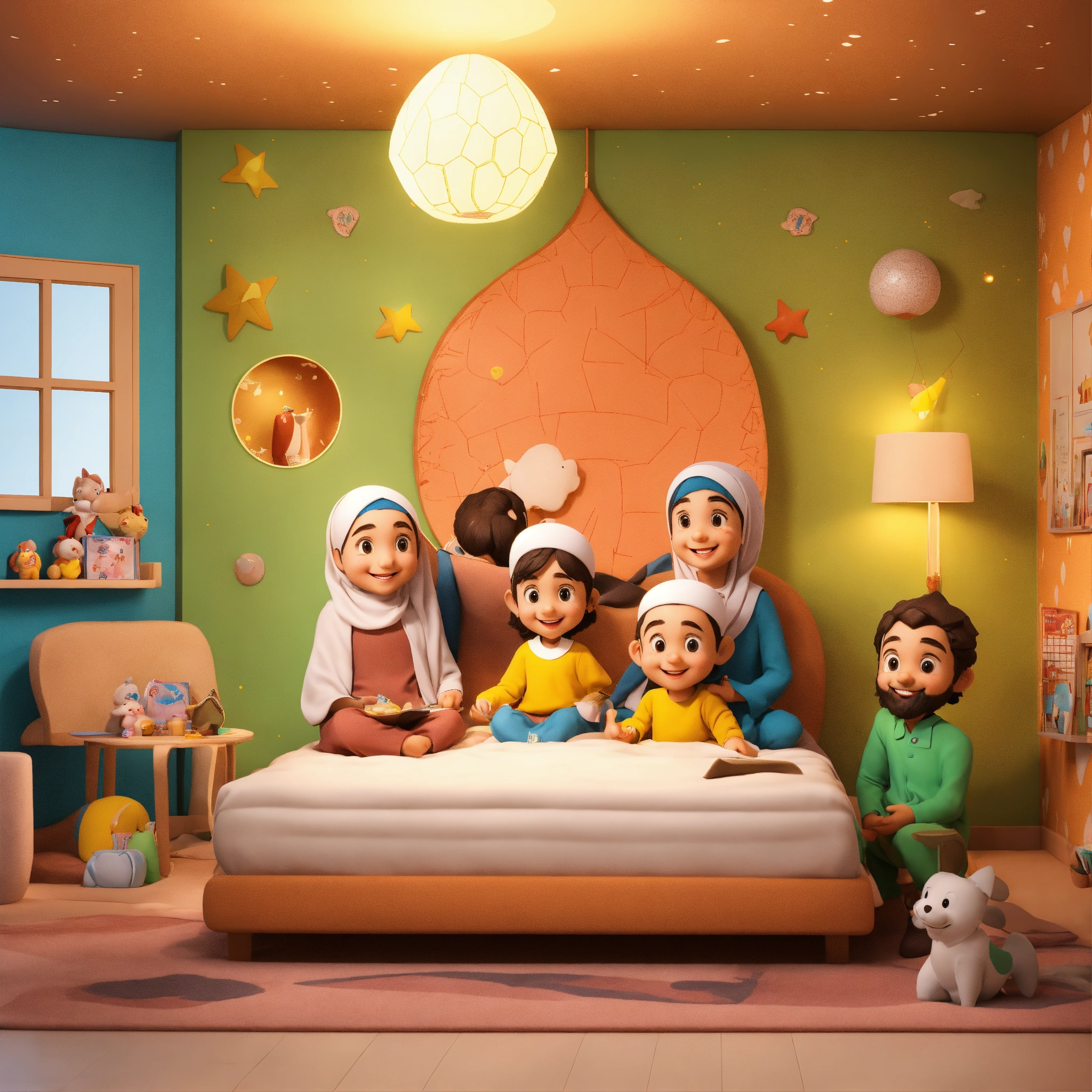 Family, muslim, 3d mascot, smiling, full body, telling stories about the prophet's friends in the children's room with bright wall colors and typical children's colors. the parents sat next to the child on the bed