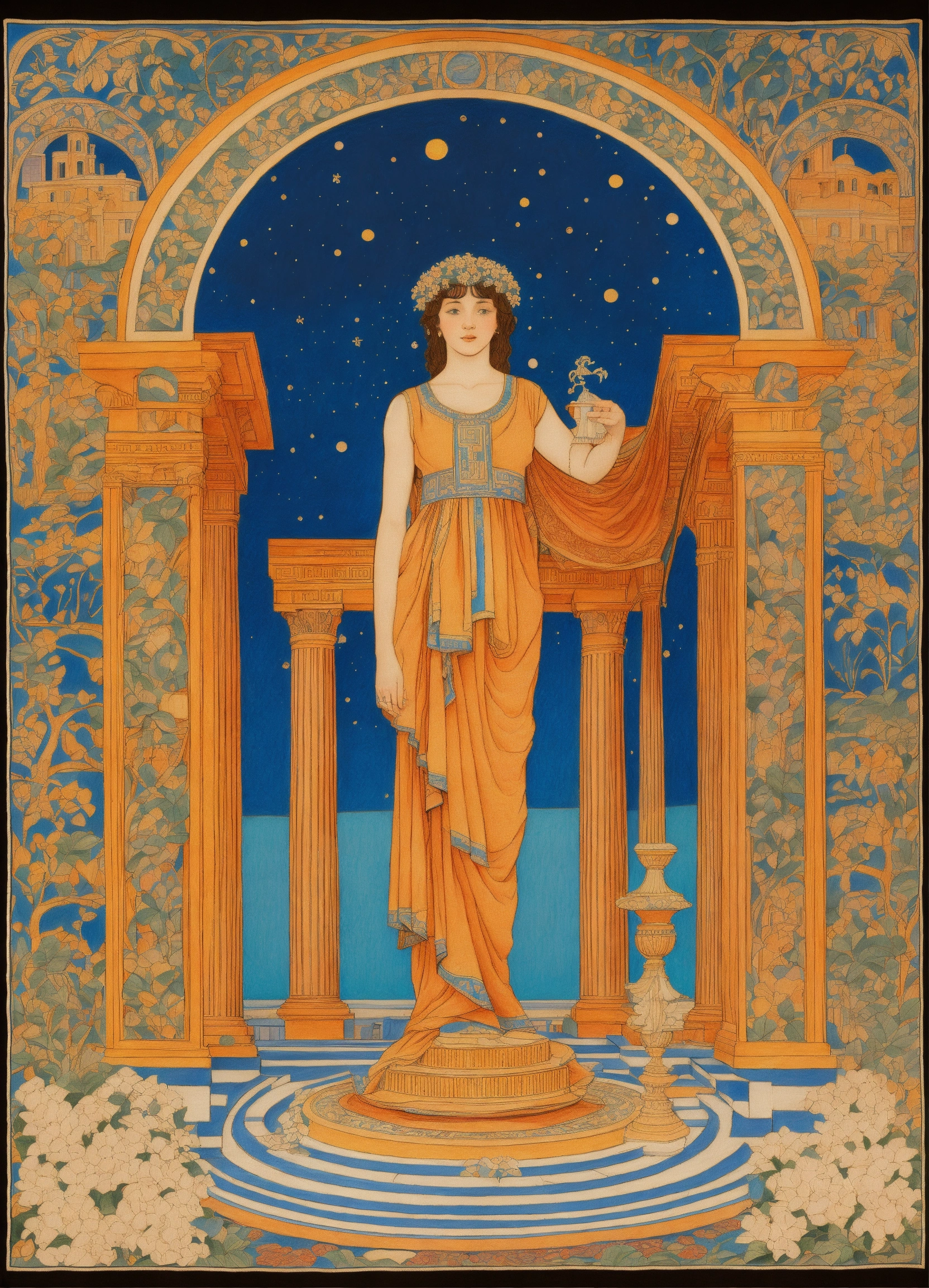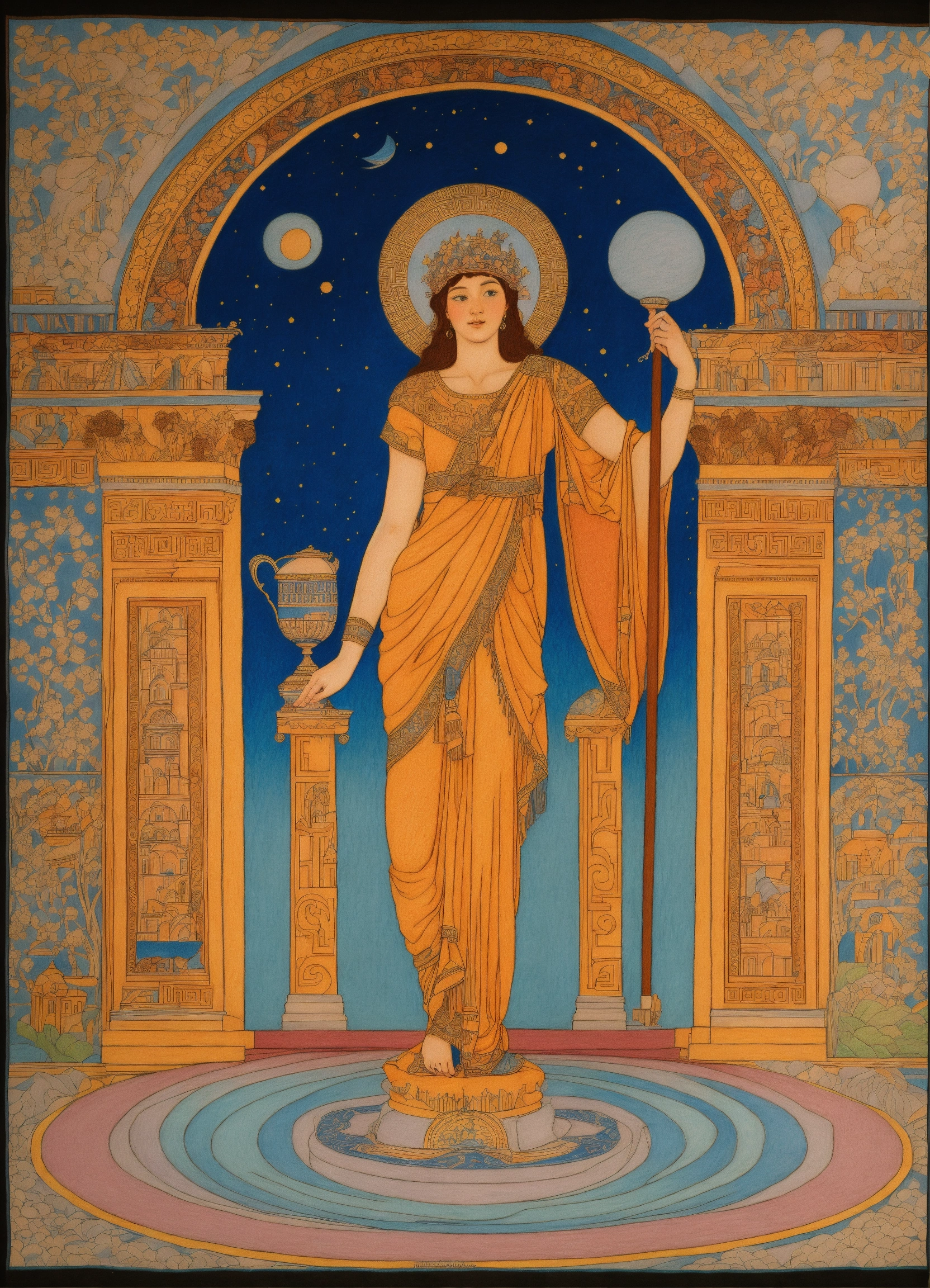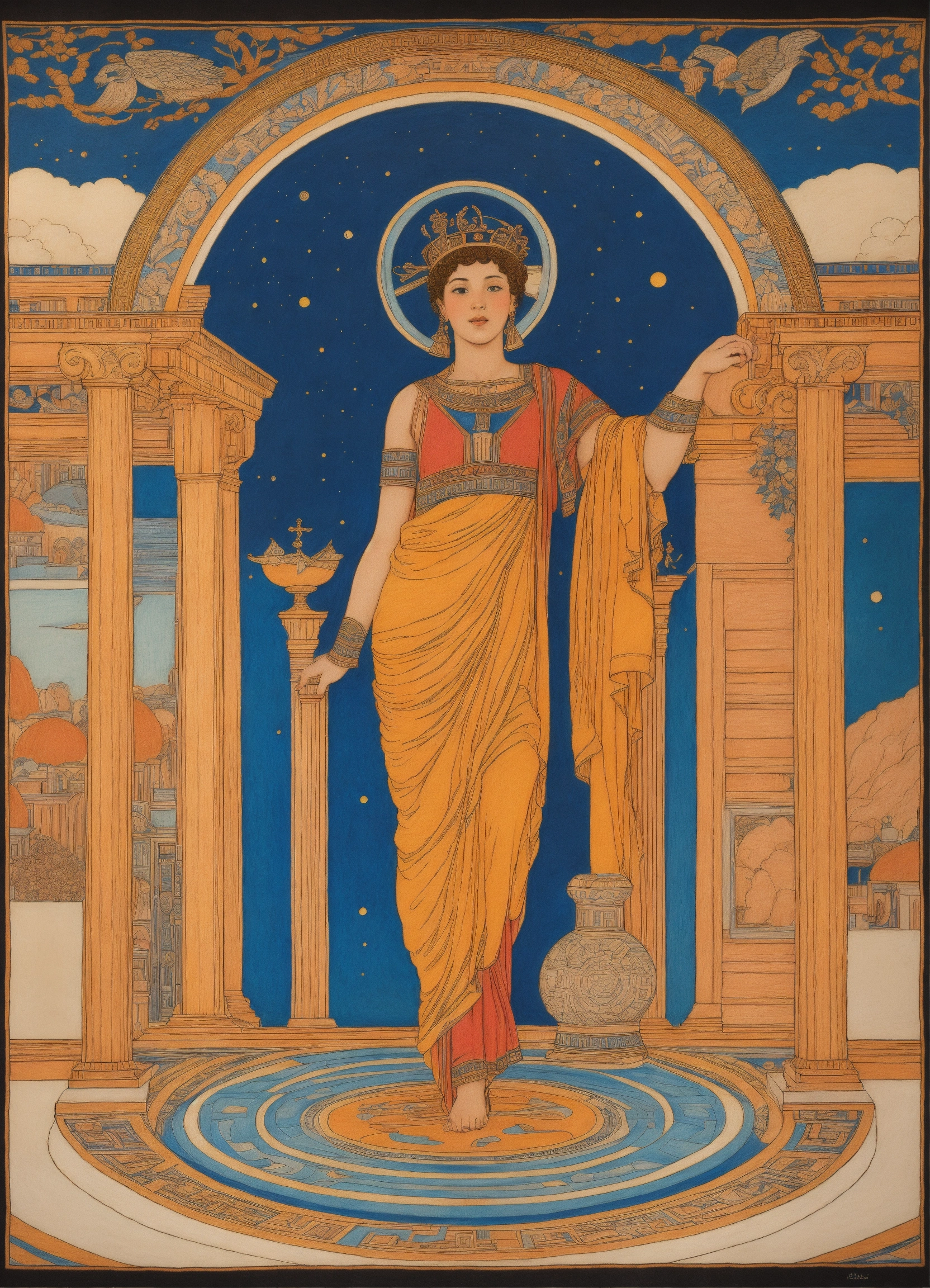 Traditional greek art drawing the greatness of the universe. line drawing, clean clear lines, coloring book style, bright colors, intricate details, greek tapestry elements, elegant, magical, serene, fine details, pastel pencils, winsor mccay style