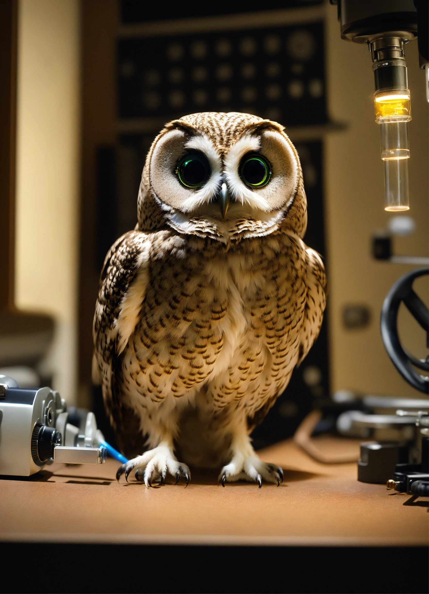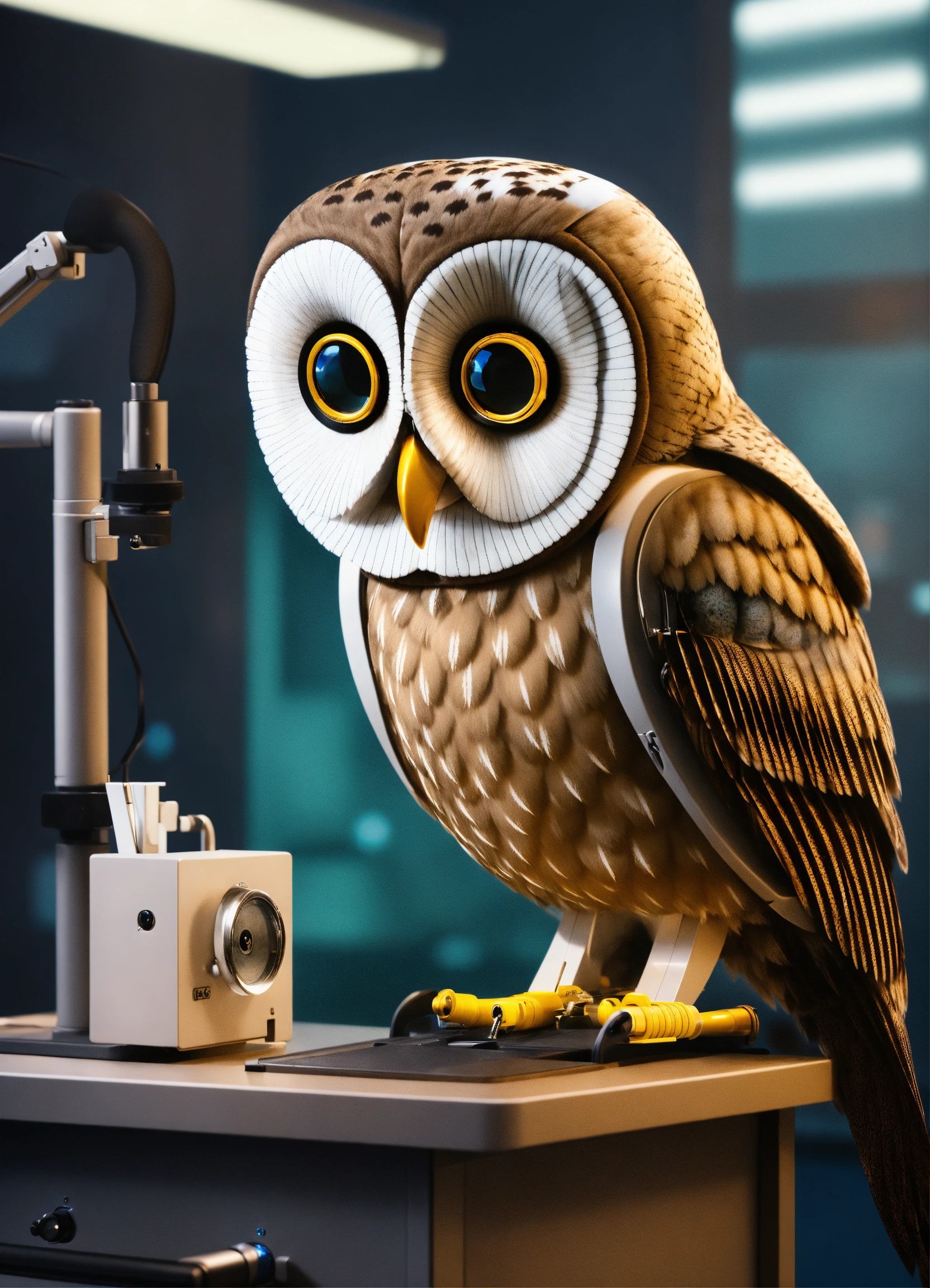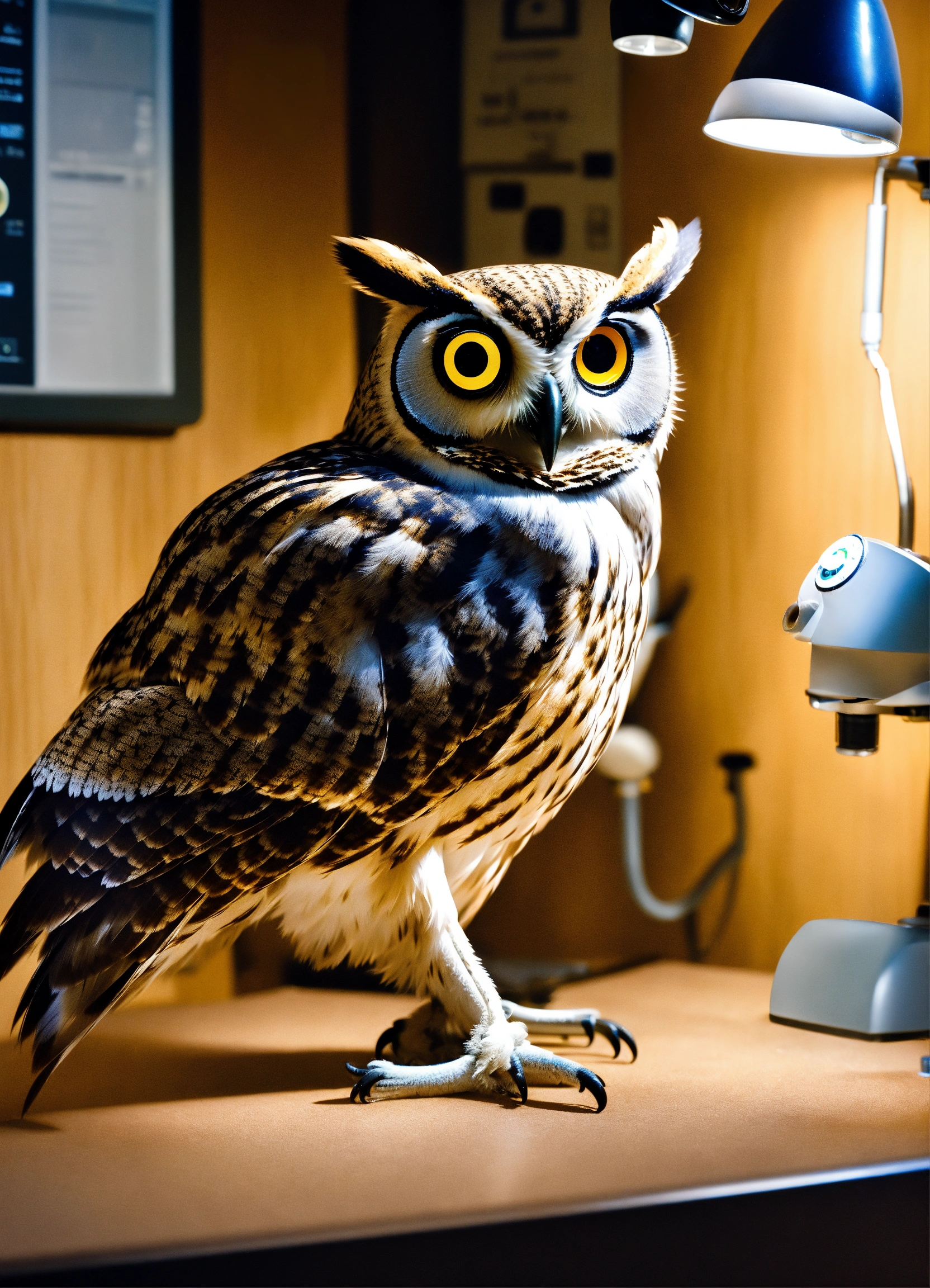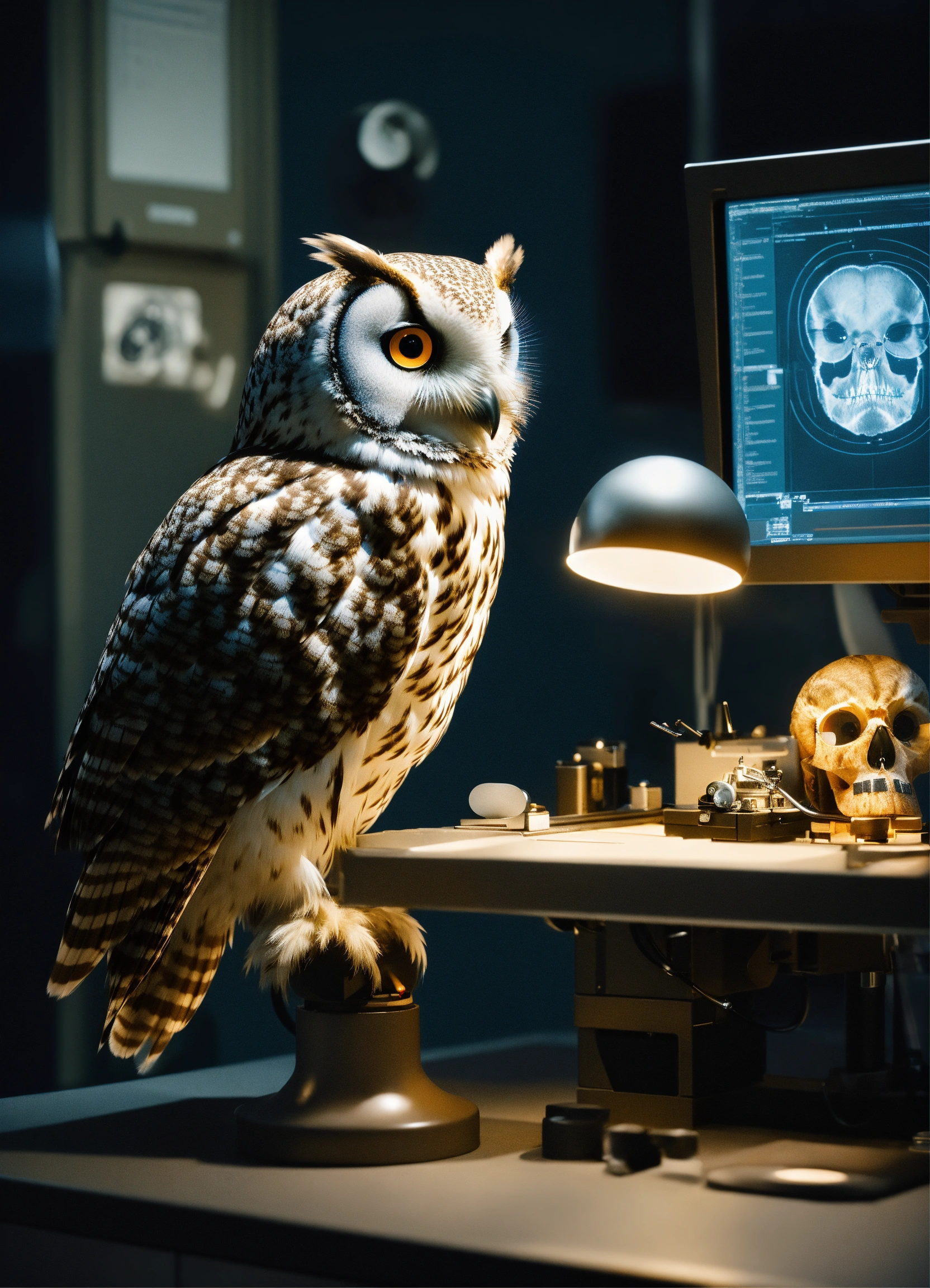 A photo-realistic owl with a monocle working as a radiologist at a radiology workstation looking at a lateral skull radiograph