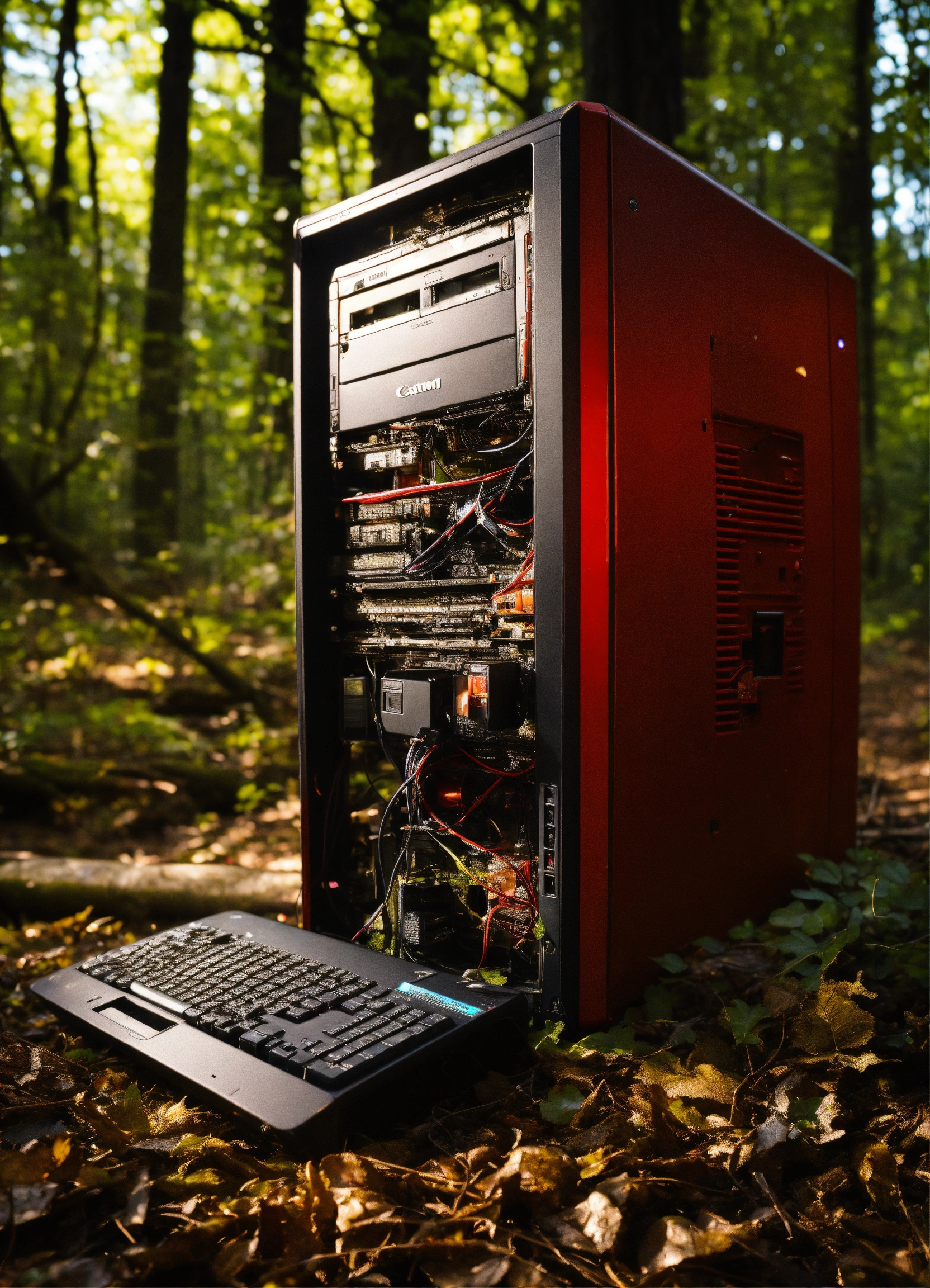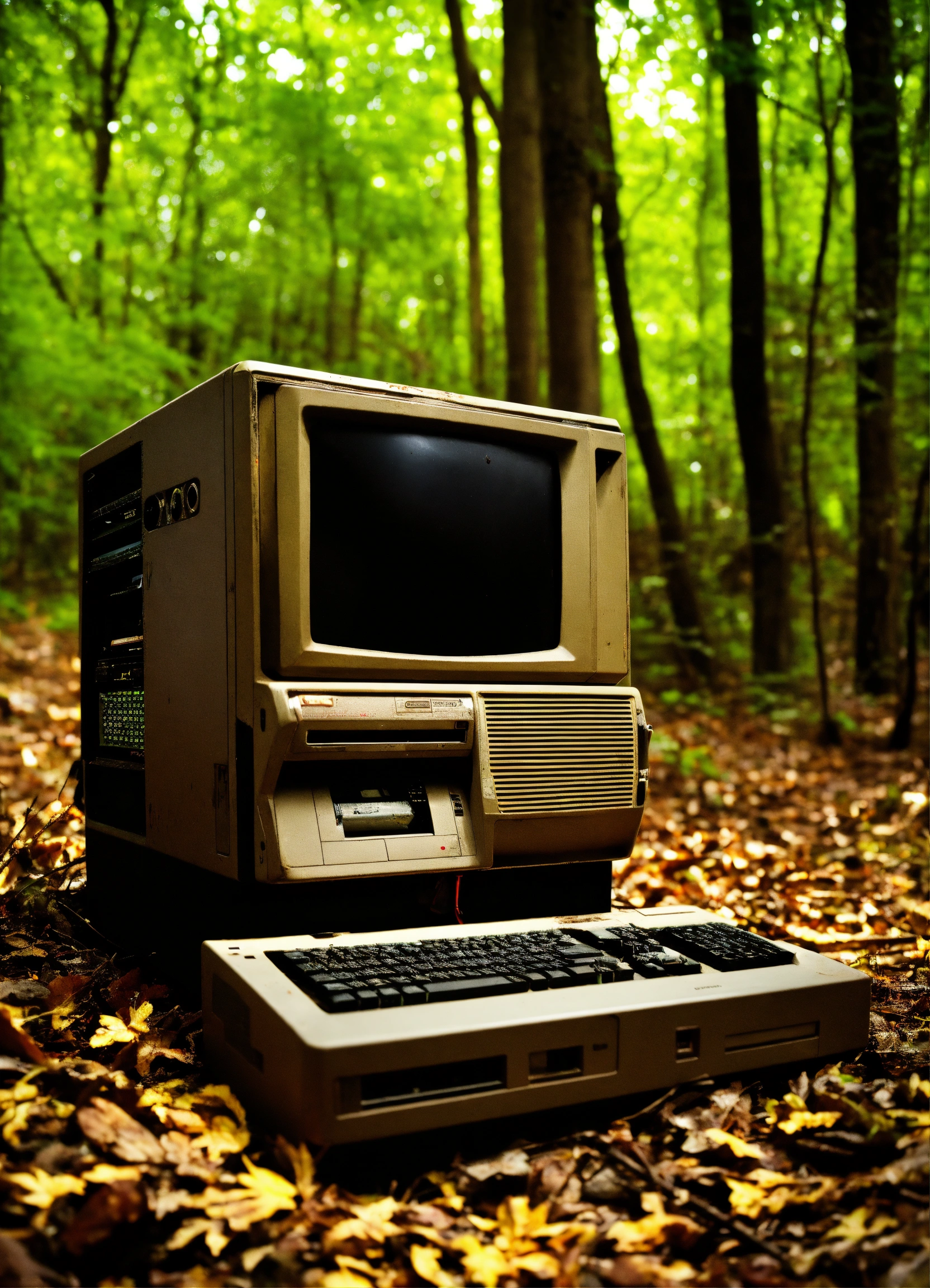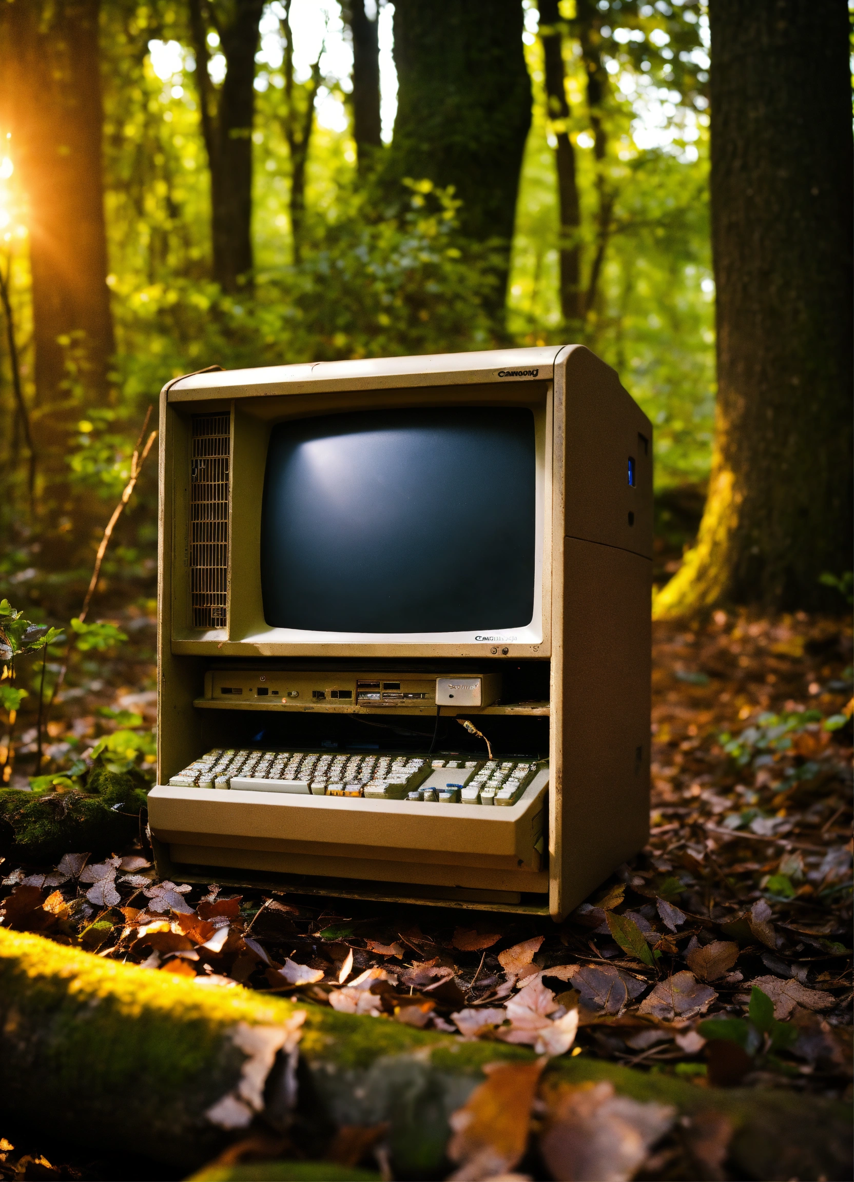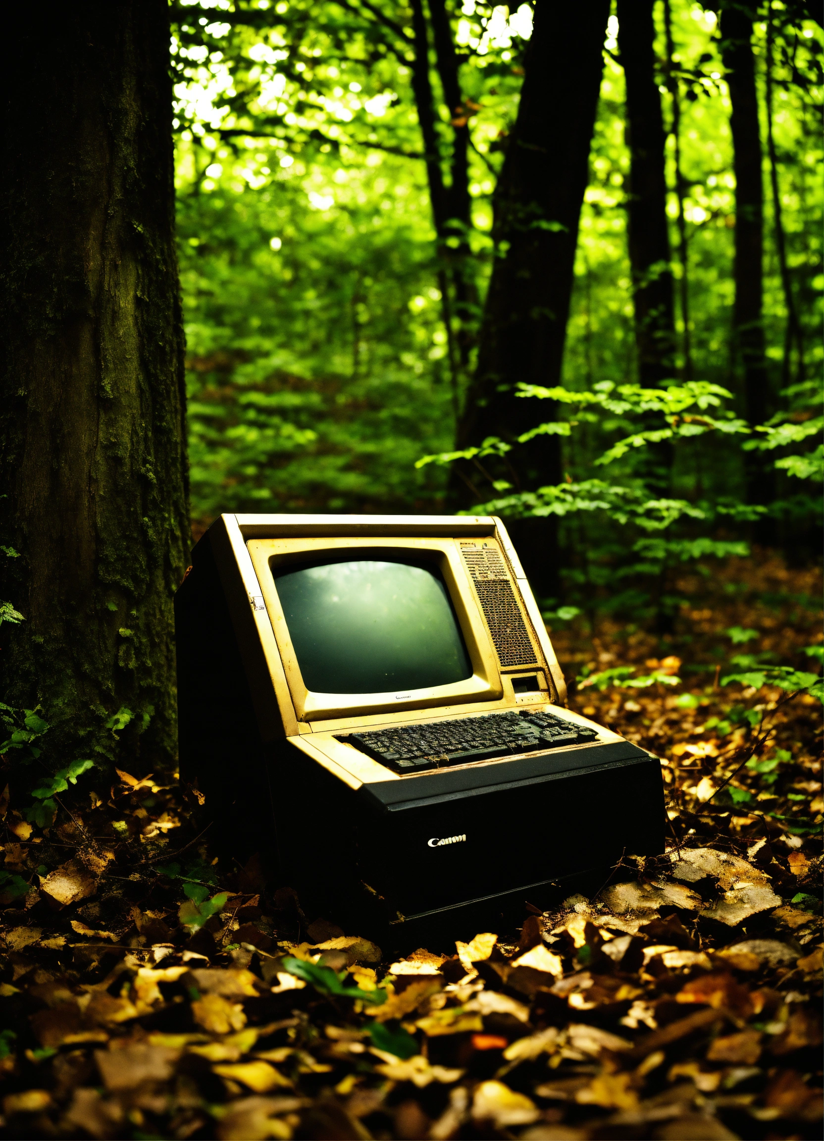 Compaq desktop computer abandoned in the woods, canon eos 5d, extremely intricate detail, dramatic lighting