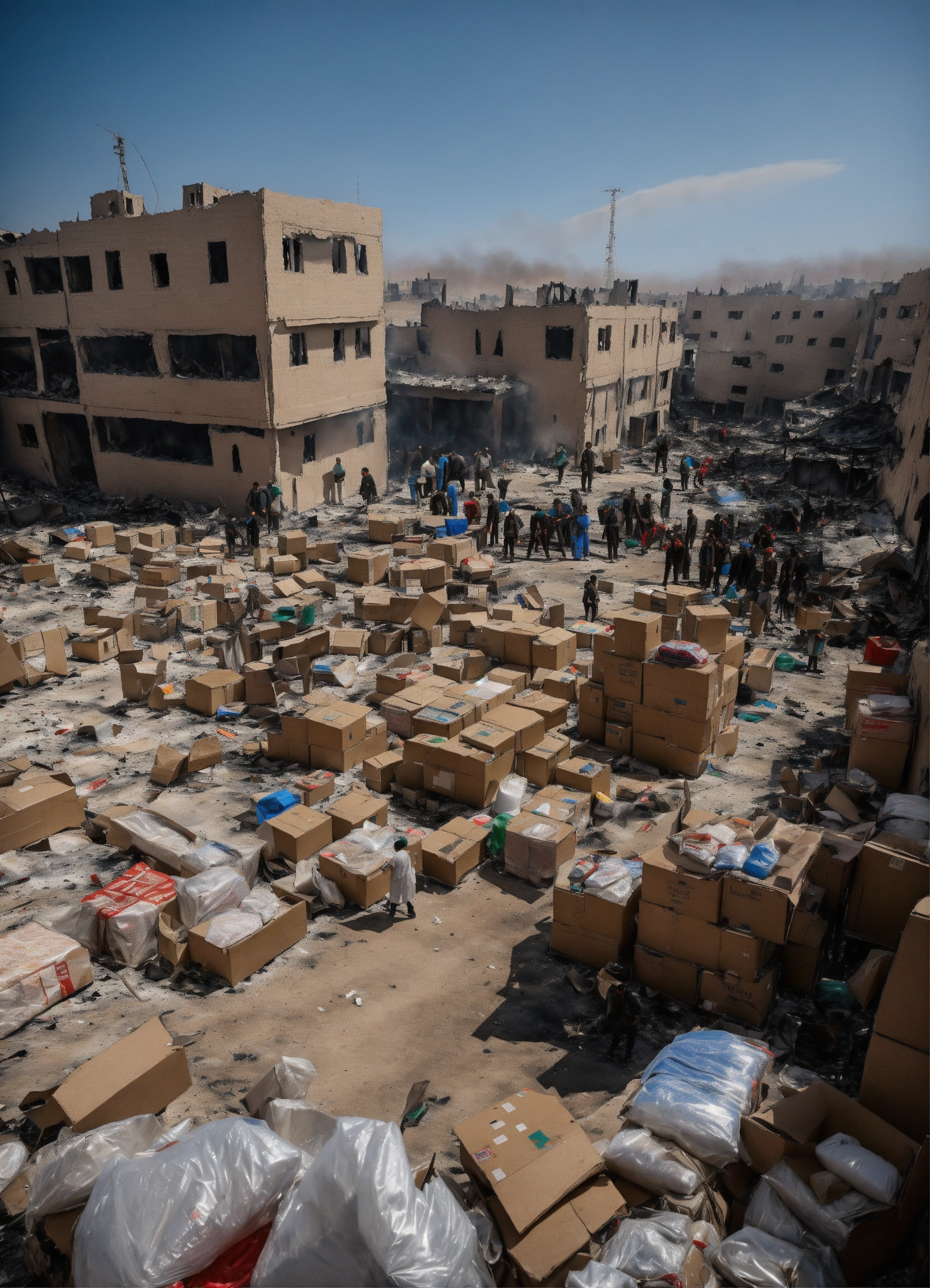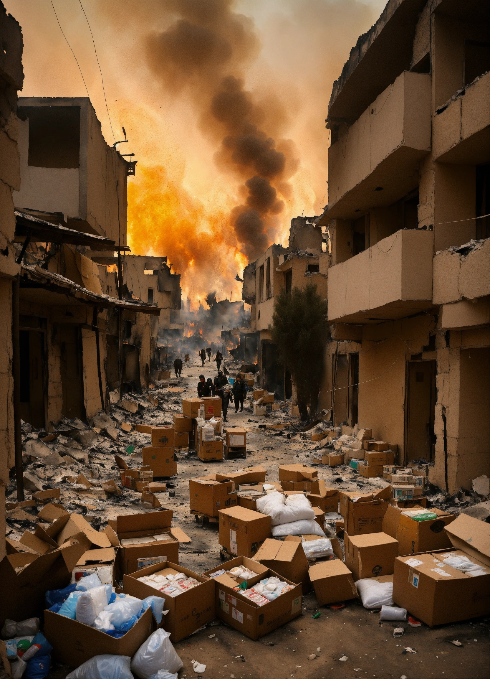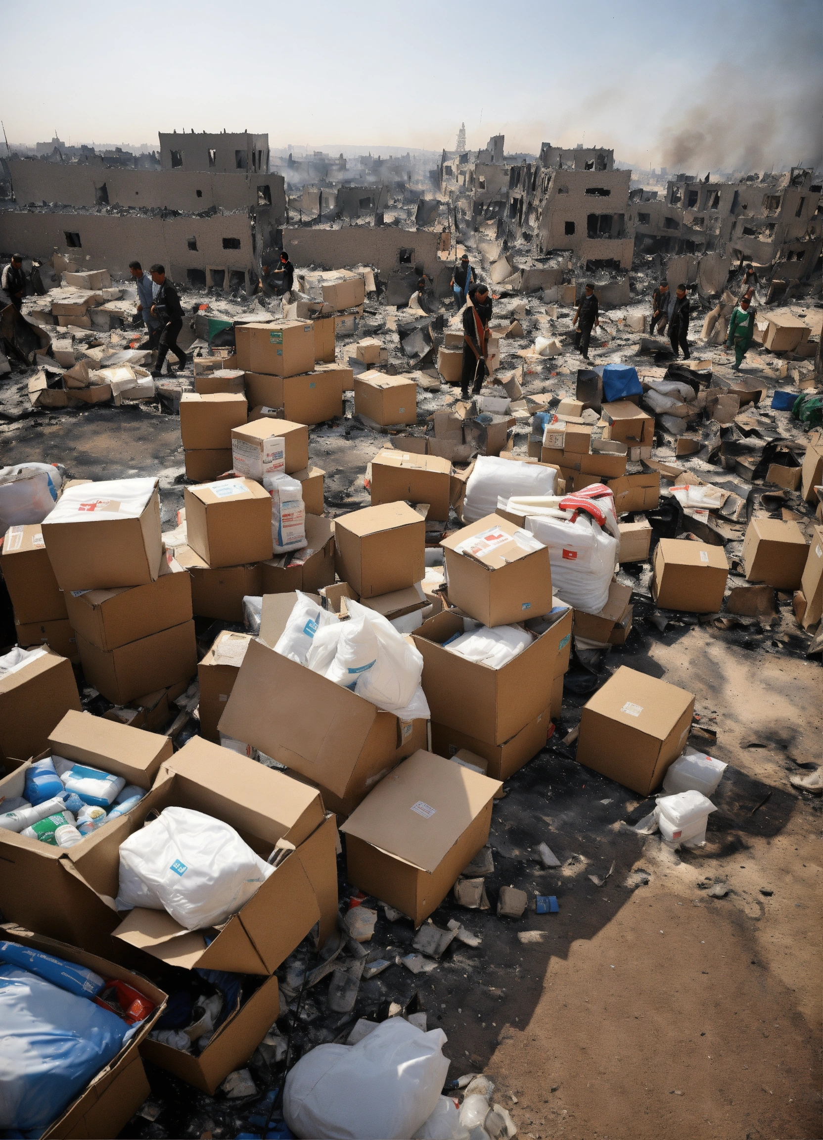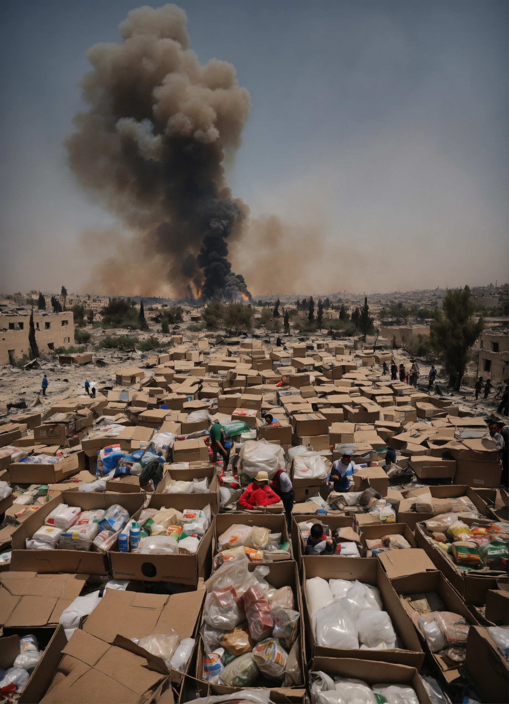 "amid the destruction and fires resulting from war and aerial bombardment, boxes of humanitarian aid filled with medical supplies, food, and essentials reached the palestinians who are suffering from a siege and constantly under rocket and aerial attacks."