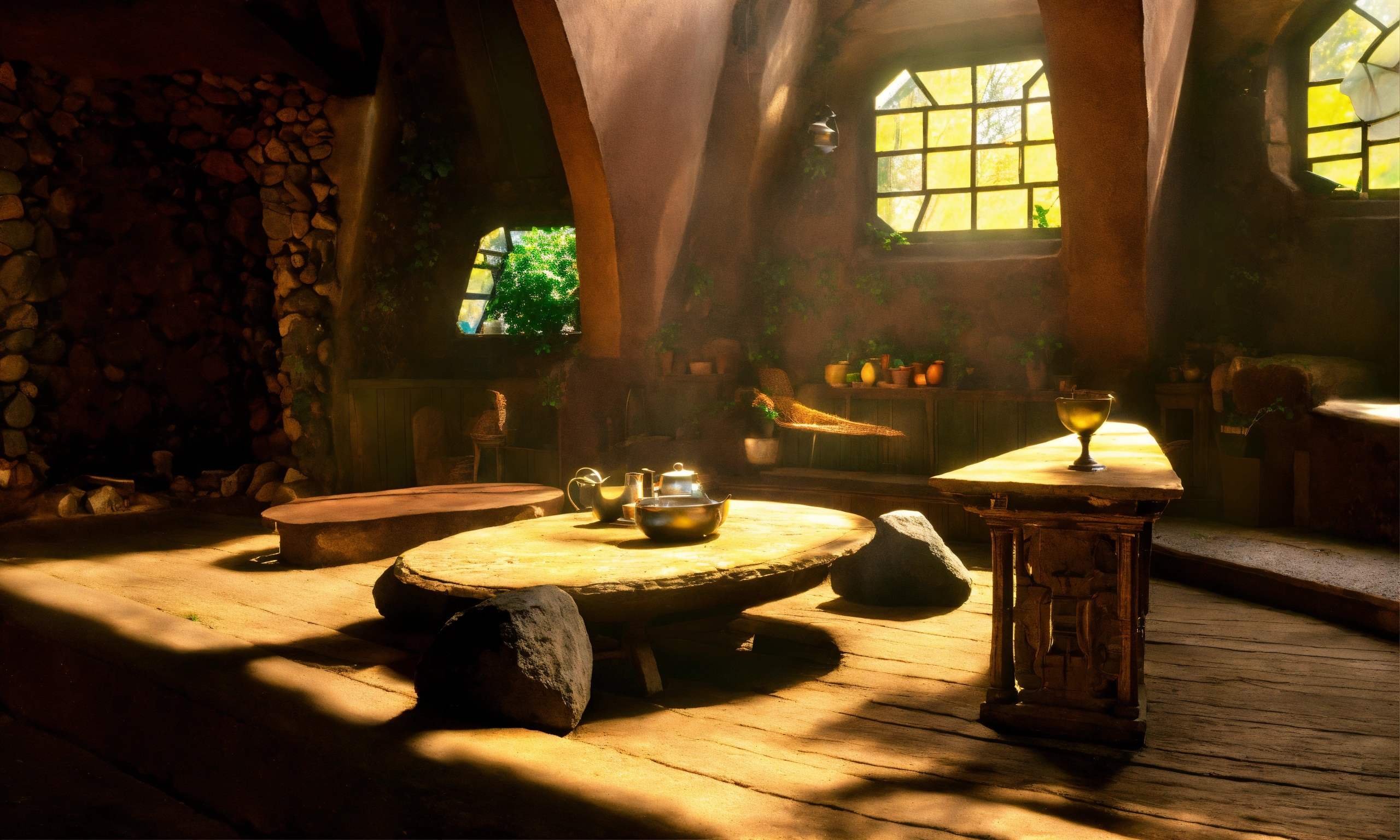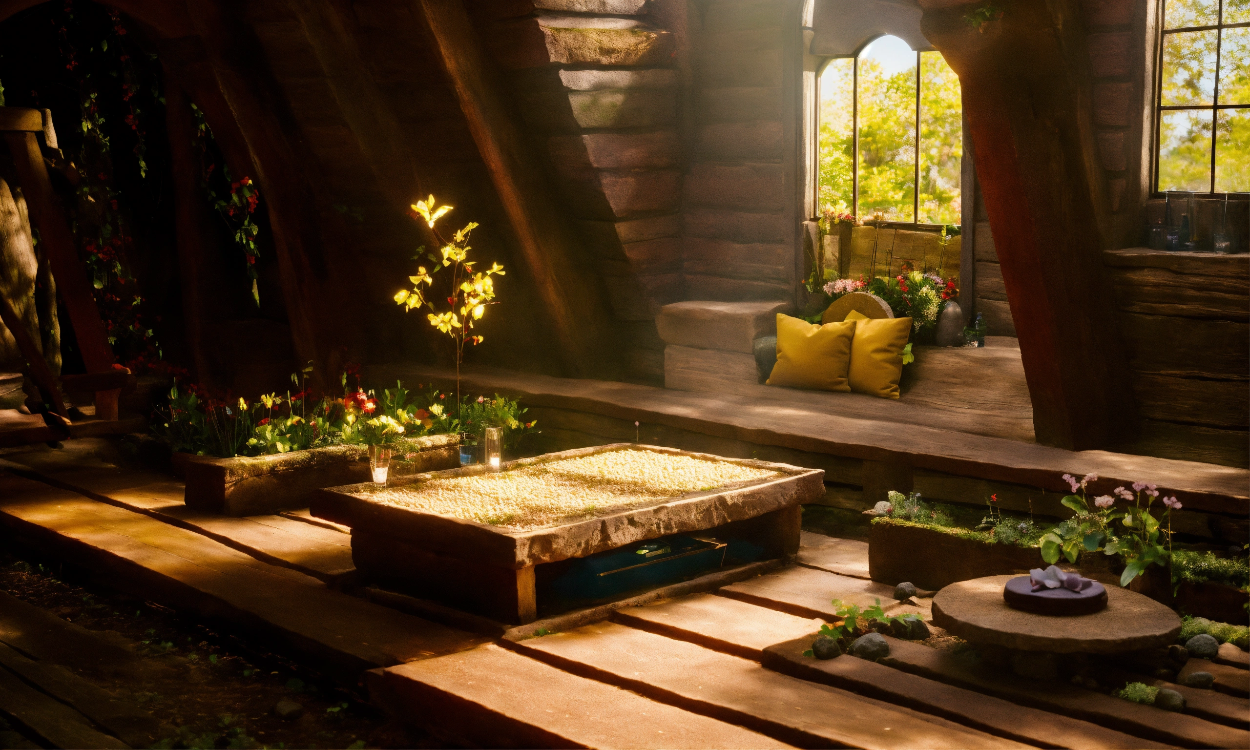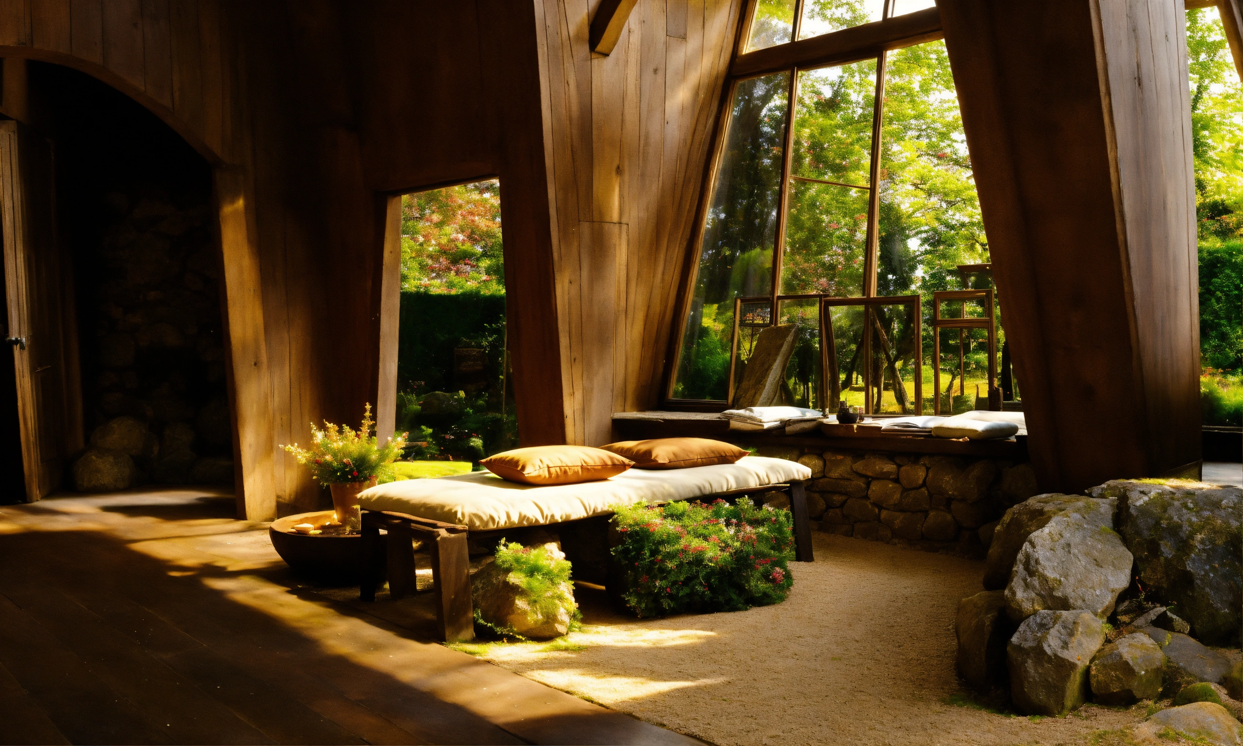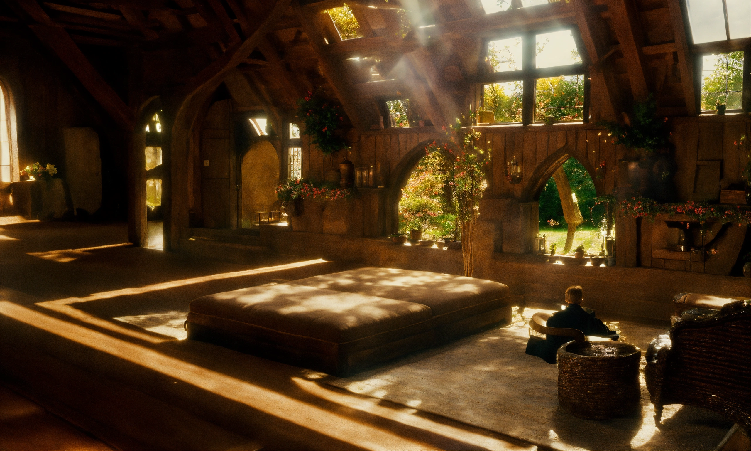 "the rounded attic window showcases the vast estate gardens, foreshadowing a place of later events, with a gravel path leading to a secluded spot surrounded by trees and a stone bench."