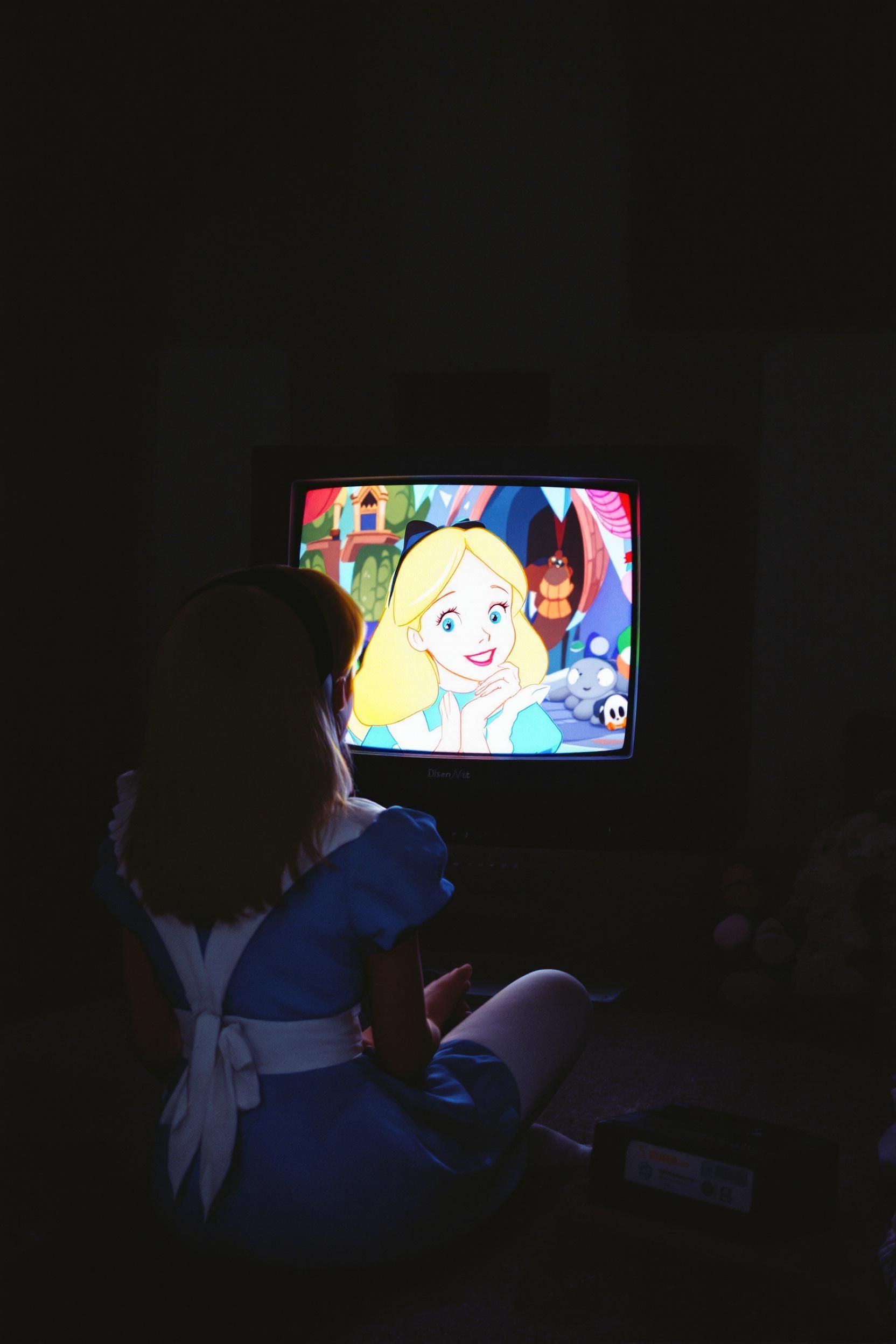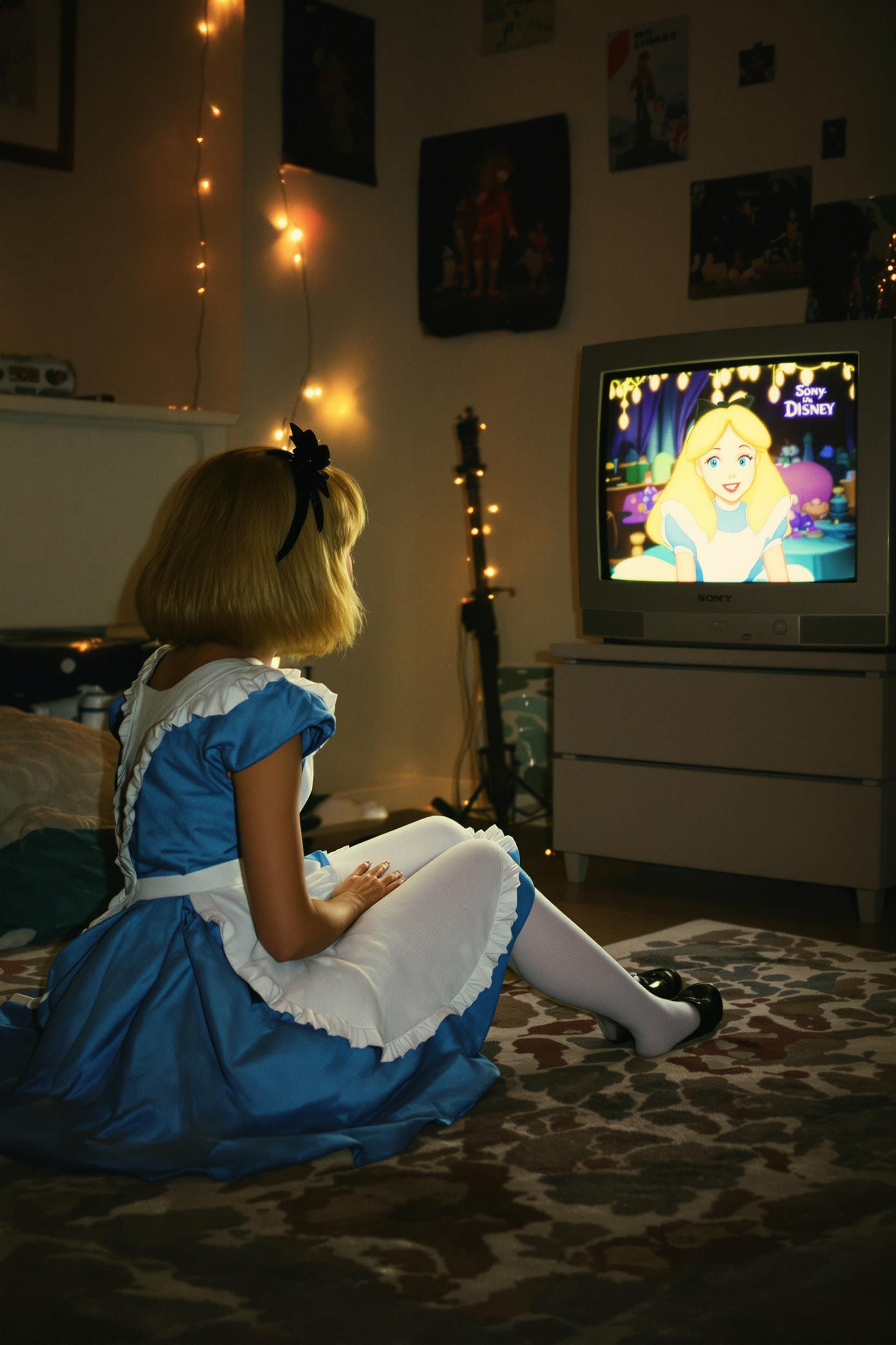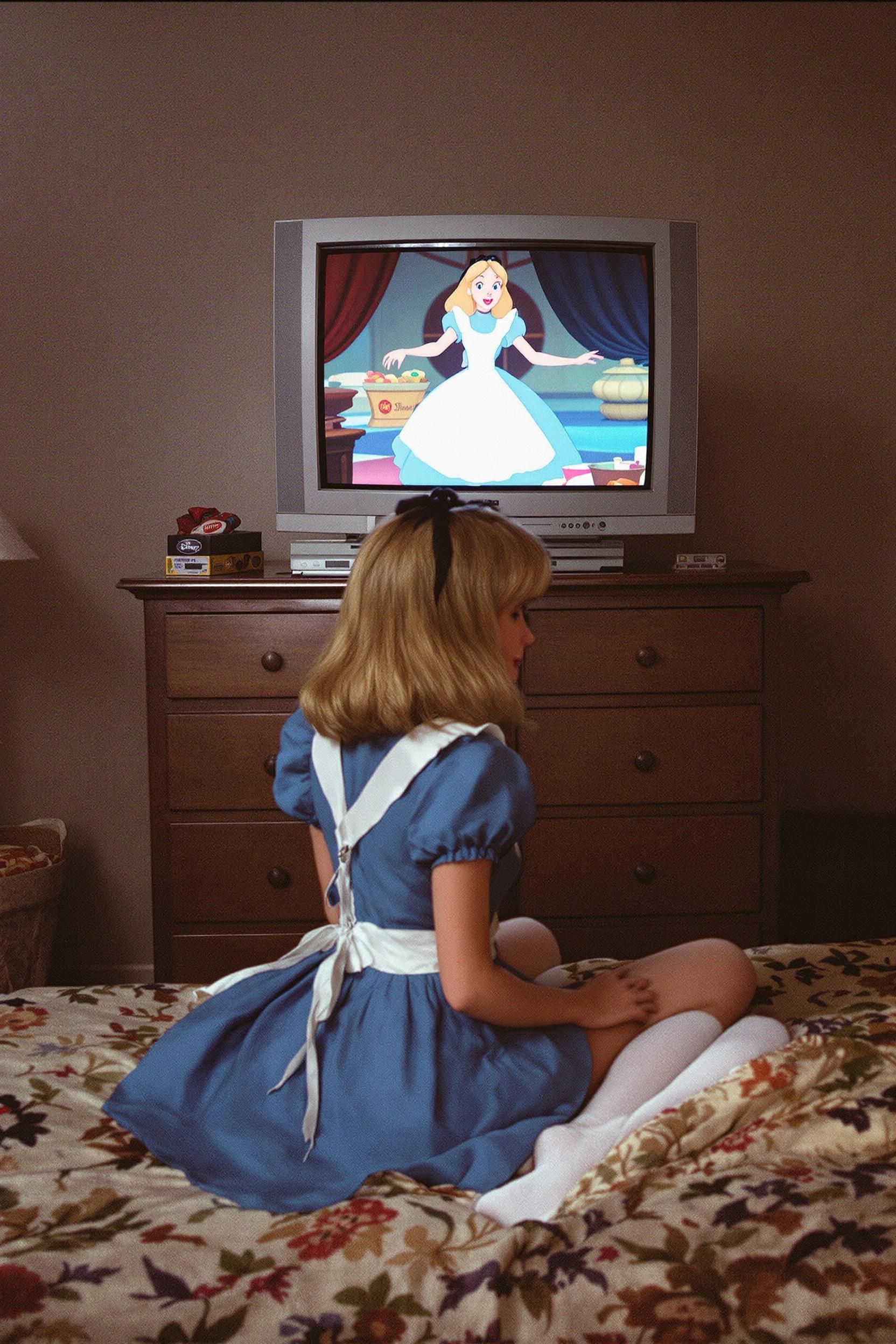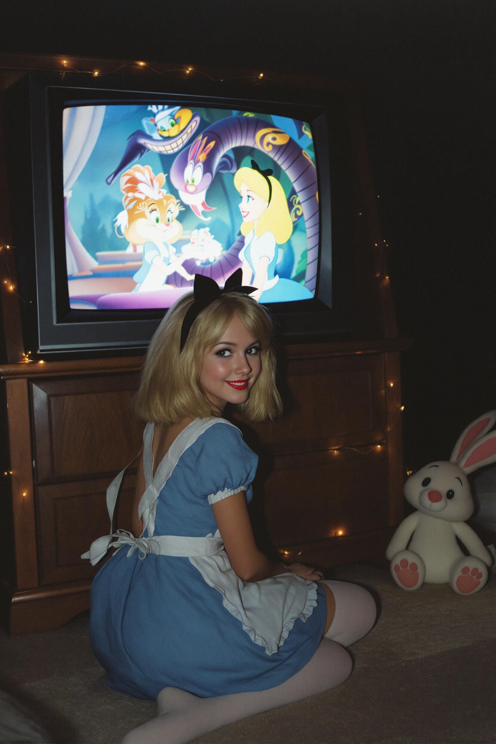 Grungy analog photo of alice (from alice in wonderland) watching her own movie on a 90s crt tv in a dimly lit bedroom. the tv clearly shows animated scene from alice in wonderland, with a cartoon-style alice in her classic blue and white dress on screen, smiling. alice is sitting cross-legged on the floor in front of the tv, in a semi-realistic style, wearing her signature blue and white dress, thigh-high socks, and her signature long golden bob haircut, glossy sky-blue eyes. she’s turned back toward the camera, smiling softly. the crt tv casts a soft glow on her face. flash photography, slightly overexposed and unedited, with visible lens dust and film grain, evoking a nostalgic early-2000s vibe. emphasize the contrast between the animated screen and the analog realism of the photo.