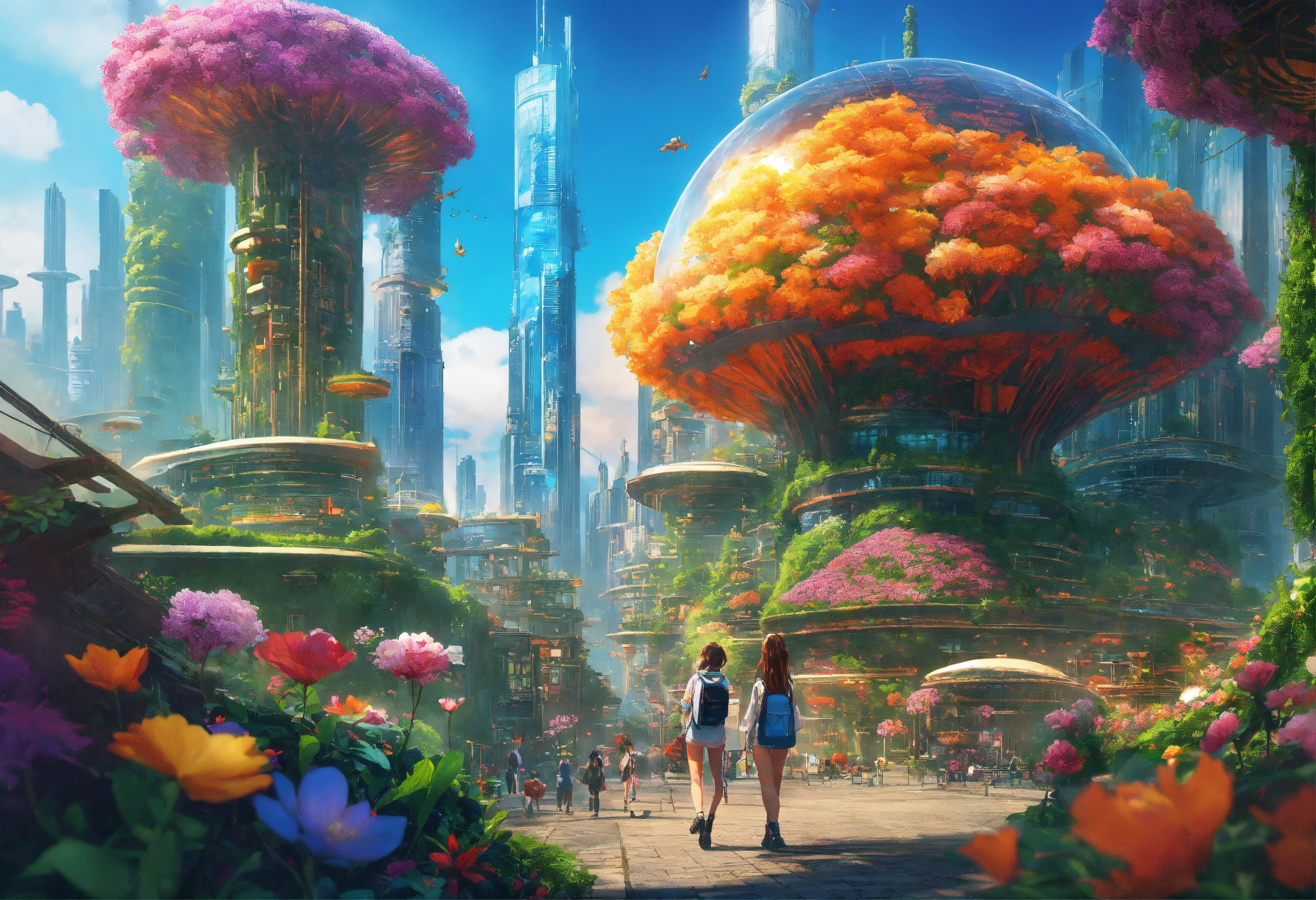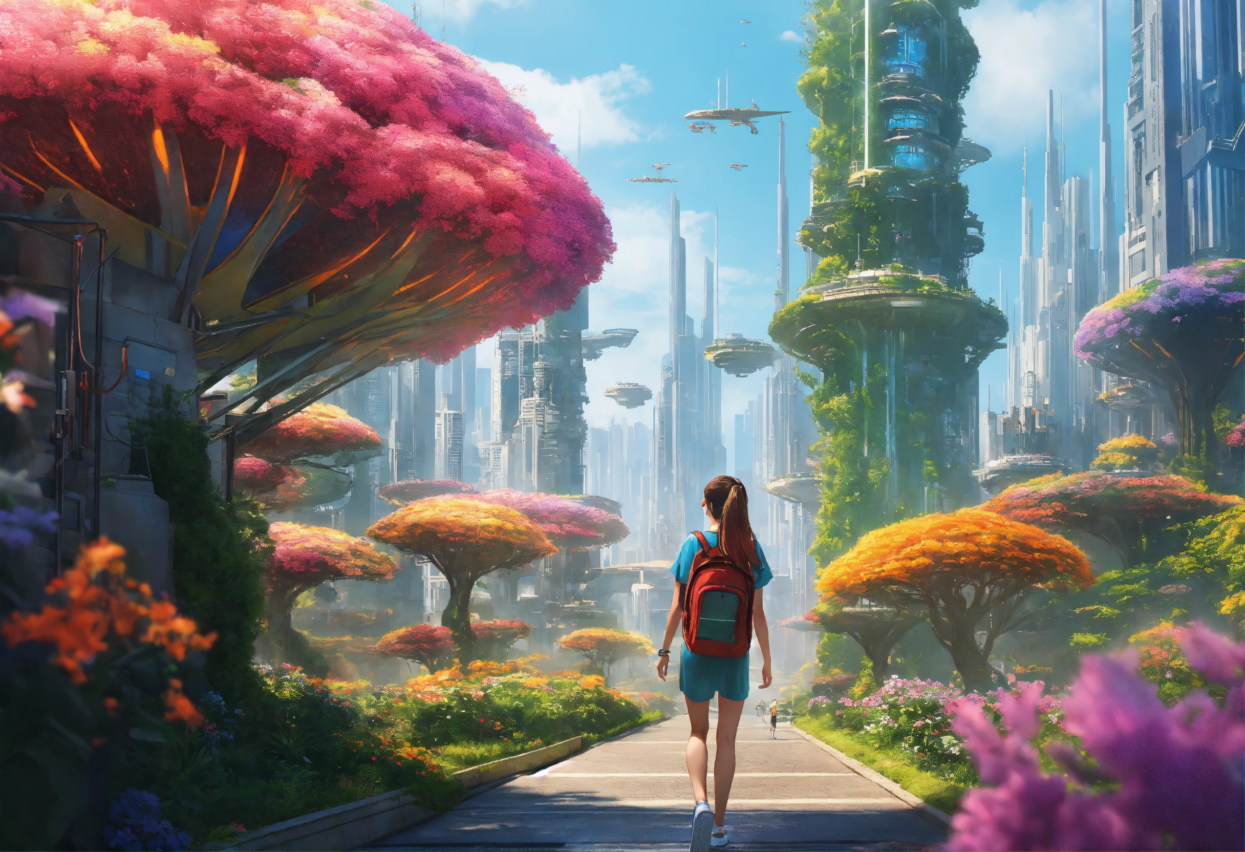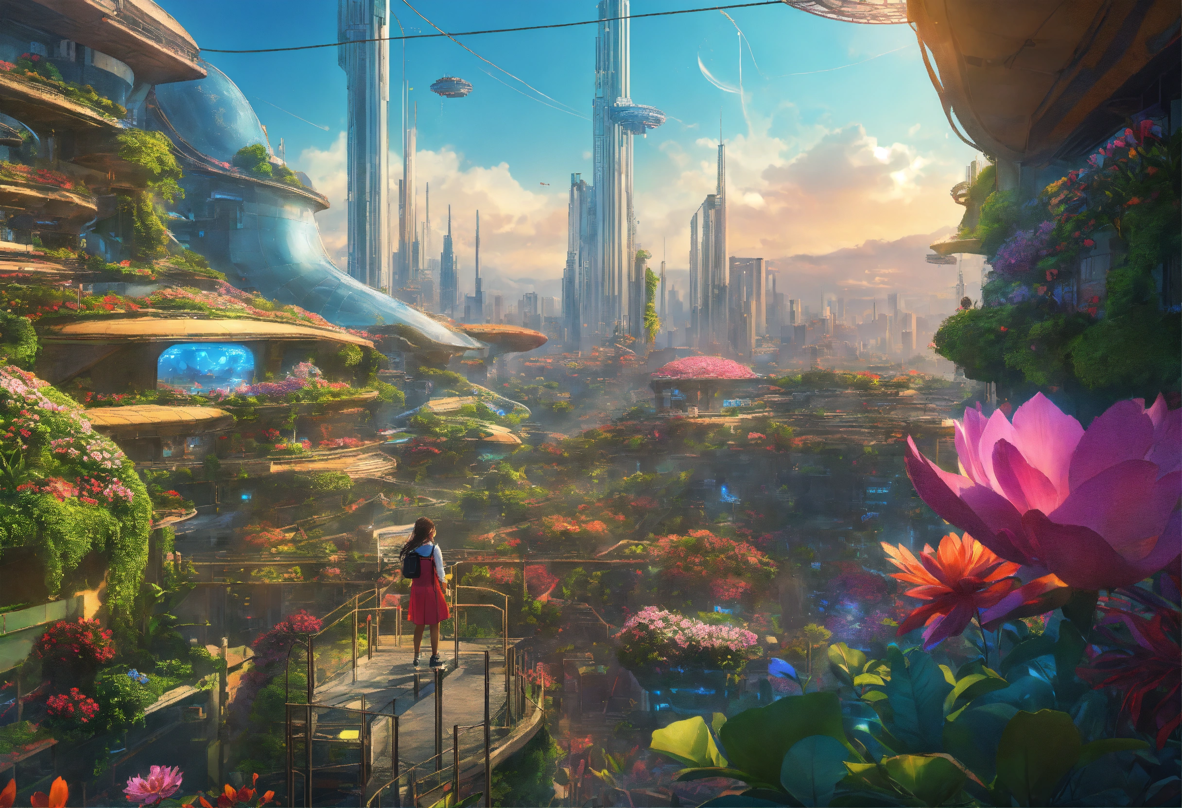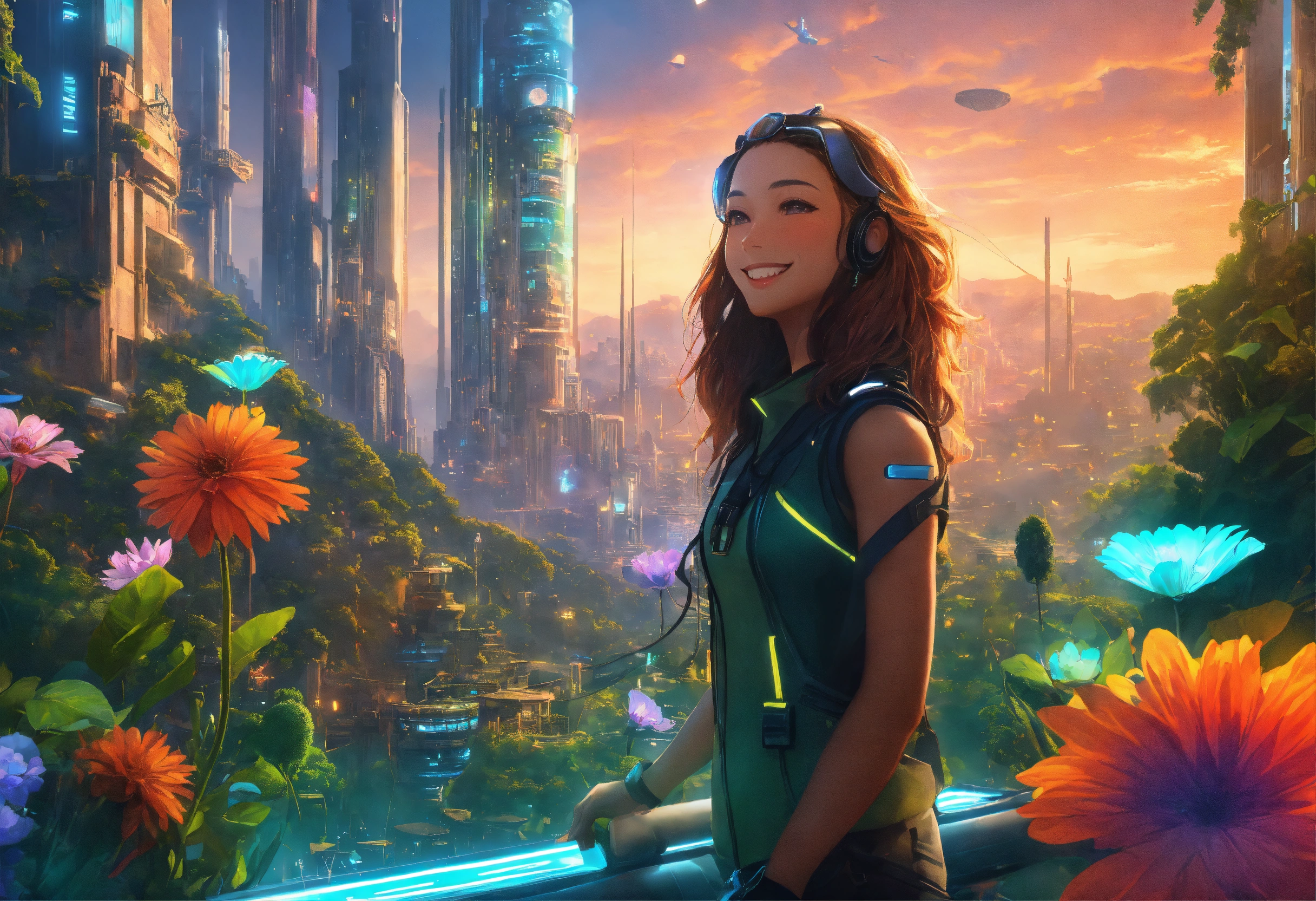 Zoom on a smiling girl. in the background imagine a futuristic city covered in lush greenery, its buildings connected by a network of sleek, high-tech infrastructure. the atmosphere is filled with a sci-fi ambiance, with vibrant and vivid hues creating an otherworldly feeling. picture yourself walking through this city, surrounded by towering structures adorned with cascading plants and vibrant flowers. the air is filled with a sense of possibility and innovation. this is a city where nature and technology coexist harmoniously, creating a utopia for both humans and the environment. welcome to tech haven, where the future meets nature in a truly mesmerizing way.
