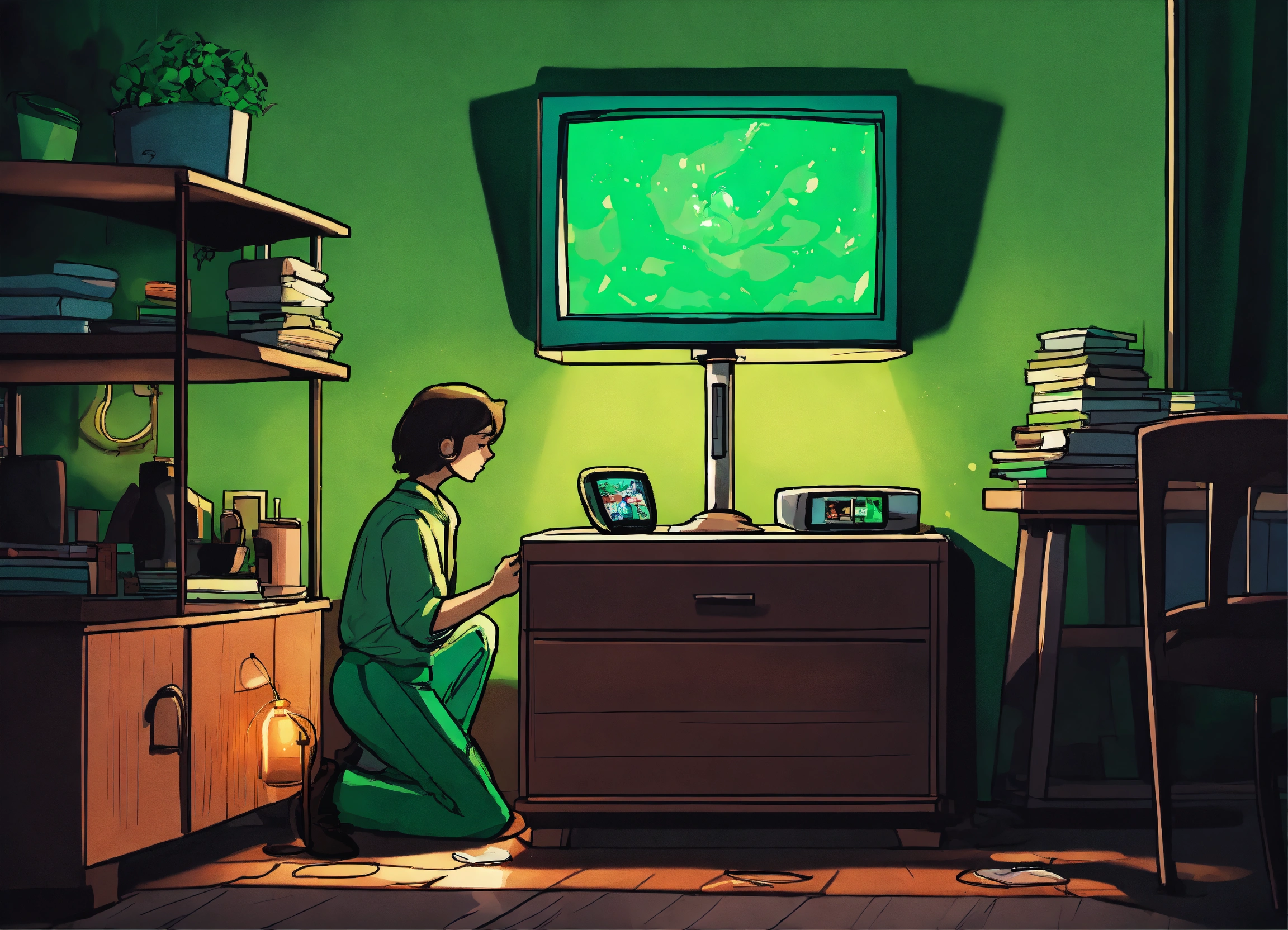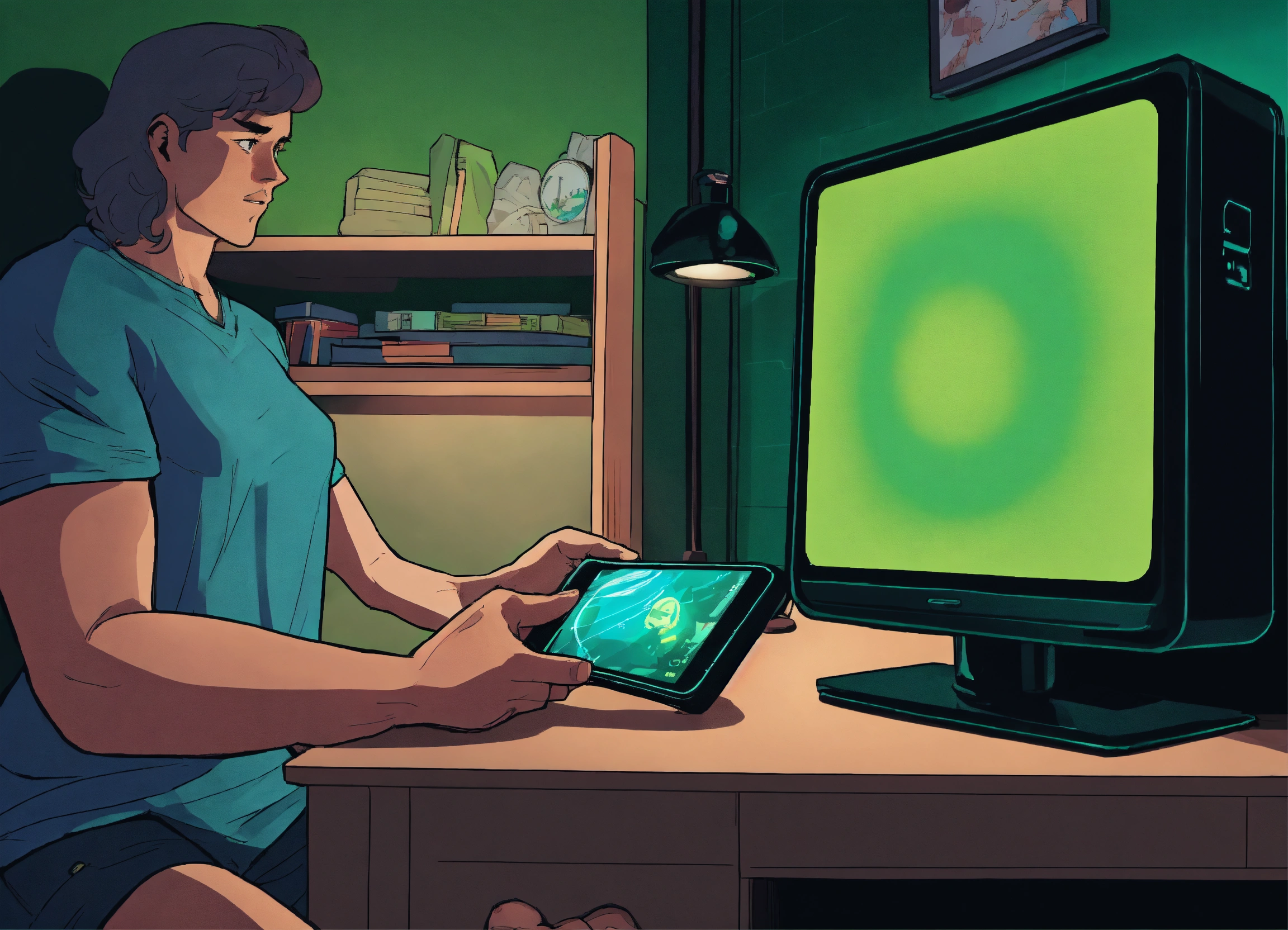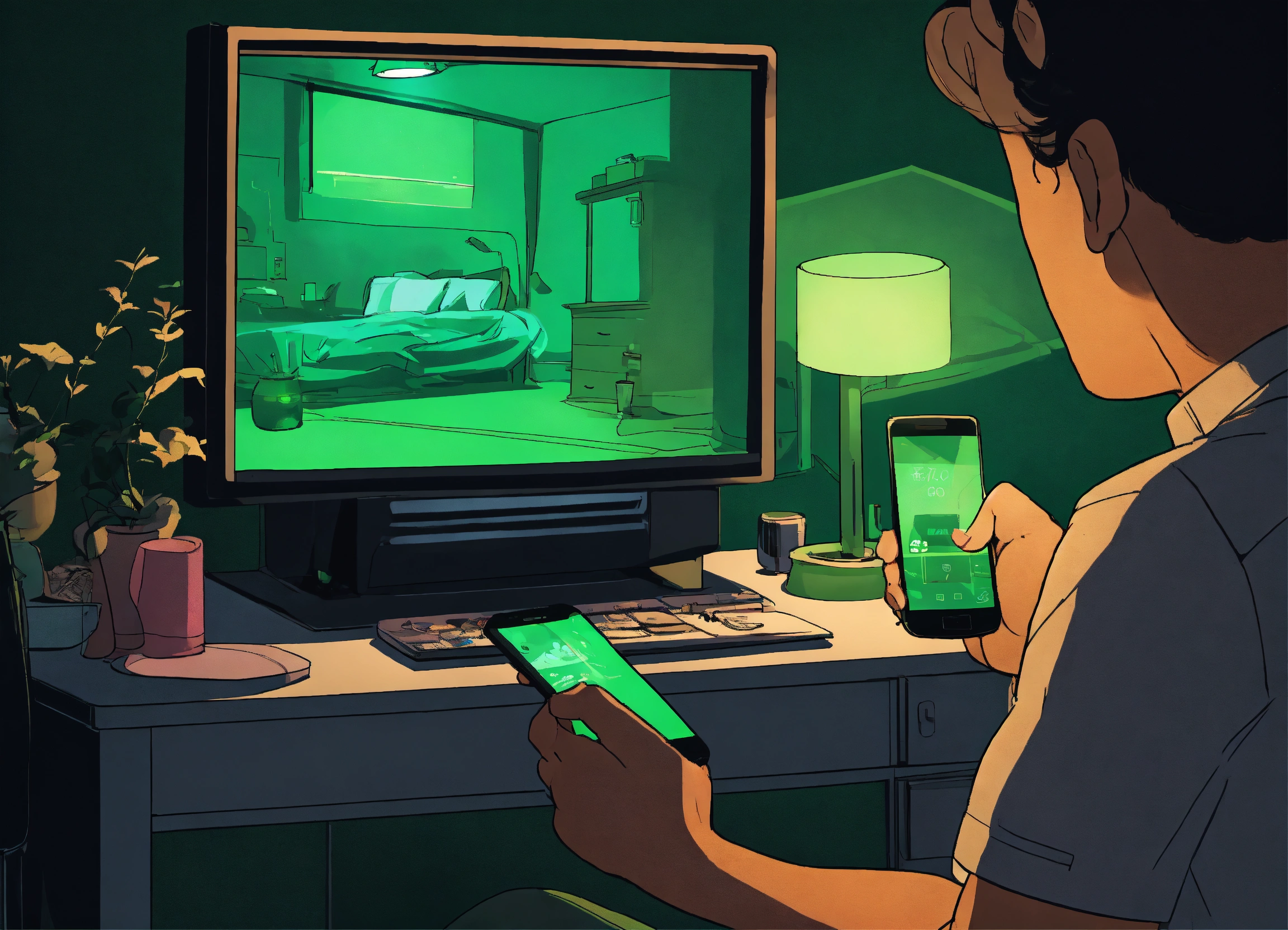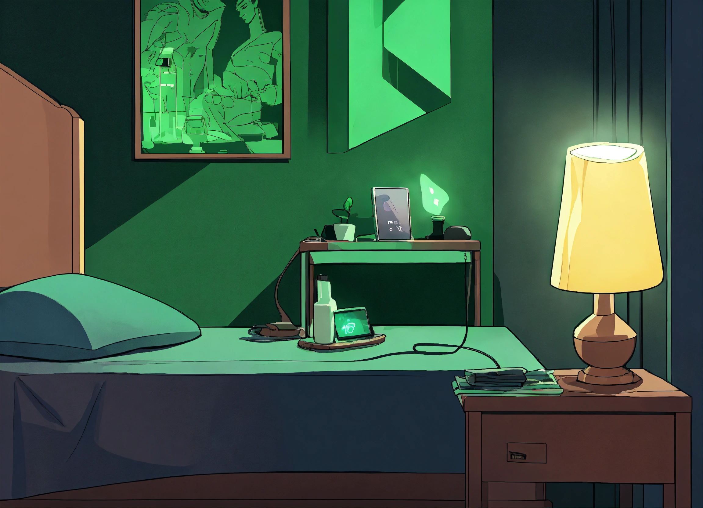 Conceive a comic cartoon poster depicting a nightstand scene where a person’s hand is limply holding a cell phone, the screen's green glow is the only light source in a pitch-black room, with shadowy figures in the background barely visible and reaching for their own glowing screens