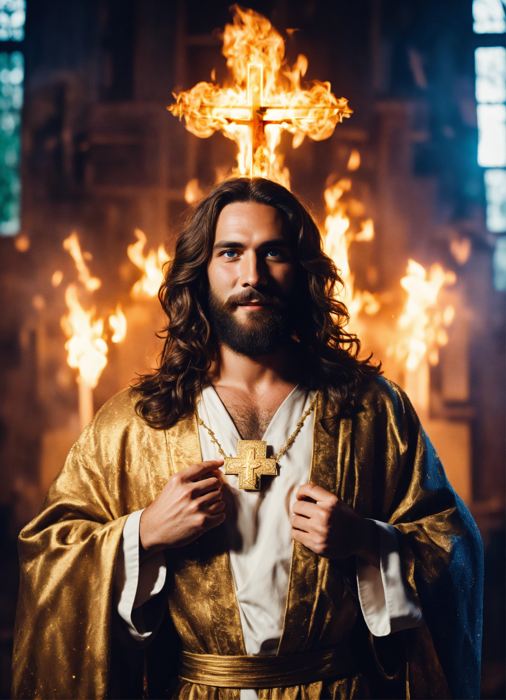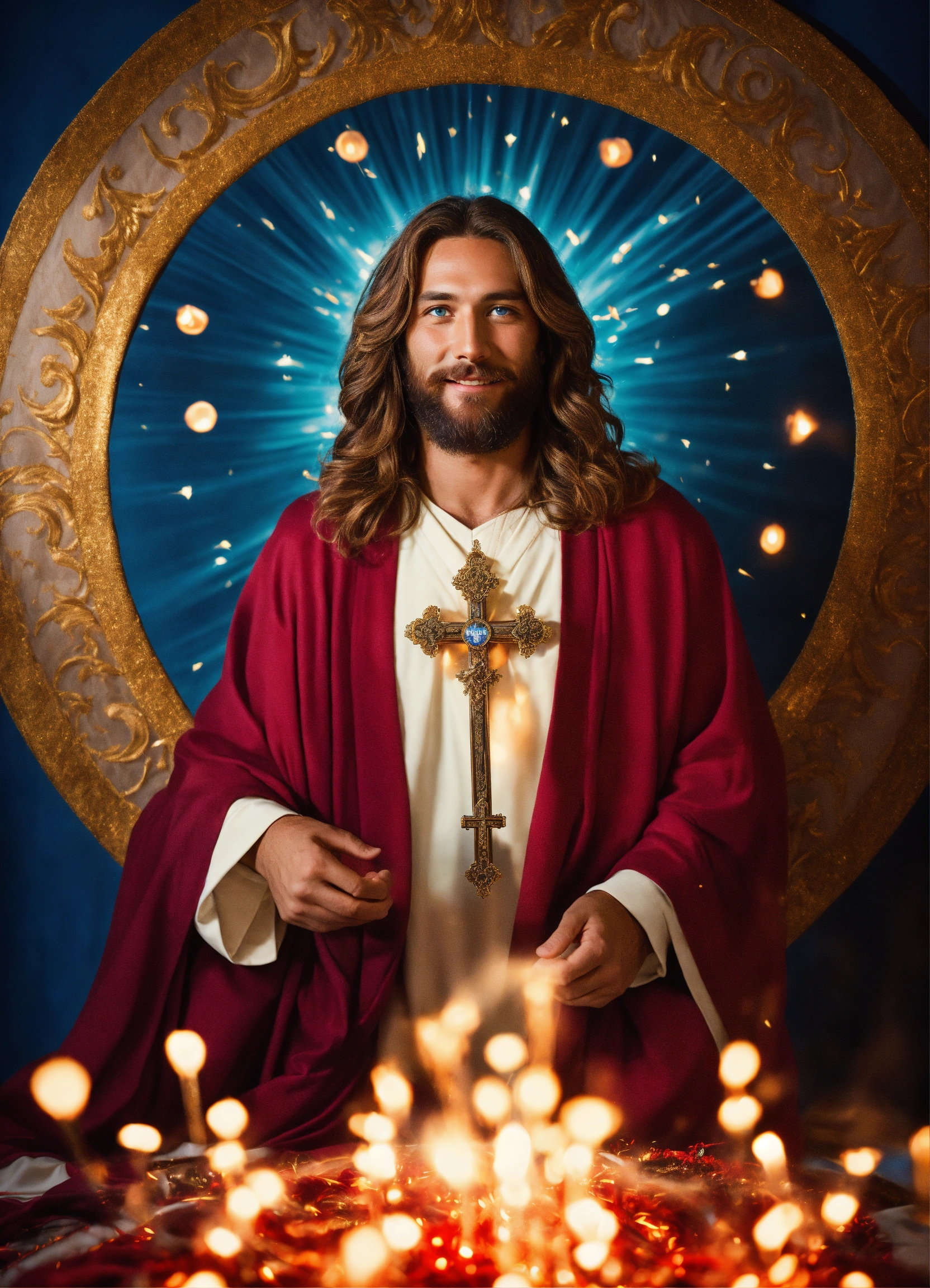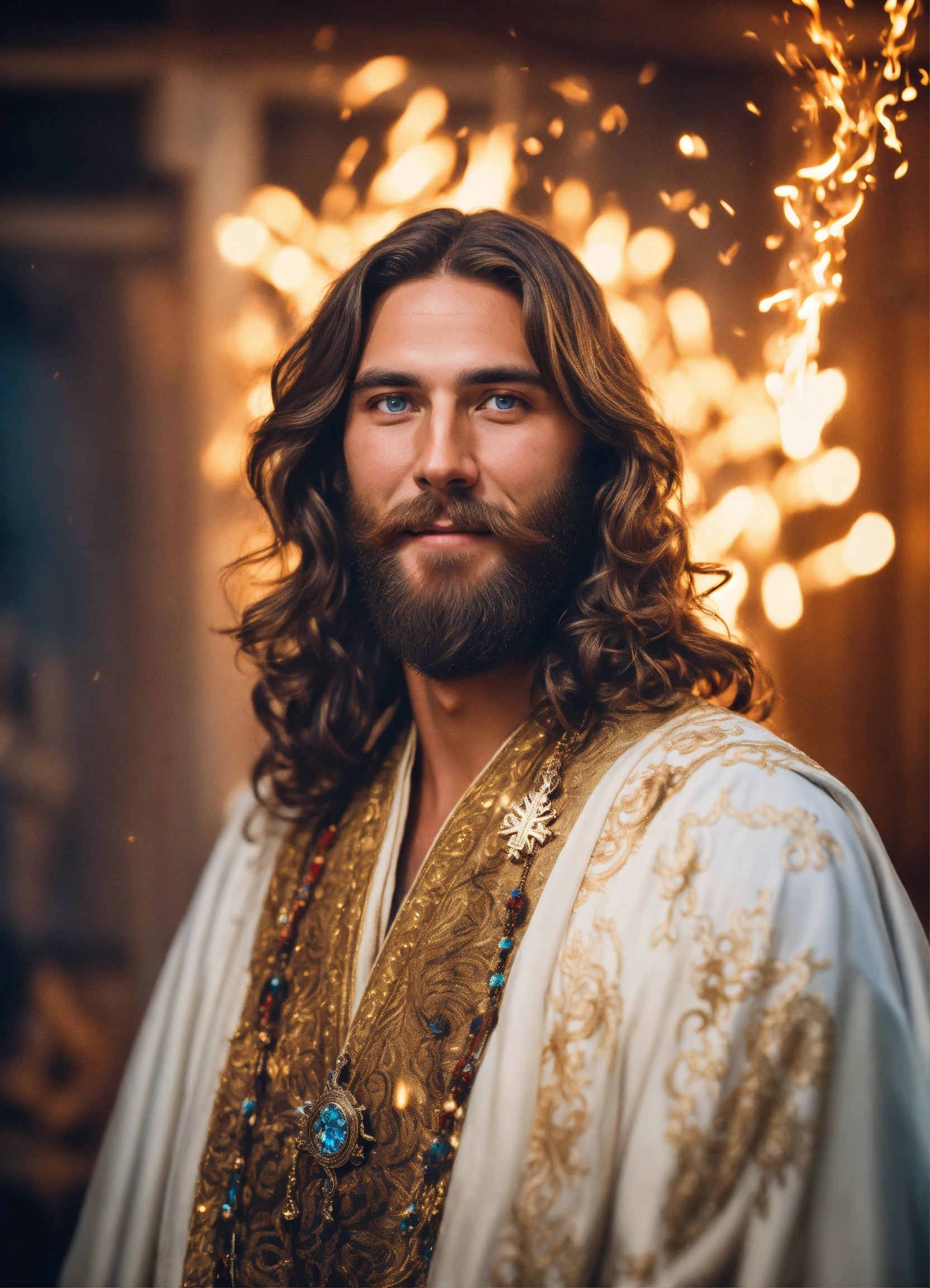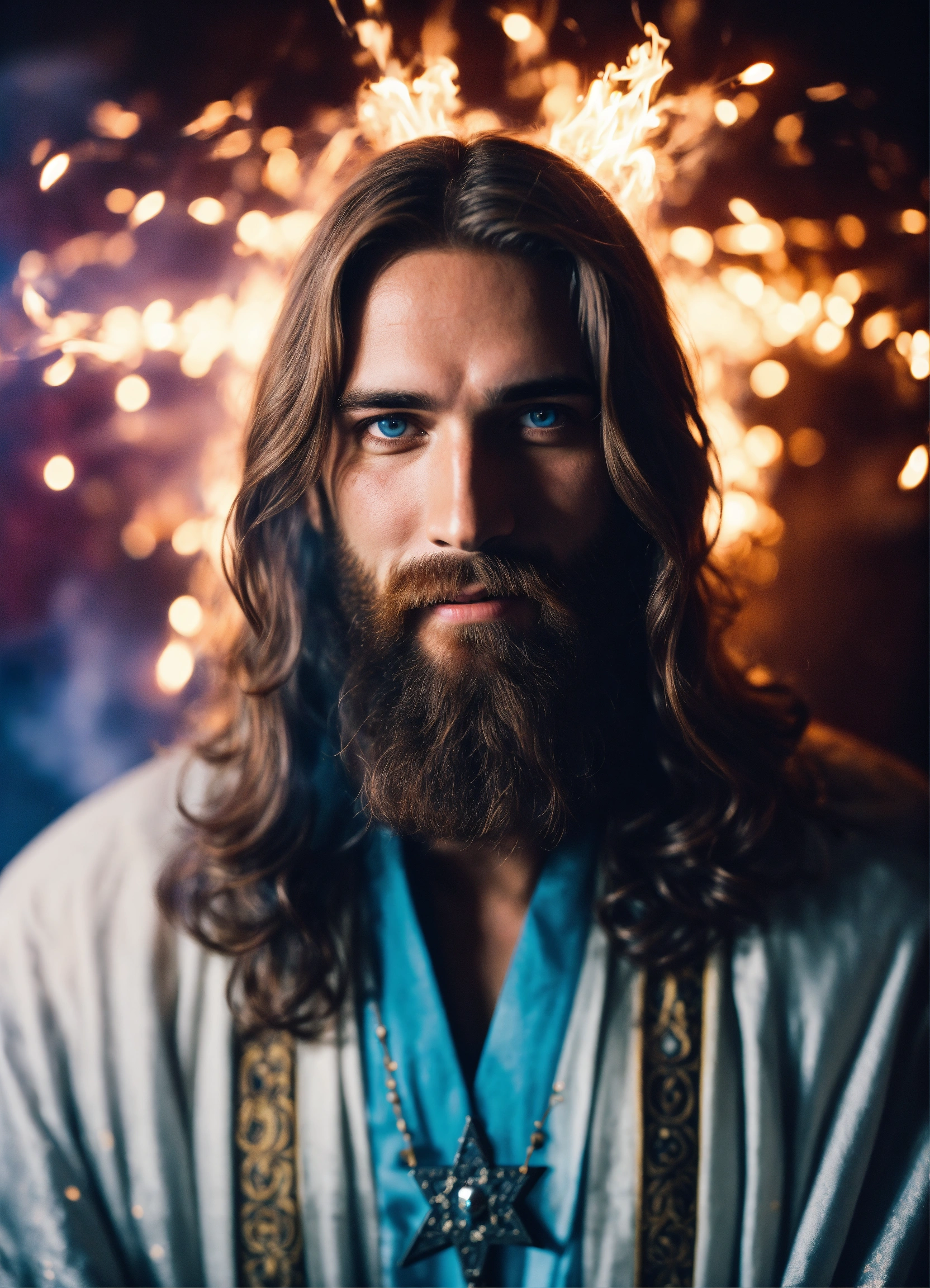 Surreal full body image captured with a canon camera film grain.photographic portrait of masculine robust smiling jesus christ, looking at camera, supermodel white male, background is an swirling holy spirit sparks, holding out a heart covered in flames and surrounded by barbs with a holy cross on top, make a wish, magic, magician, sparkling wishes, holy spirit glow, smiling, staring intensely straight ahead directly into camera as if listening to me, long brown hair with full beard, loving glowing bright blue eyes centred towards me, wearing kingly robes, magazine photoshoot