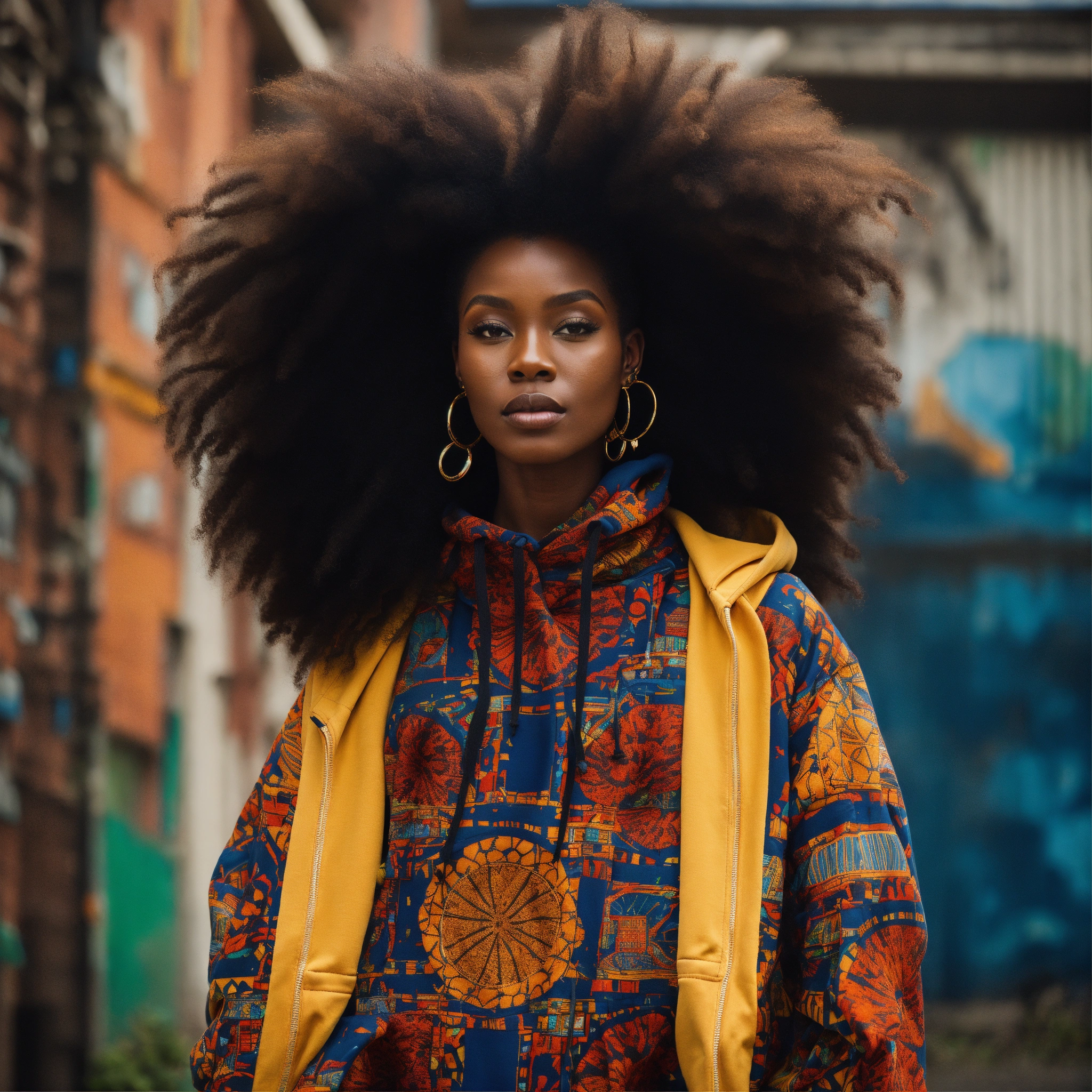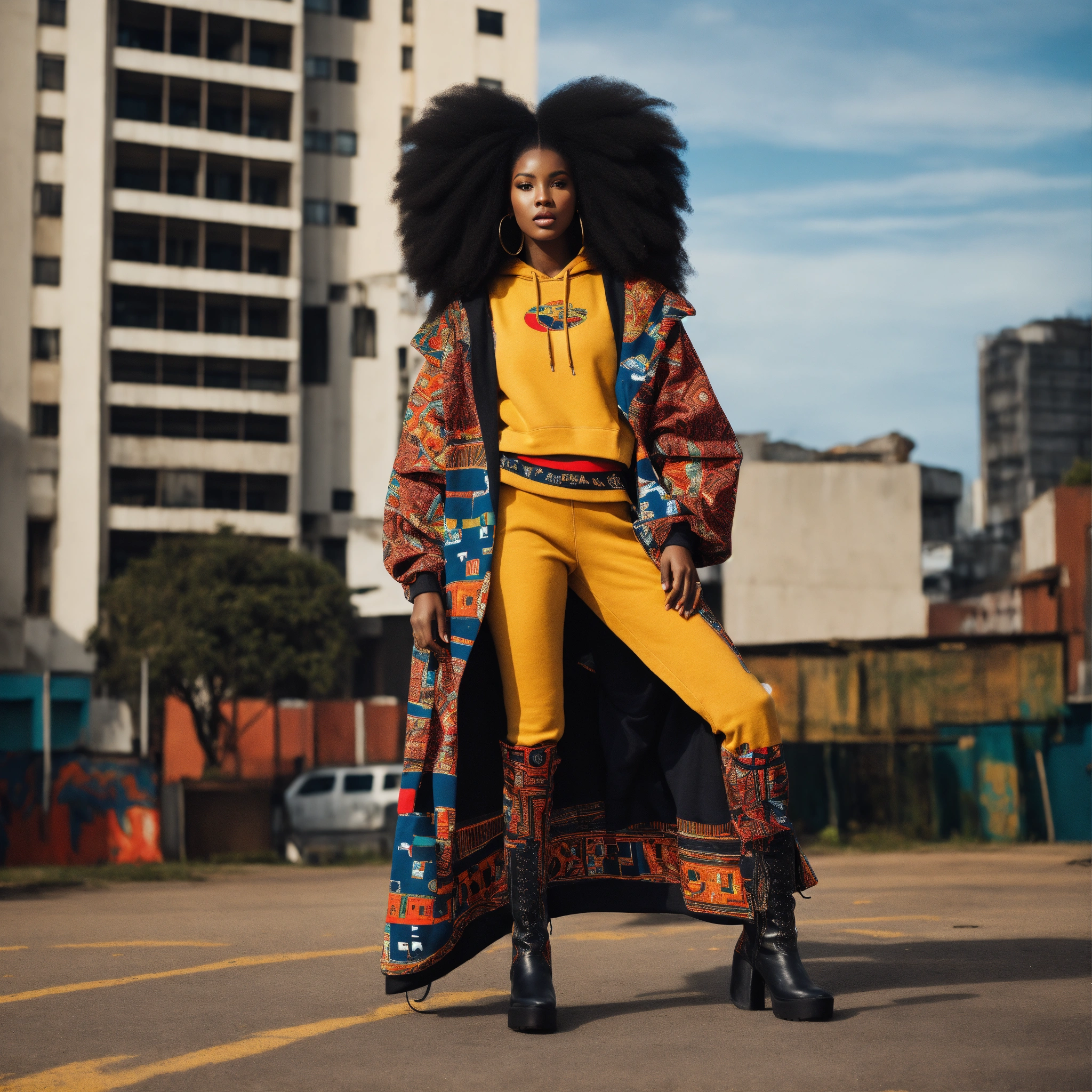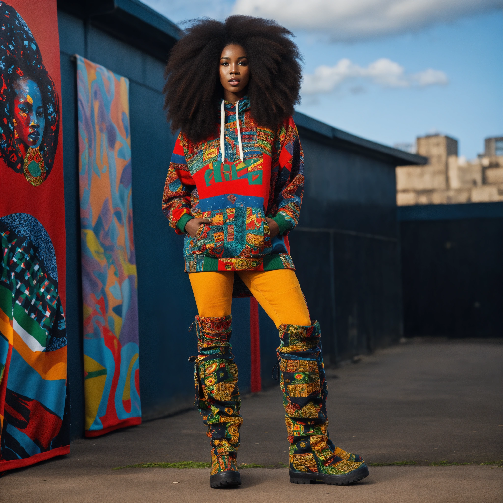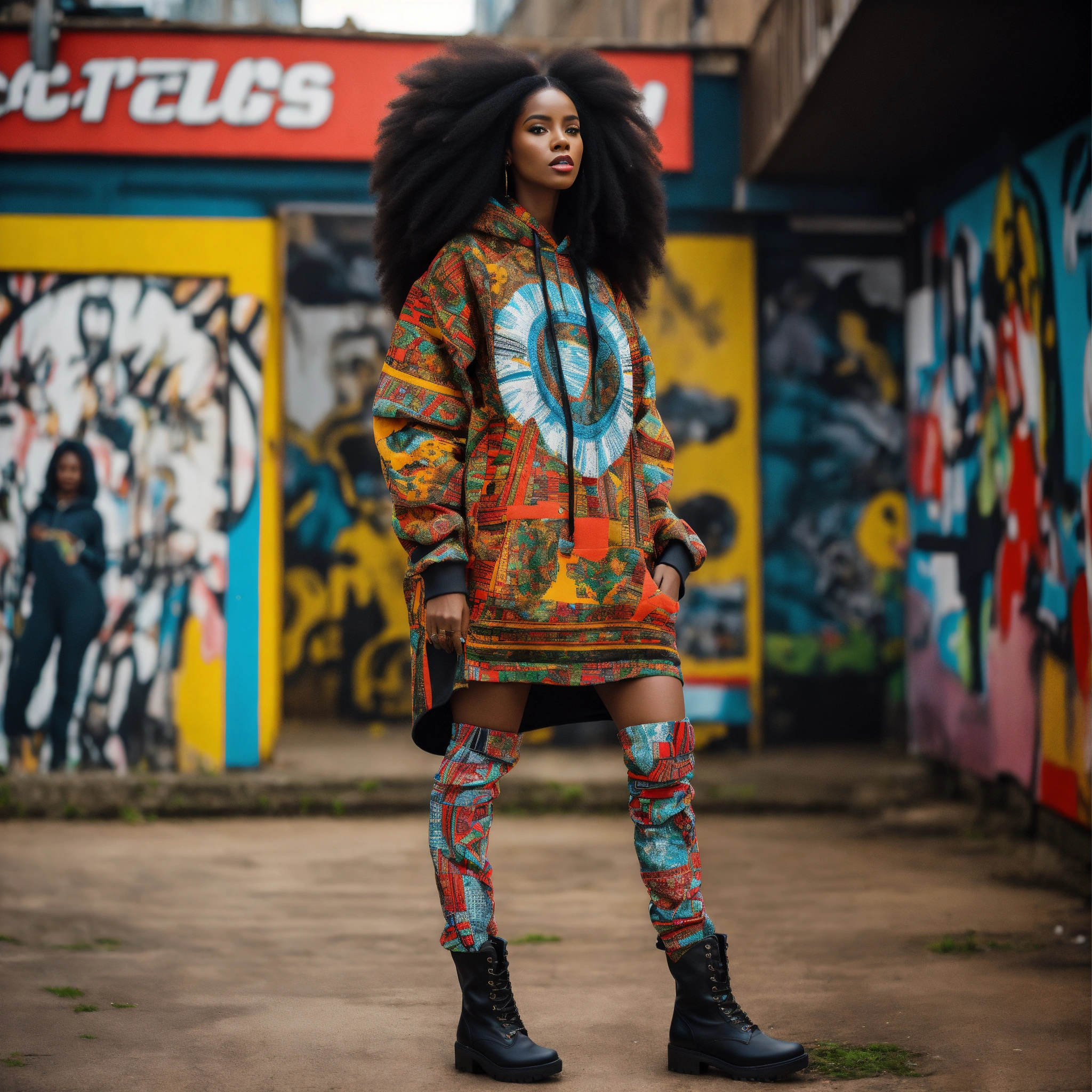 Photograph an afro-caribbean woman model wearing kenyan print pattern knee-high boots and an oversized afro-futurism graphic hoodie, complemented by her long, layered, straight hair. with a confident half-body pose, set against an urban backdrop, create a striking image for a clothing brand's showcase.