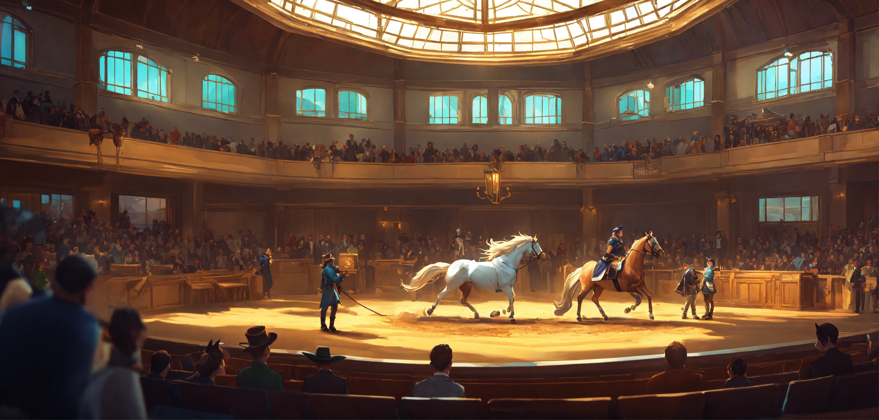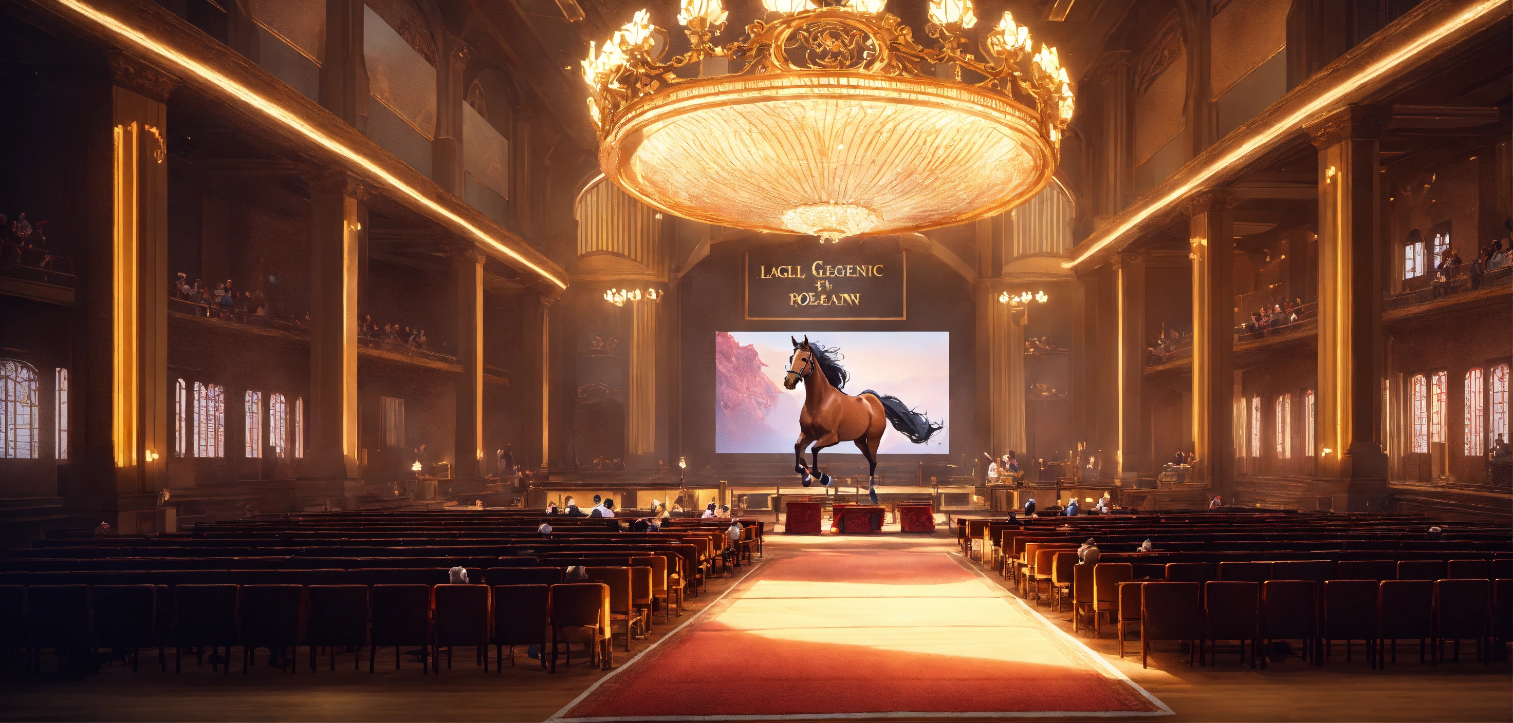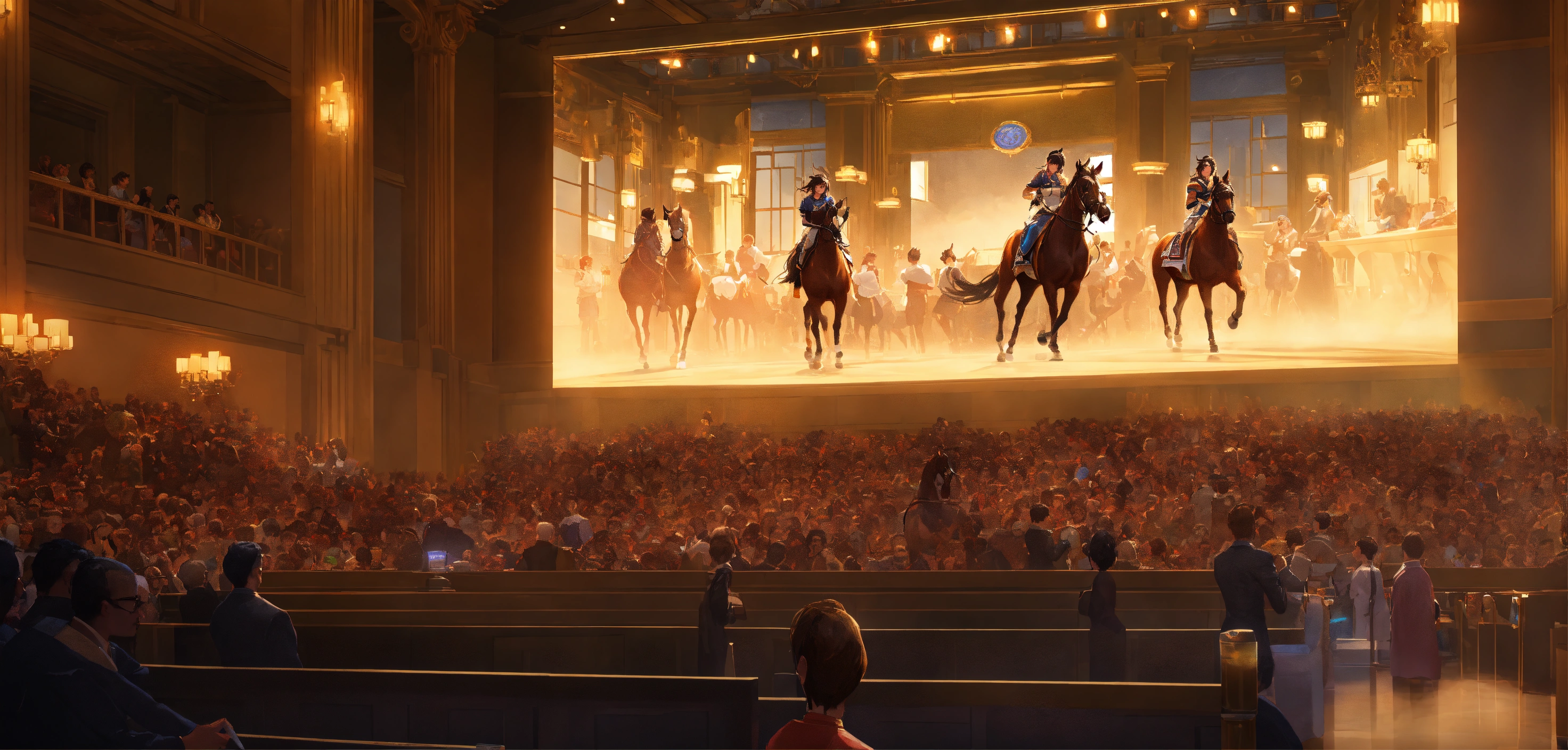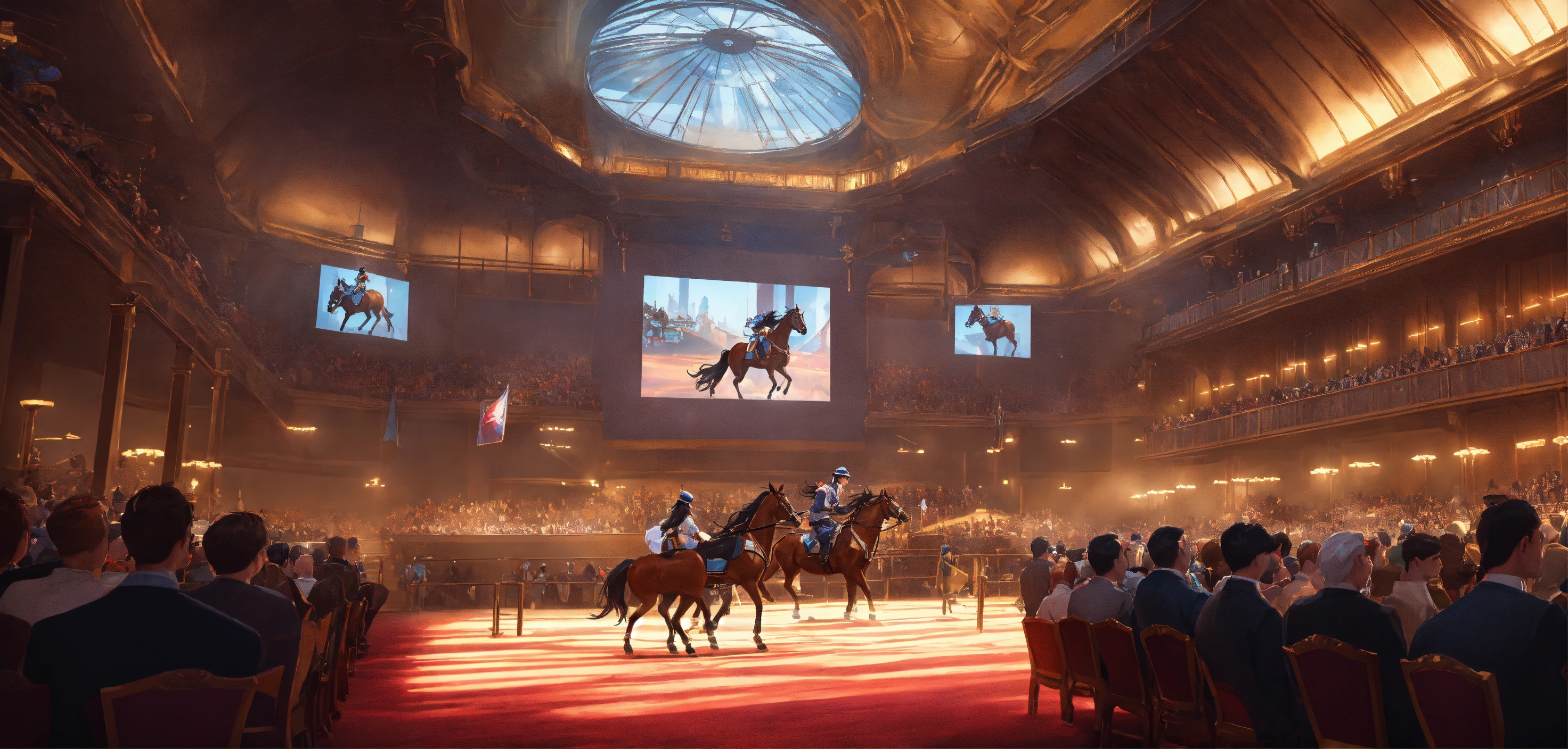 A highly detailed league of legend dynamic illustration of the horse auction in little modern event hall by joshua raphael, by artgerm, by huyy nguyen, by cj xander, by jennifer wuestling, by diep duong van, by huyy nguyen, by grafit studio, volumetric lighting, 3d render, 4k resolution, trending on artstation, masterpiece, close up frame, cinematic shot, sport competition, epic, keeneland sales, inside hall with stands, lot of armchairs with people, one horse in centre only, evening, hall without windows, a windowless hall with a horse on the stand
