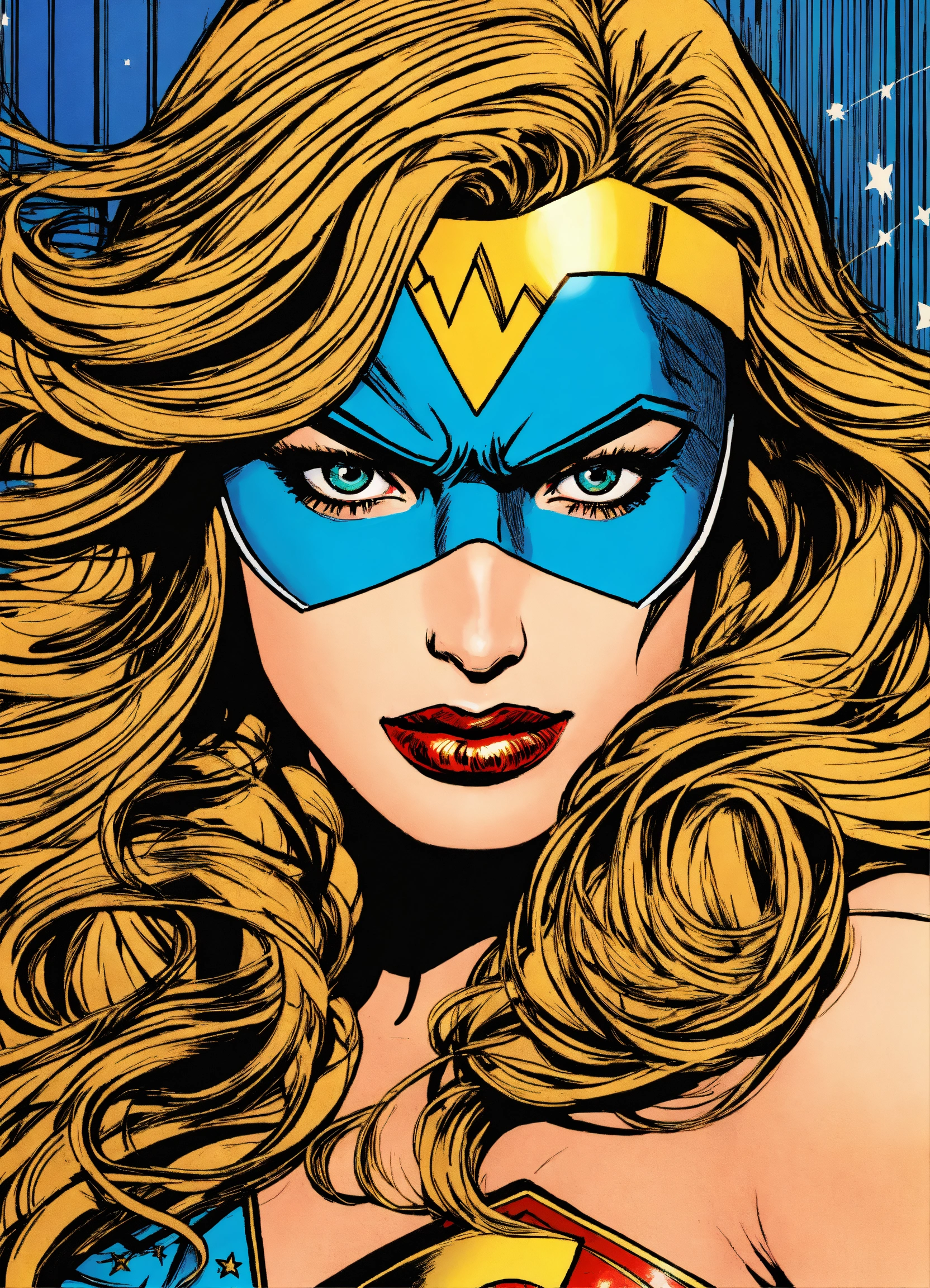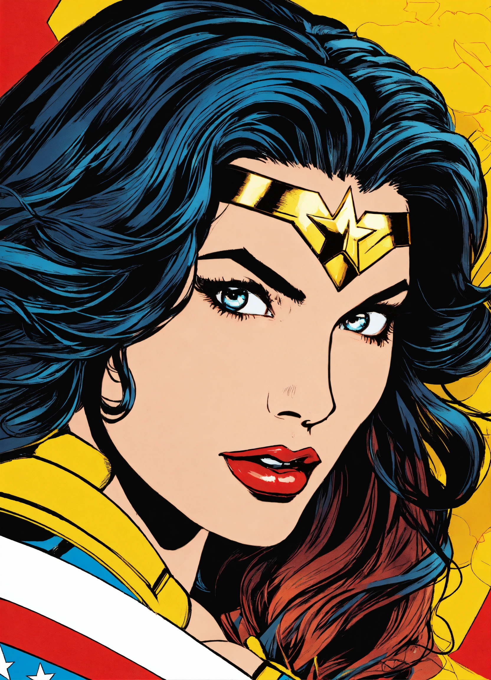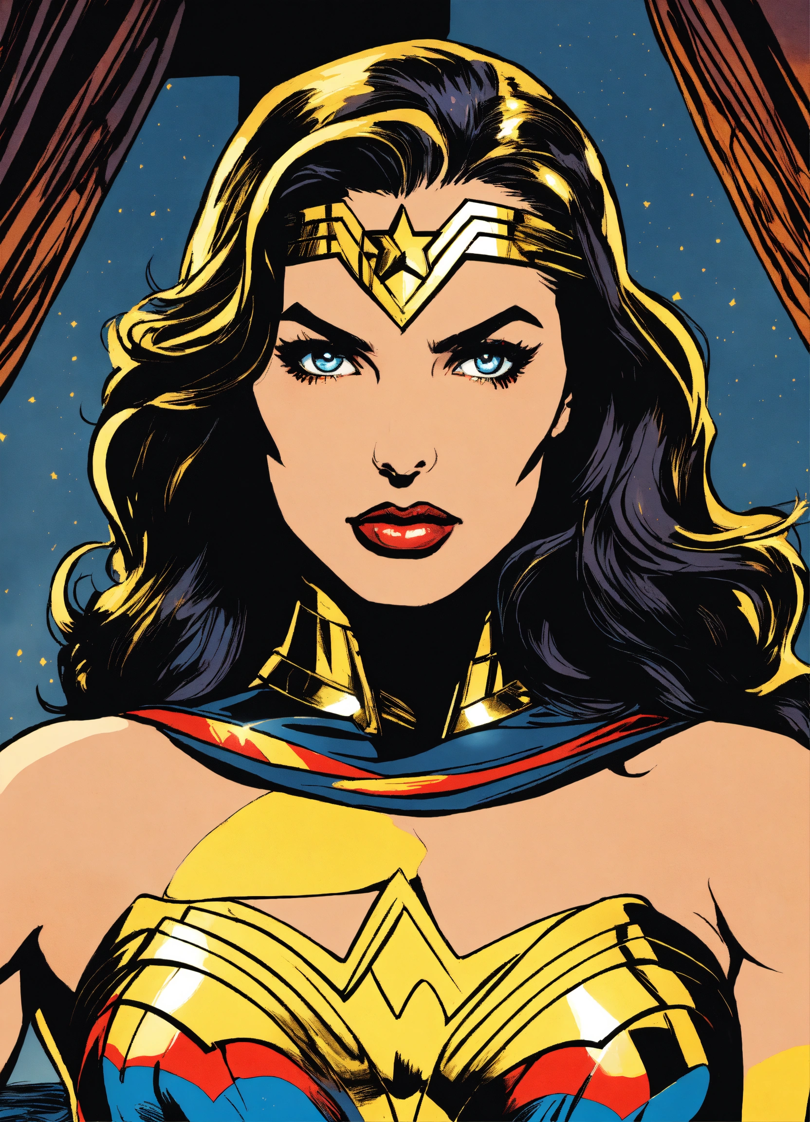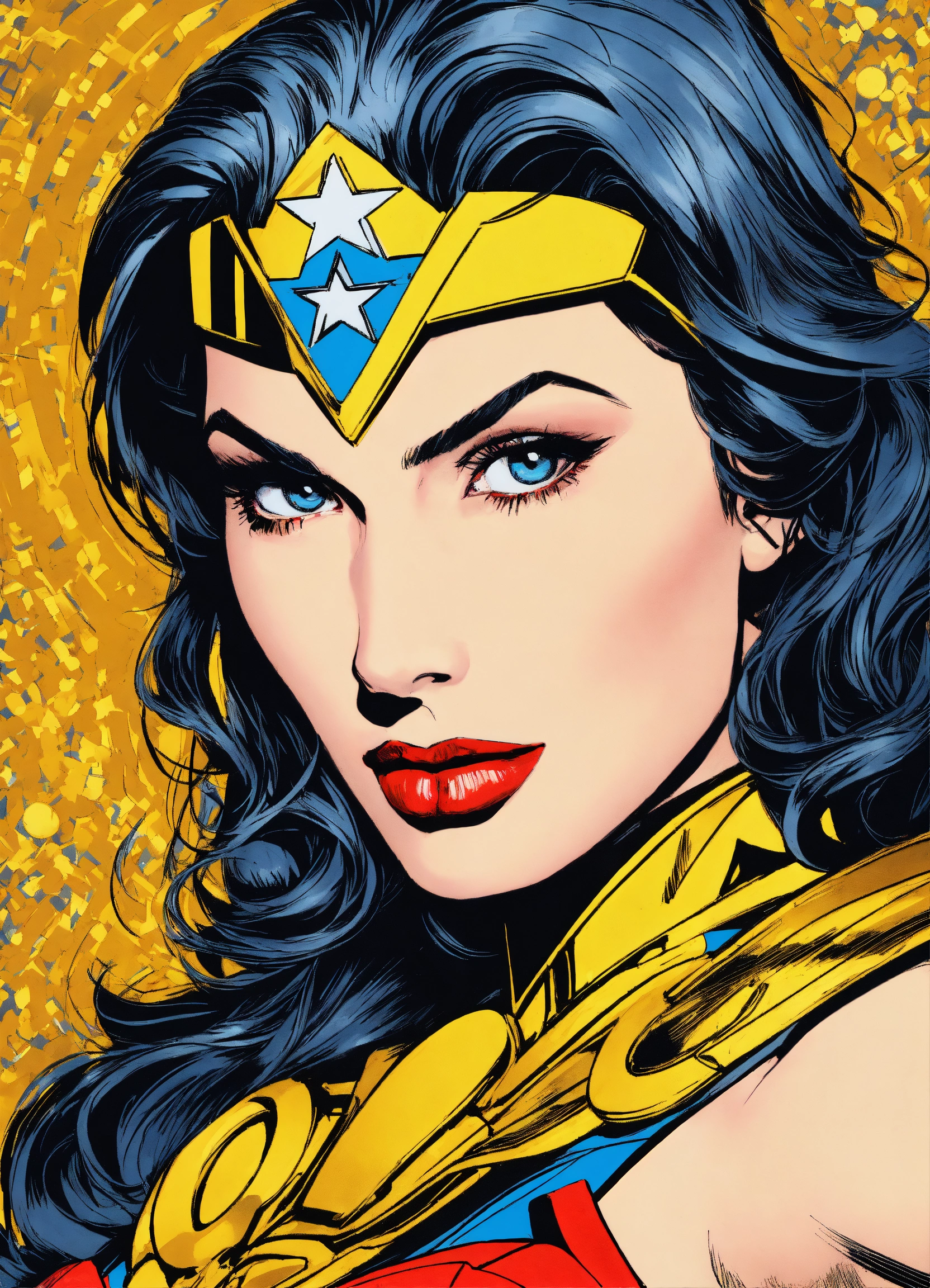Pop art, wonder woman, glowing golden eyes, concept art, sharp focus, intricate, highly detailed, smooth, soft glow of a nightlight, art by roy lichtenstein, comic book art style