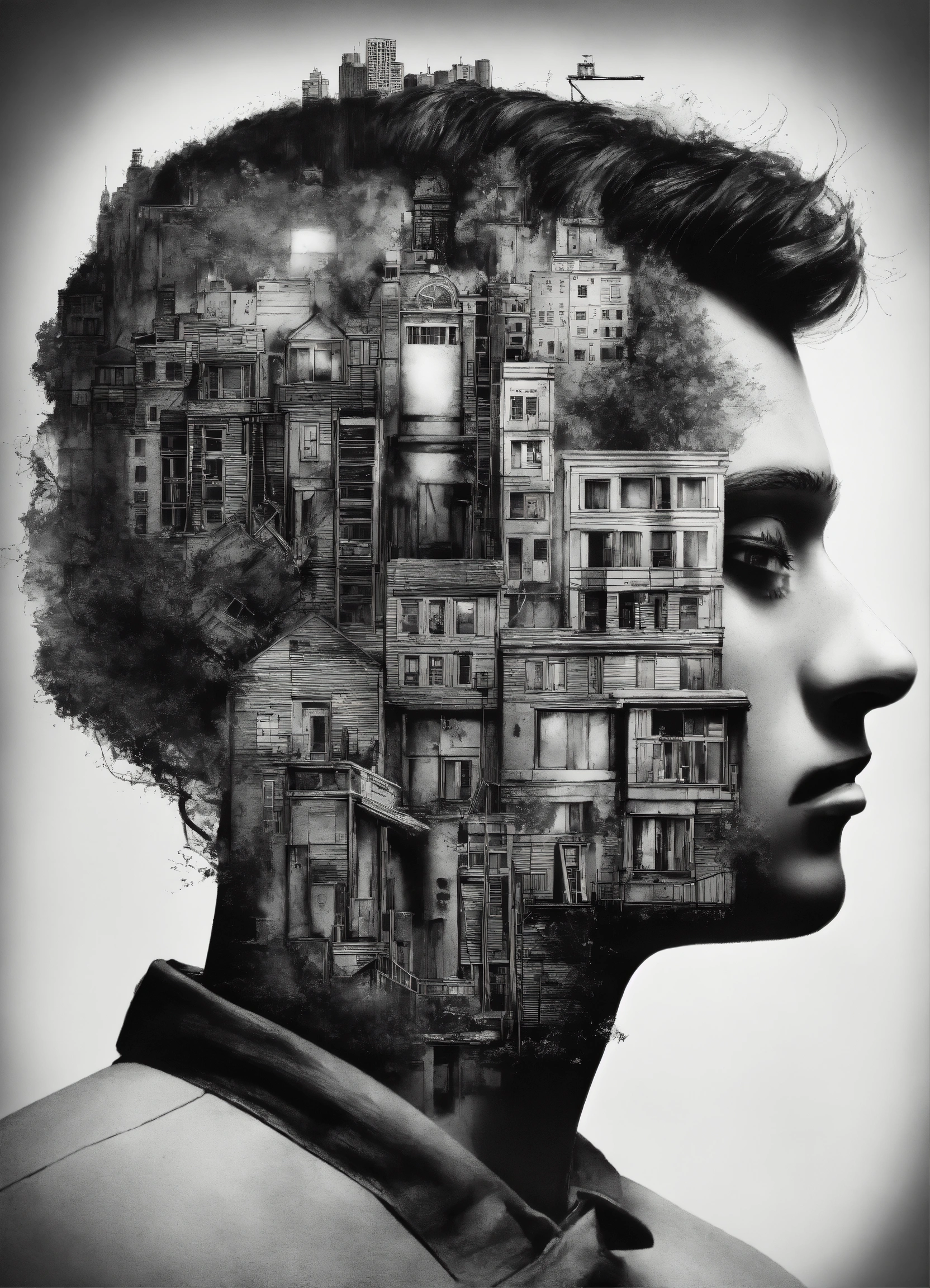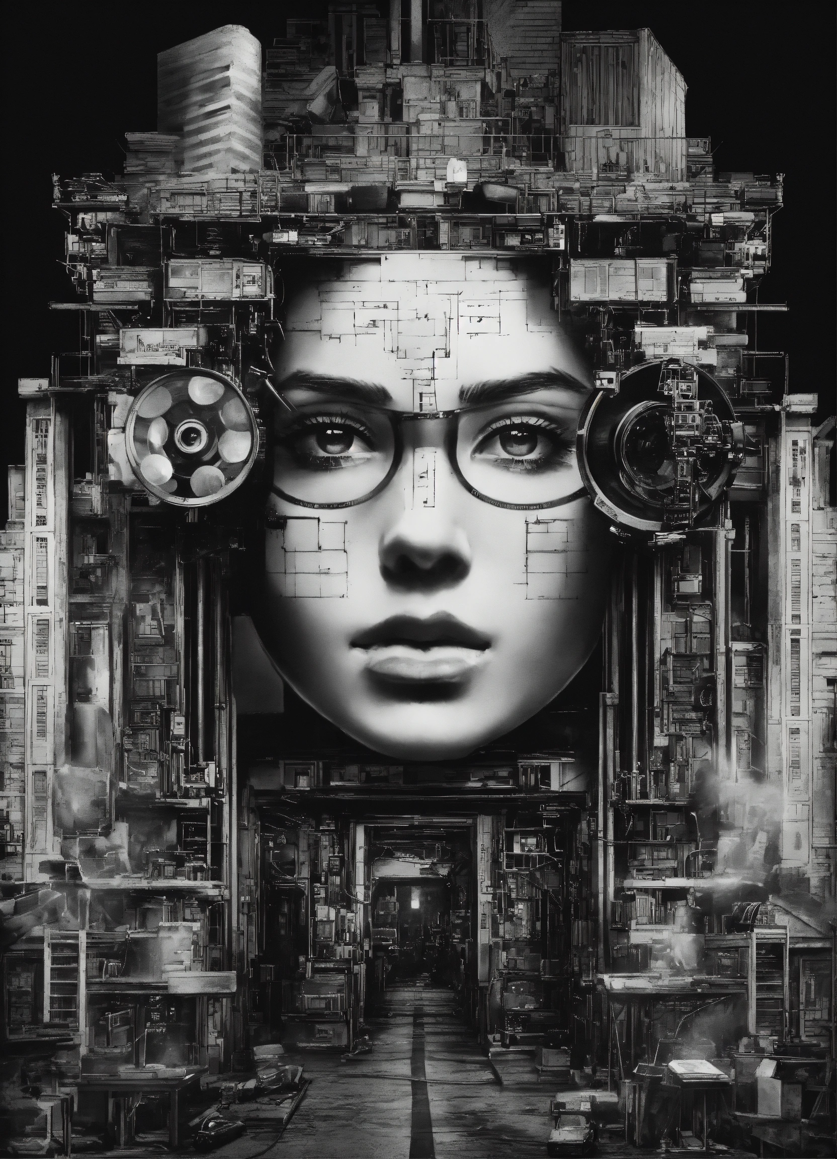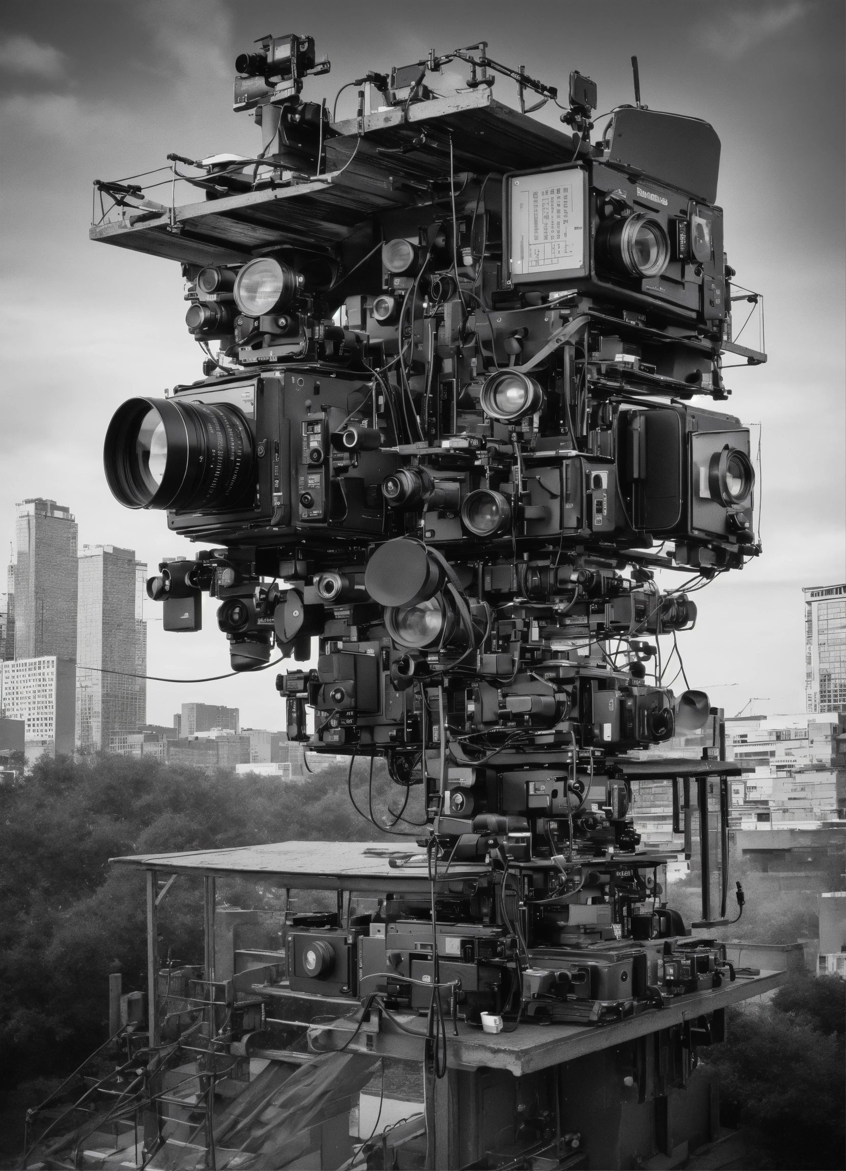 Conceptual bw ink art, cinematography gear arranged in form of city, buildings made of cinematography gear, made of lens, camera rigs, clapboard, carnes, dolly, trally, ink line art, placed in profile of a face