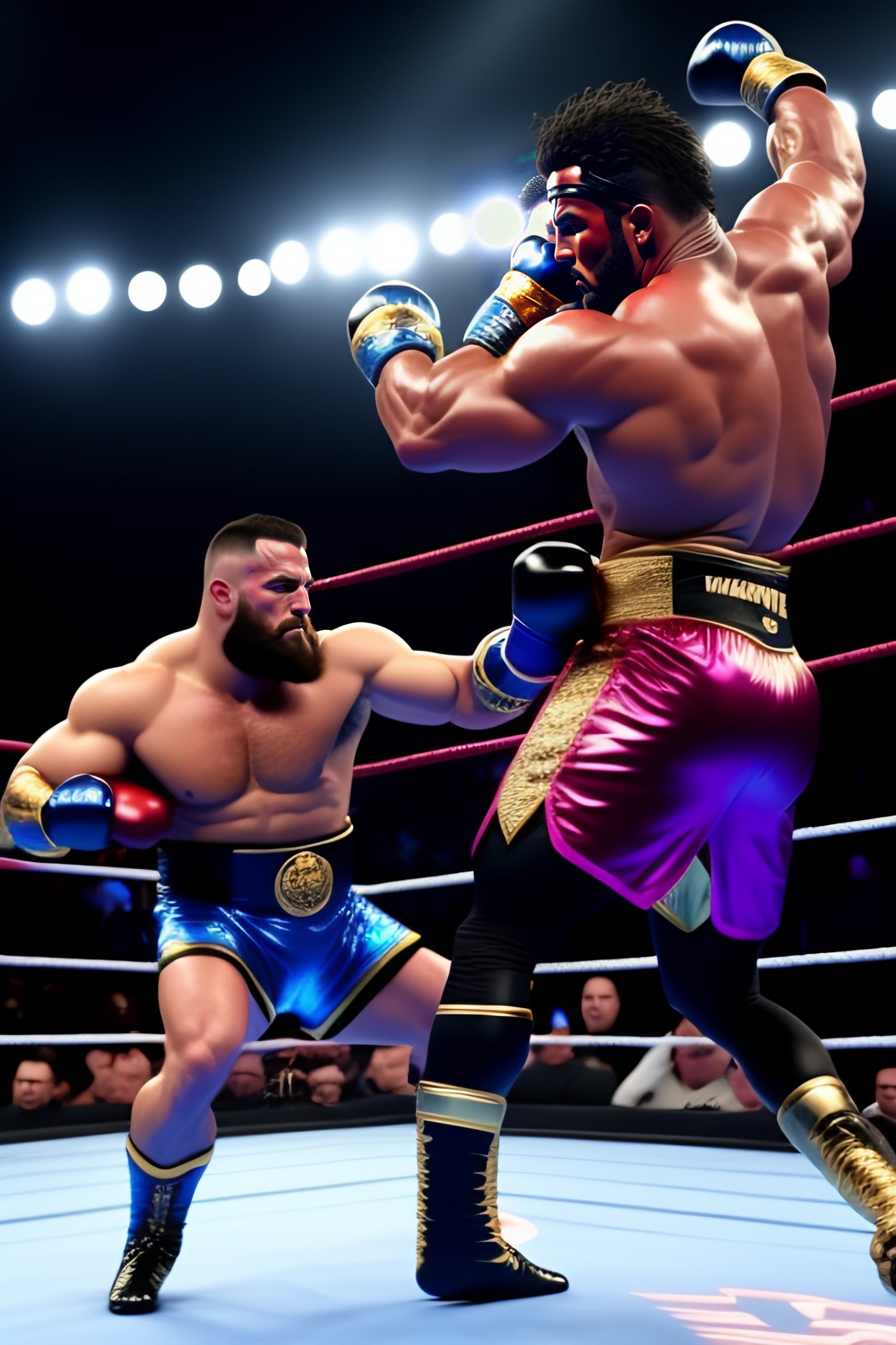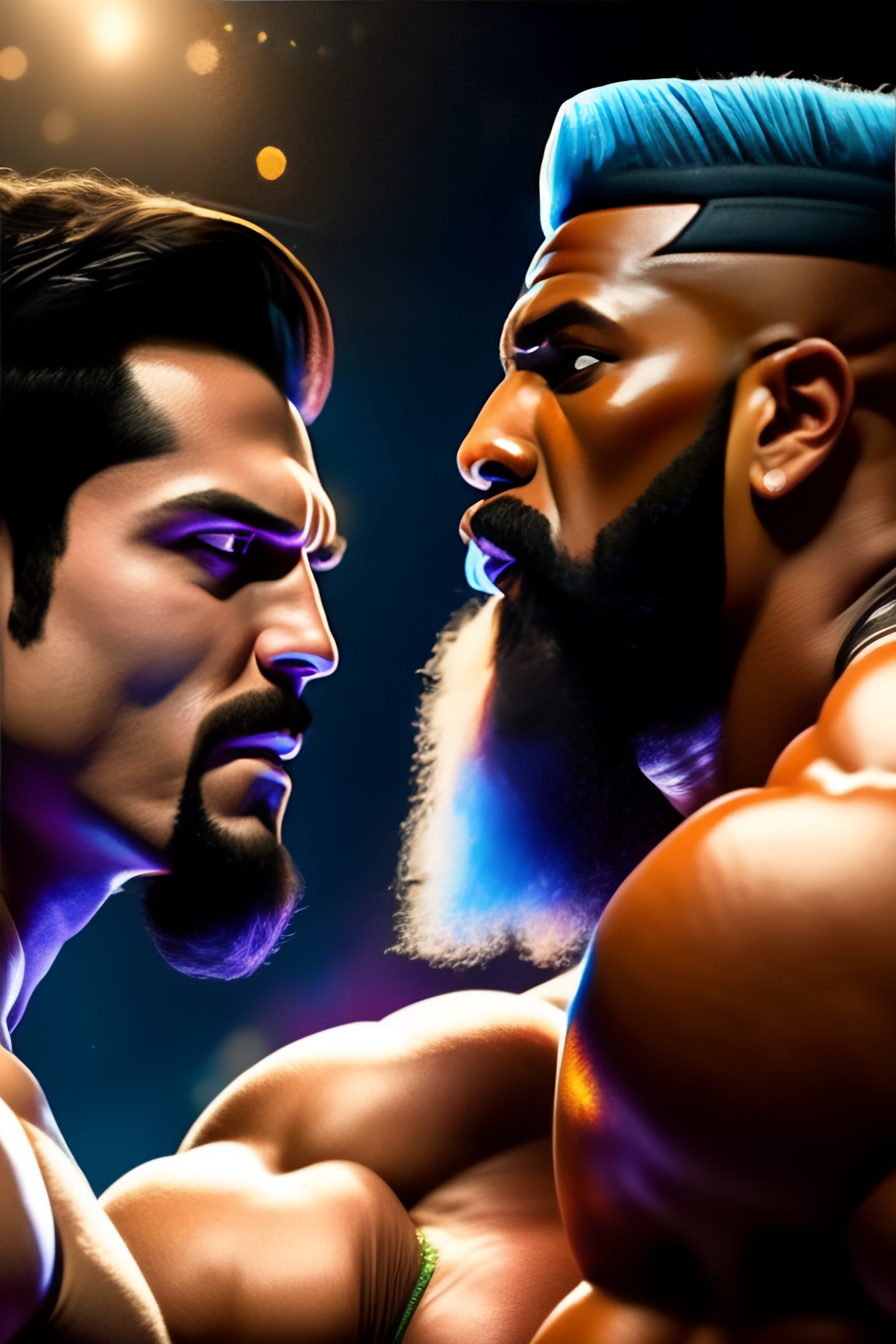 Dos hombres luchando en el rind de wwe con un fondo celeste