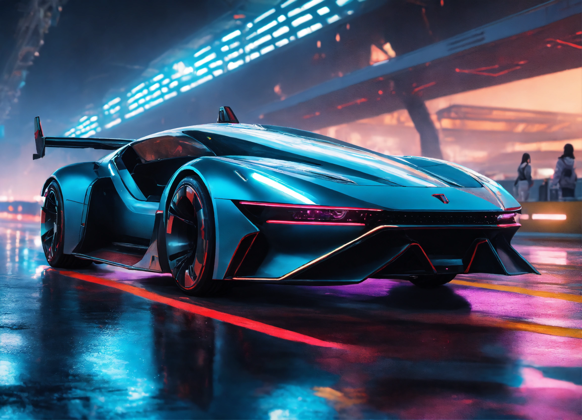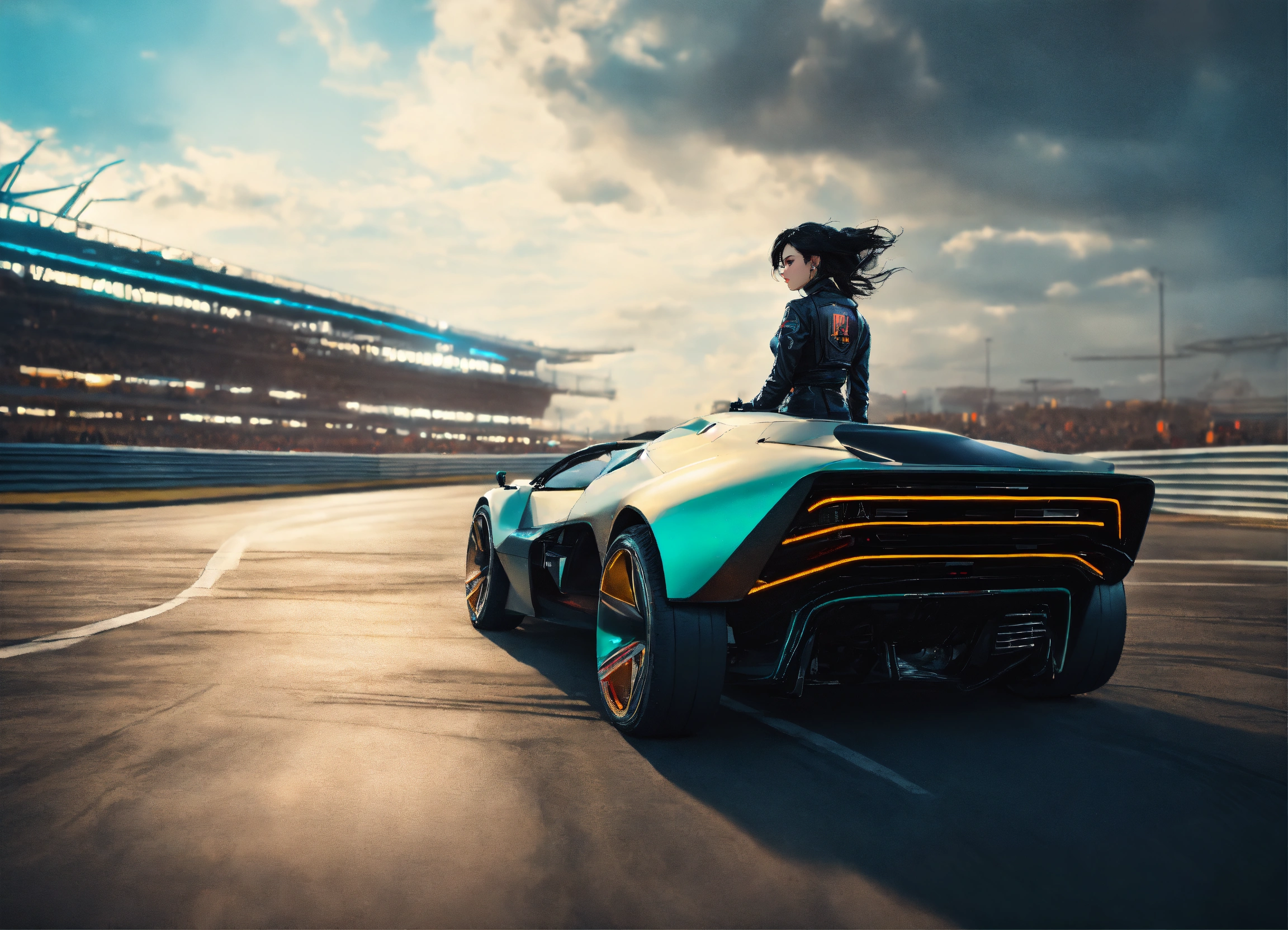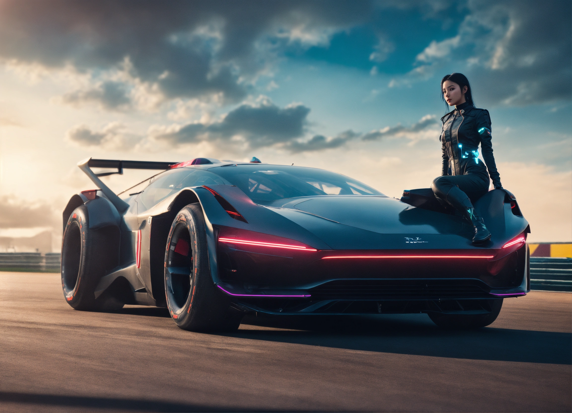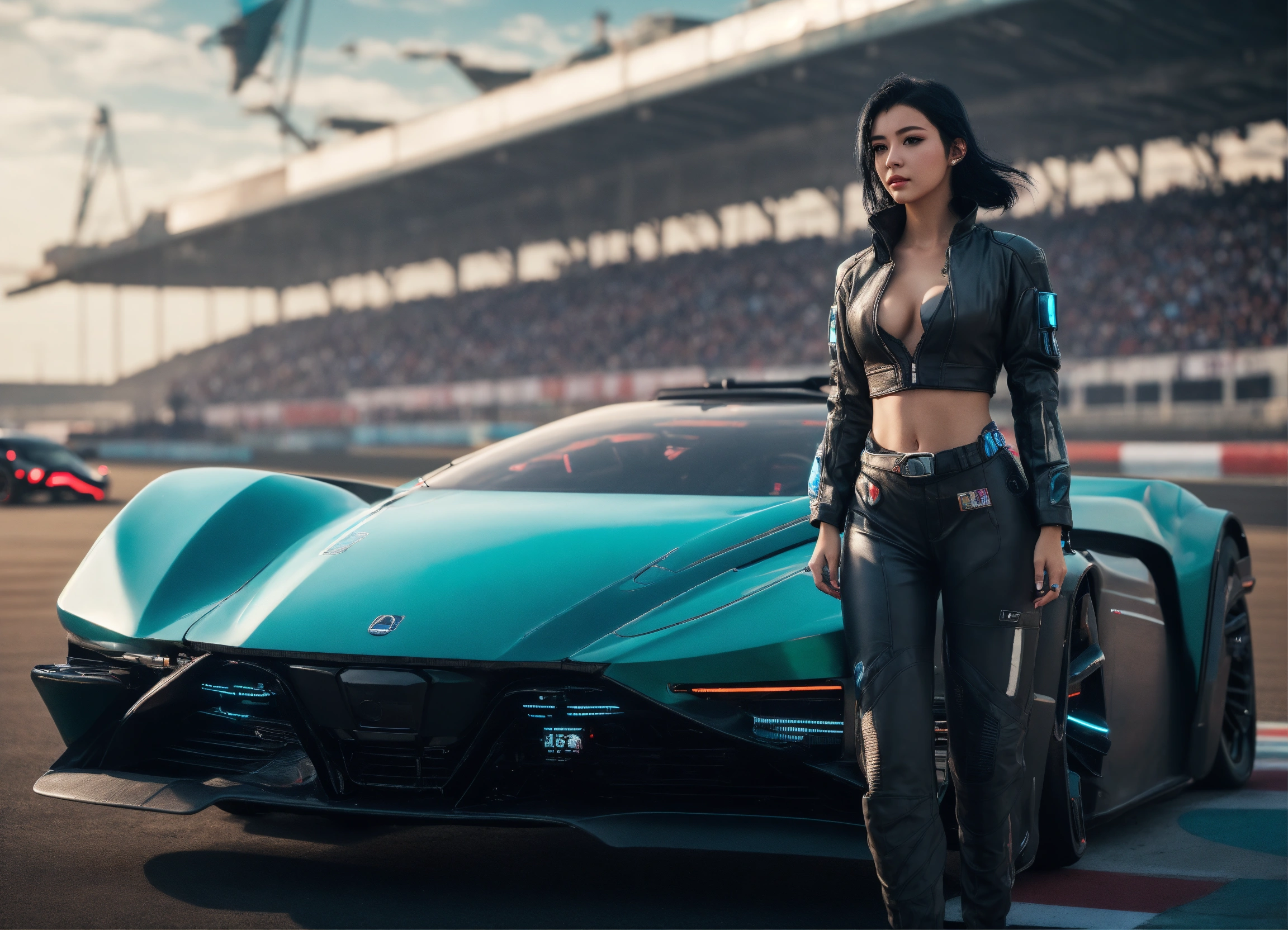 High detailed photo realistic natural photo cyberpunk dream girl, futuristic flying car in the background, at the racetrack, black hair