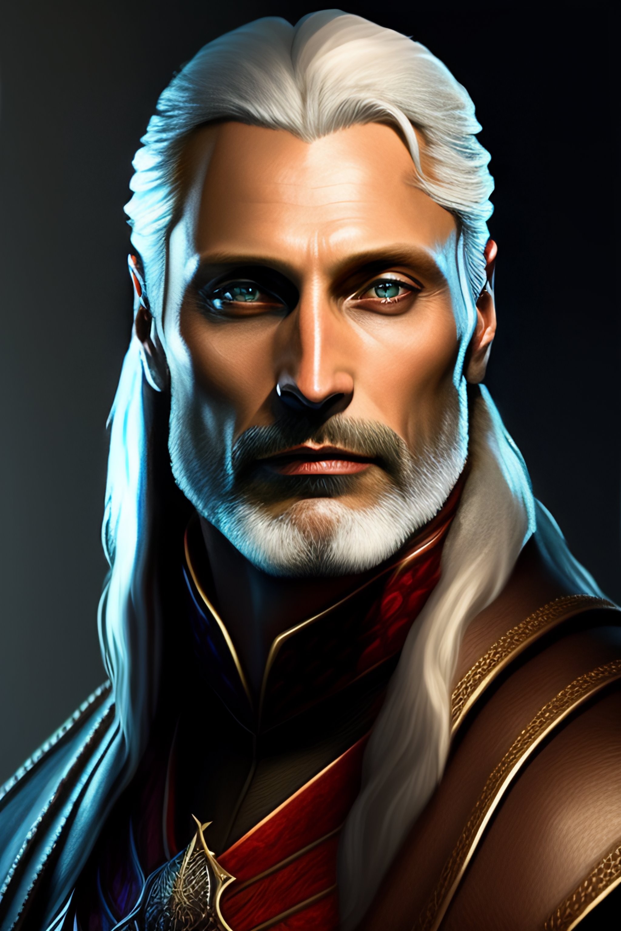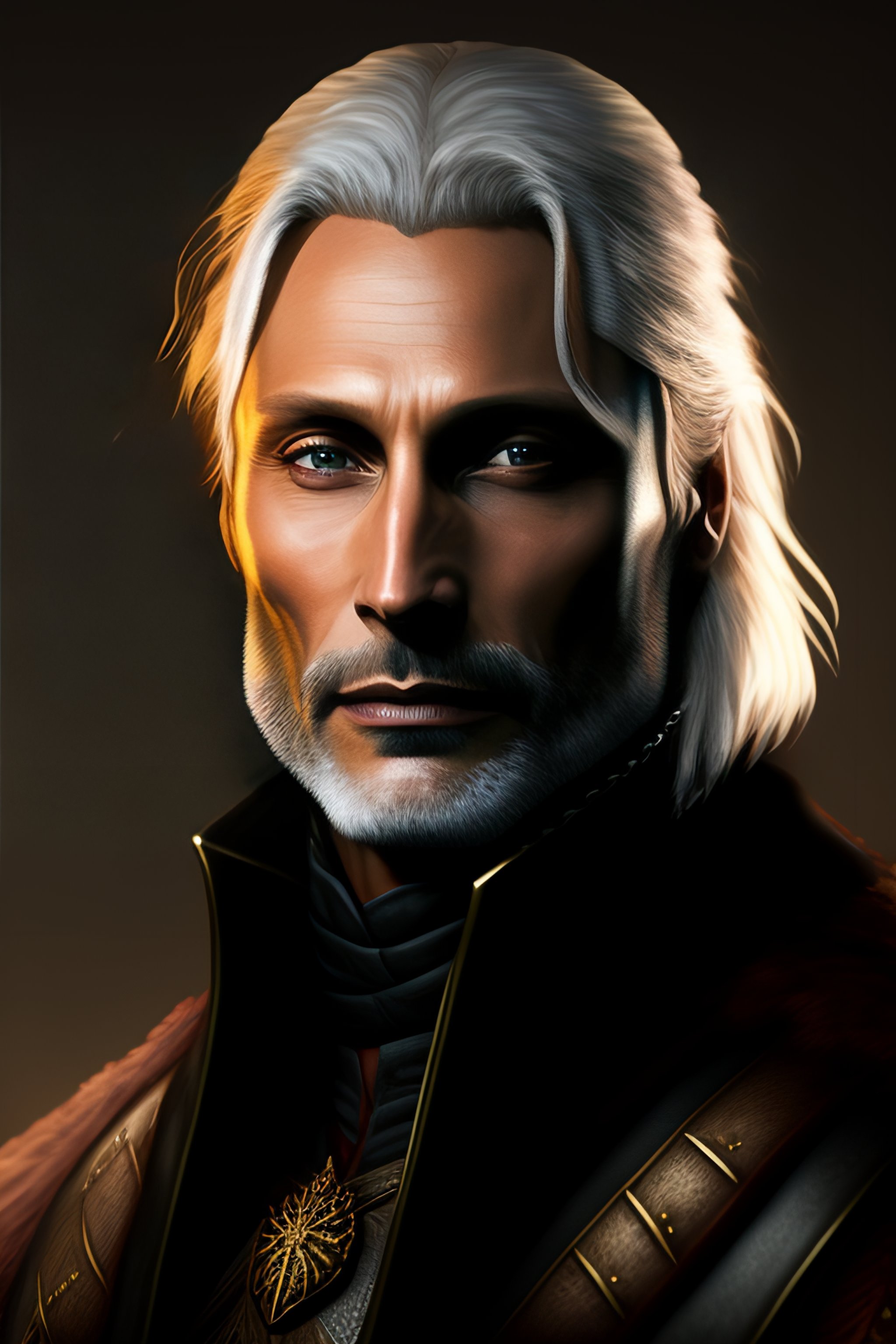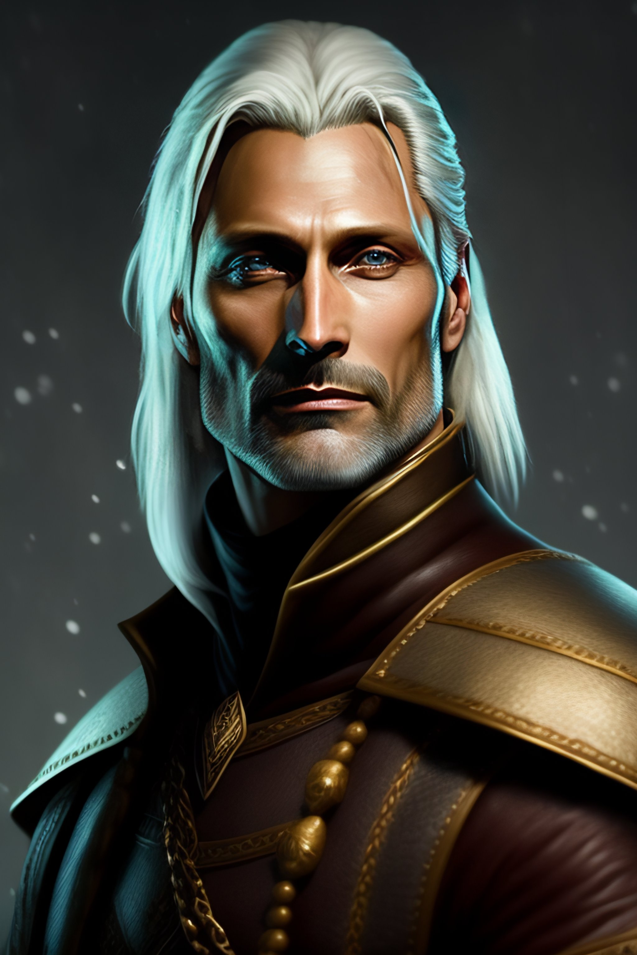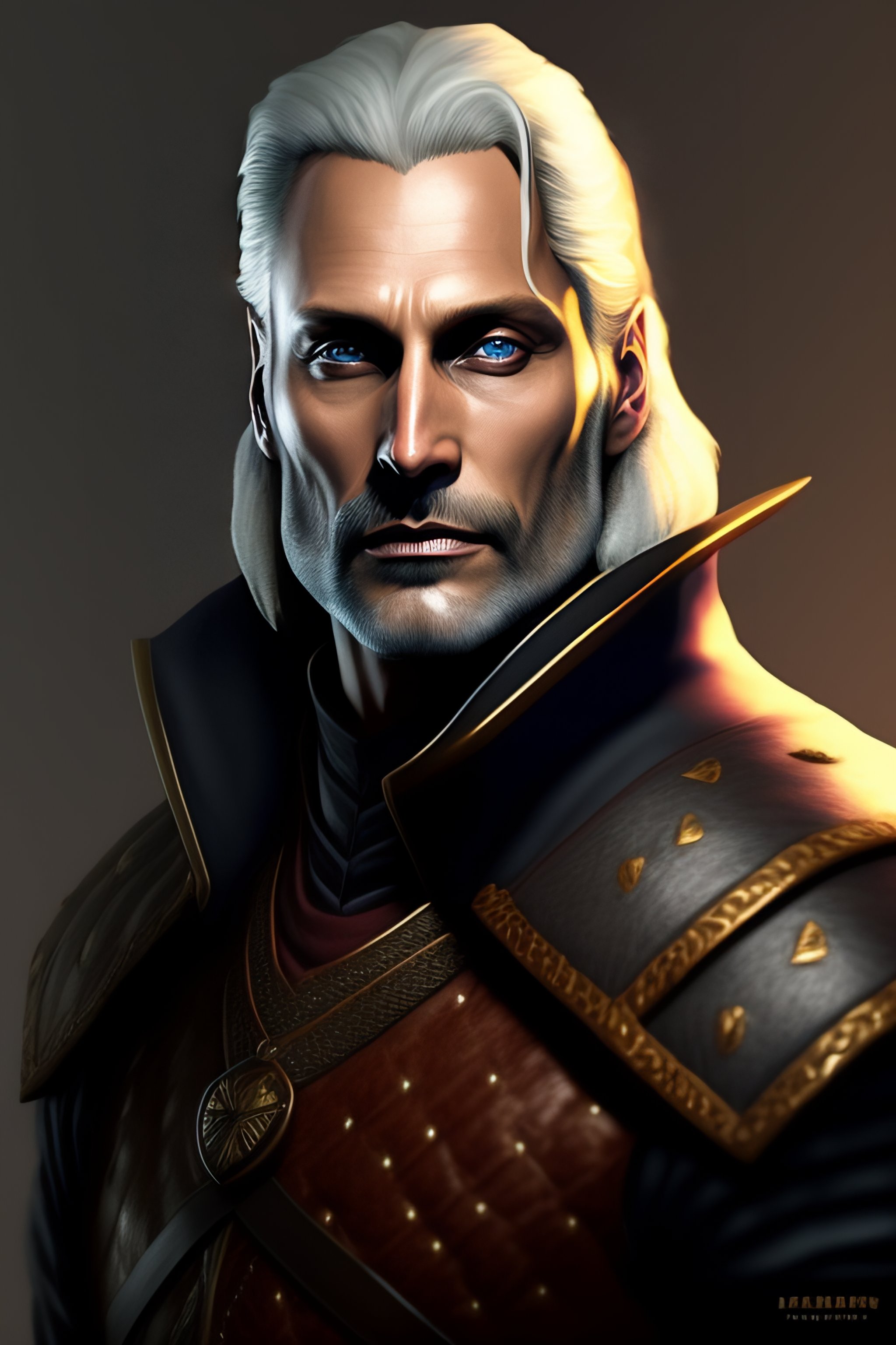 Mads mikkelsen as geralt of rivia in the style of a dungeons and dragons character portrait