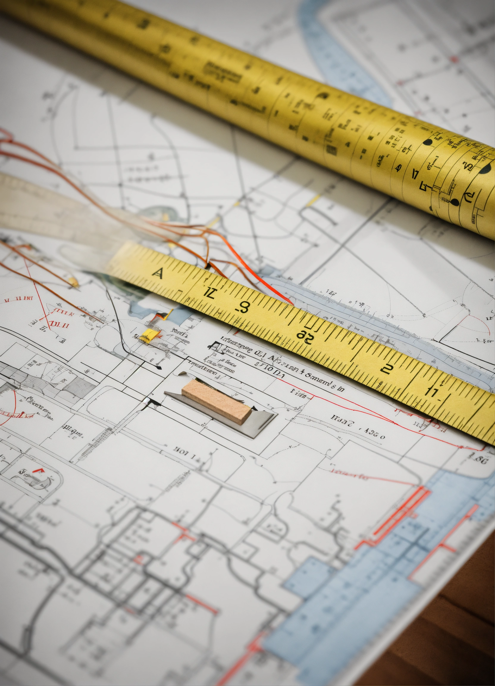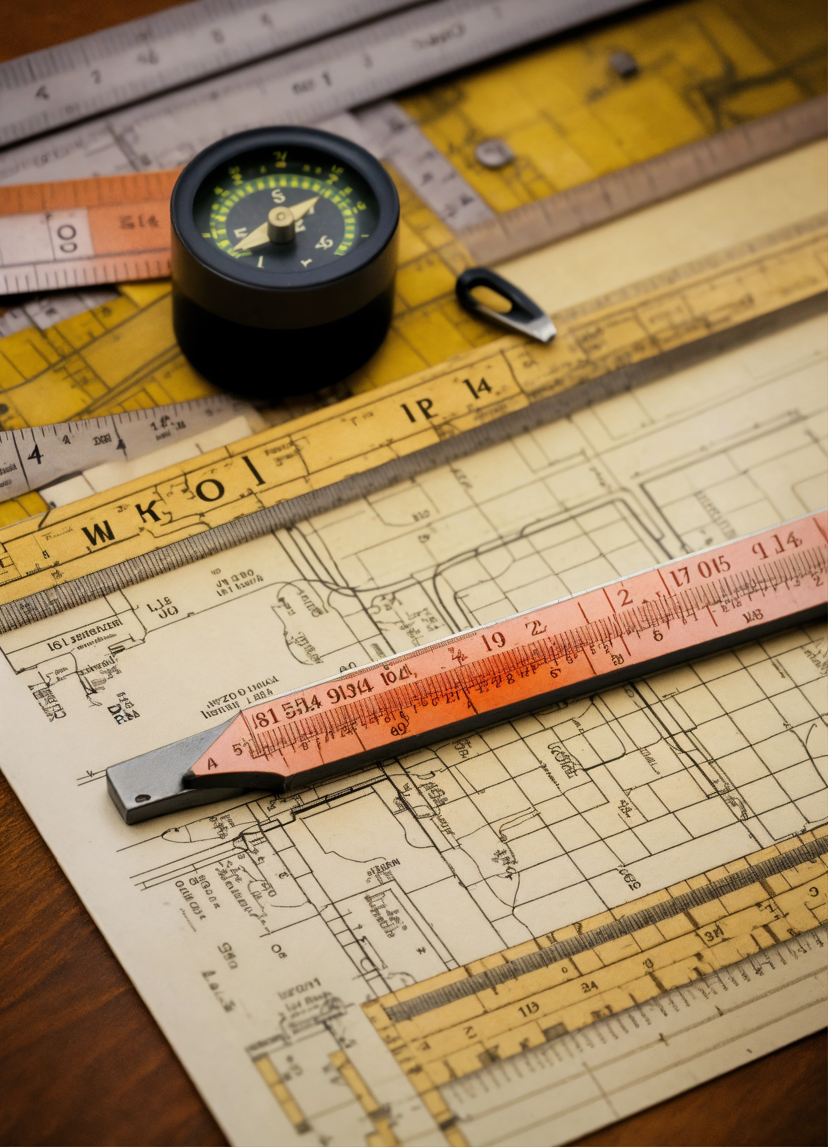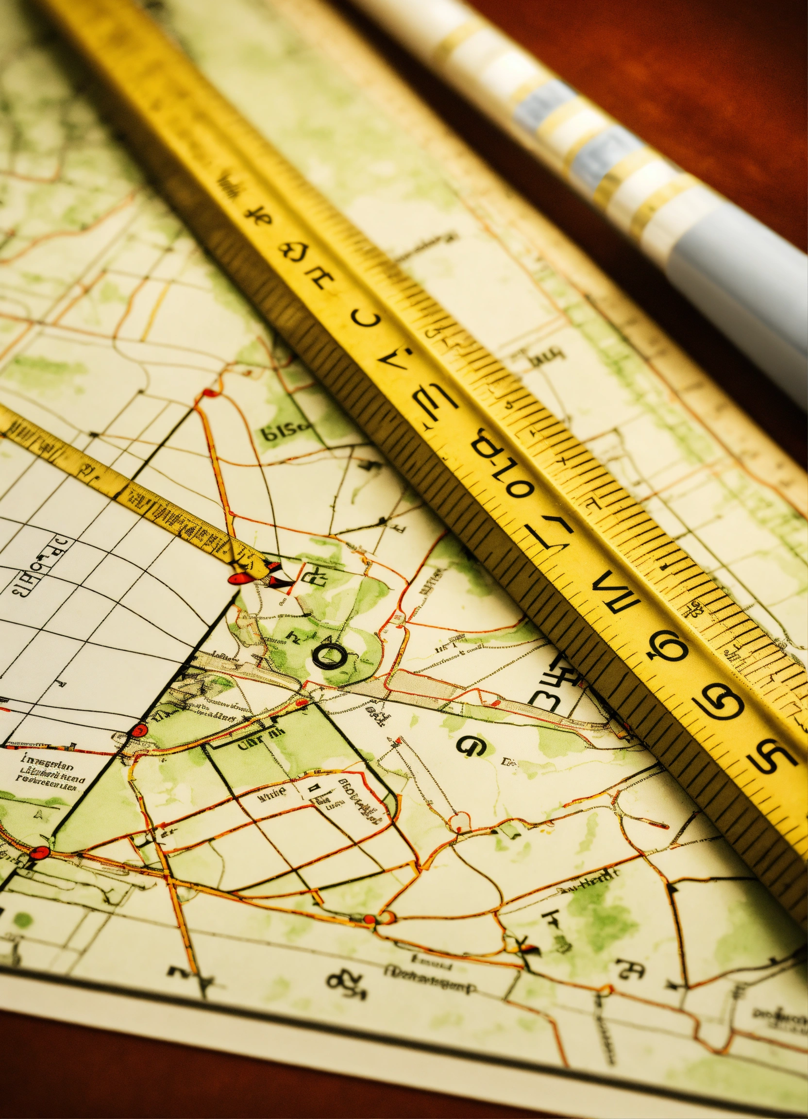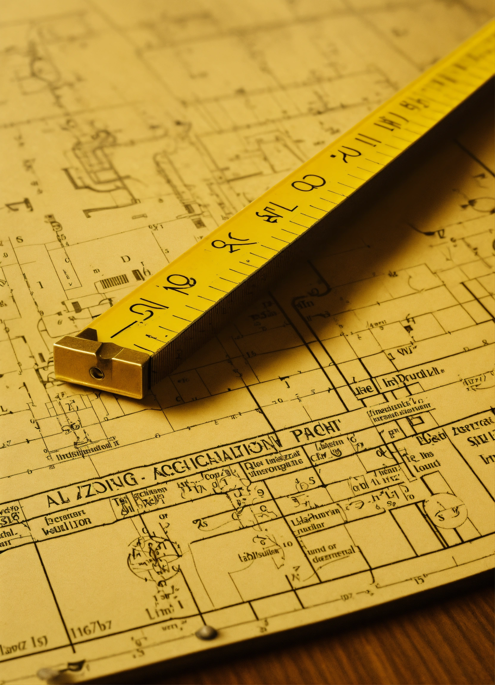 A close-up shot of a ruler and technical drawing tools resting on a zoning regulation document. the ruler is used to measure distances, while the compass represents the need to understand local regulations. the document contains text and diagrams related to land use guidelines.