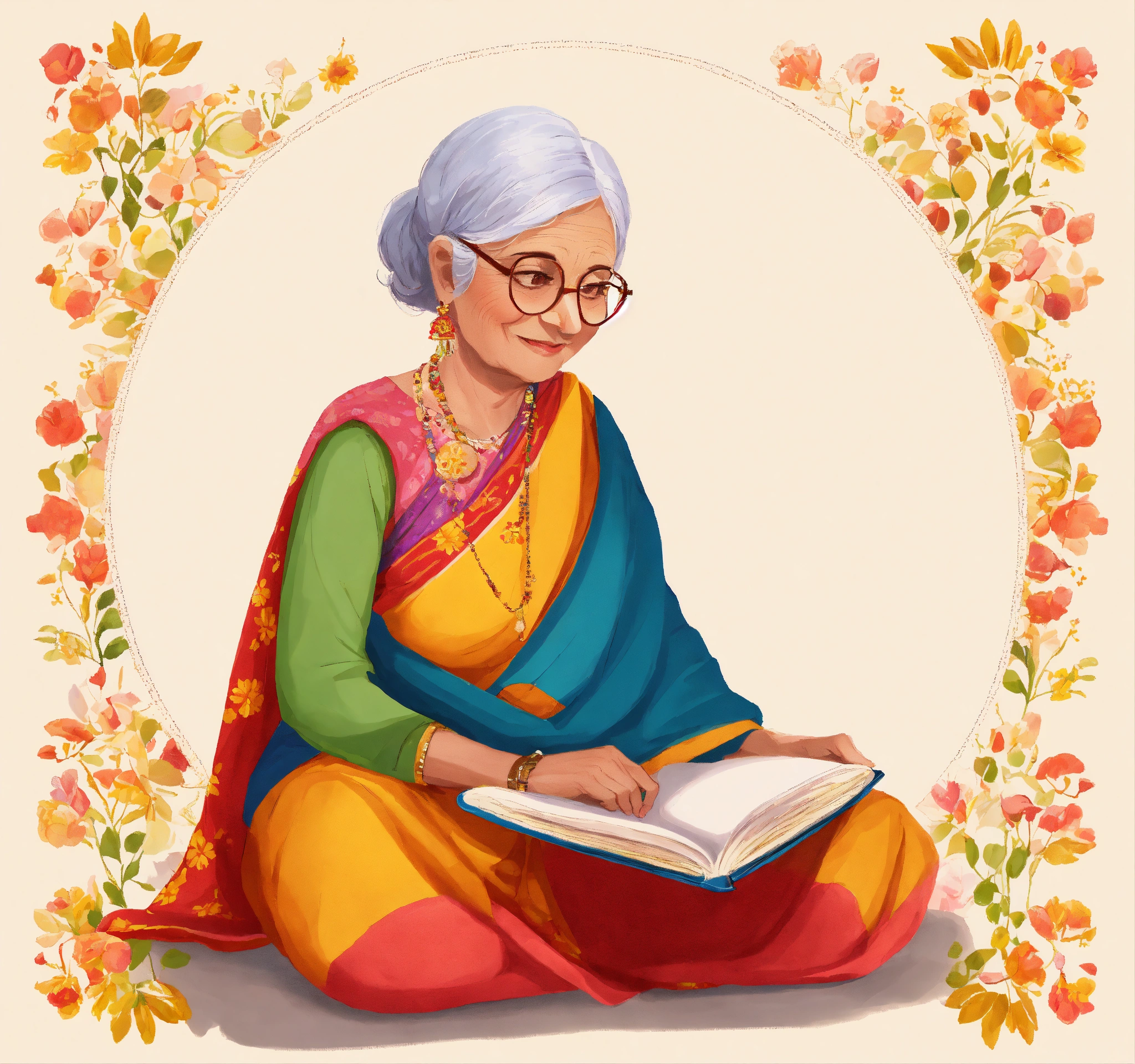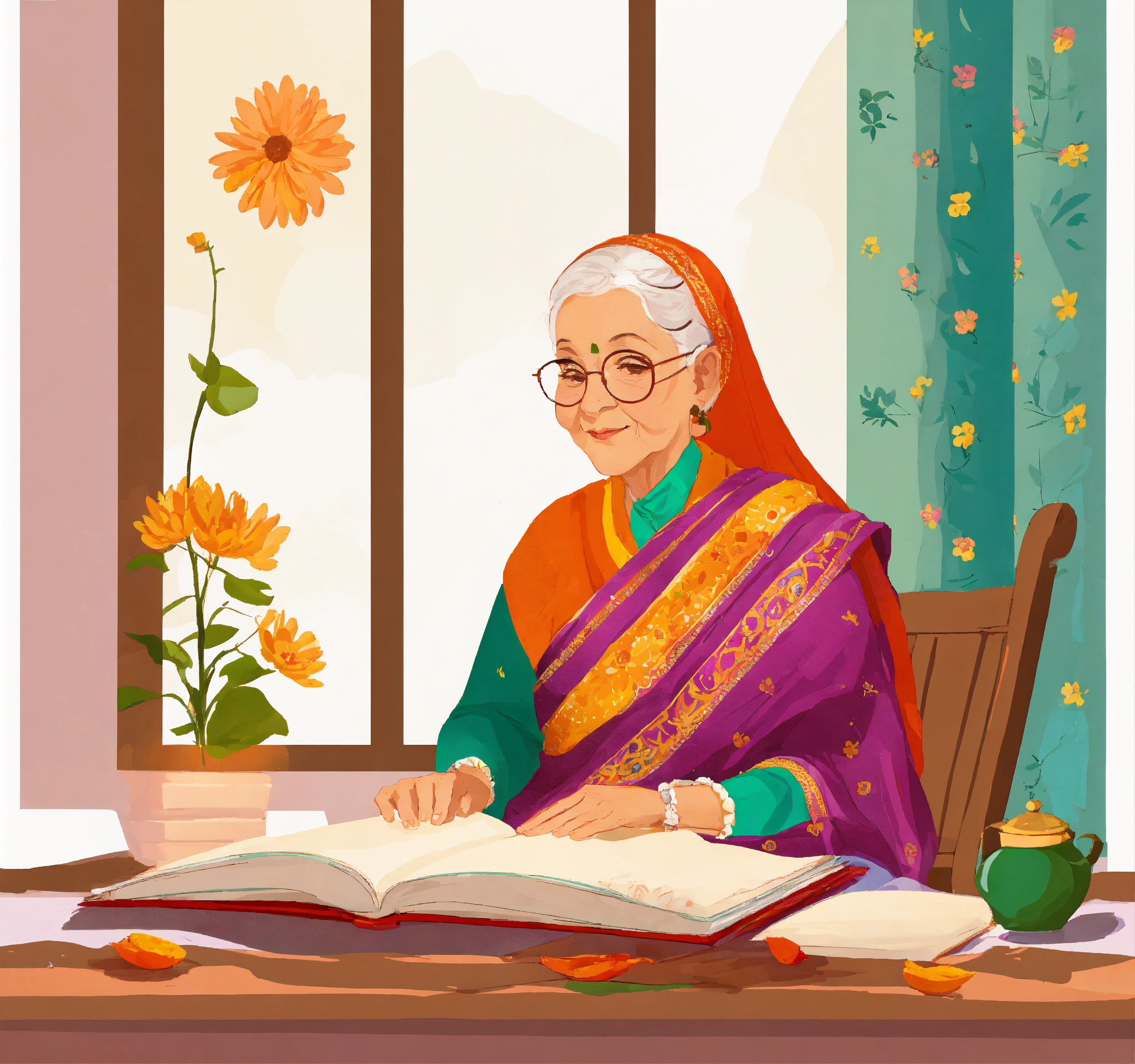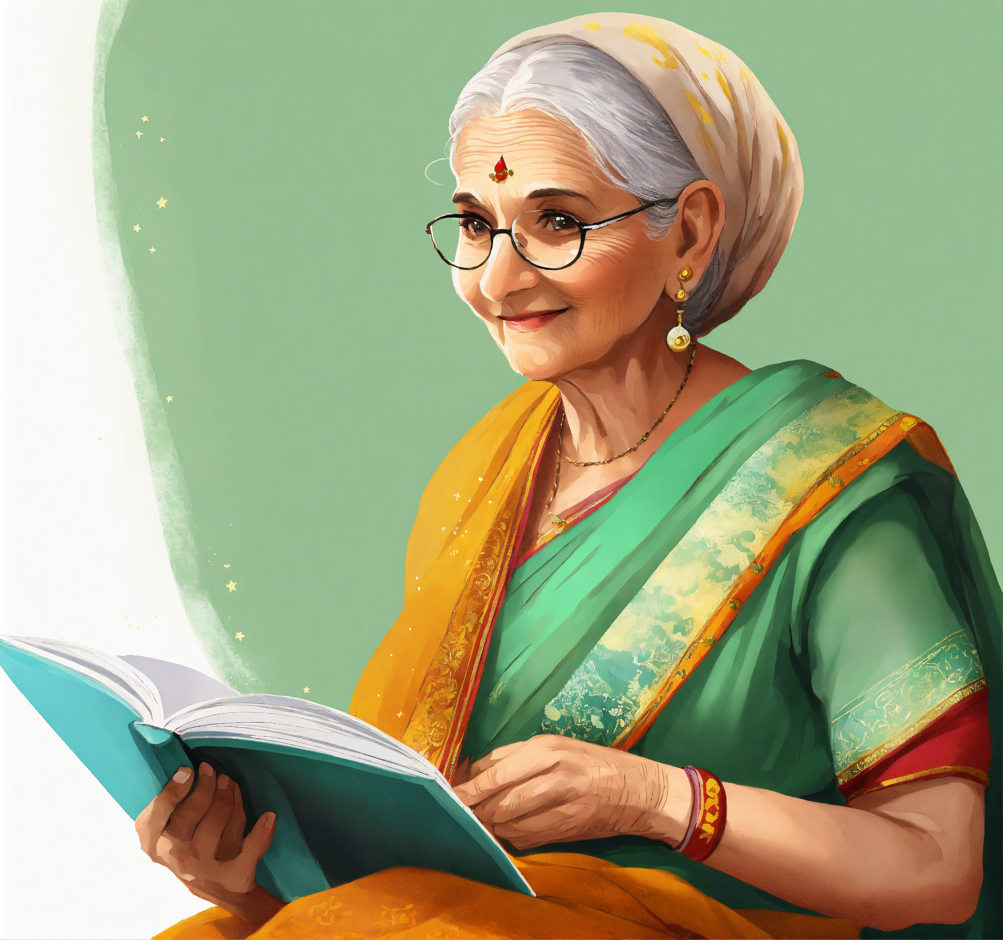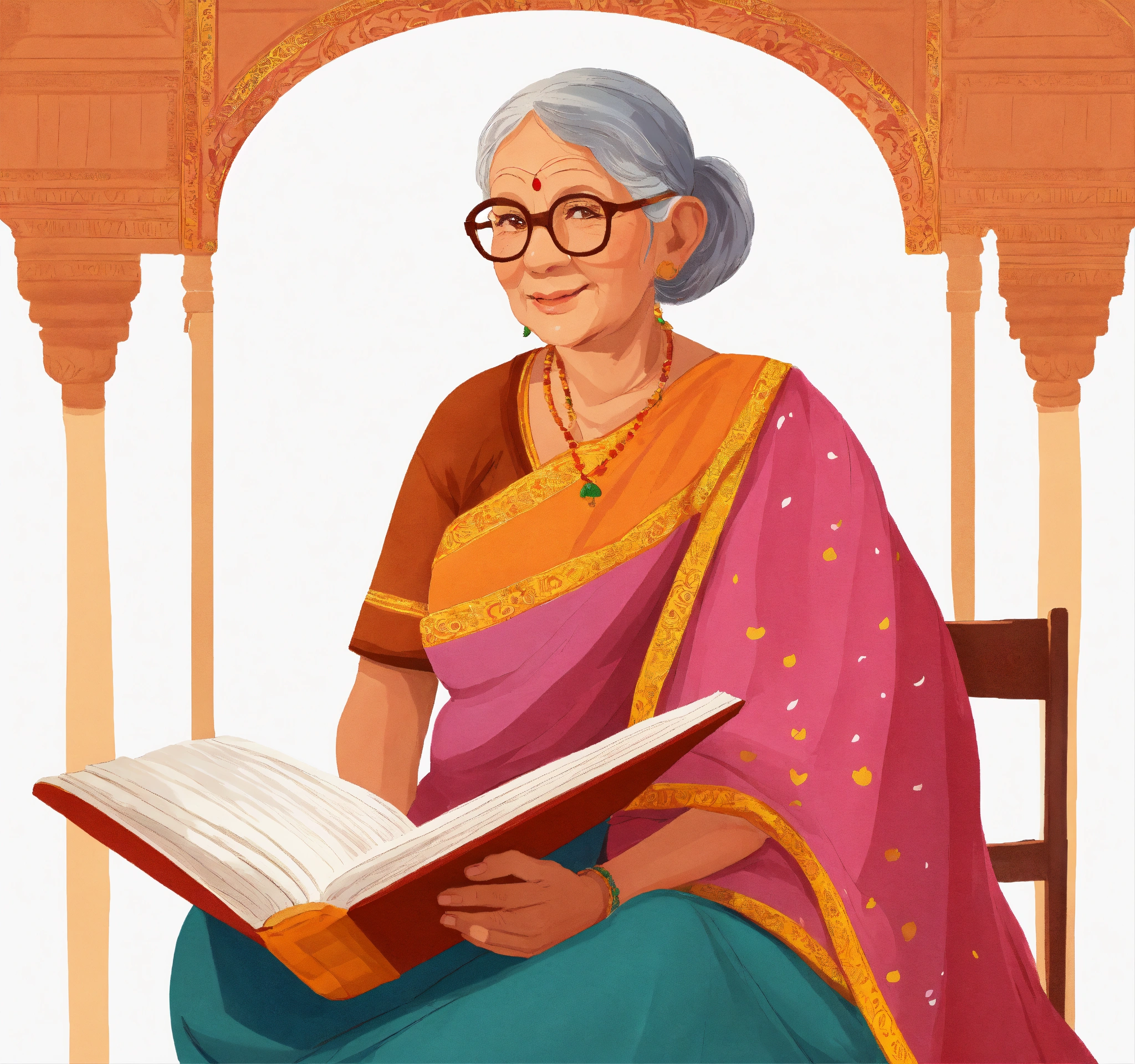Grandma in a sari, childrens book, illustration isolated on white background, copy space, no background