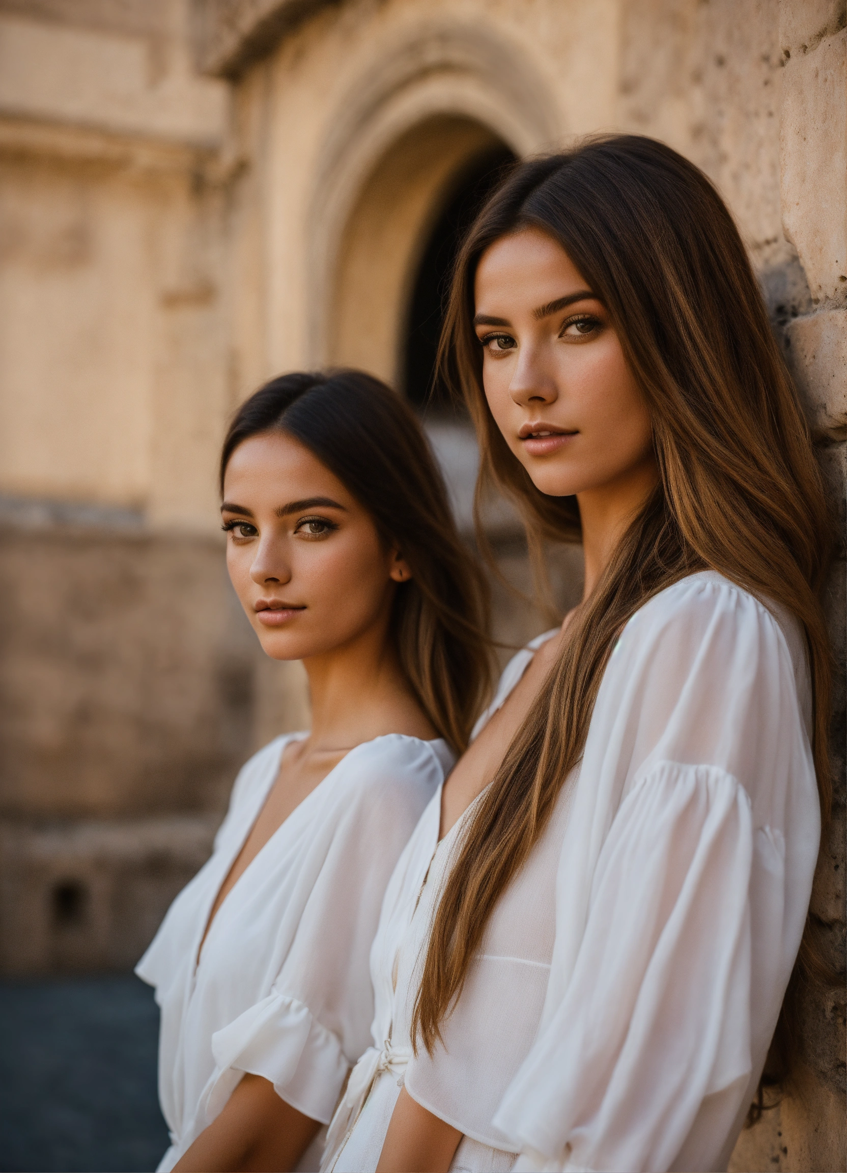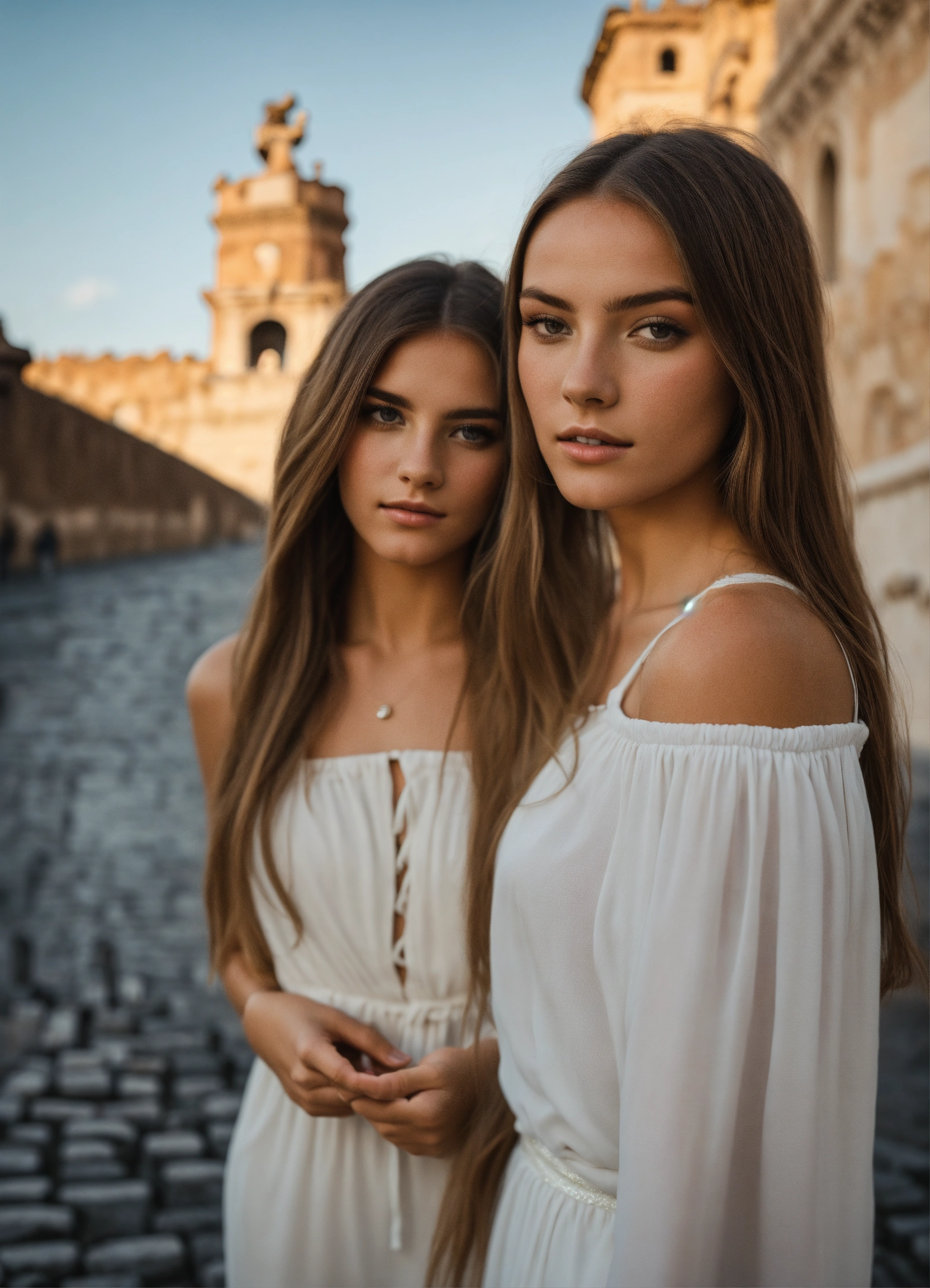Photo at day with two female models and castel sant'angelo in rome, looking into the the camera; long hair, clothes in white color, innocence, perfect hands