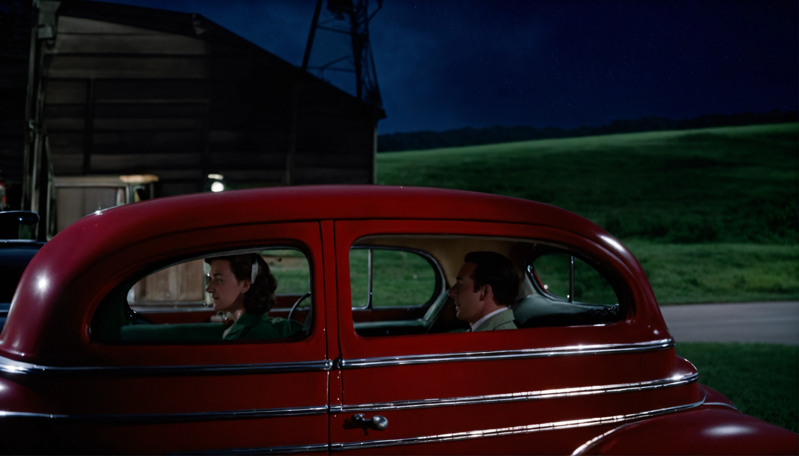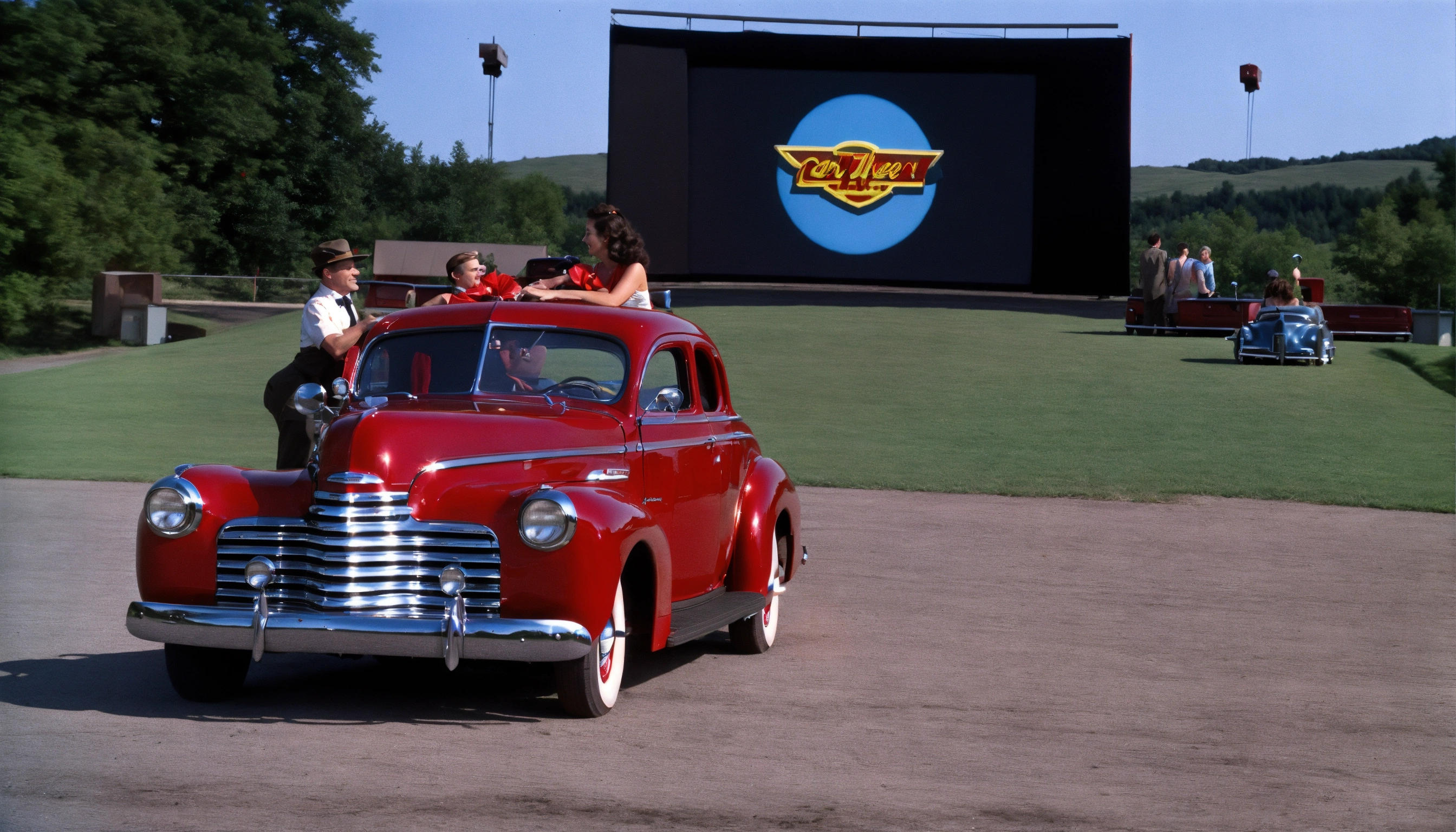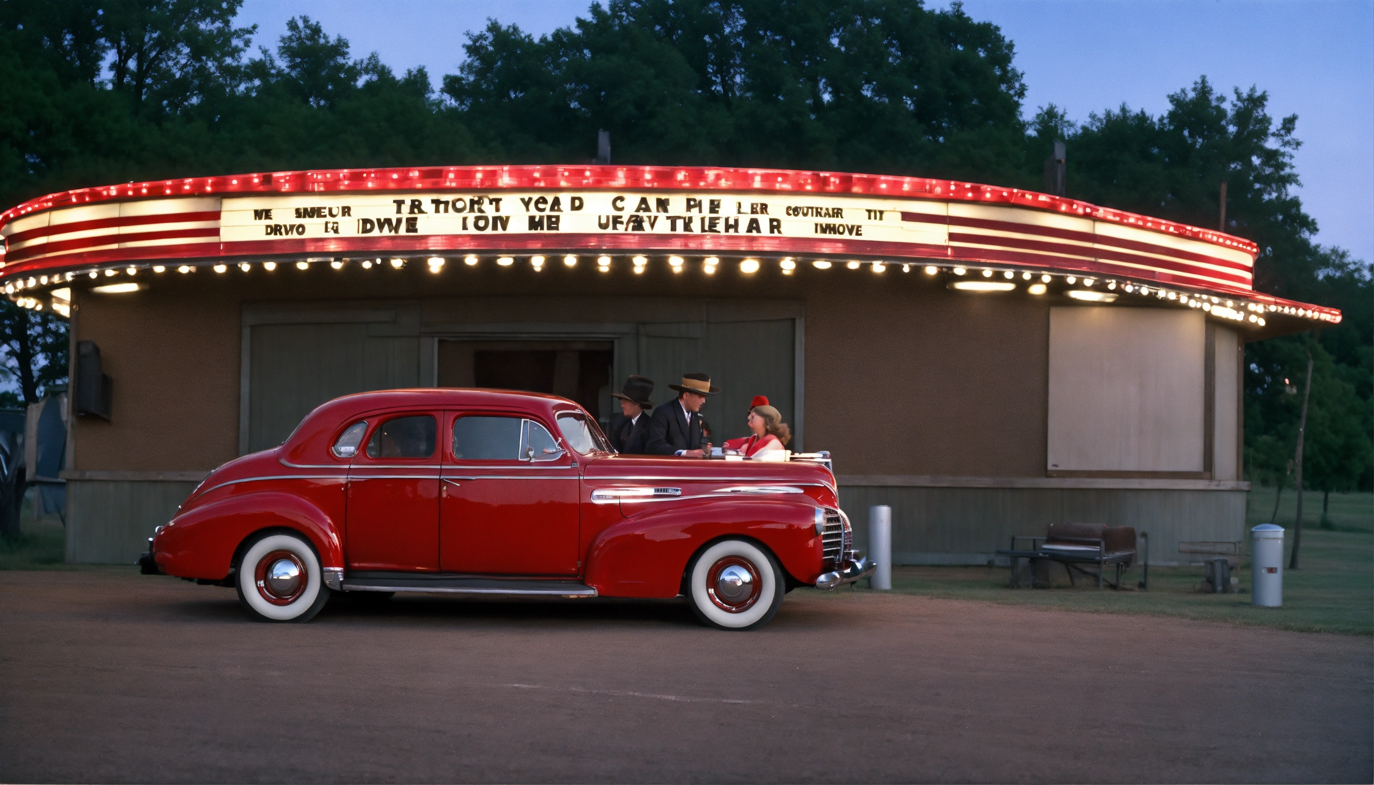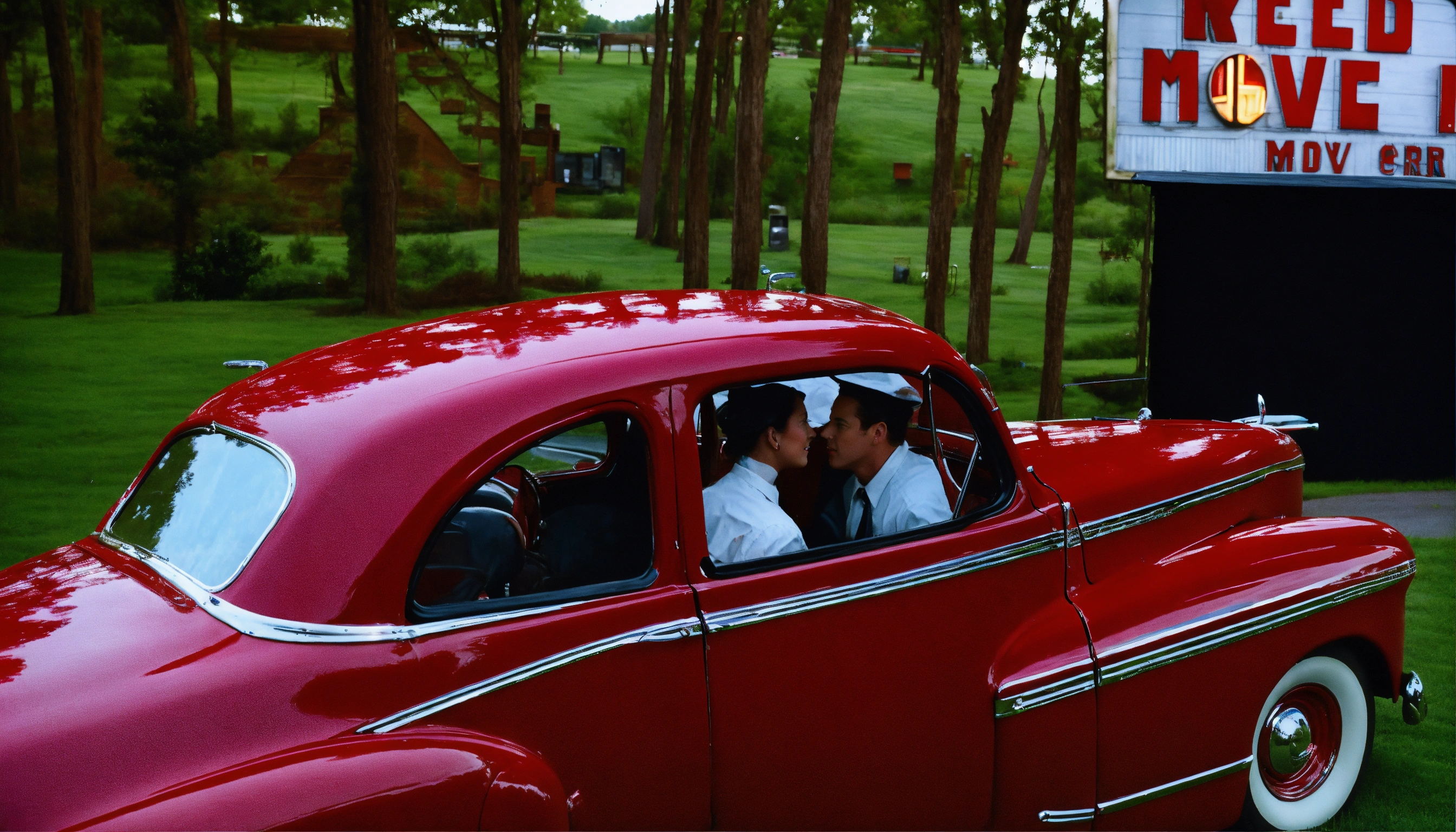 A man and woman in an old red chevy car in the 1940s at a outdoor drive-in movie theater