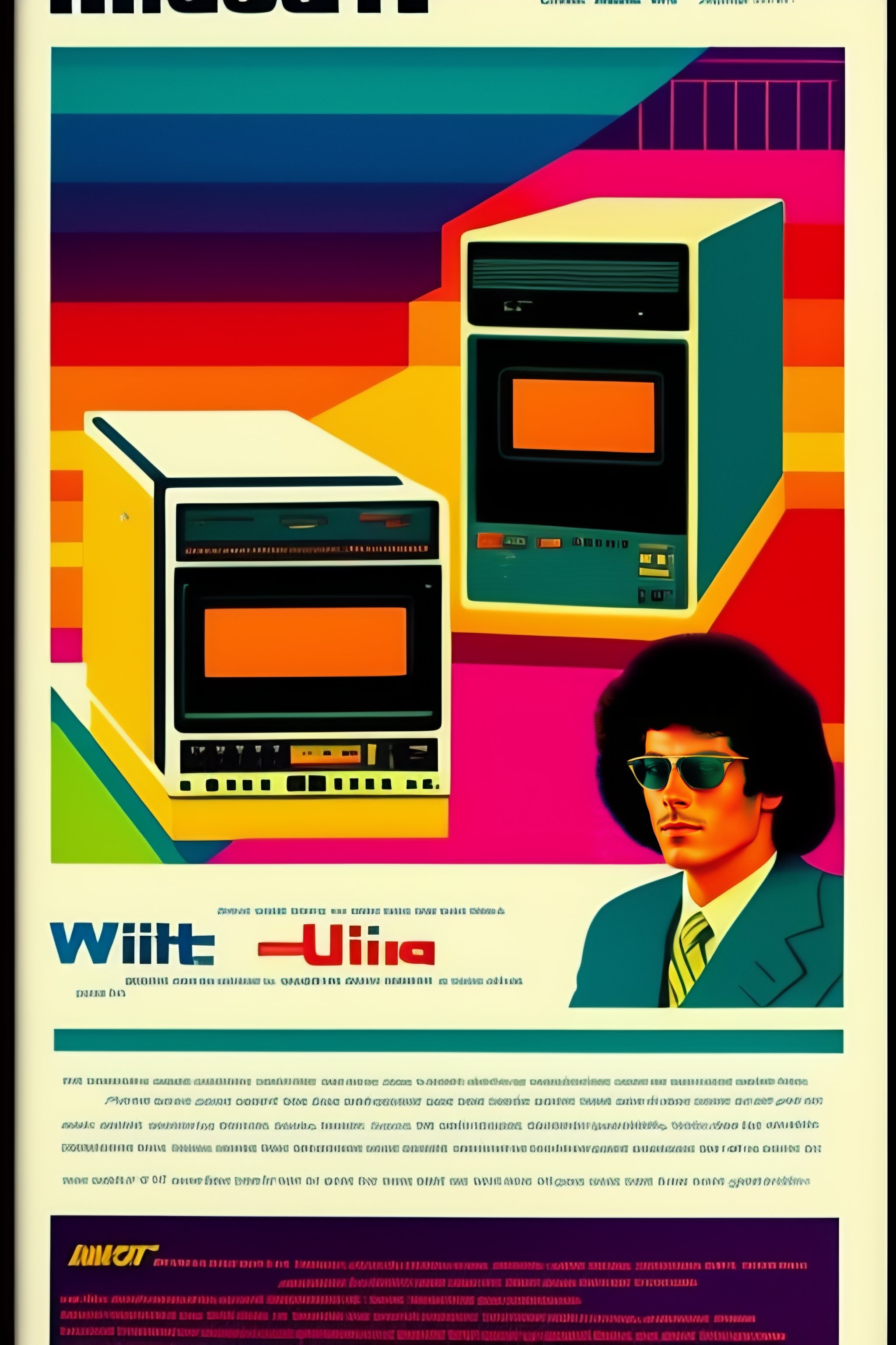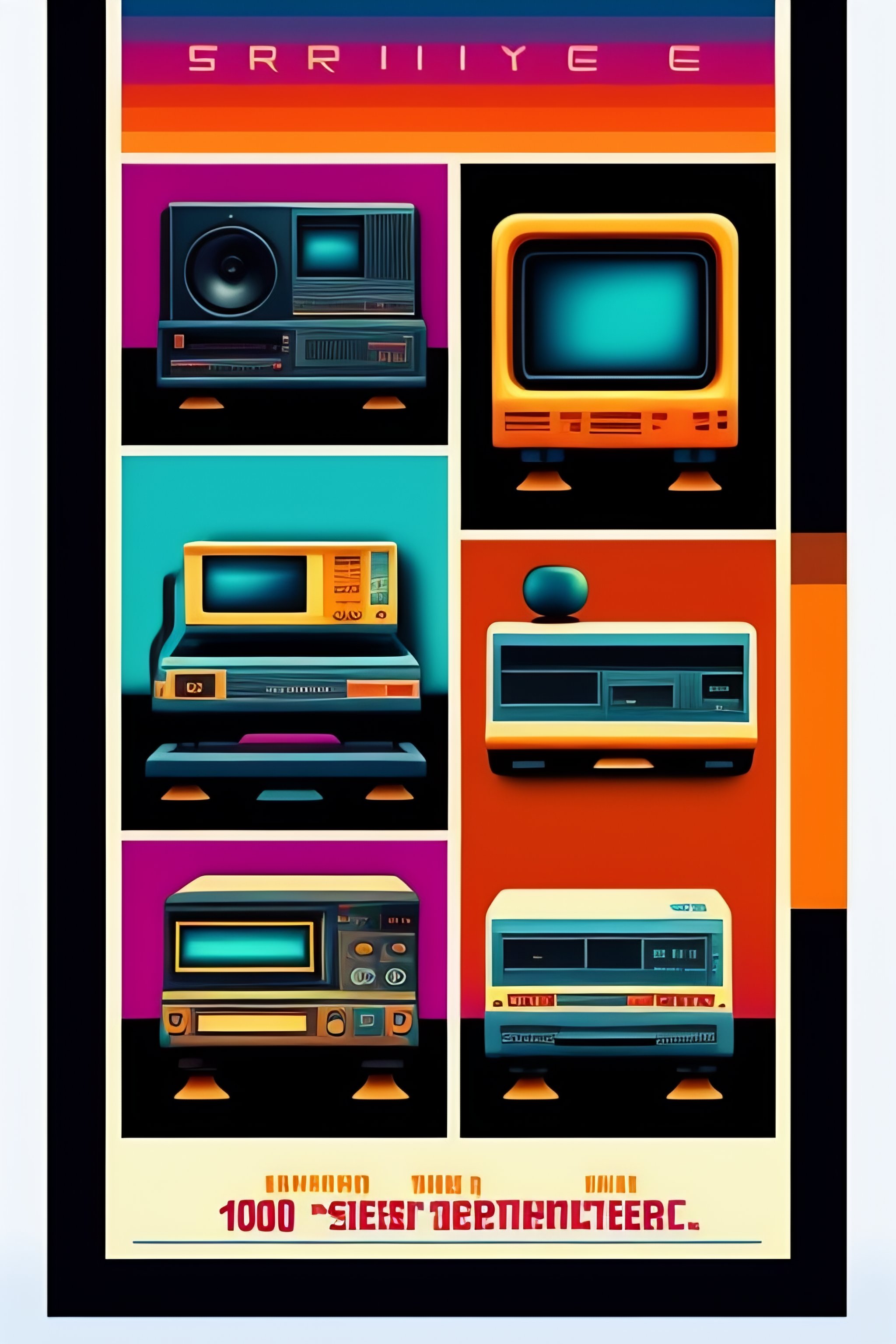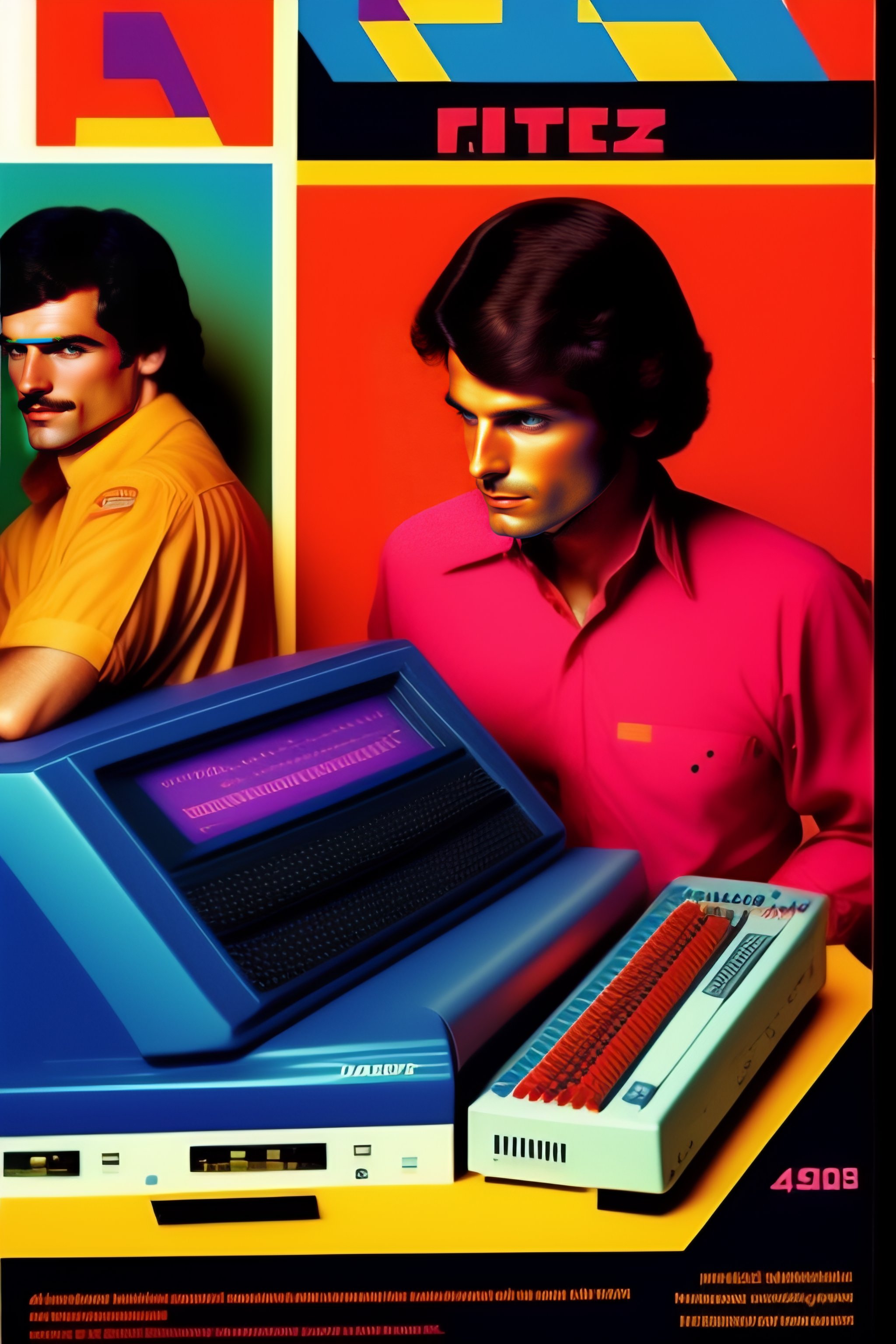 Full - color 1980's magazine advertisement for a retro software company, whit hipster programers and retro computers, strong colors