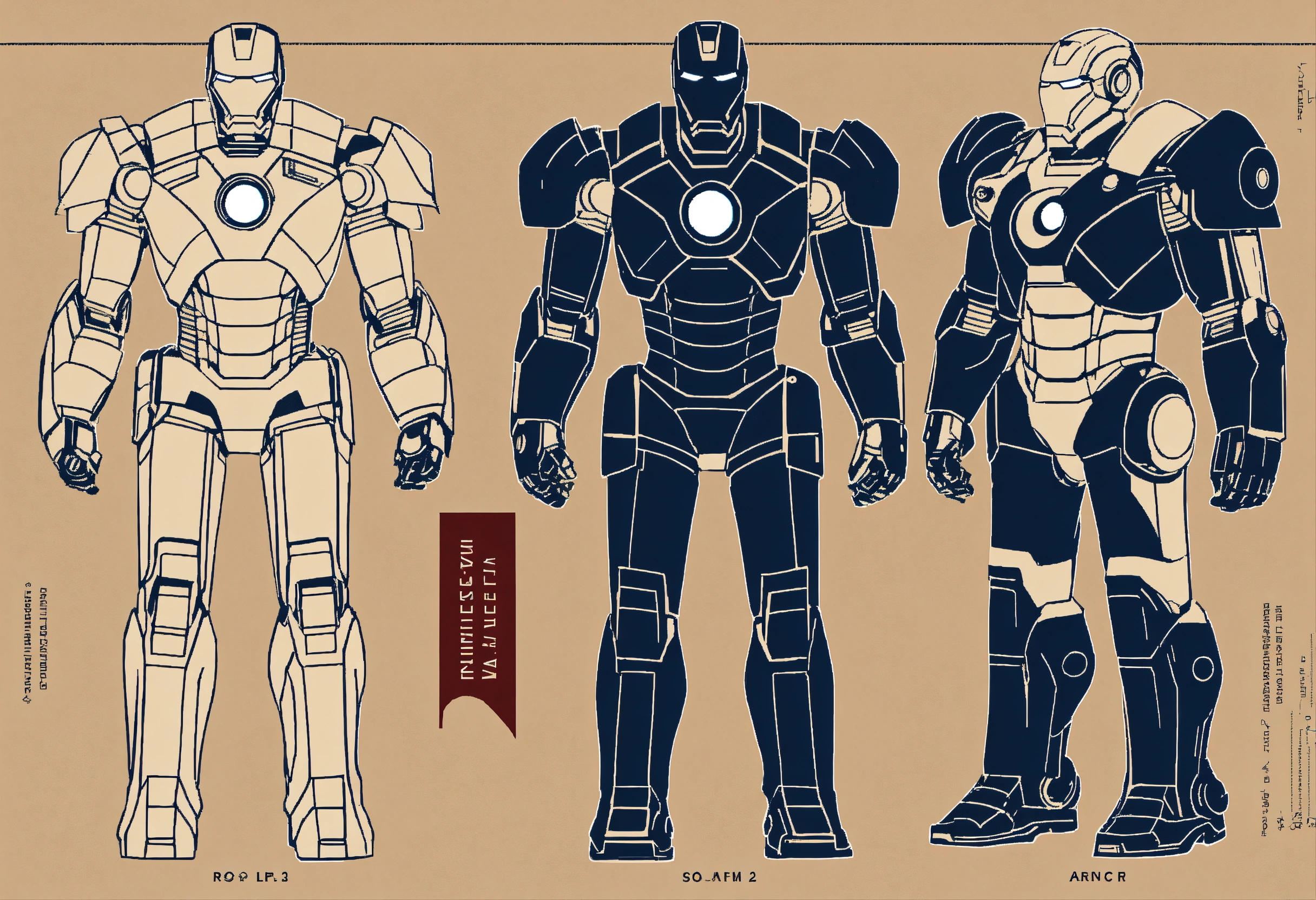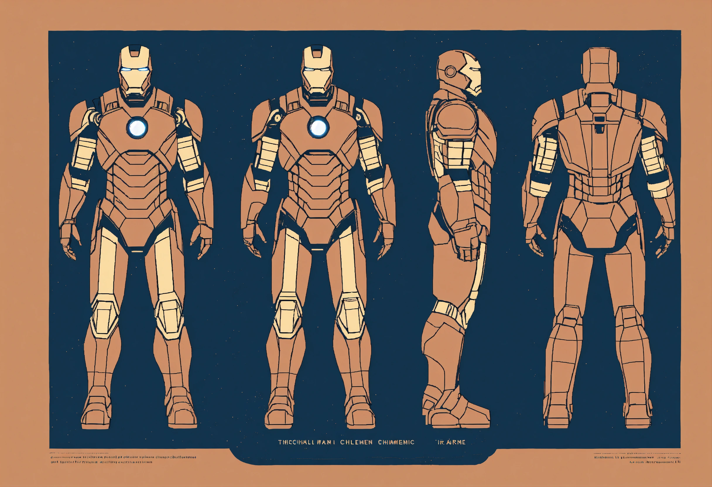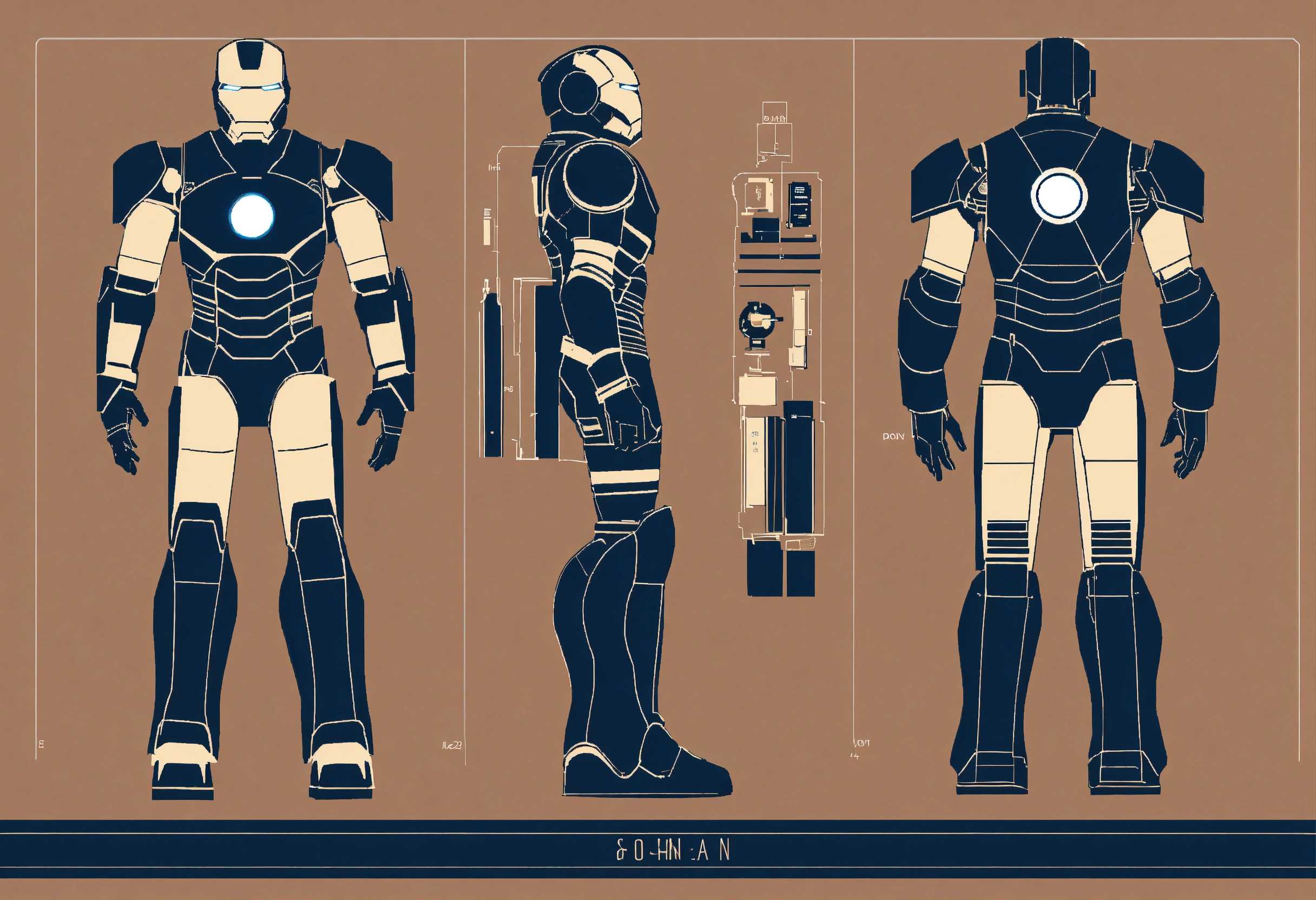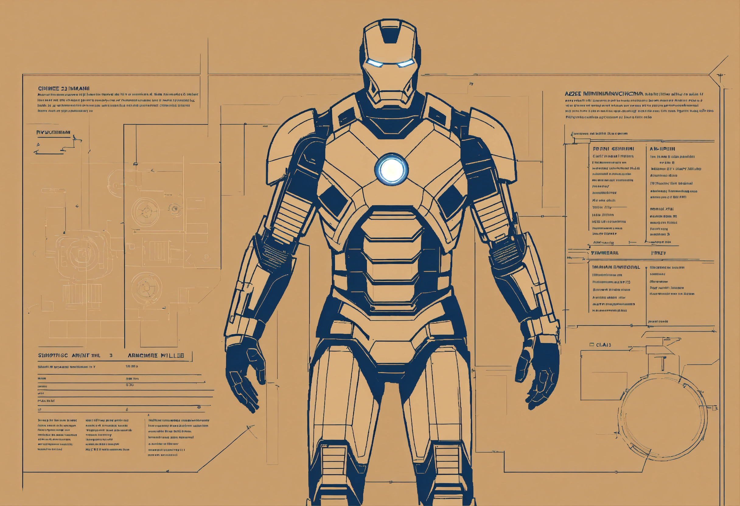A minimalistic illustration of the technical schematic of an iron man suit, capturing its essence with clean lines and simplified forms, perfect for printing on art prints and tote bags. make it navy blue and tan --ar 23