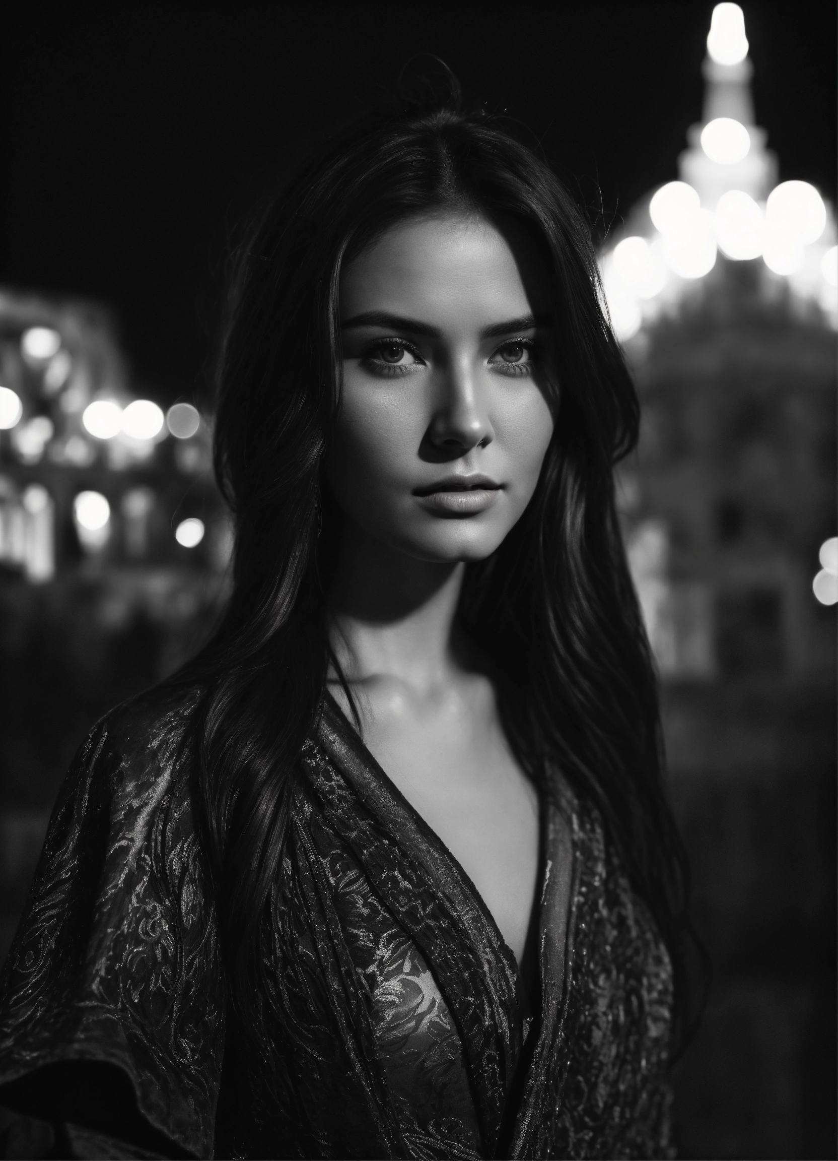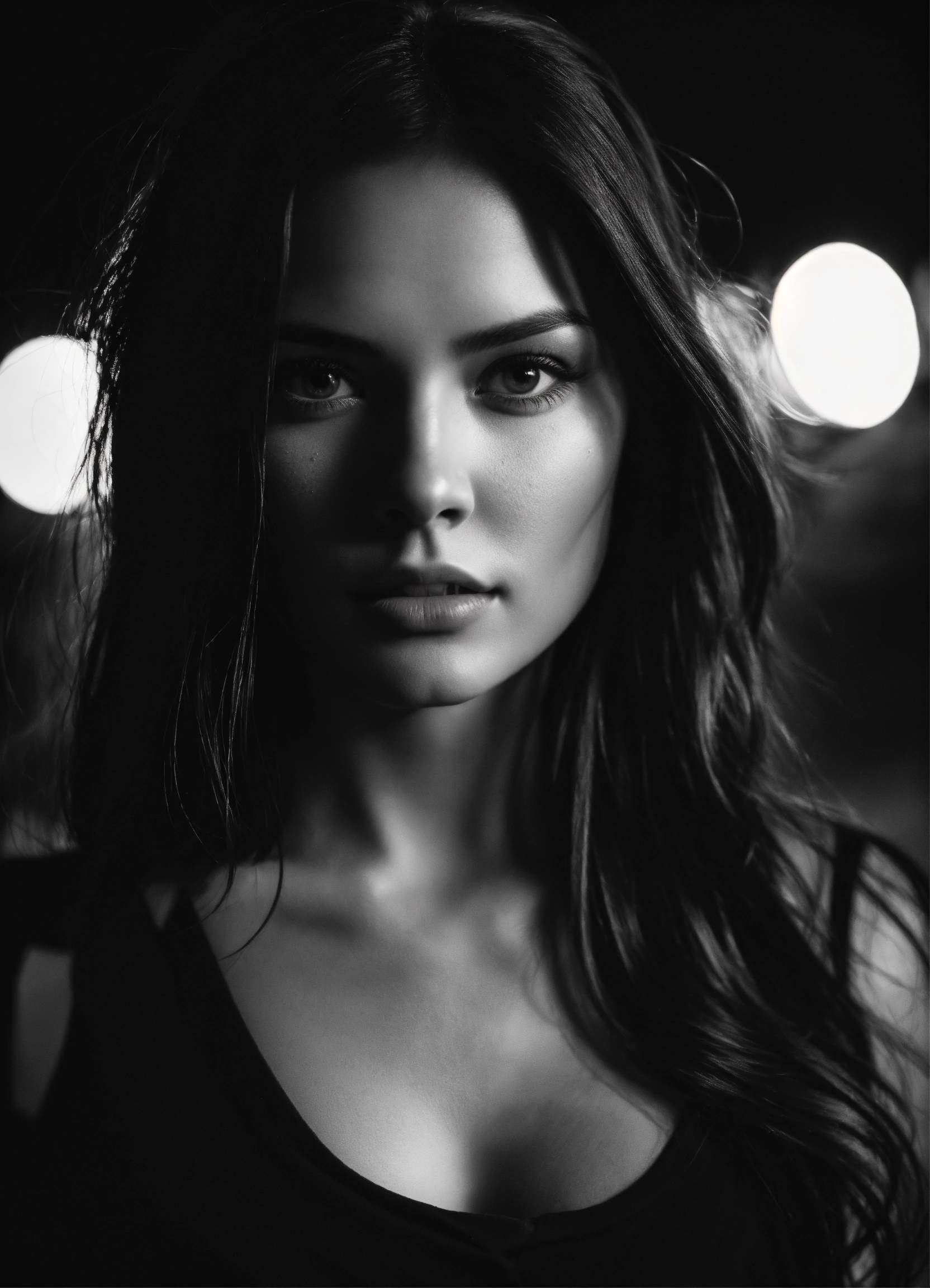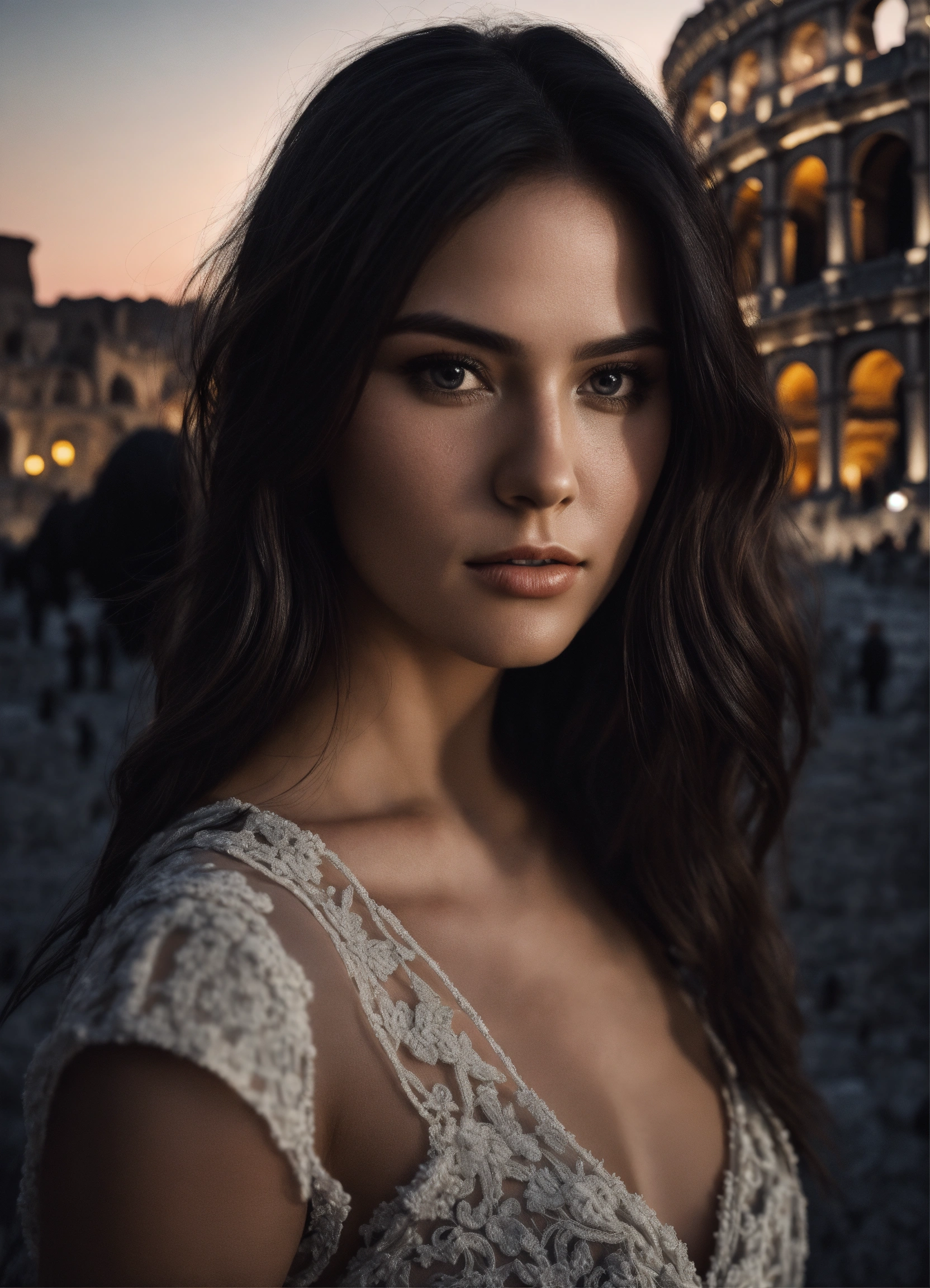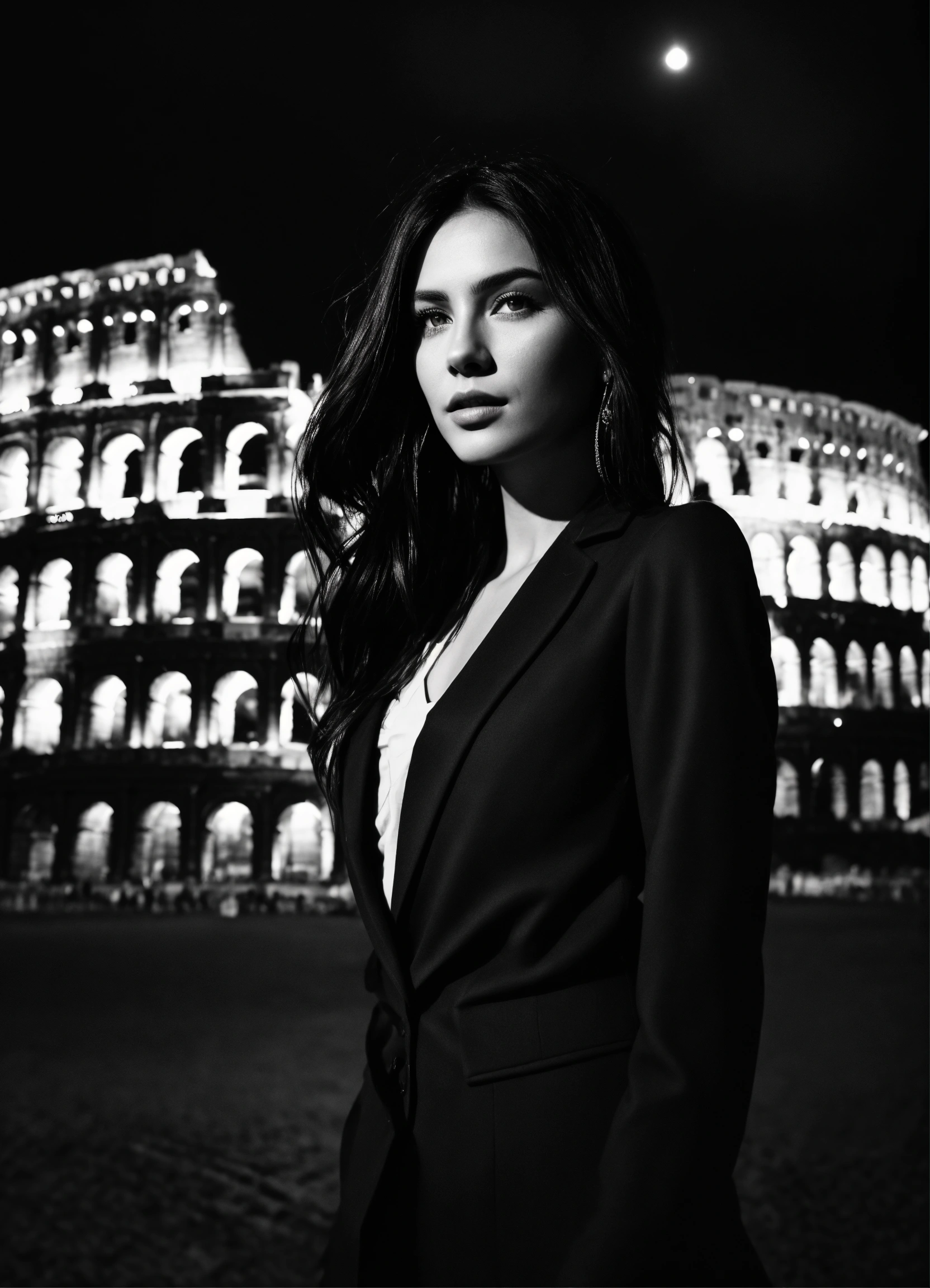Photo of model women long dark hair, black and white, realistic, portrait, not painted, very detailed faces, skin with pores, 4k, dark suit, skin not smoothed, looking into the camera, dark shirt. colosseum in rome in full view at night as background