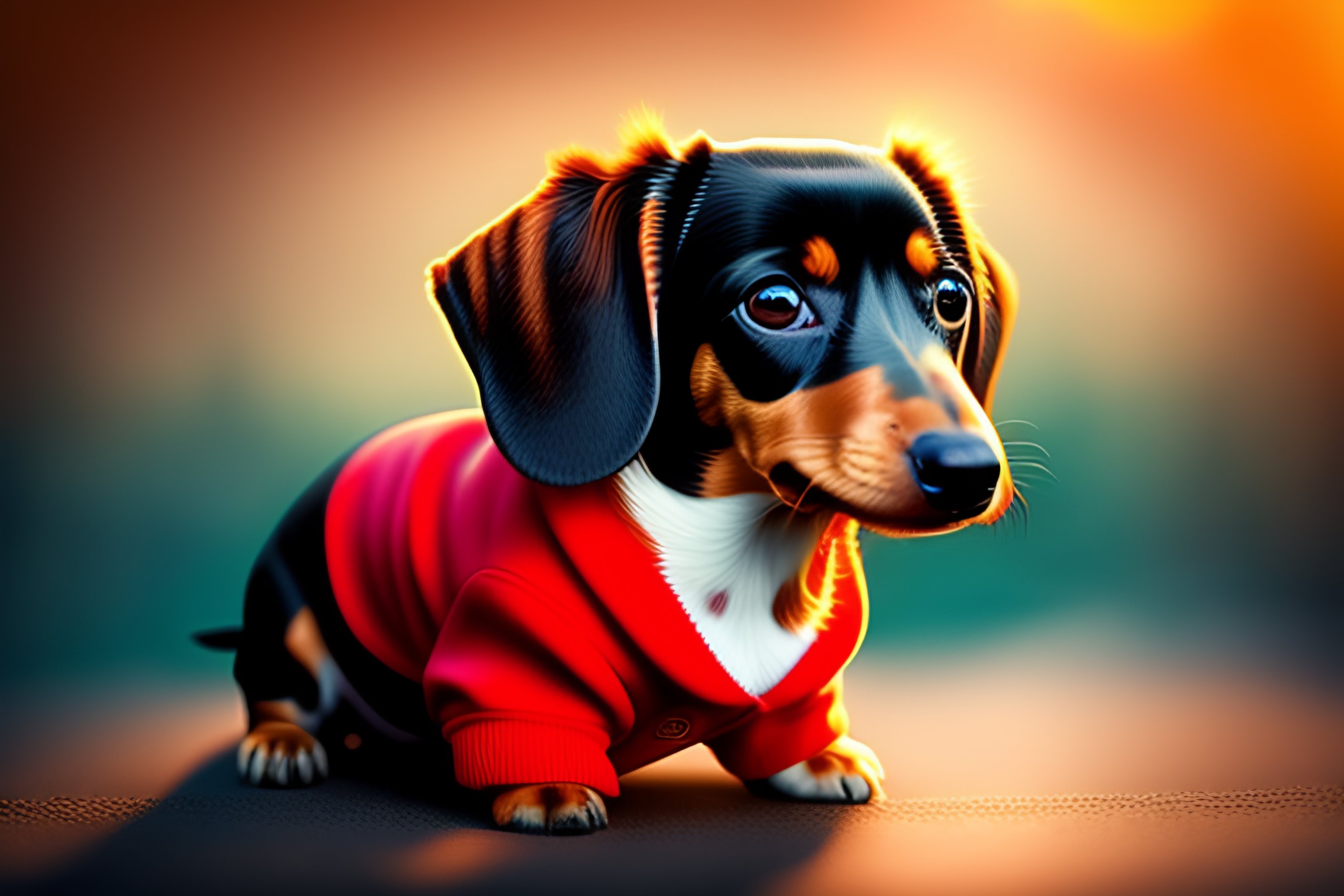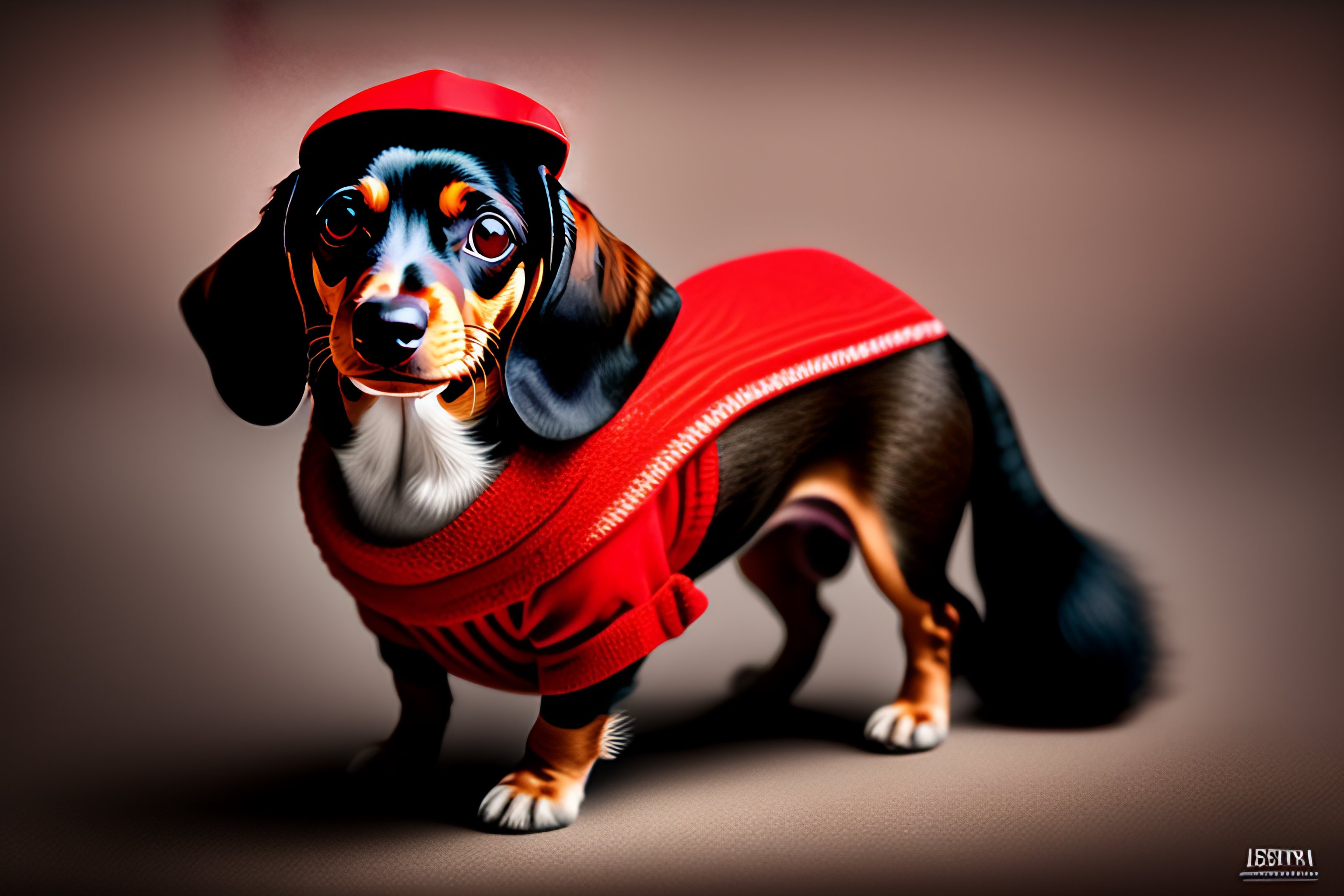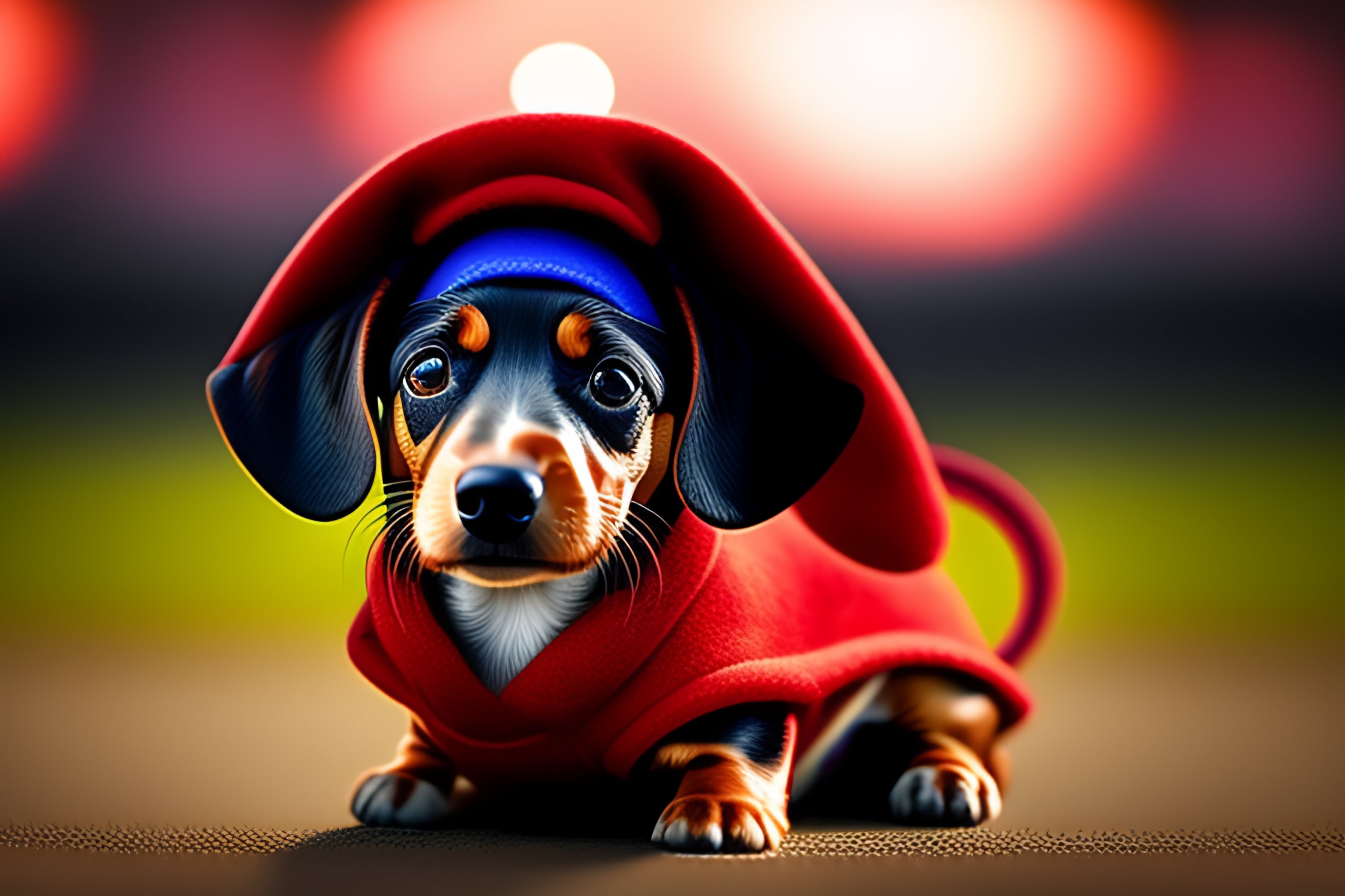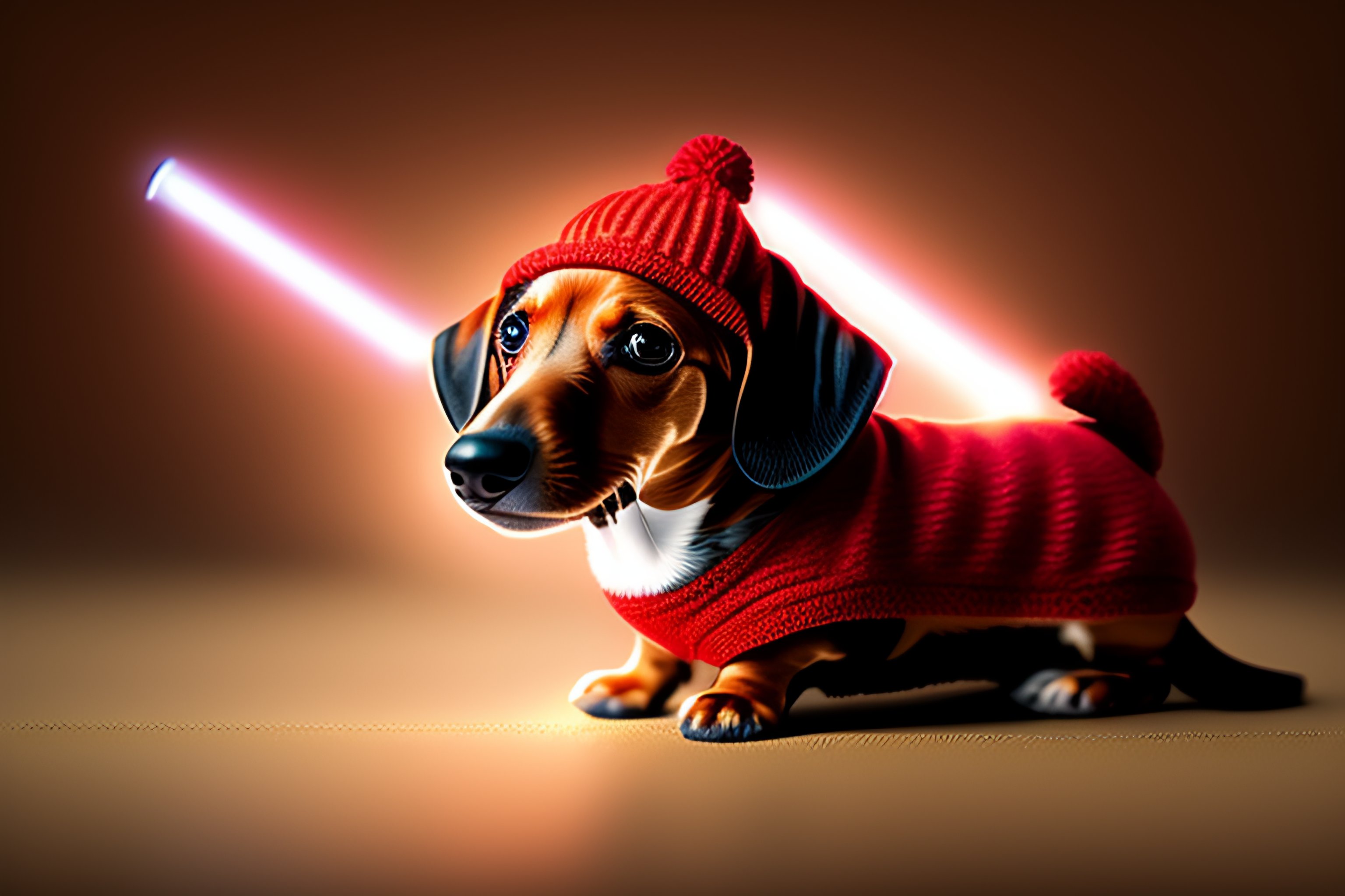 Very small dachshund, wearing star wars jedi knight clothes with cap, light swart red, disney art, 8k