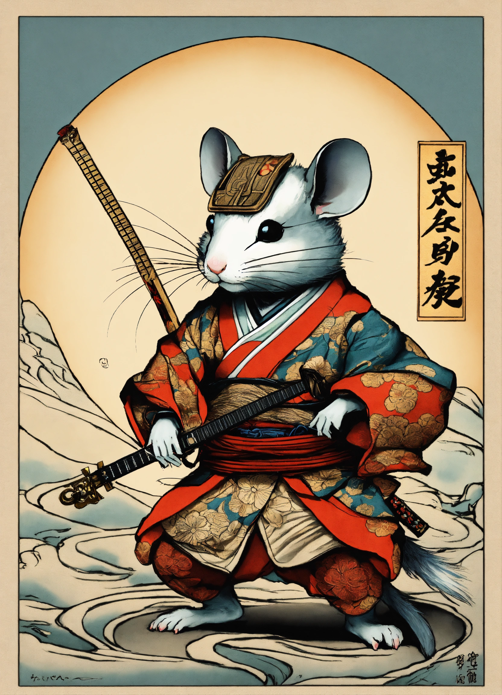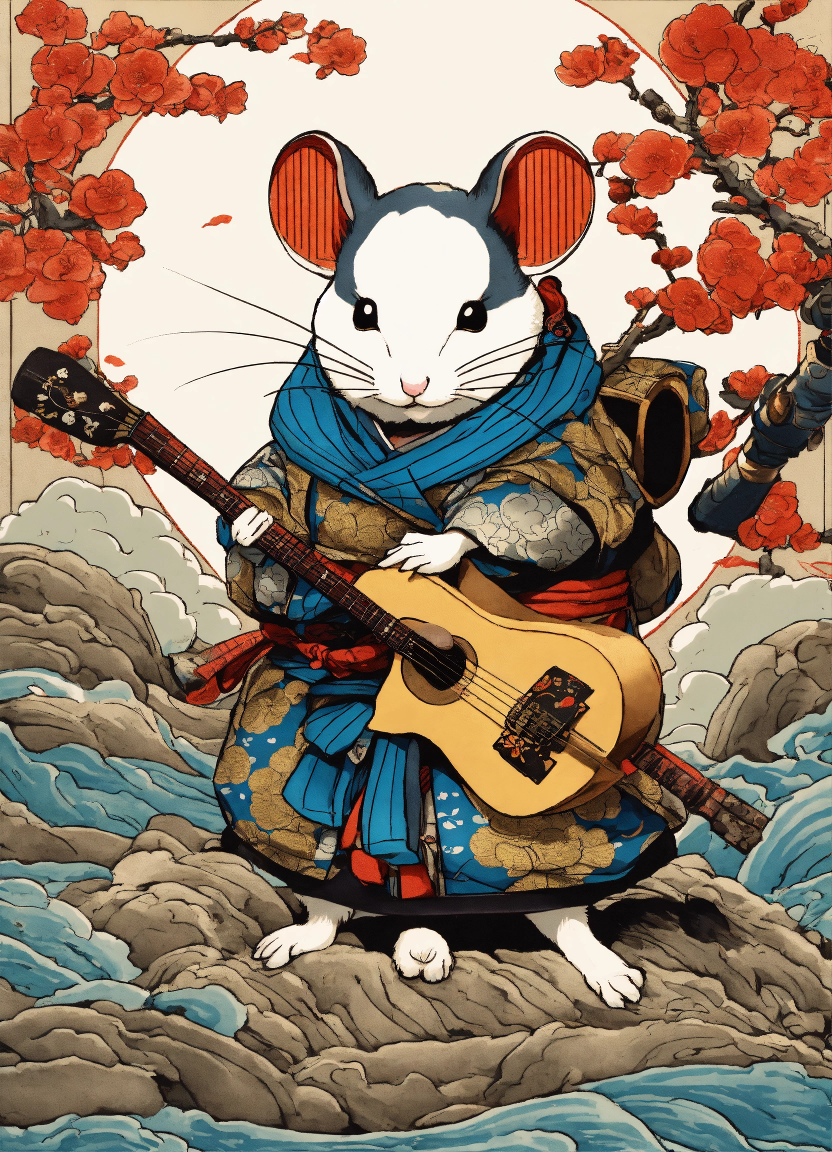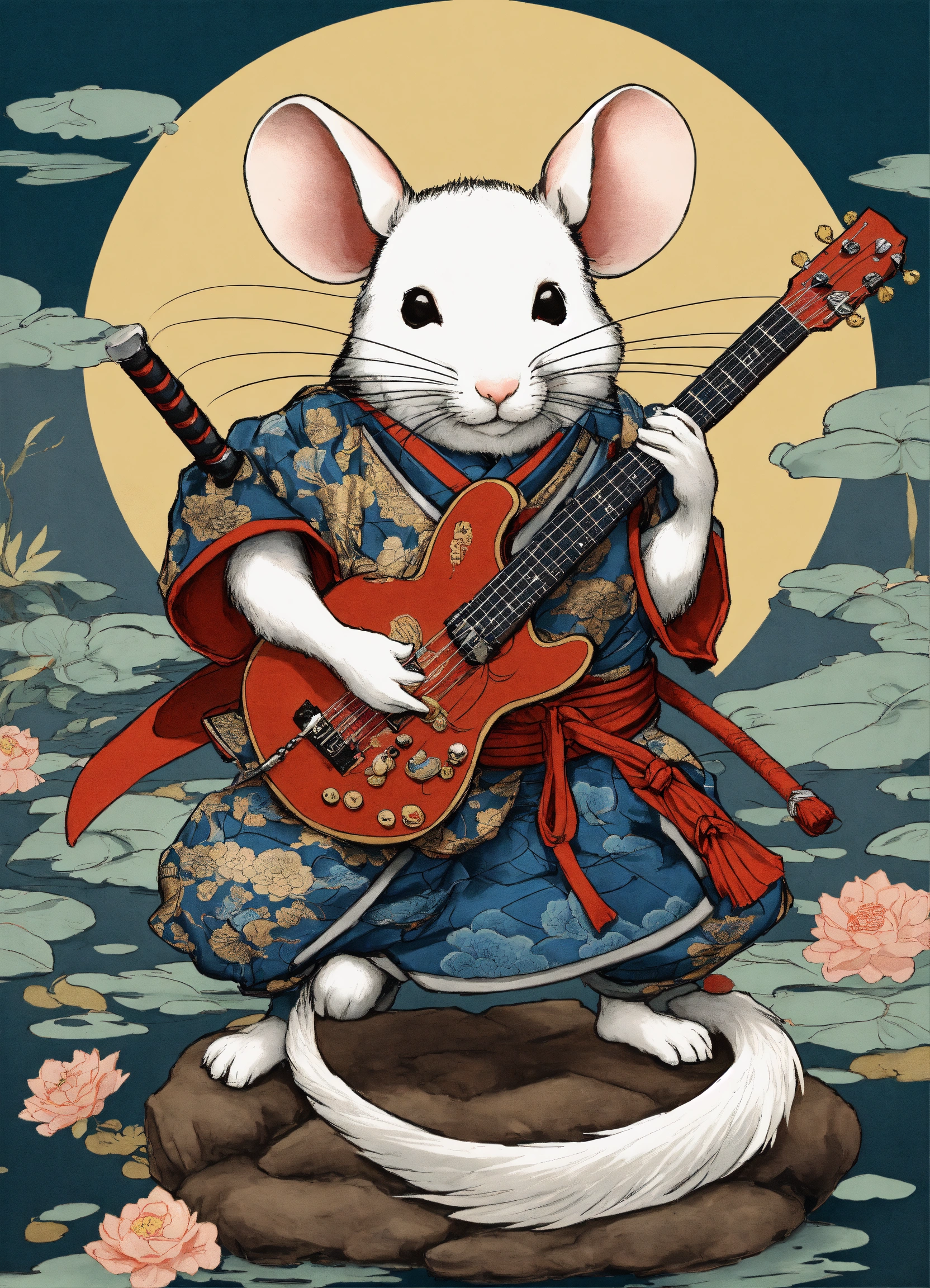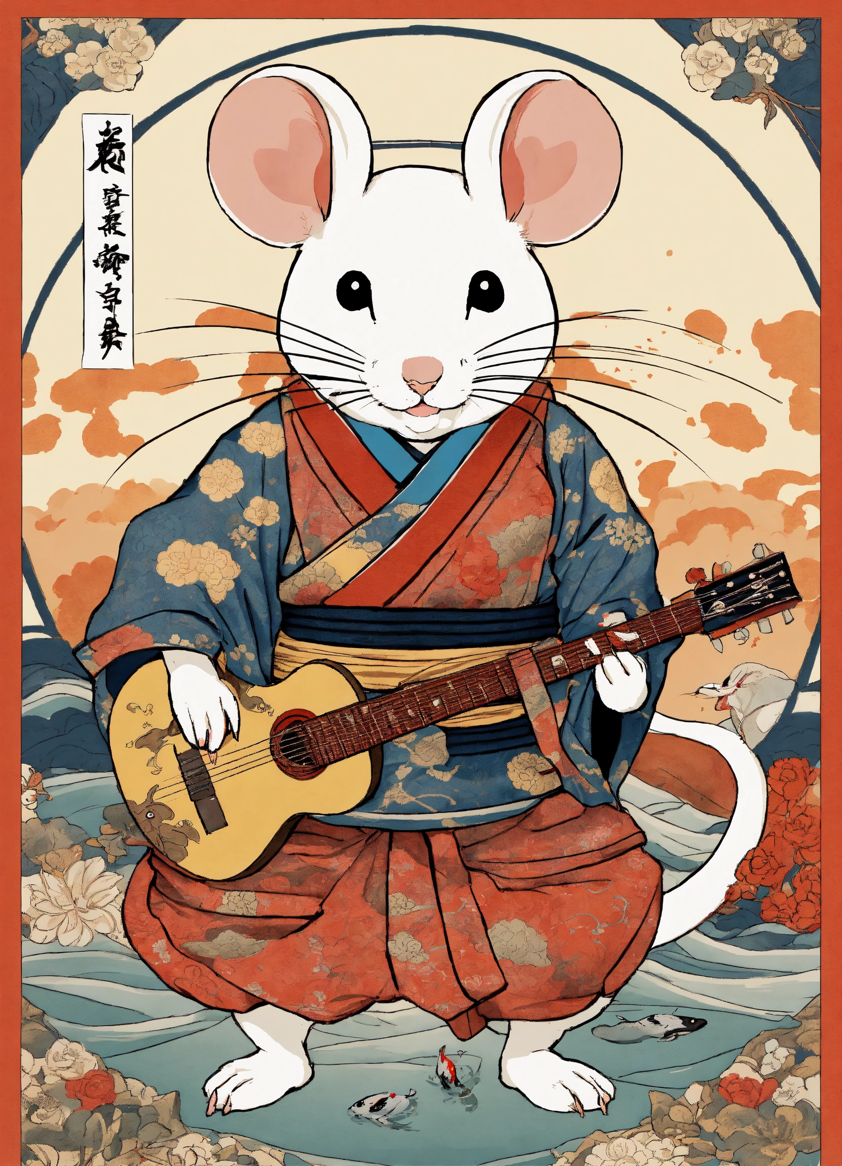 There is a mouse with a guitar on a white background, samurai mouse, mouse warrior, armored mouse, anthropomorphic mouse ninja, samurai deity with koi armor, by kanō tan'yū, highly detailed and colored, in the art style of ukiyo - e, inspired by utagawa kuniyoshi