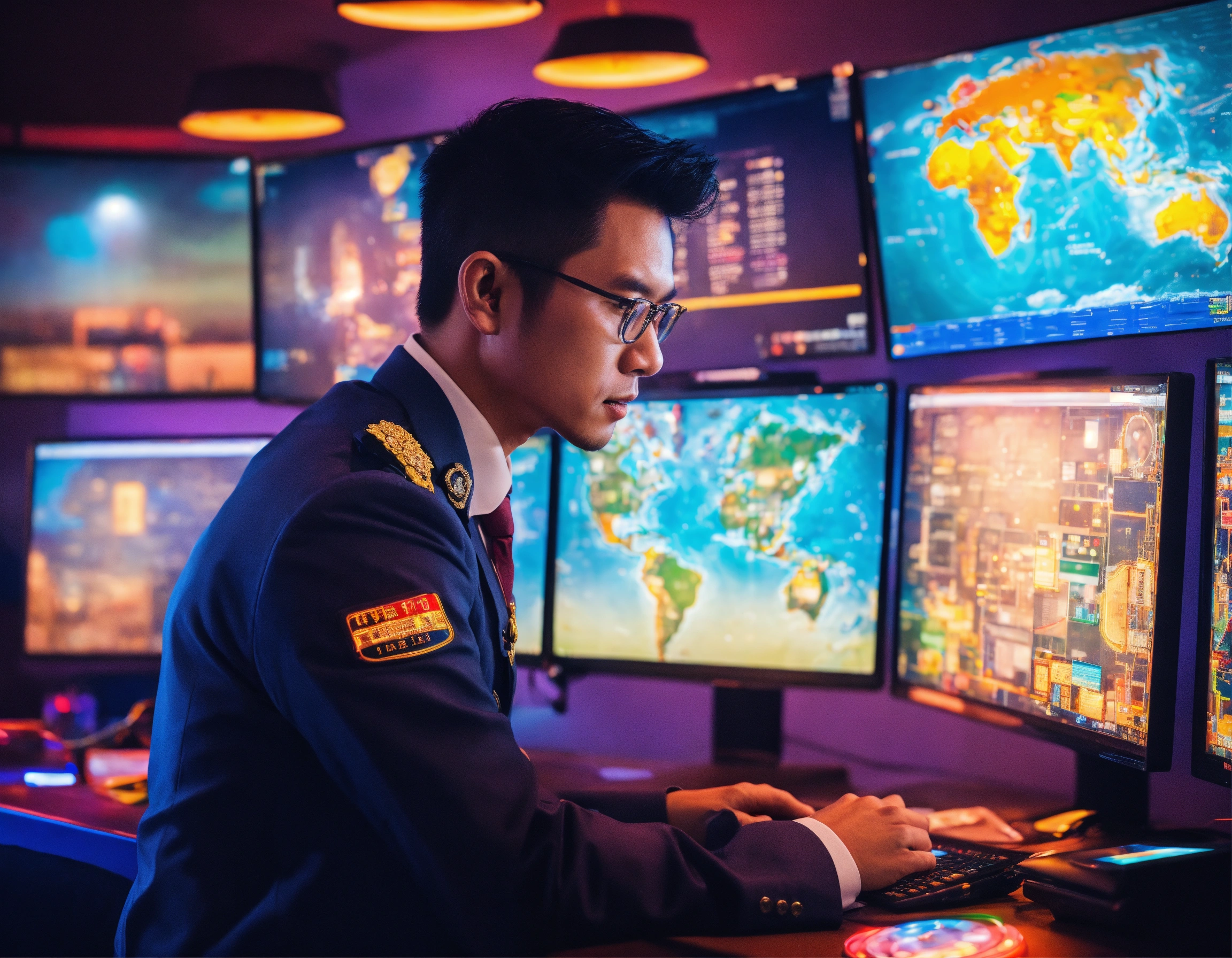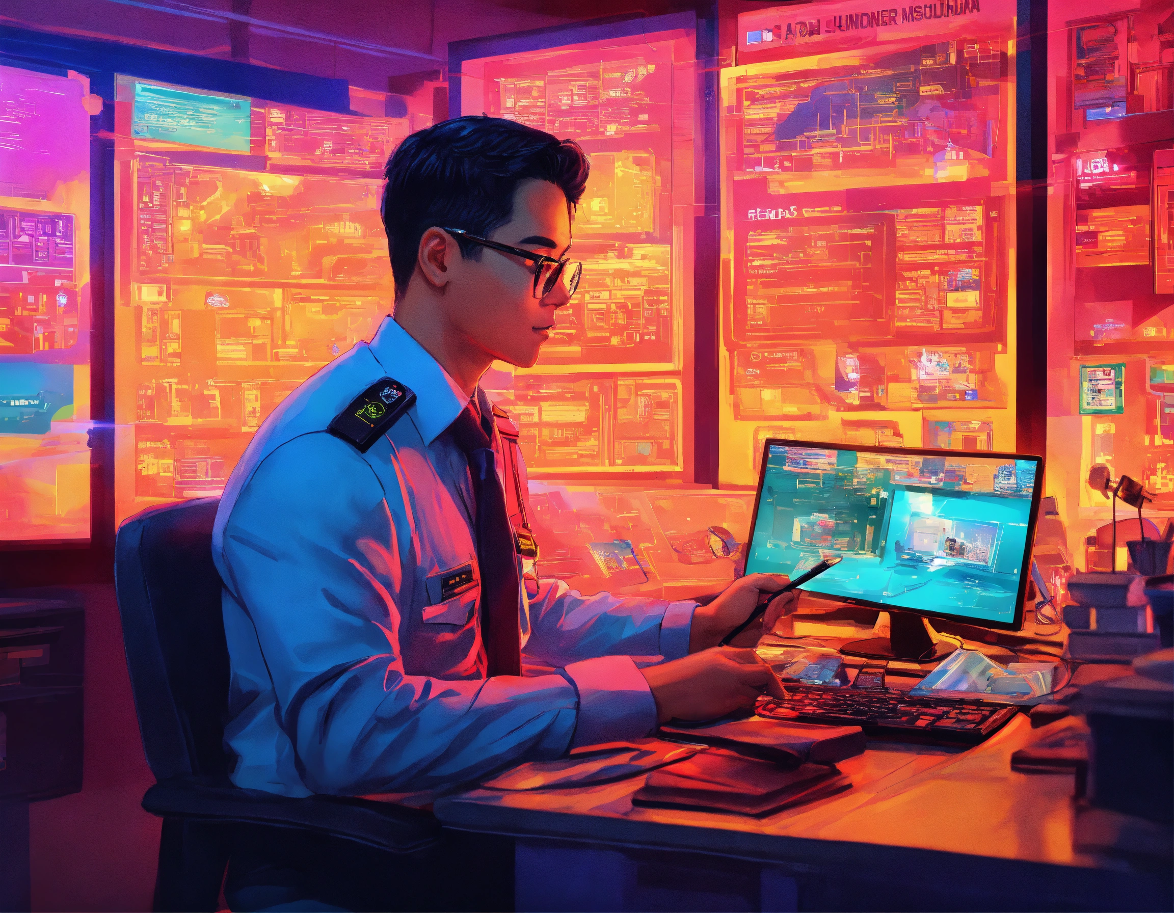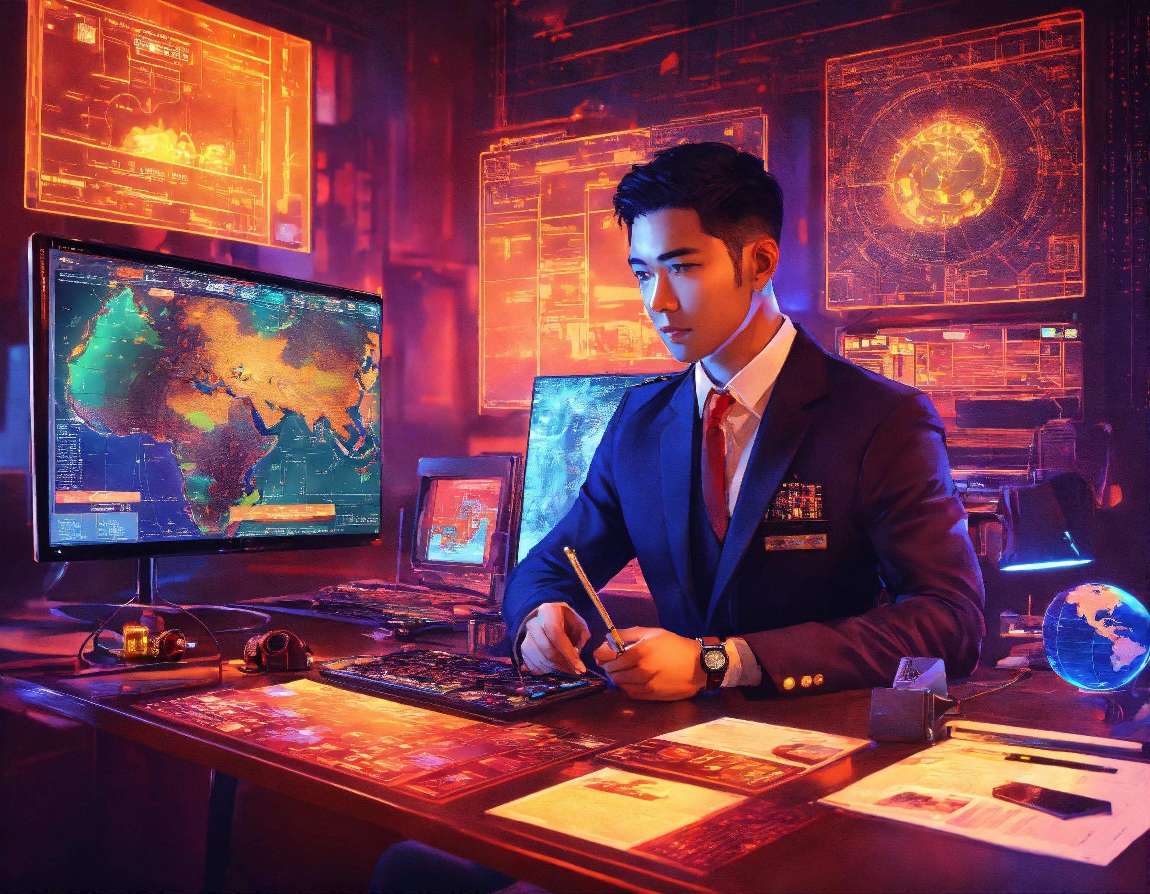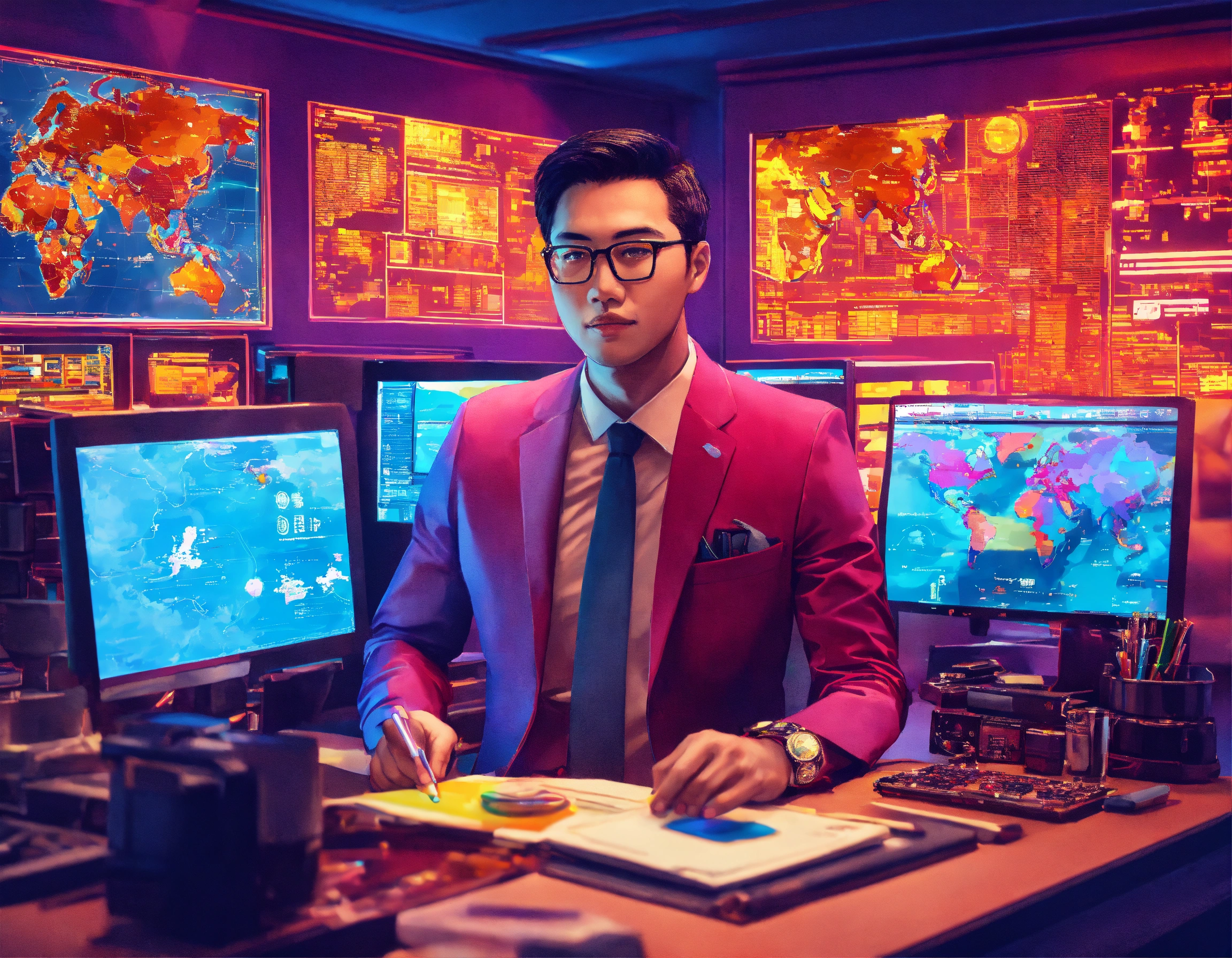 A handsome indonesian insurance officer, holding insurance services with policy, in front of computer, working, offering insurance policy, characters of people holding insurance icons, there are ship, building, oil and gas, cargo, car, plane, school, map, under the officer, by nam june paik, color grading, futuristic, realistic, cyber punk color, modern art, digital art, technicolor, electric color, neon