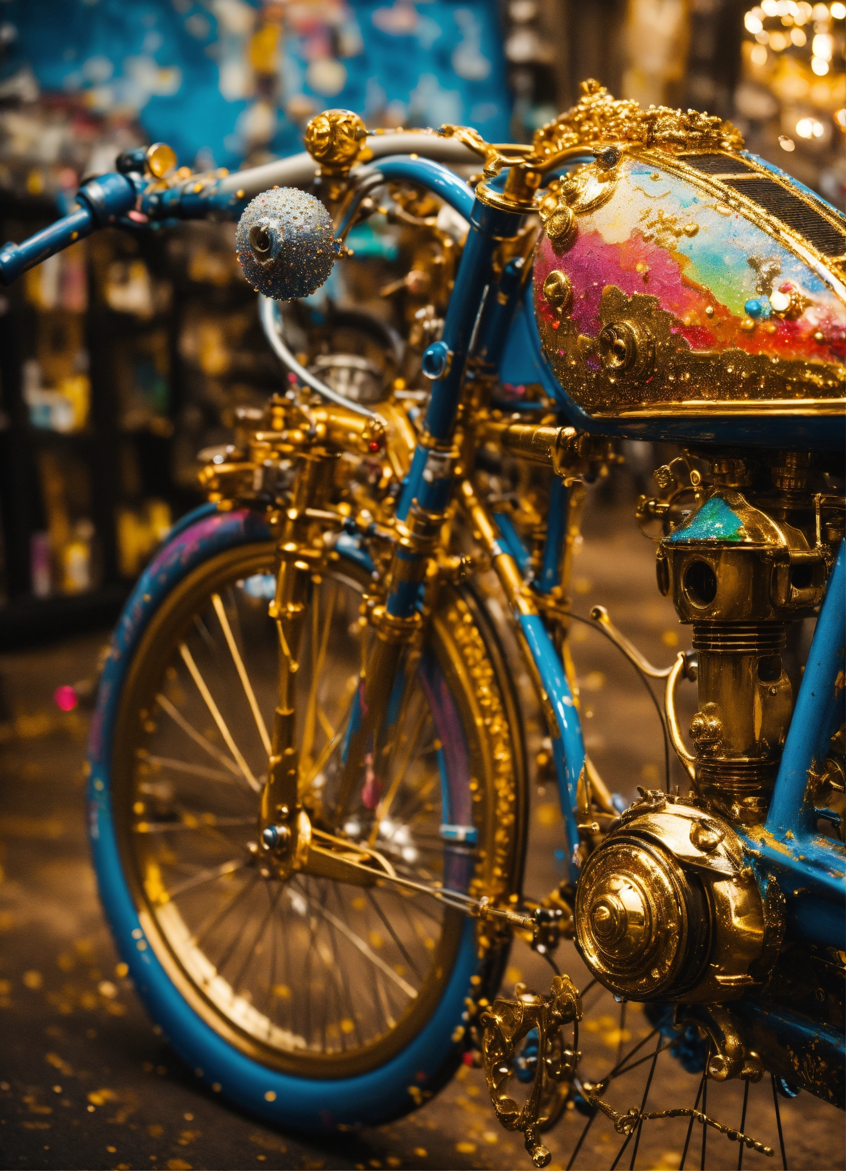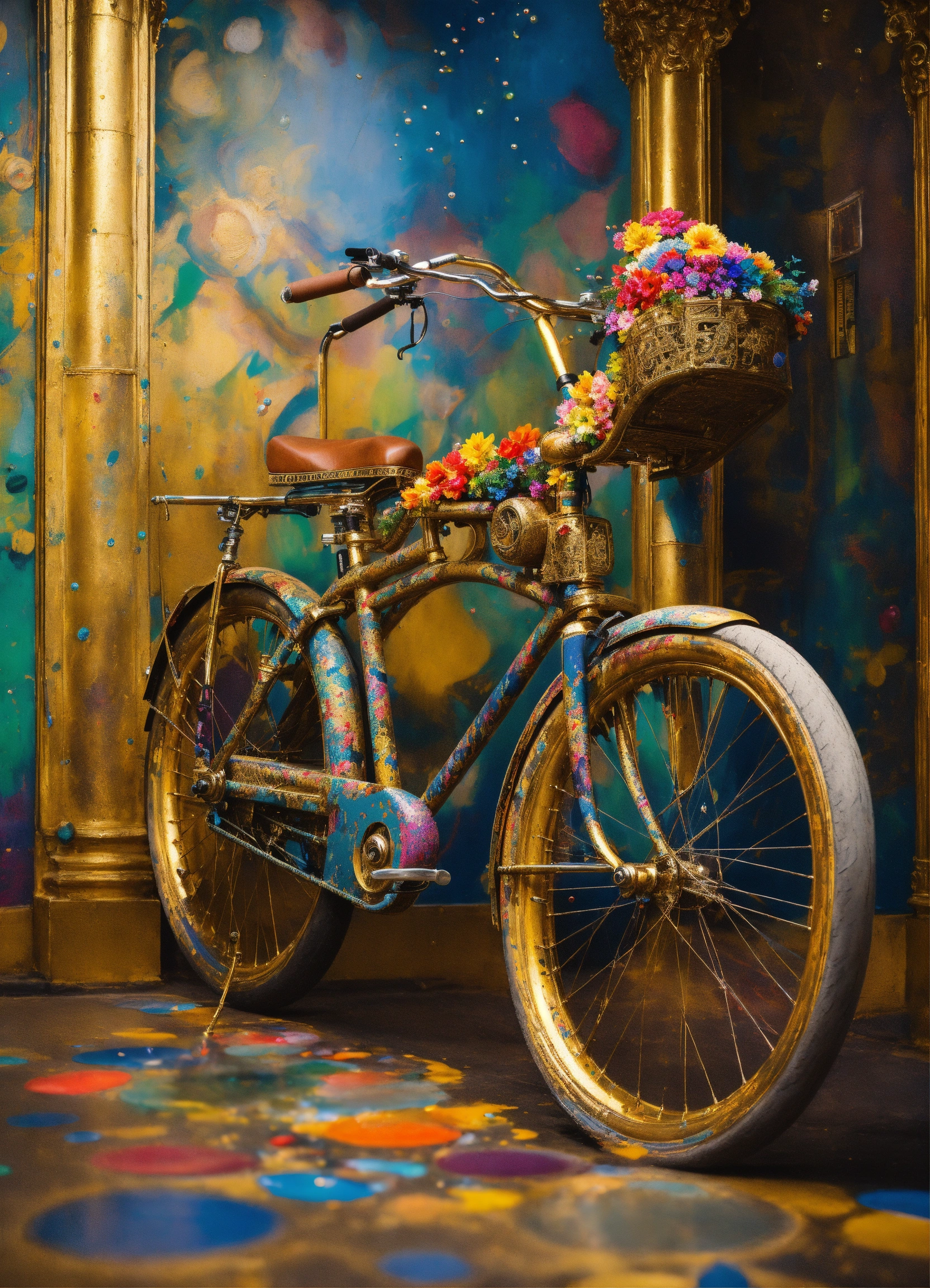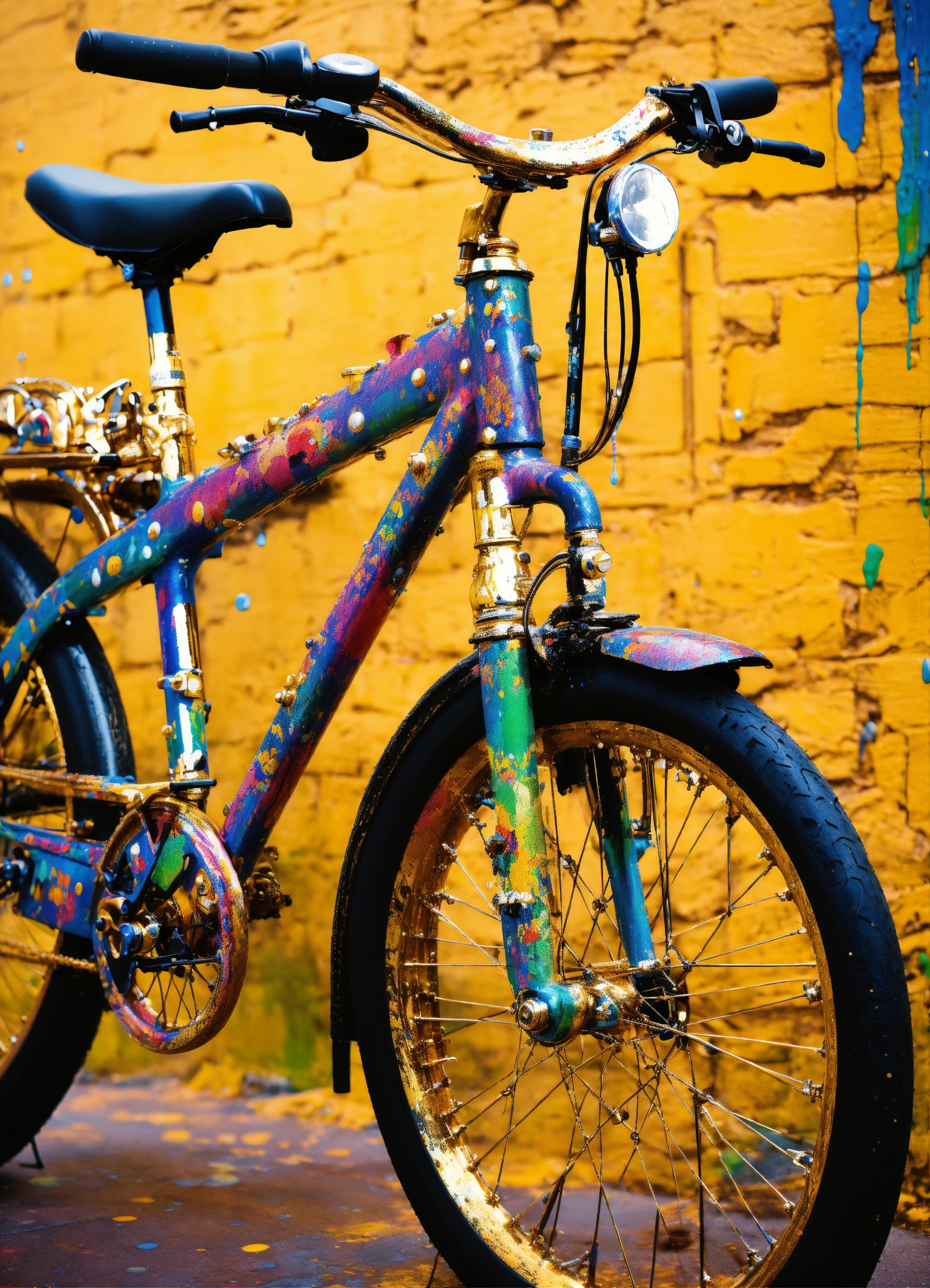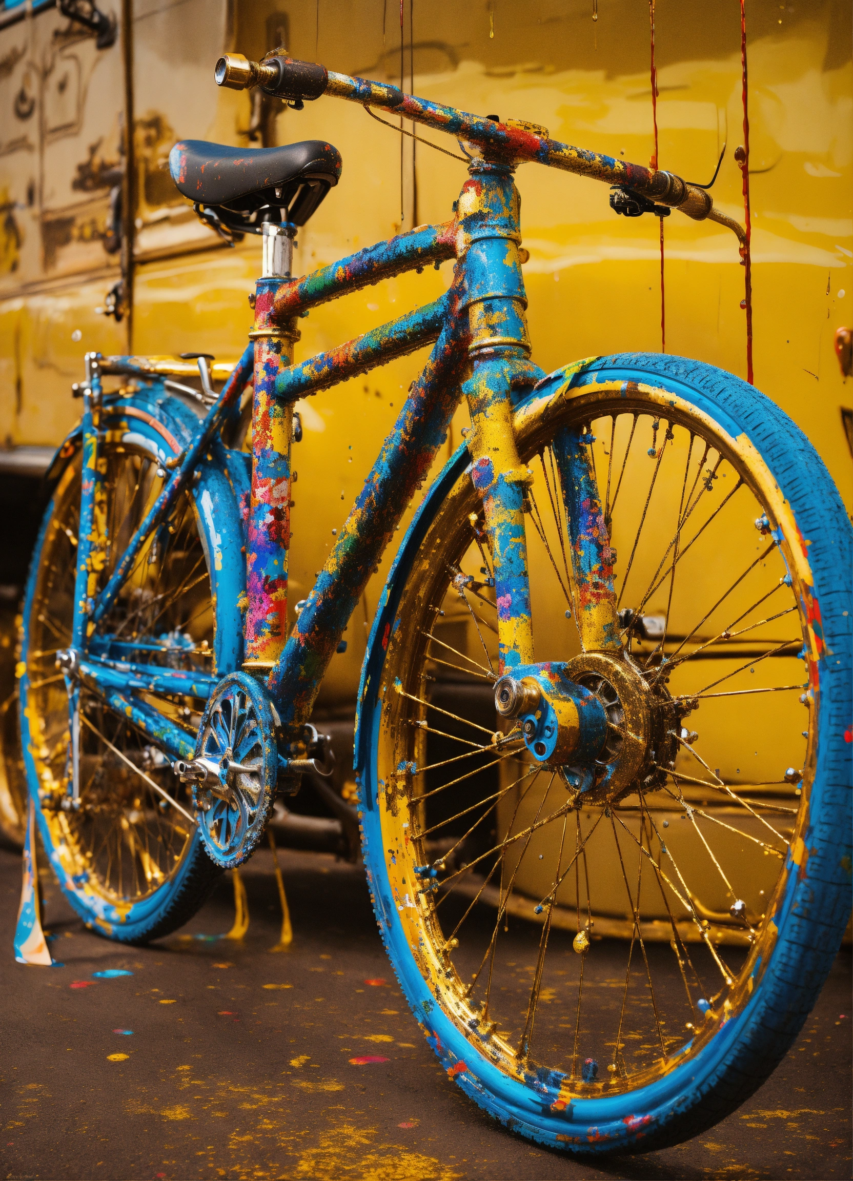 A stunning interpretation of old bike, made of paint drops, advertsiement, solarpunk, highly detailed and intricate, golden ratio, very colorful, hypermaximalist, ornate, luxury, paint splasts