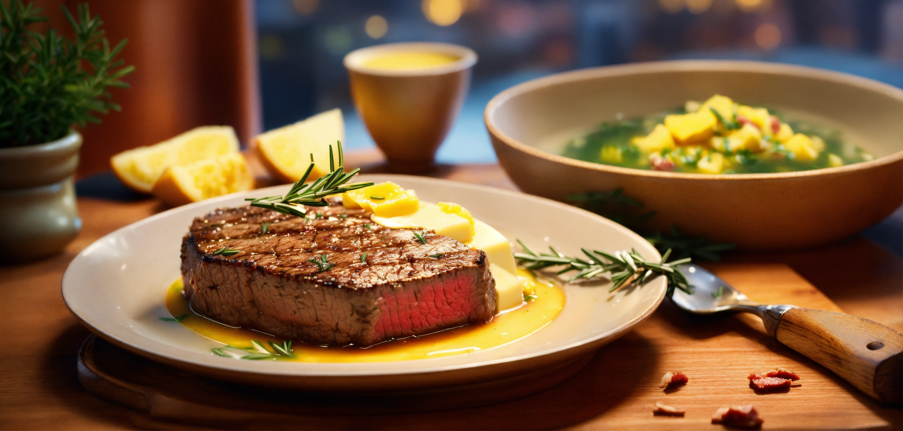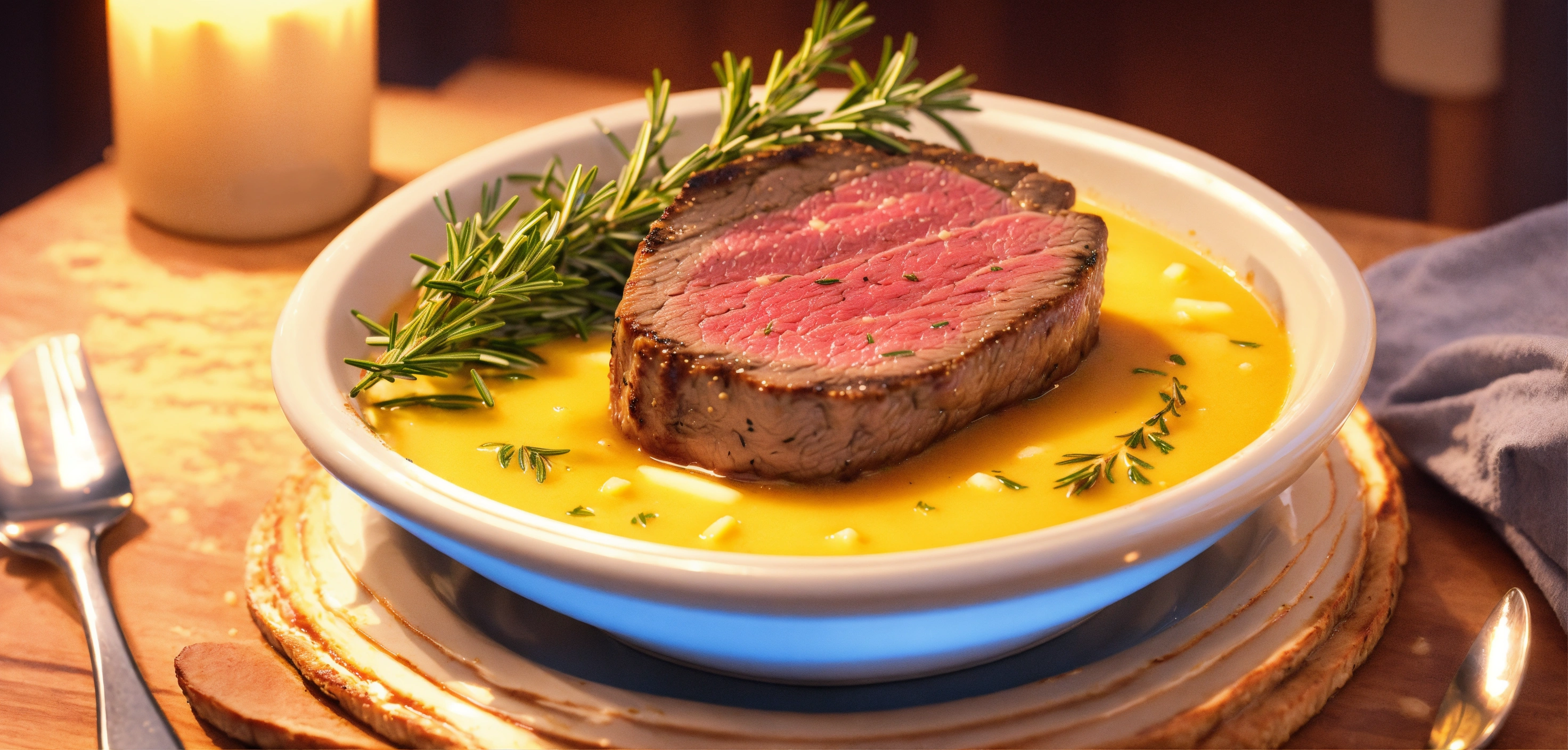 Stock photo of high quality juicy medium rare steak with butter and rosemary on top of the soup, on a warm cozy kitchen counter, in the art style of hayao miyazaki-like, quaint ambient lighting highly detailed, high resolution, scene from disney or pixar movie high resolution 3d ai detailsimilar to product from midjourney ai