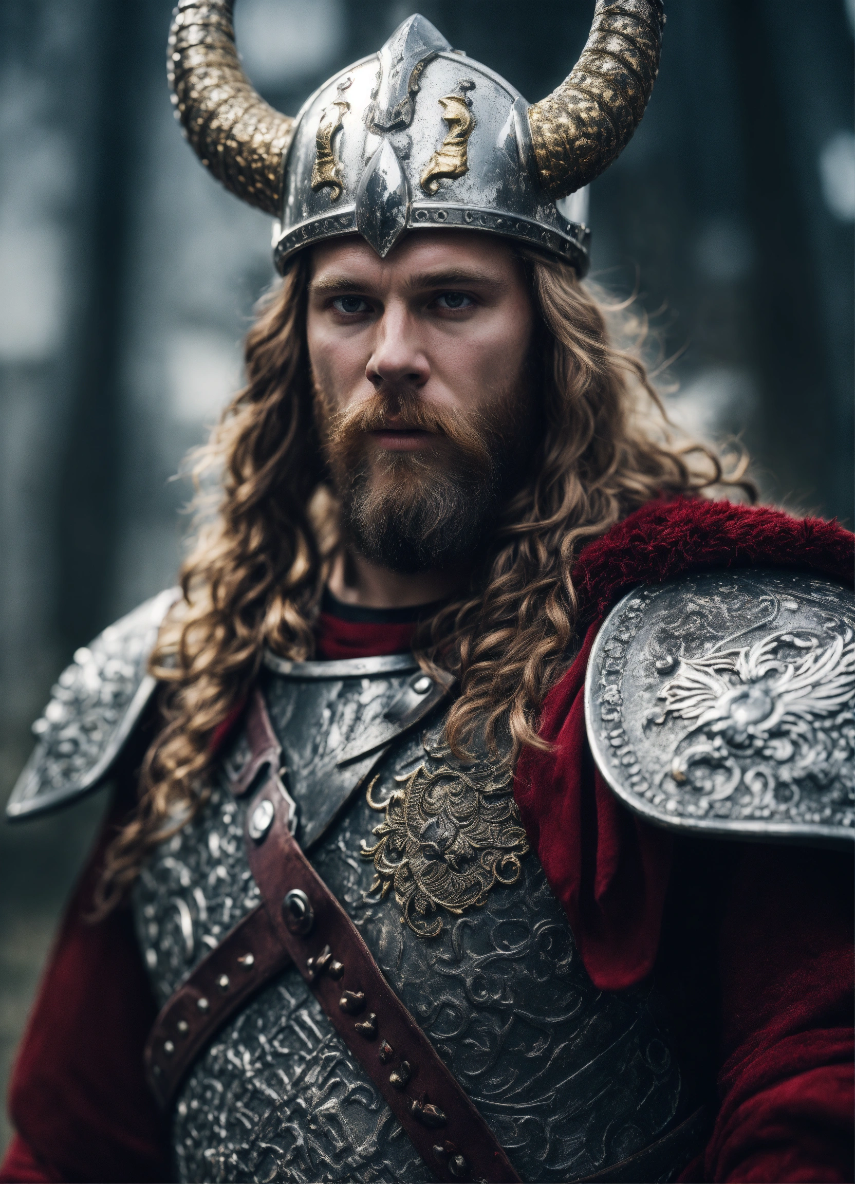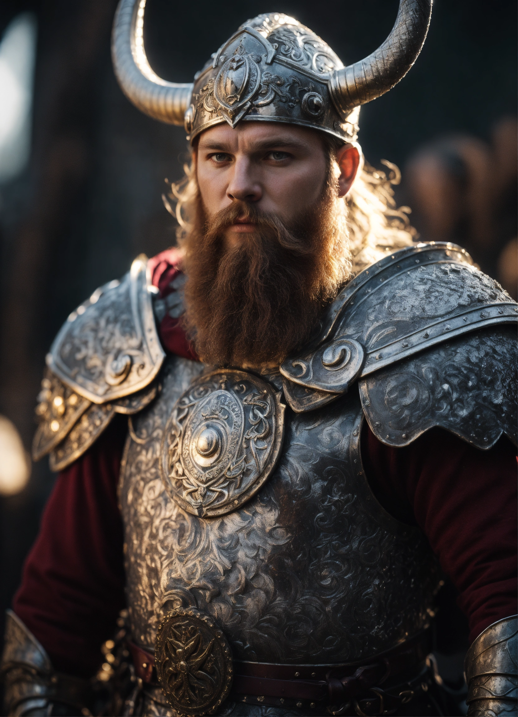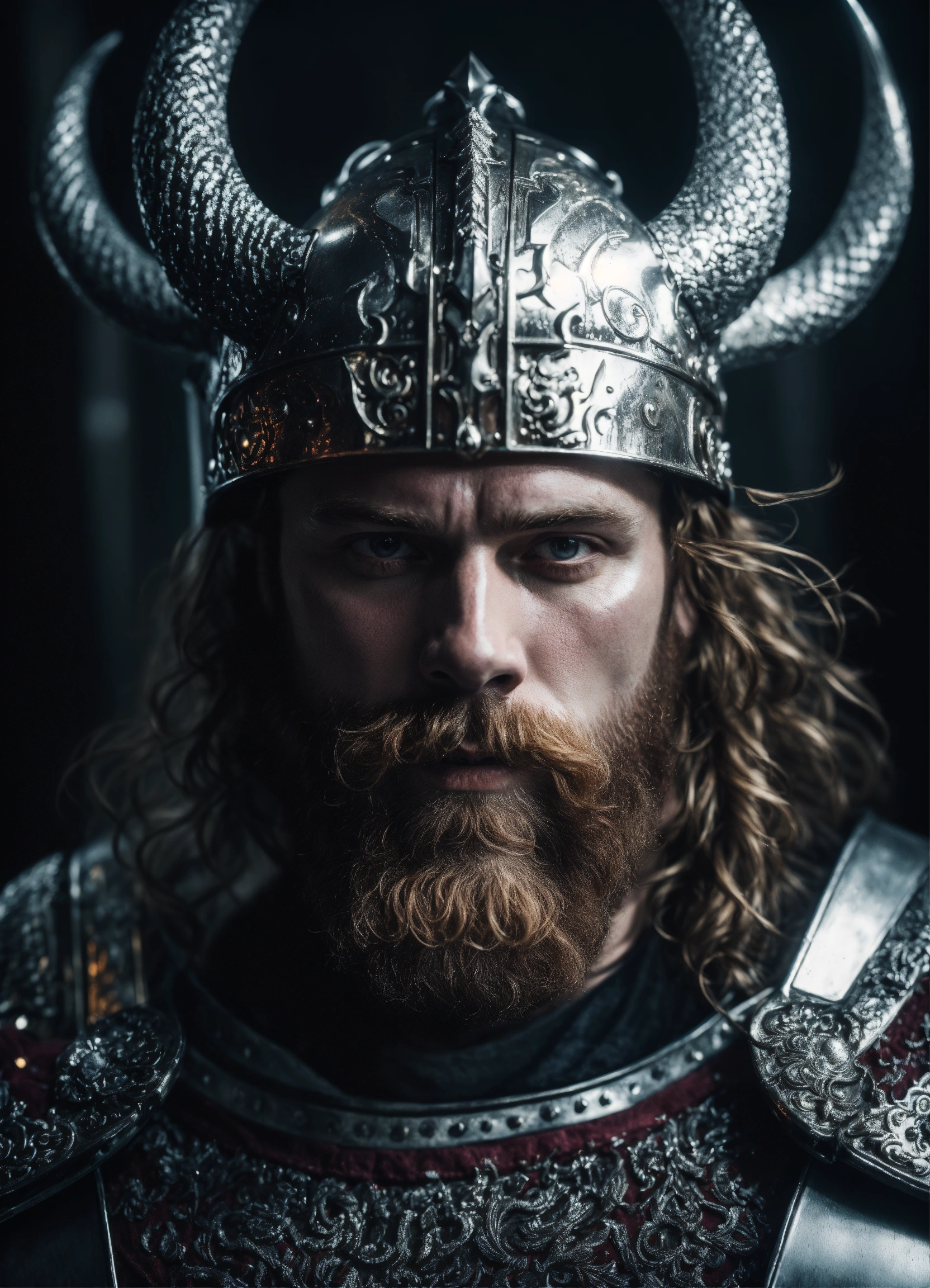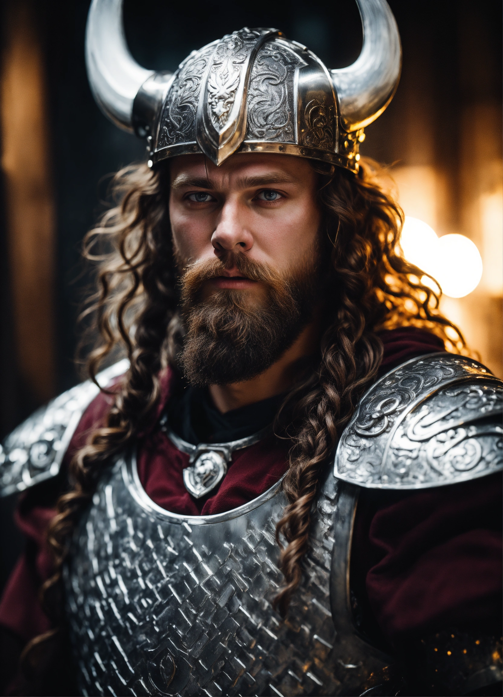 Portrait of white male viking king with beard, warrior goddess dark skin, curly hair, horns, clothes highly detailed armour, facets reflecting the white light splendour, 4k, maroon and gray, fjord, selfie, ominous, high quality model