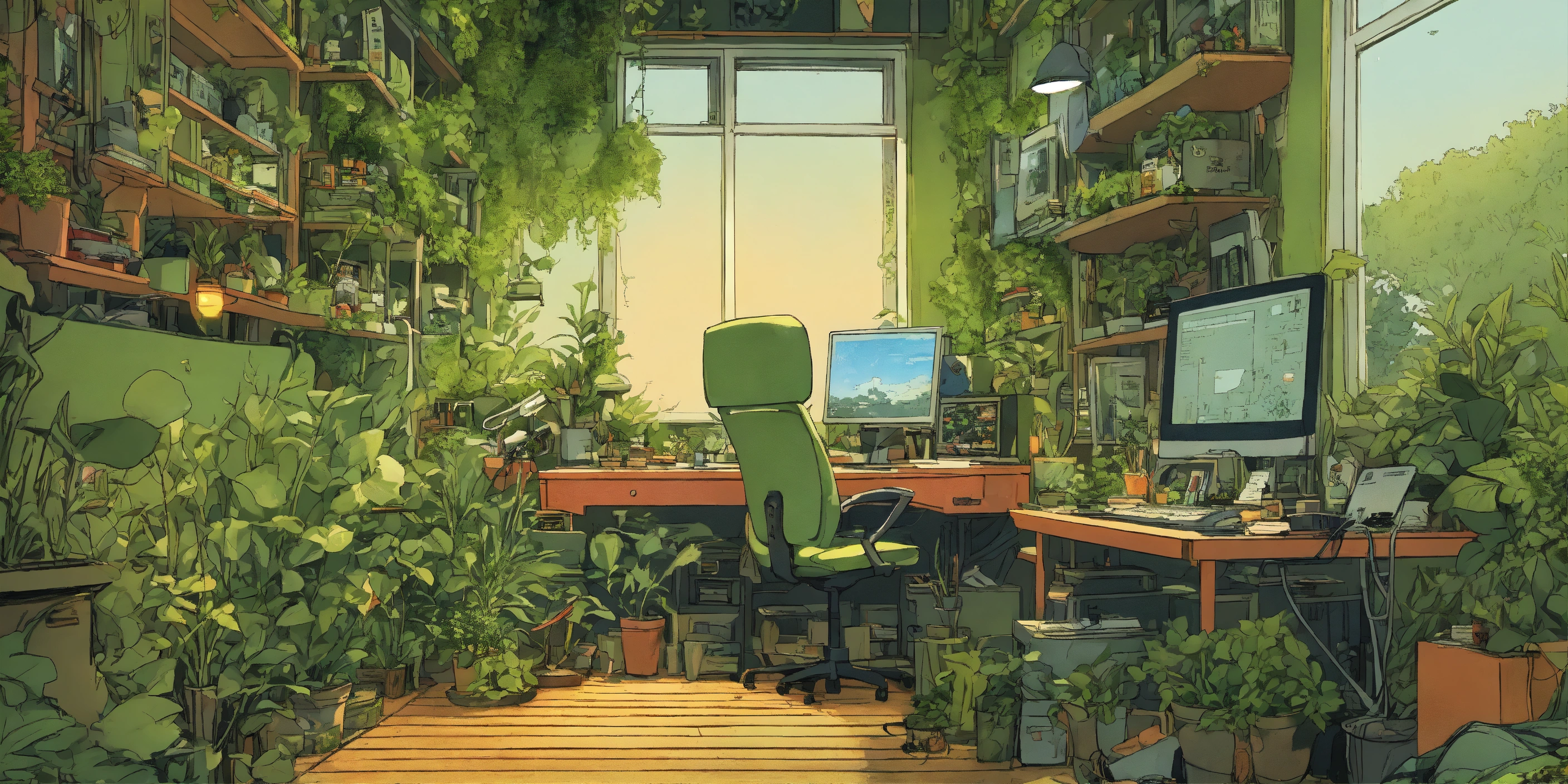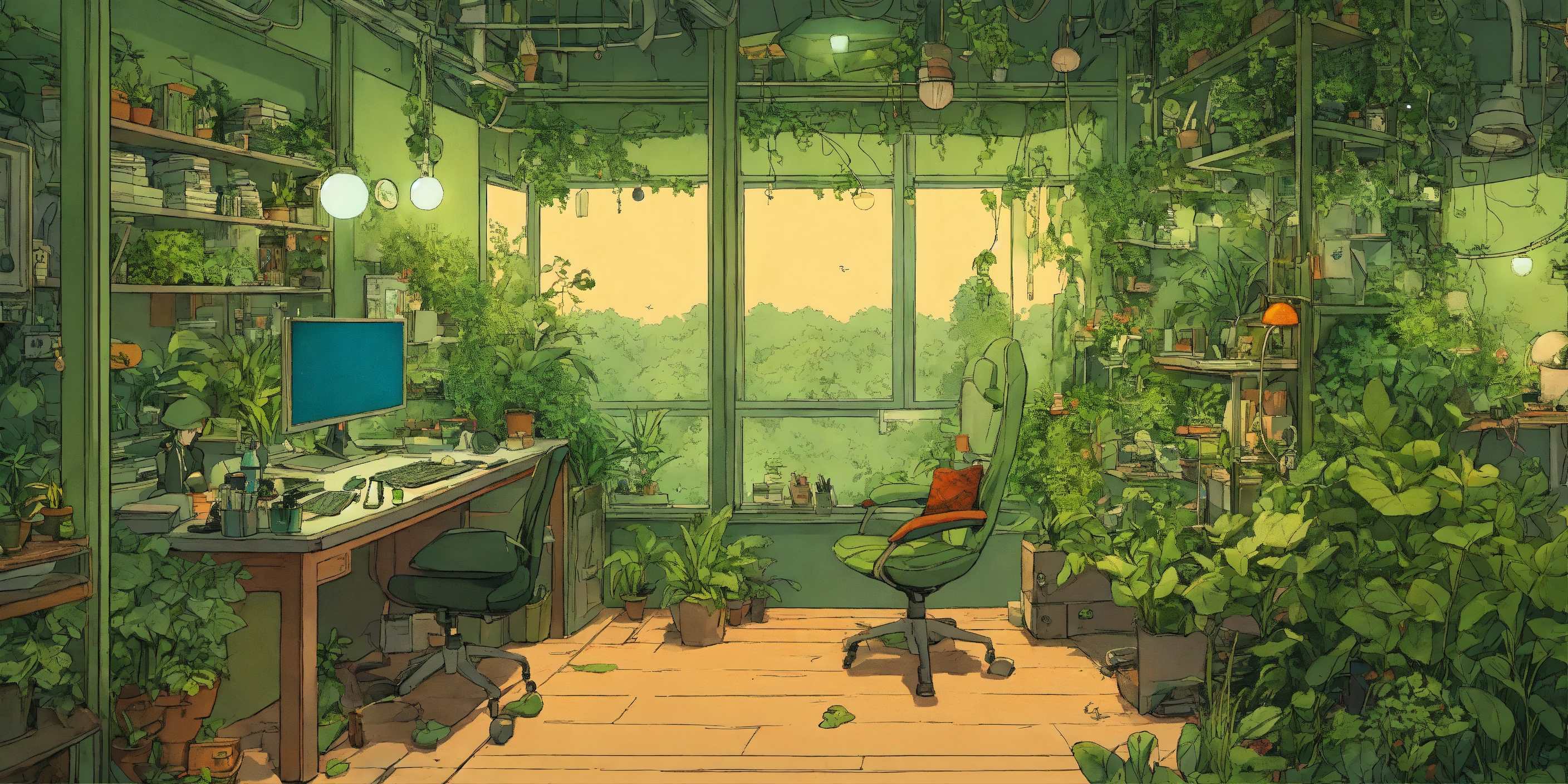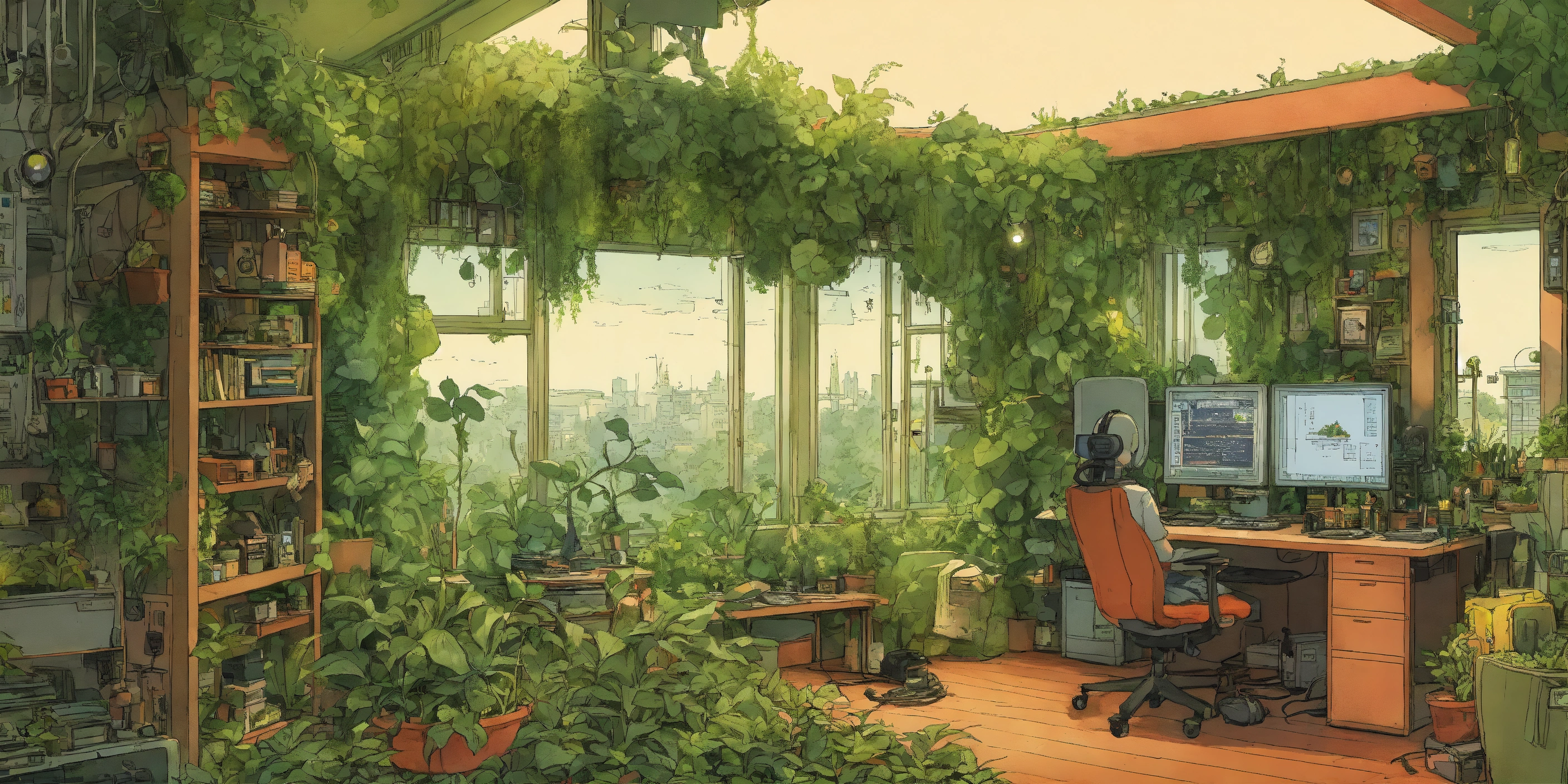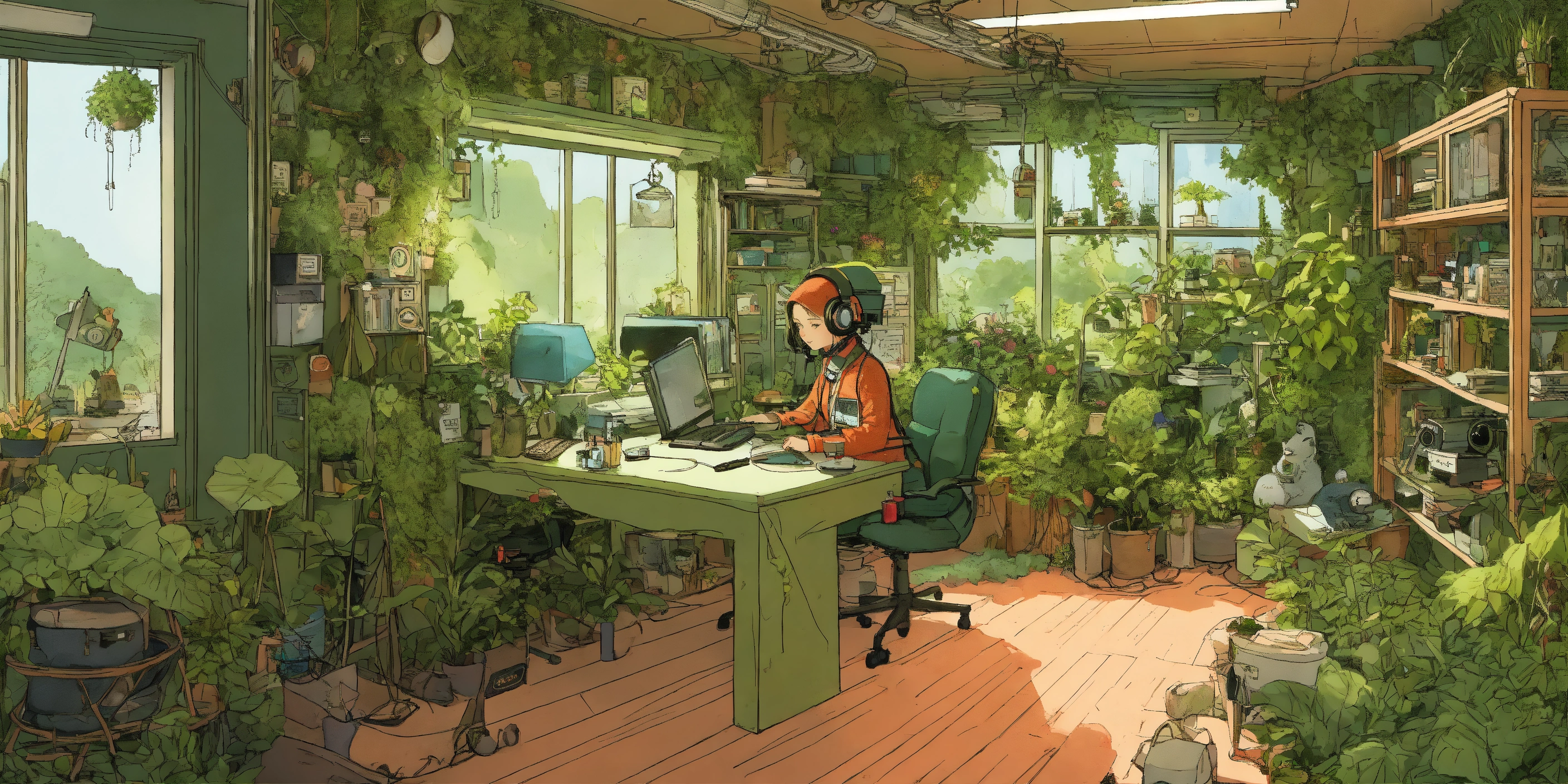 Futurepunk style employee working from home office covered in greenery. the atmosphere is filled with a sci-fi ambiance, with rich and vivid pigments creating an otherworldly feeling. by mattias adolfsson.