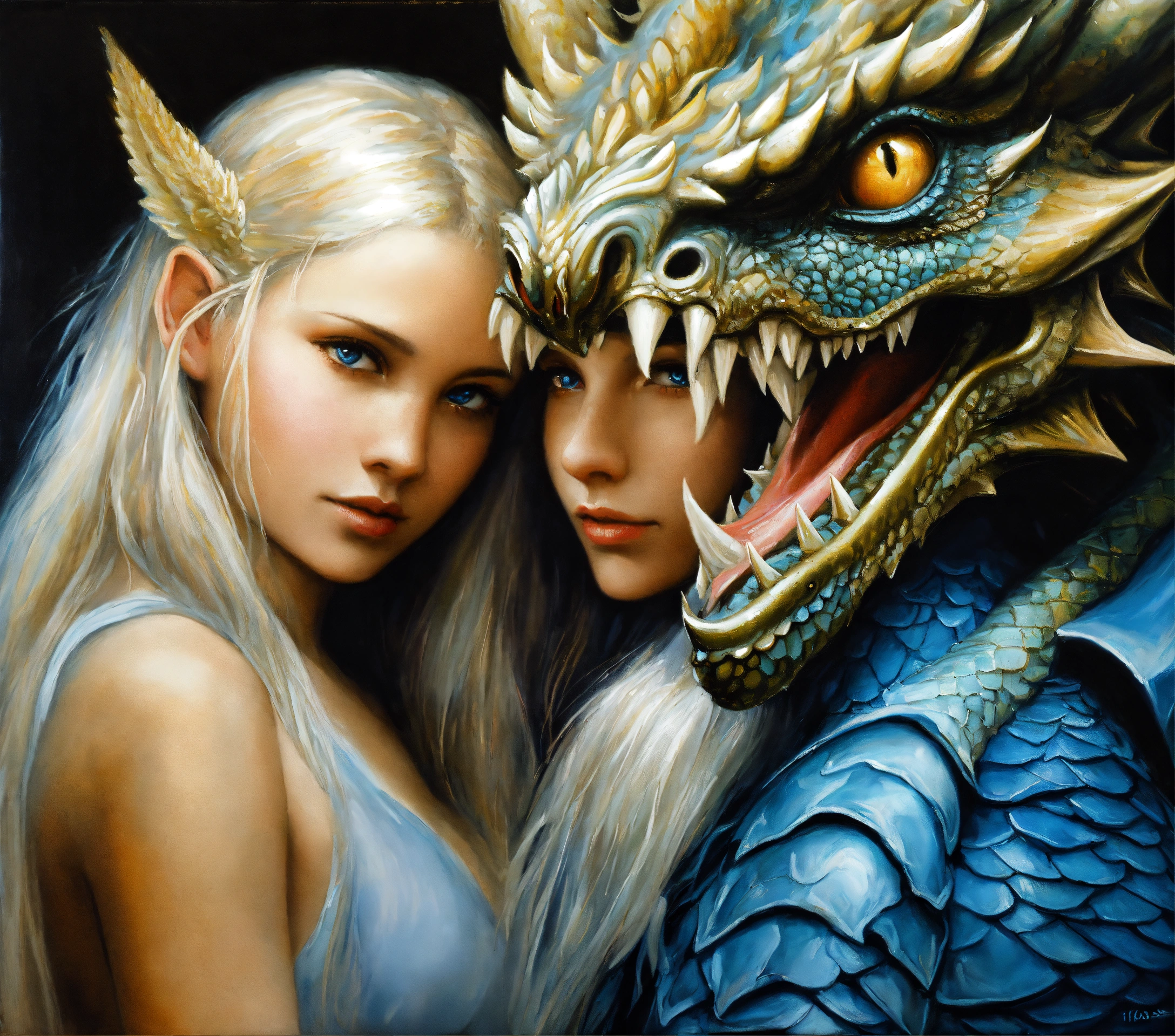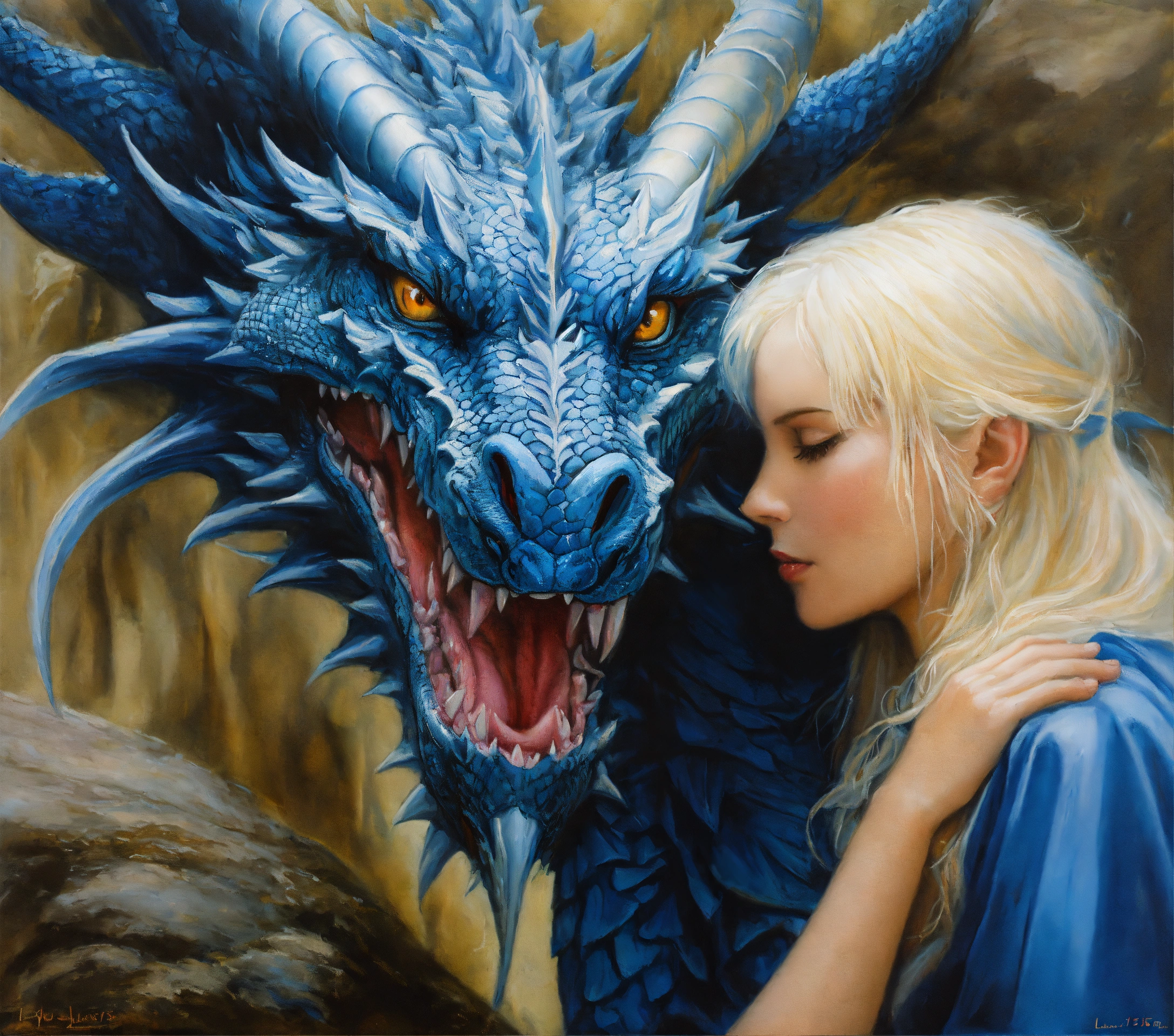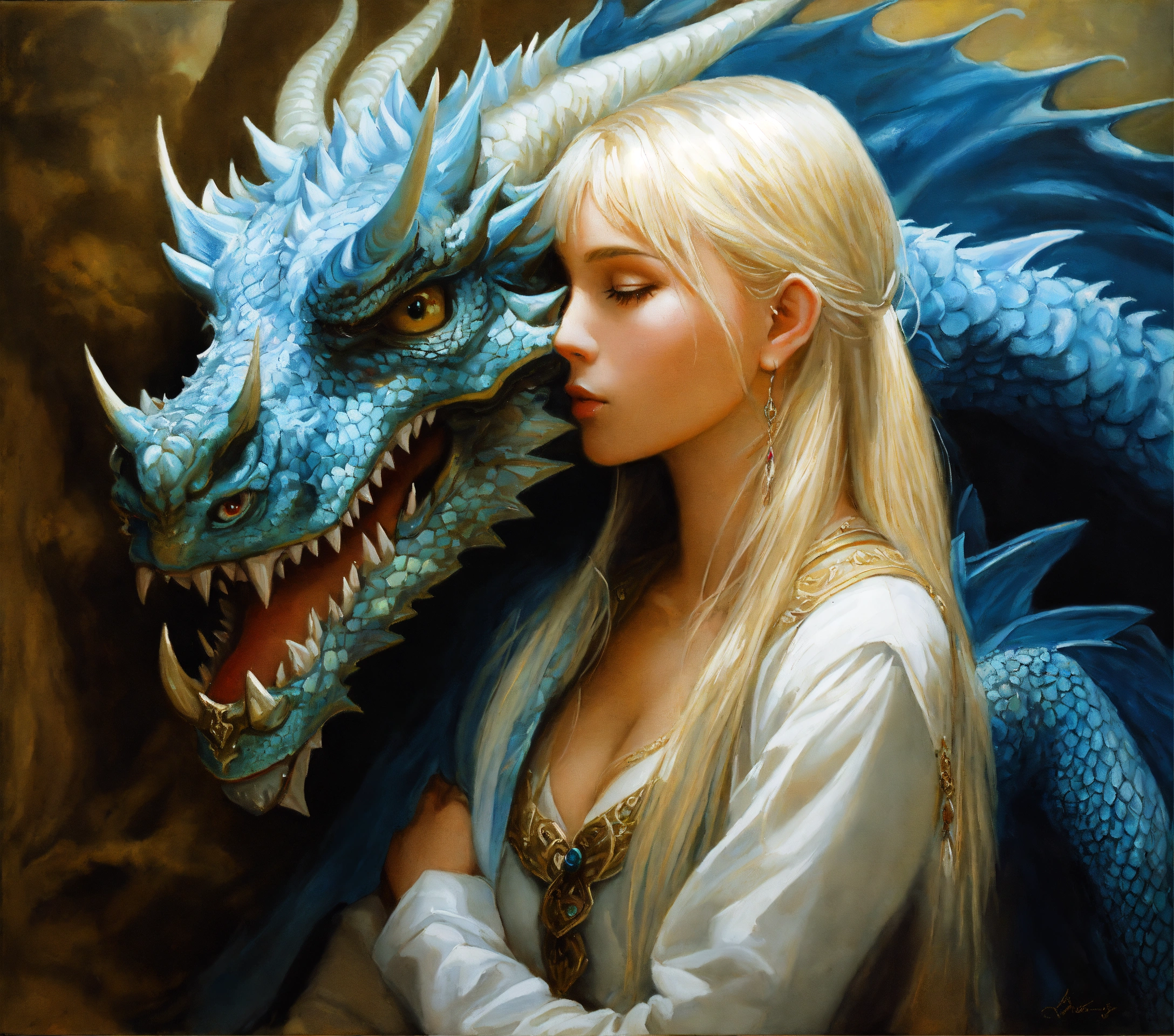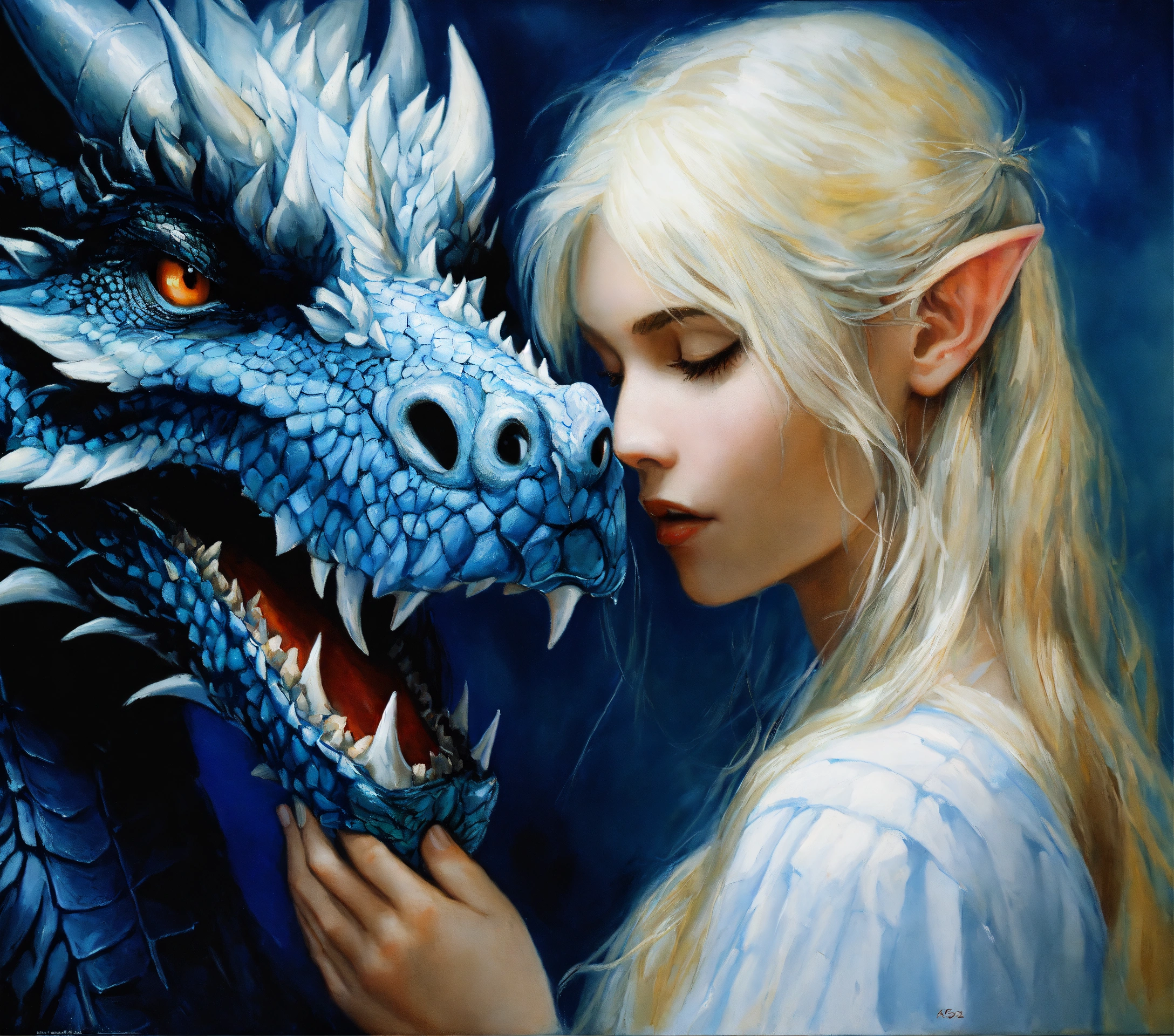 Oil painting of a huge, magnificent two meter big blue dragon head with a 15 year old white blonde elf girl lovingly hugging the dragon head, the dragon's head is as big as the entire girl, ultra detailled, ultra realistic, in the style of luis royo