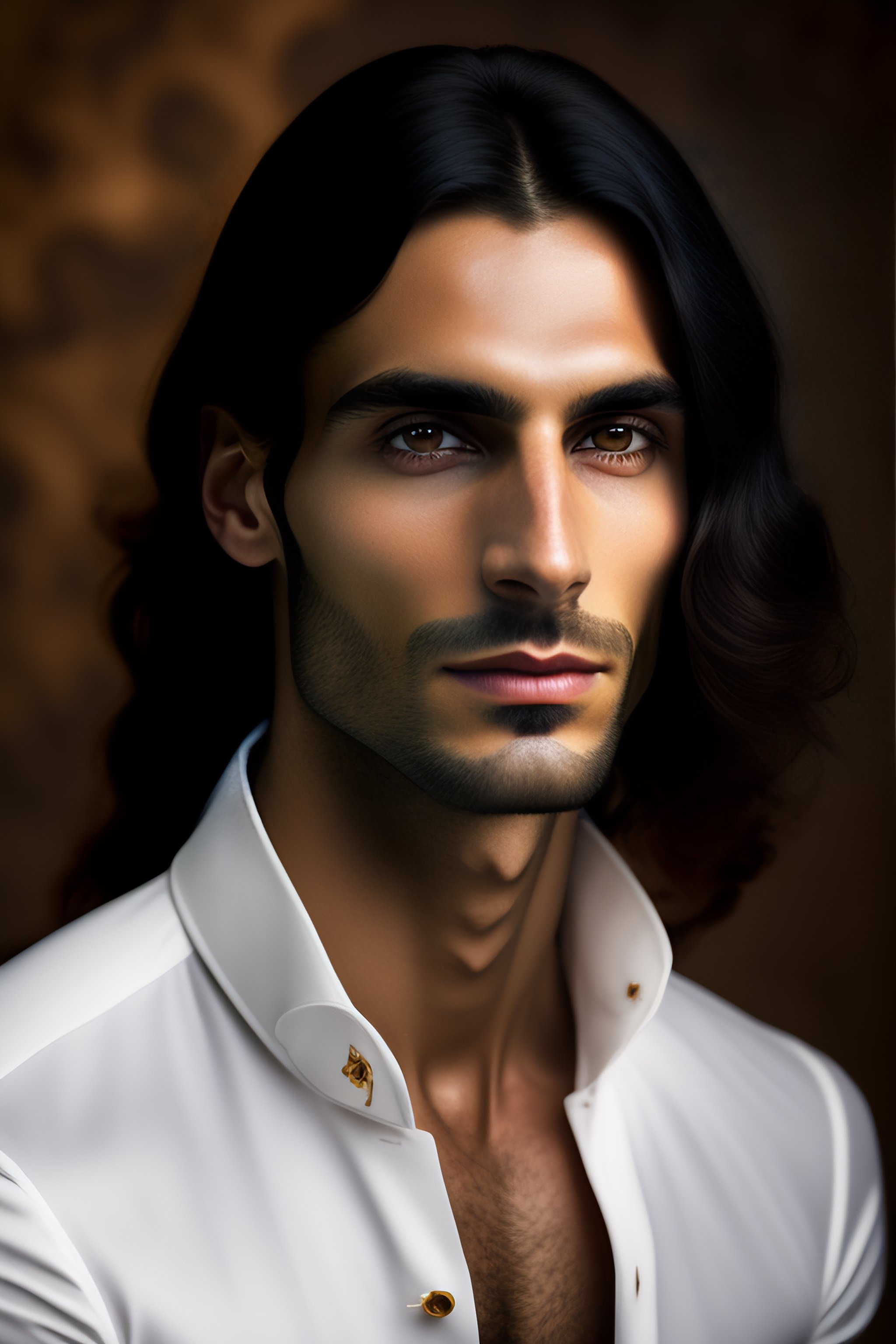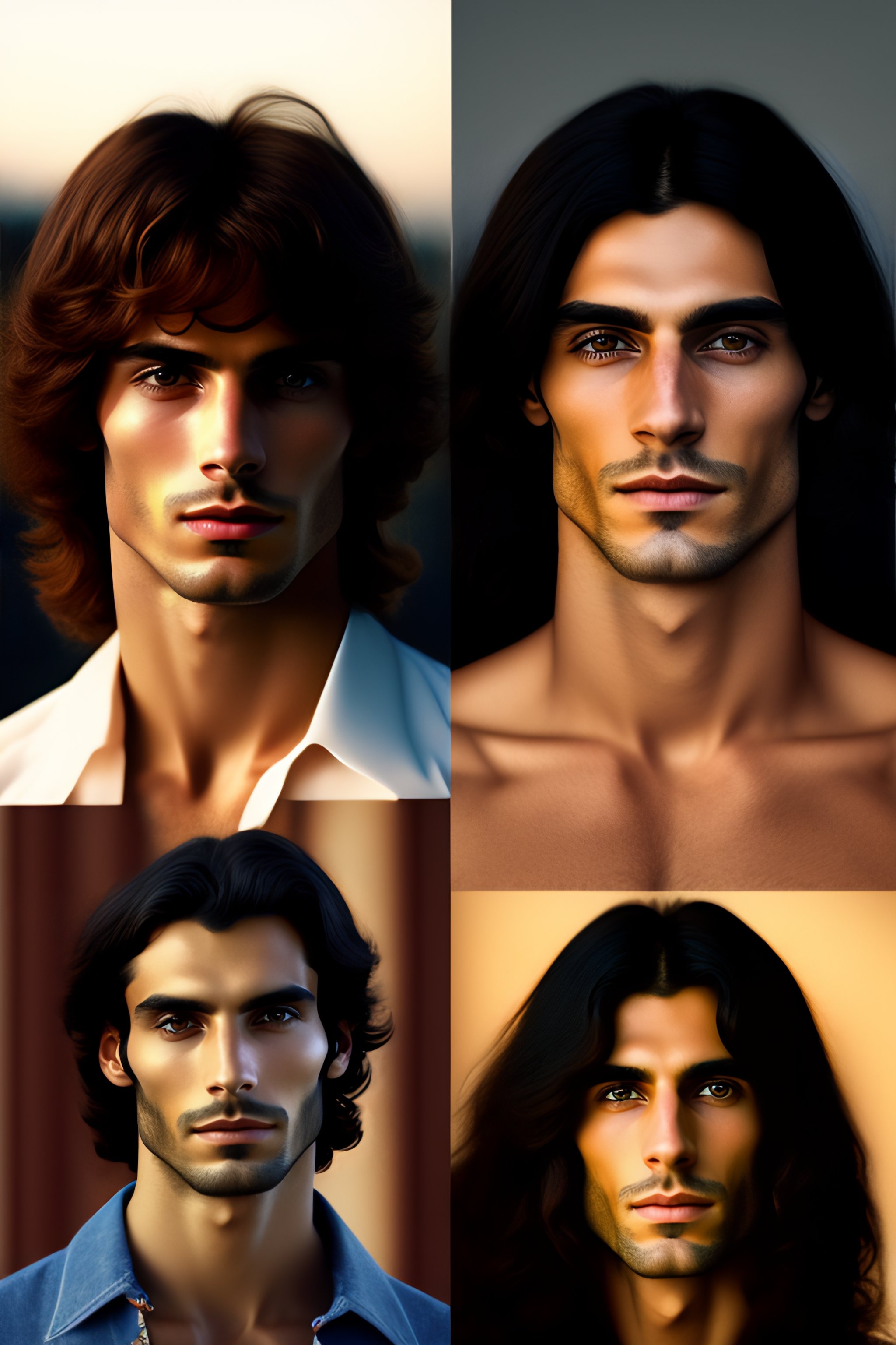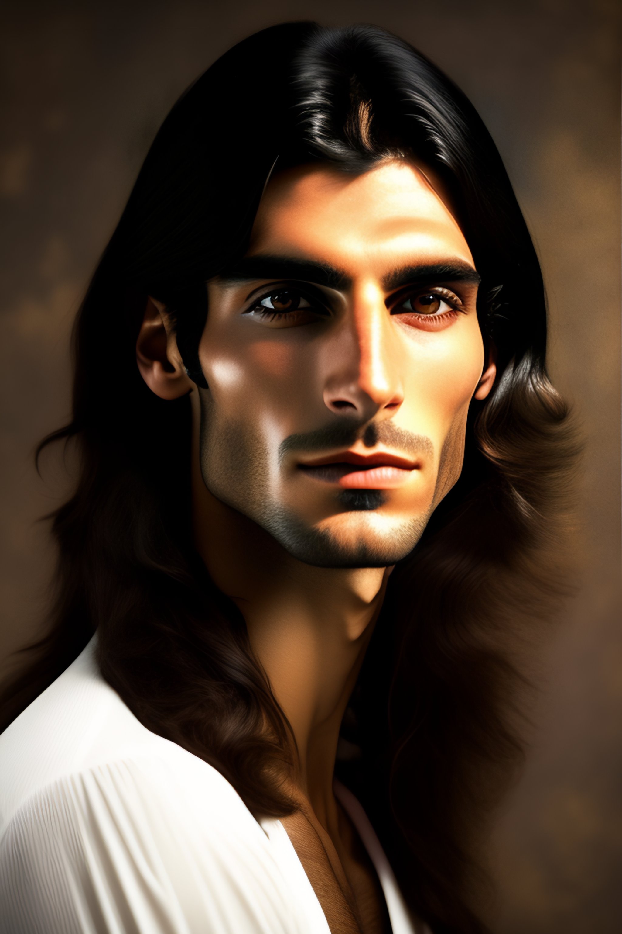 Italian guy, high, 30-year-old, very bright skin, thin, pale, very long dark hair, aphatic, dark deep eyes, smart, 70s fashion, realistic photo, medium shot