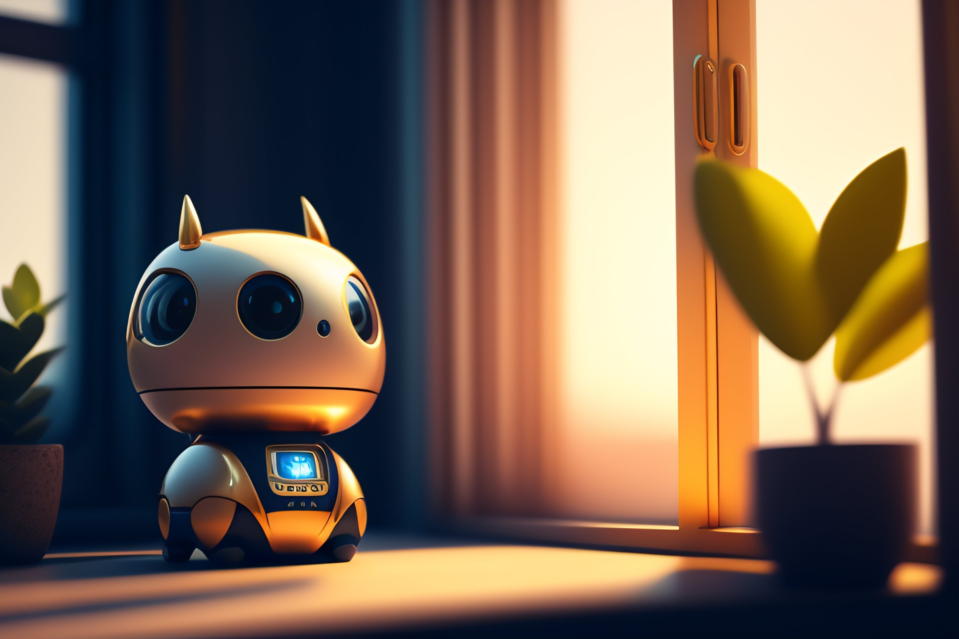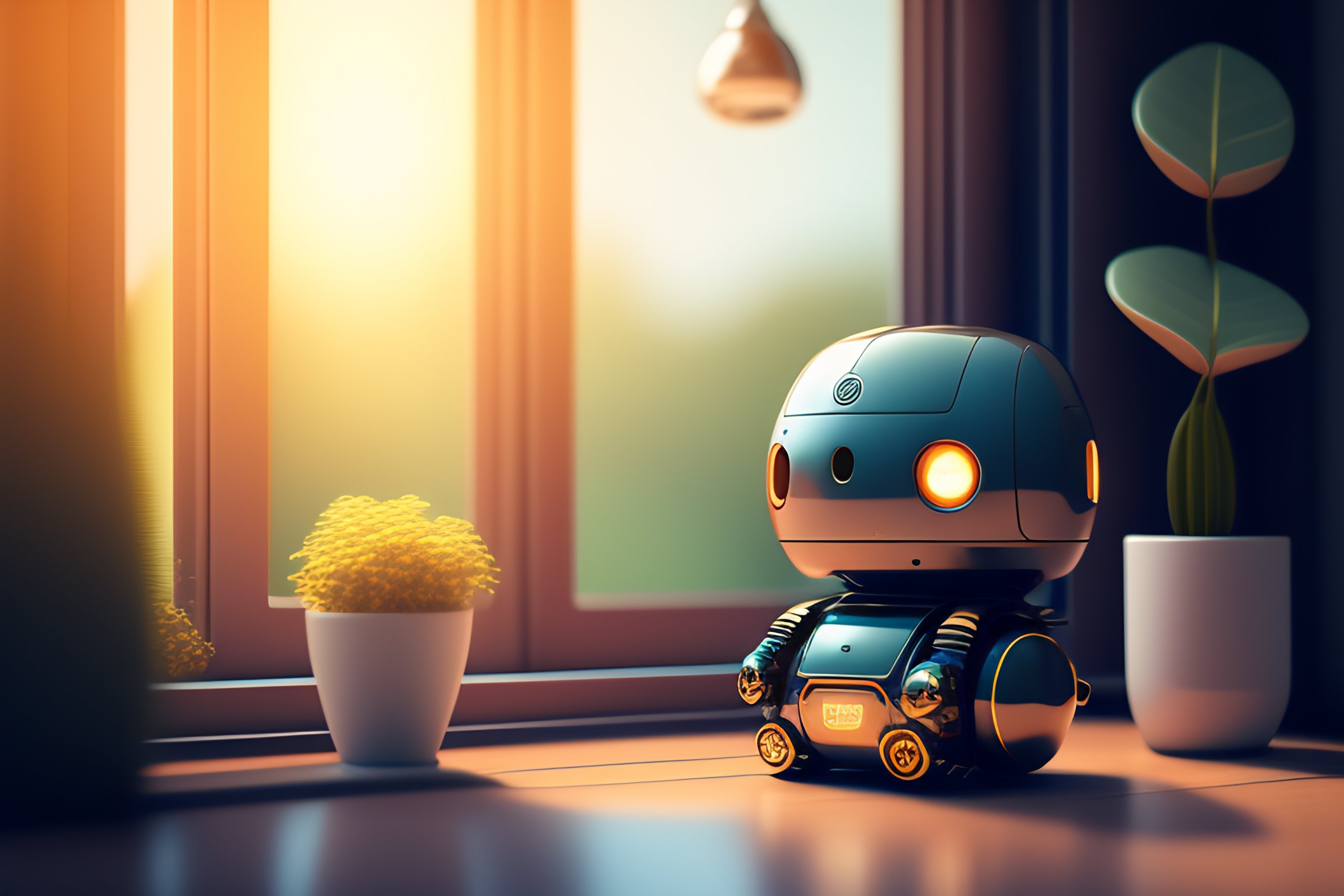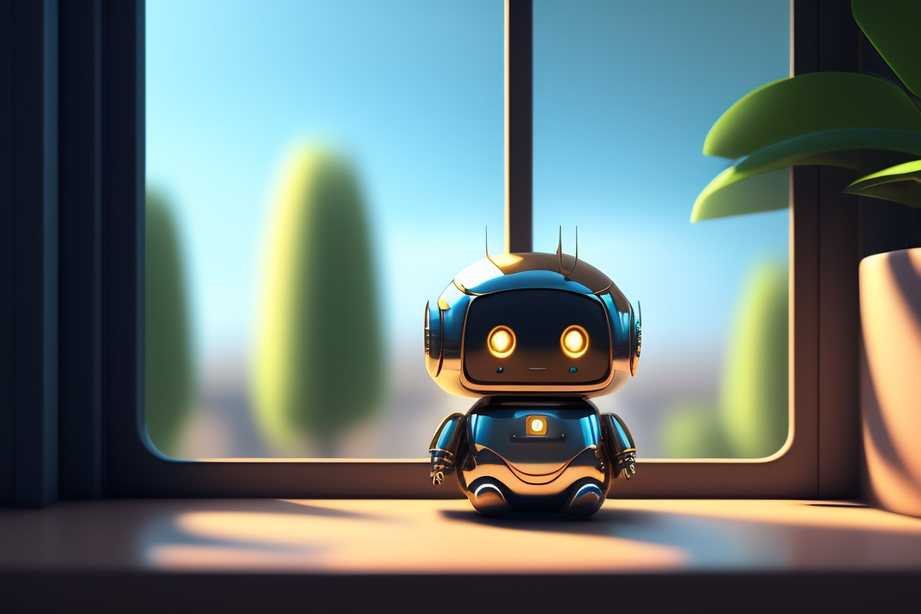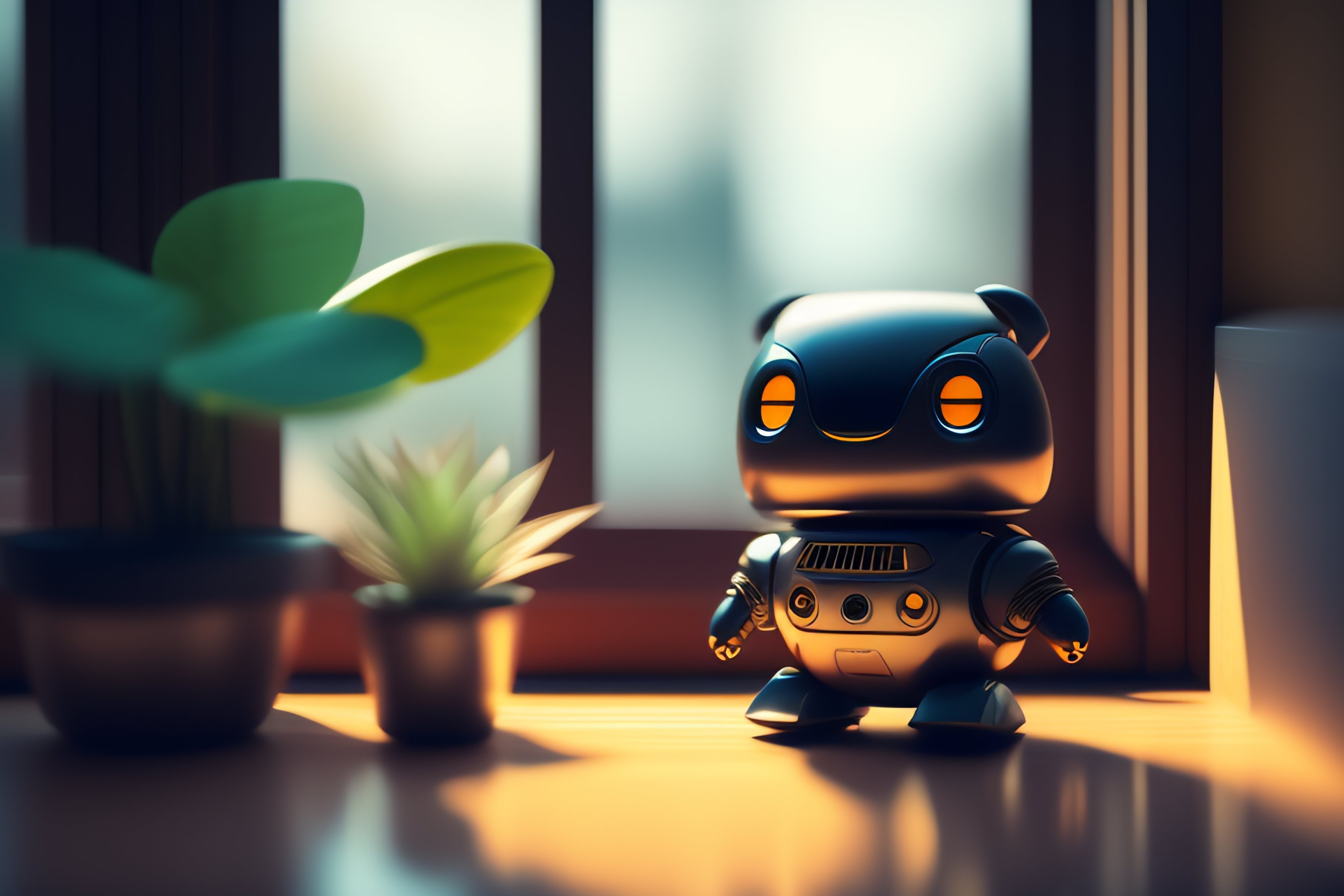 A cute mechanical robot sitting by a window, ghibli screenshot, bright natural light sunlight, lots of plants warm hues and tones. large windows with natural light