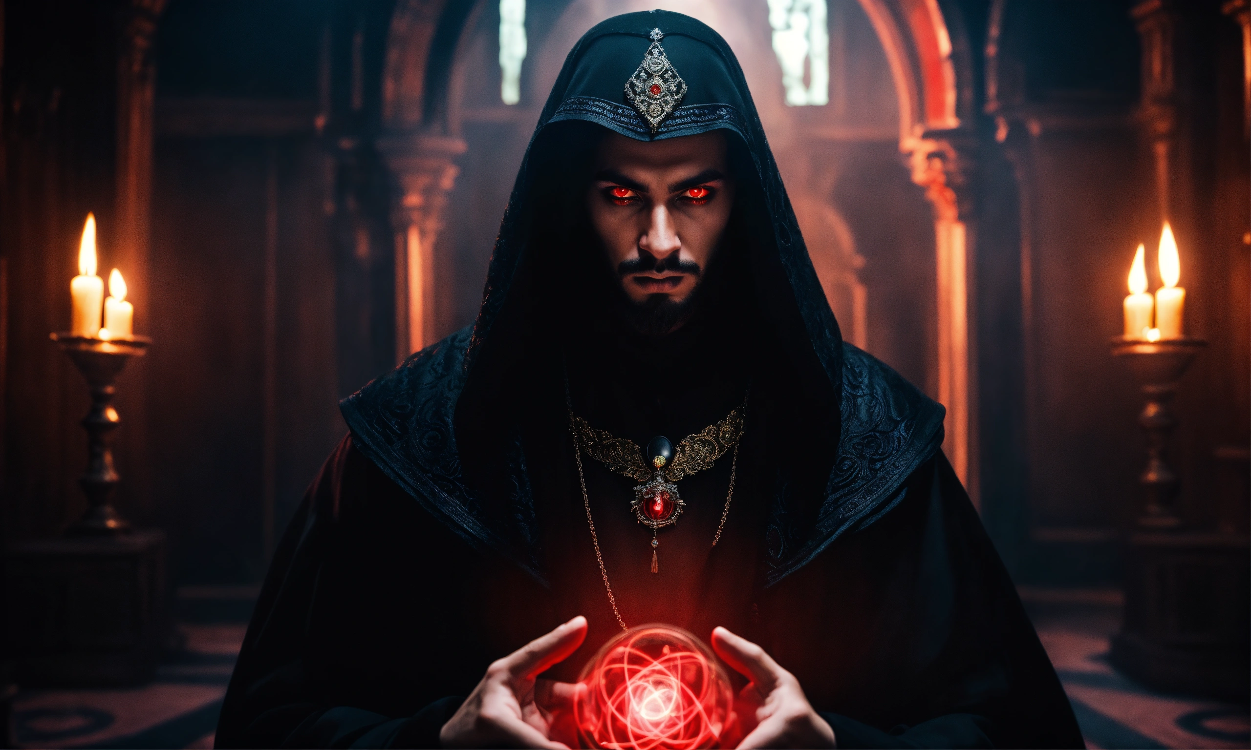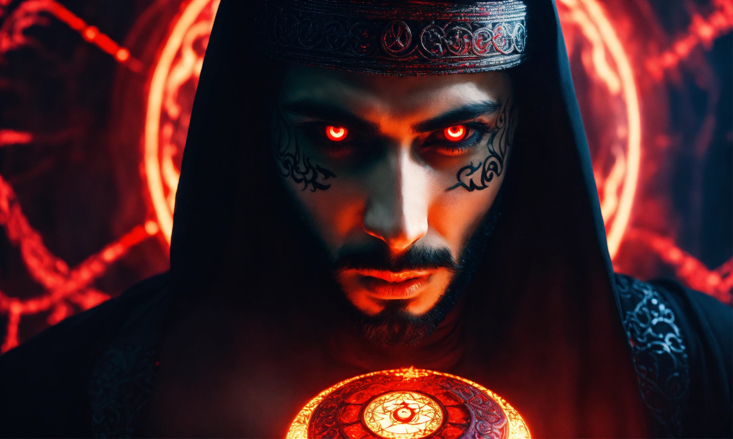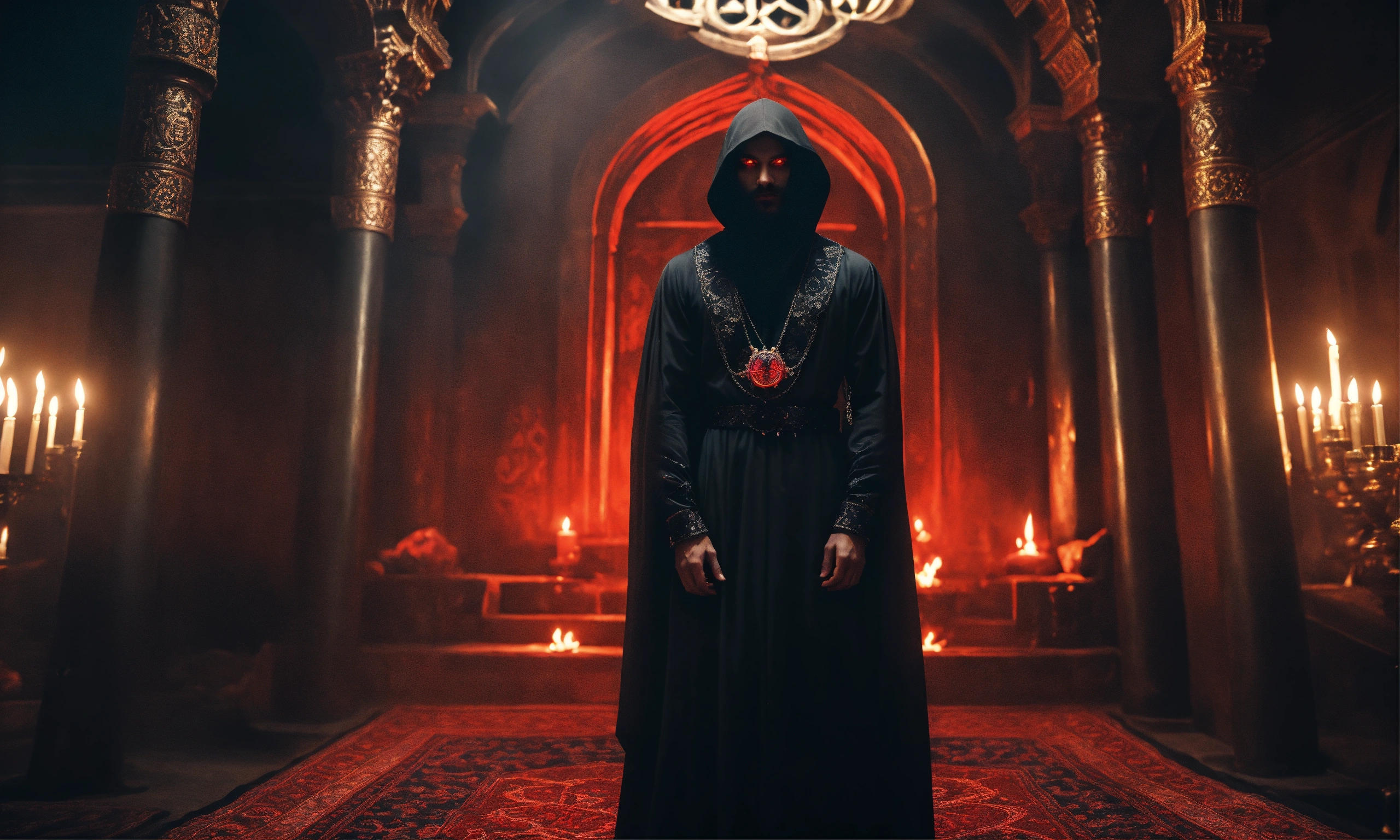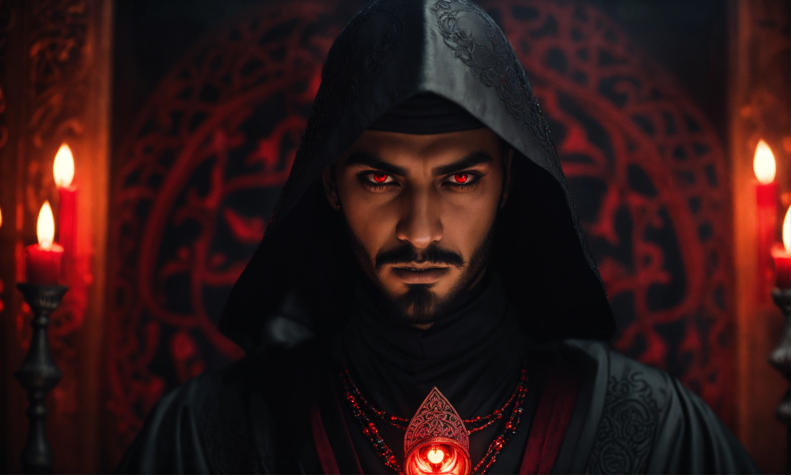 Sinister and dramatic portrait of a young handsome arabic evil sorcerer with hypnotically glowing red eyes wearing black elaborate mystical clothes, hypnotising the viewer in an obscure occult sanctum.