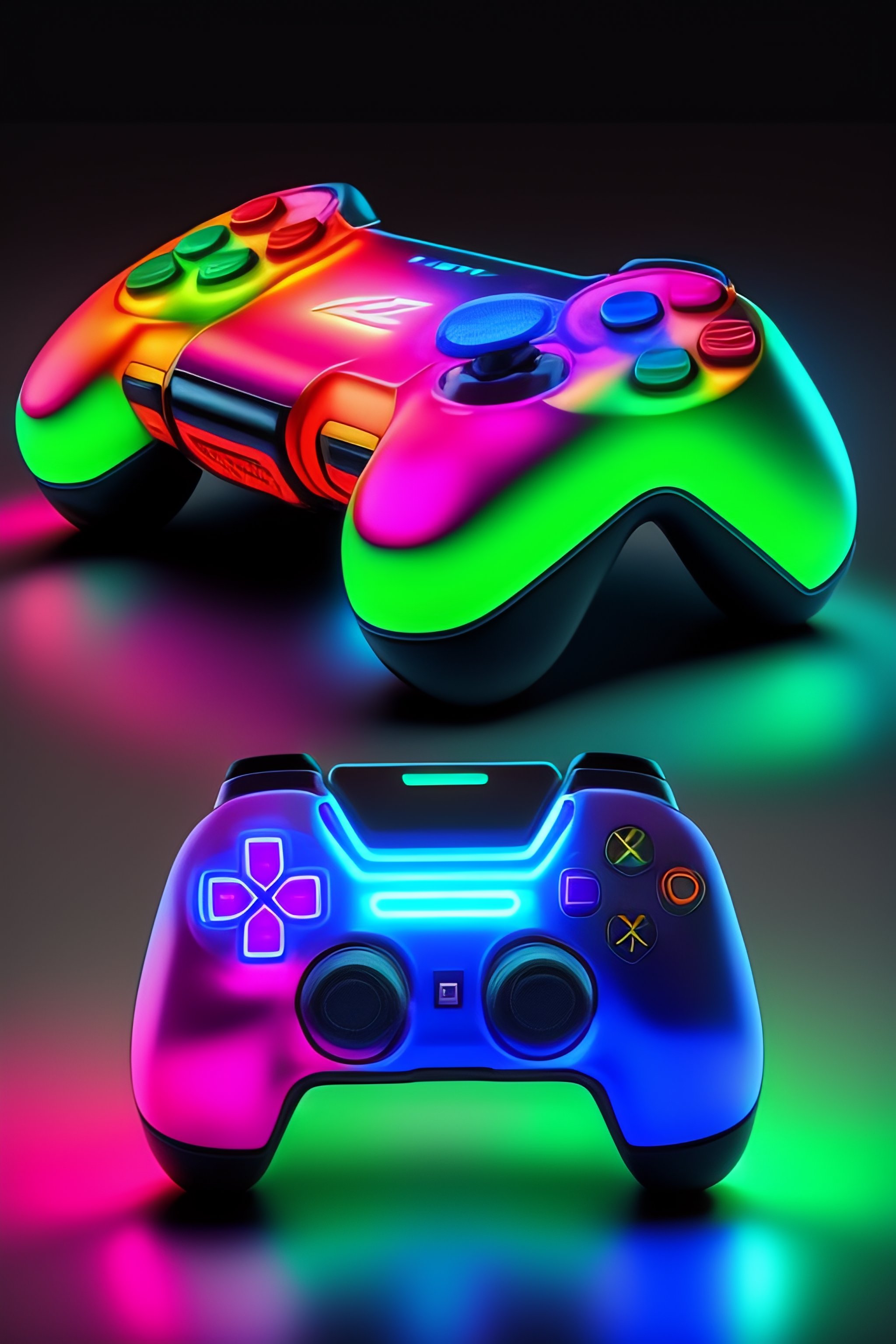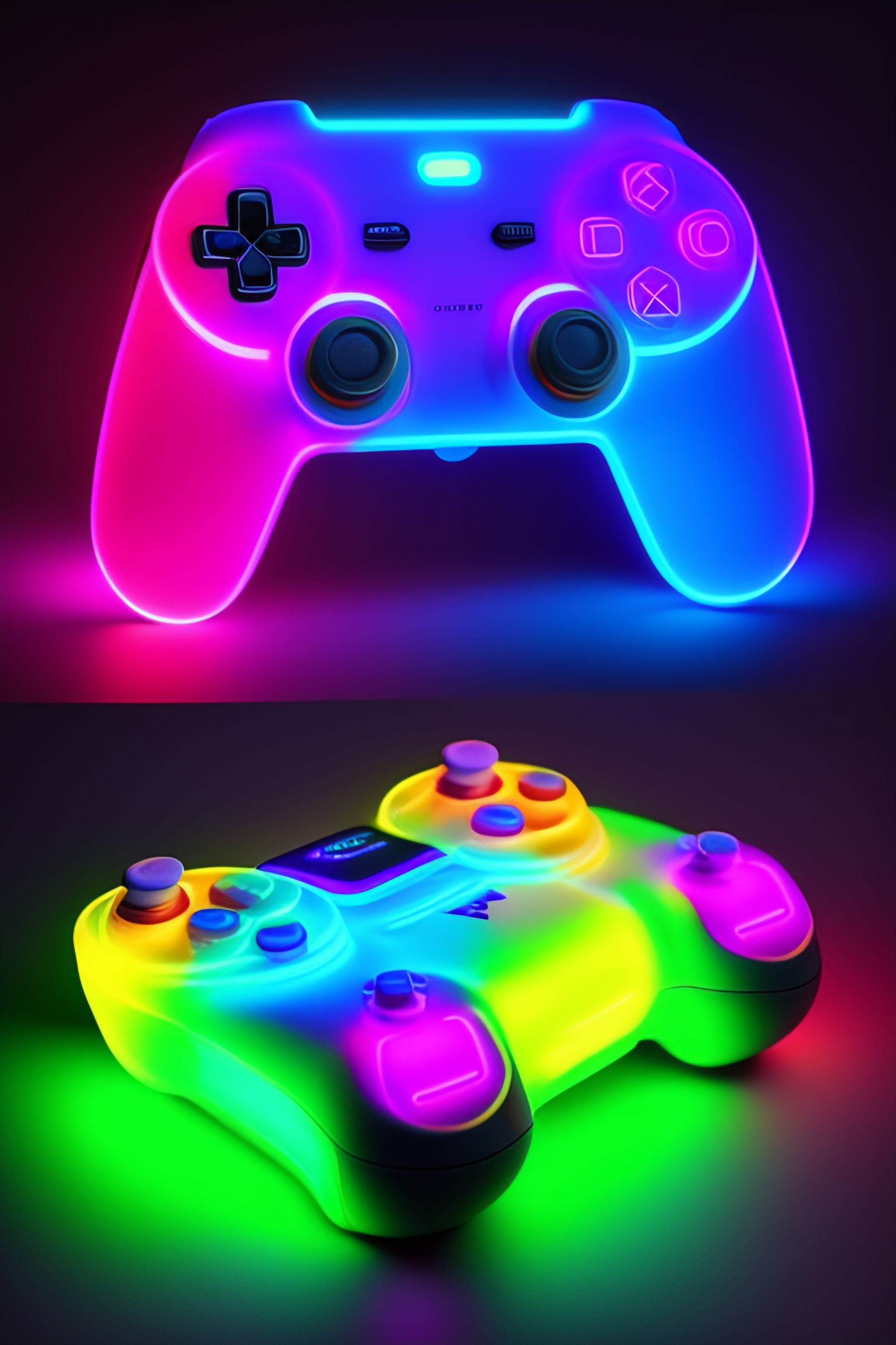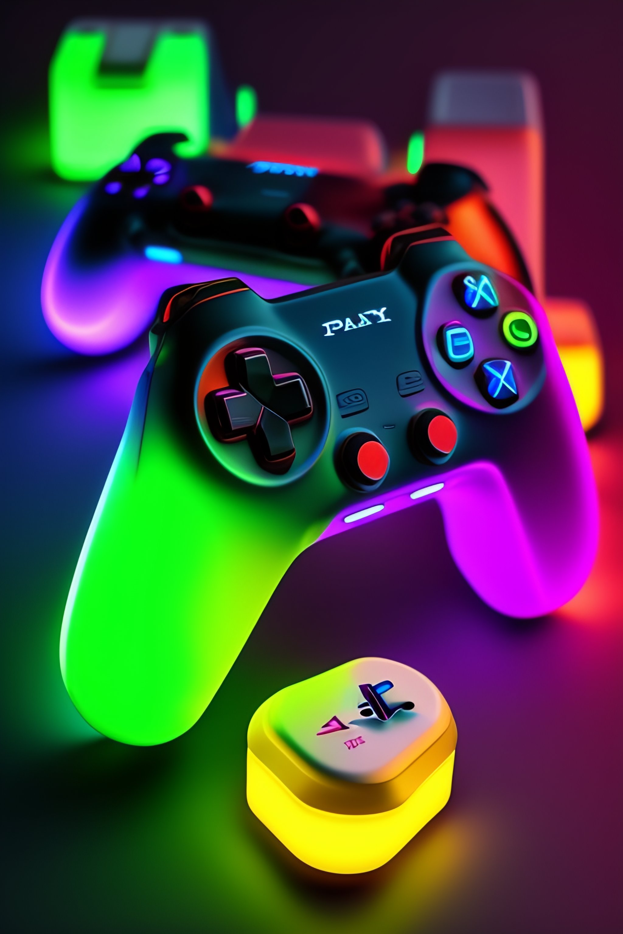 Design a futuristic, neon-colored gaming controller in the style of a playstation controller. the controller should have a liquified, metallic appearance and should be surrounded by swirling, glowing neon accents.