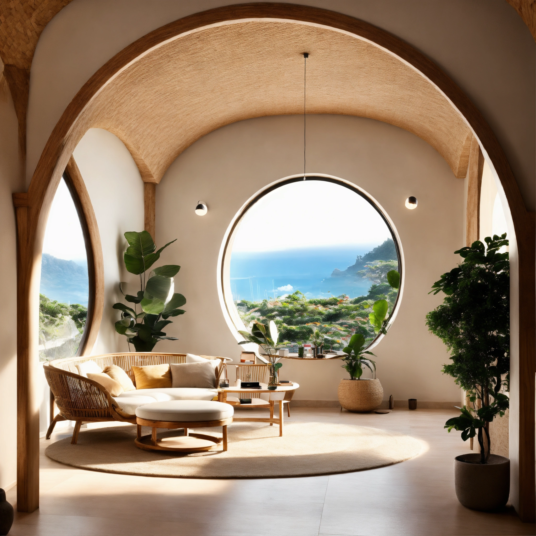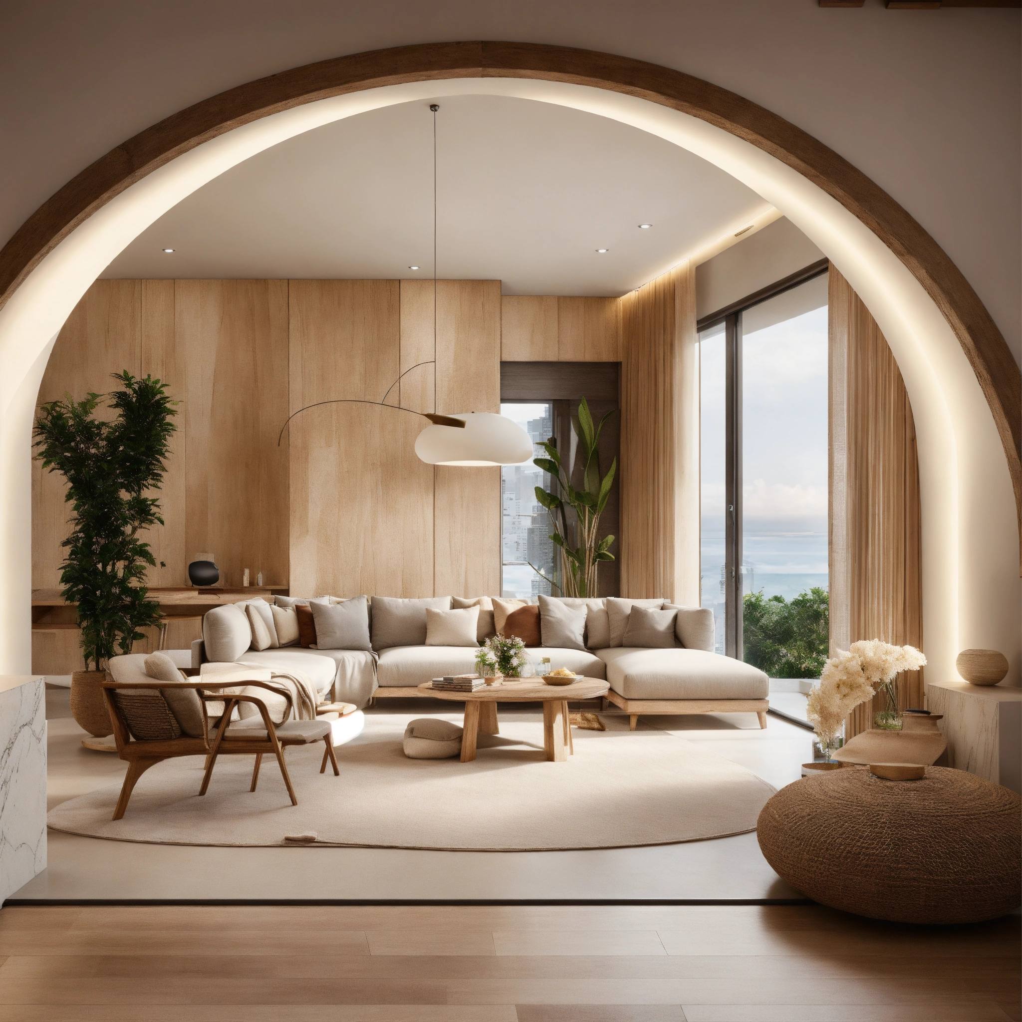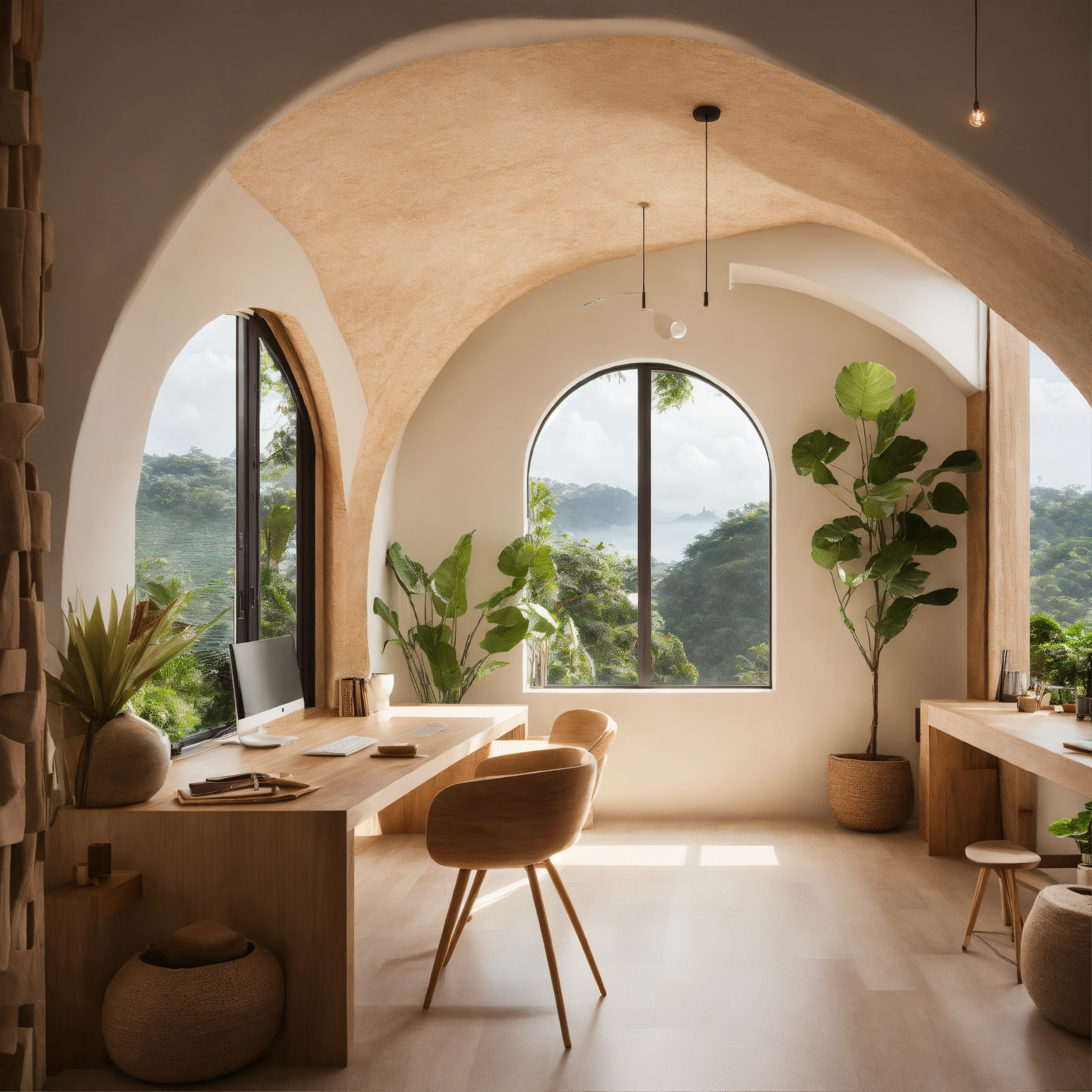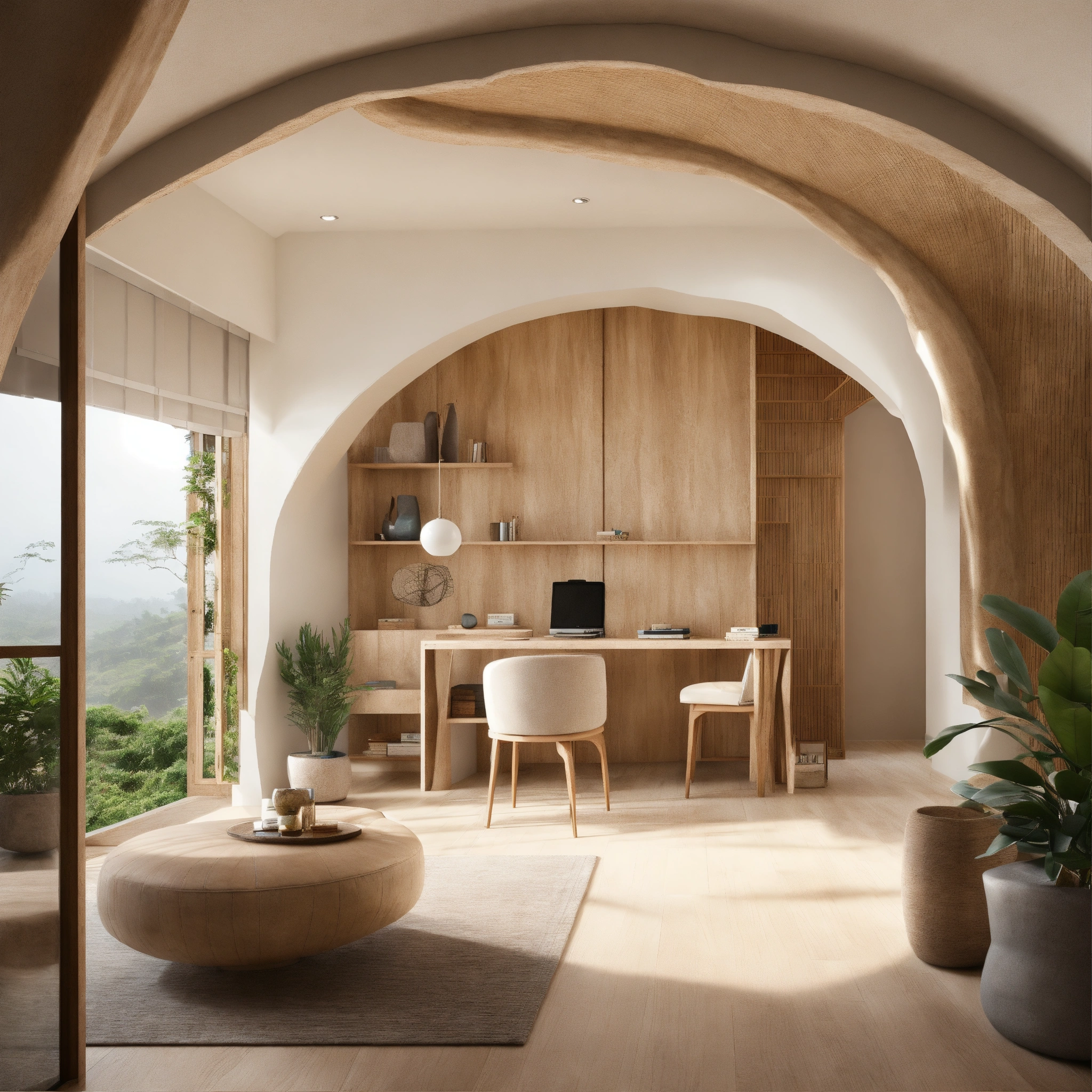 Ultra realistic photo of modern take on bali inspired low ceiling small apartment white cream stone, light wood round arches interor view of office.