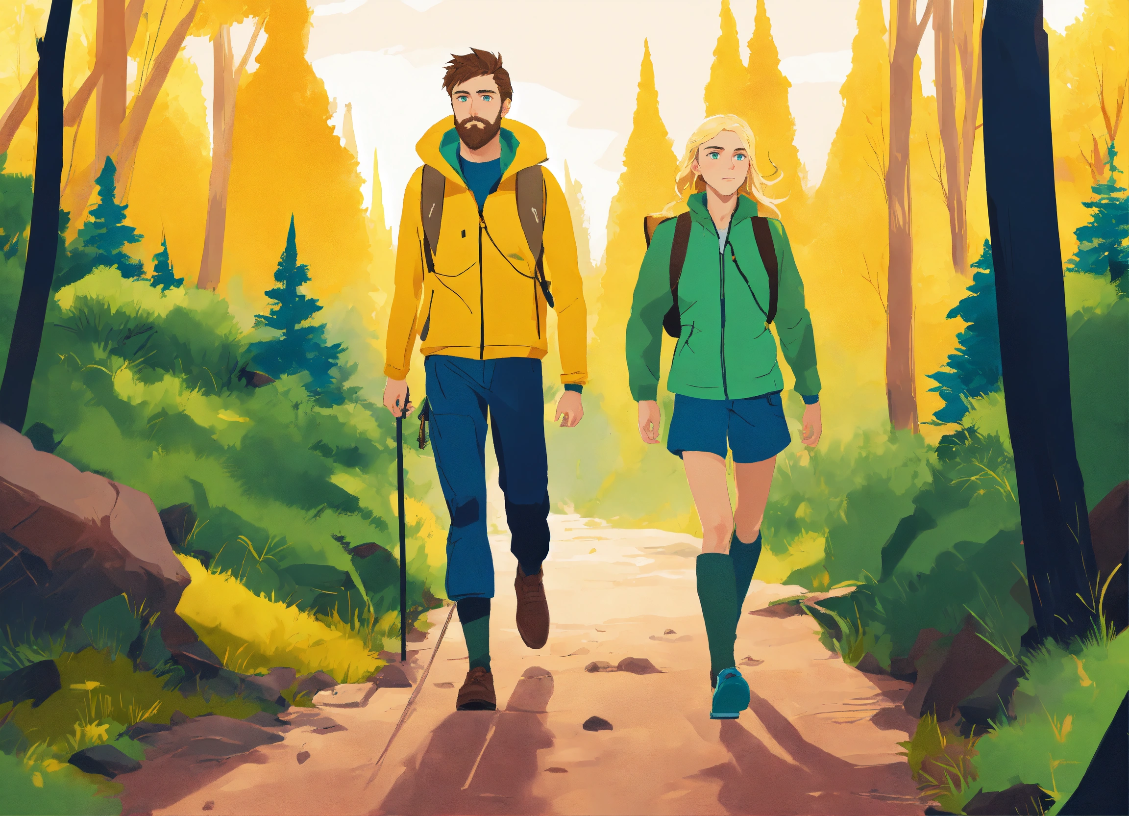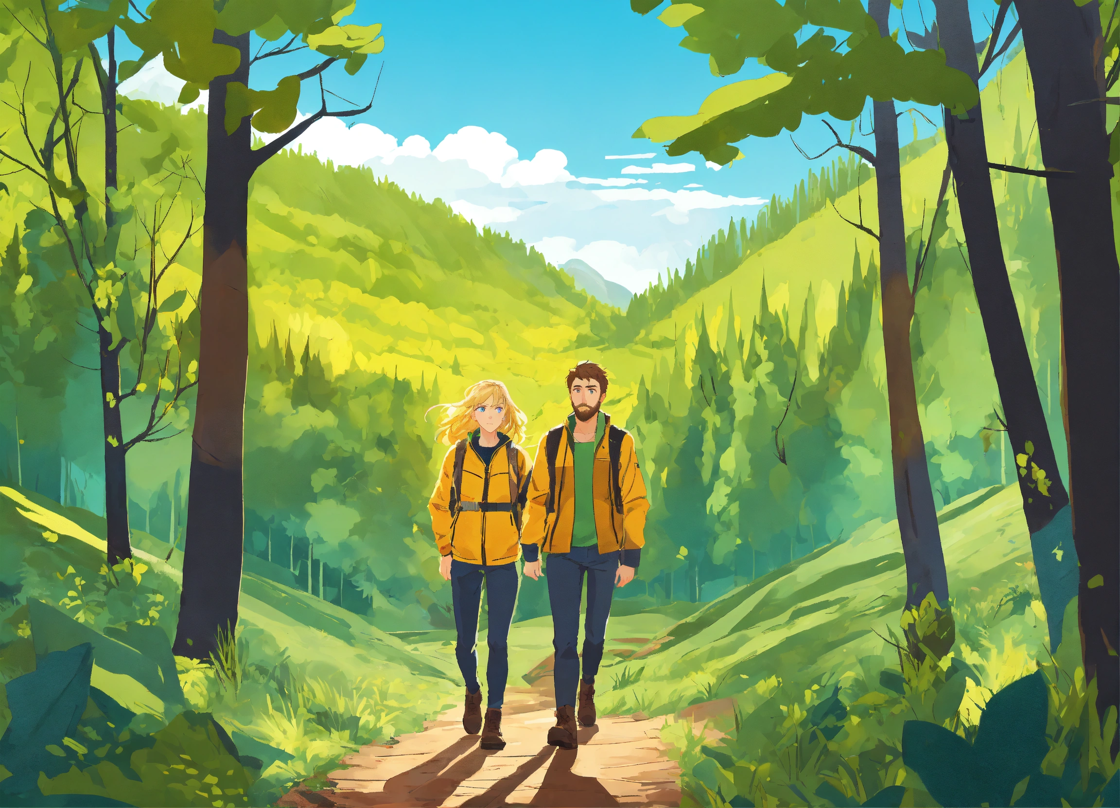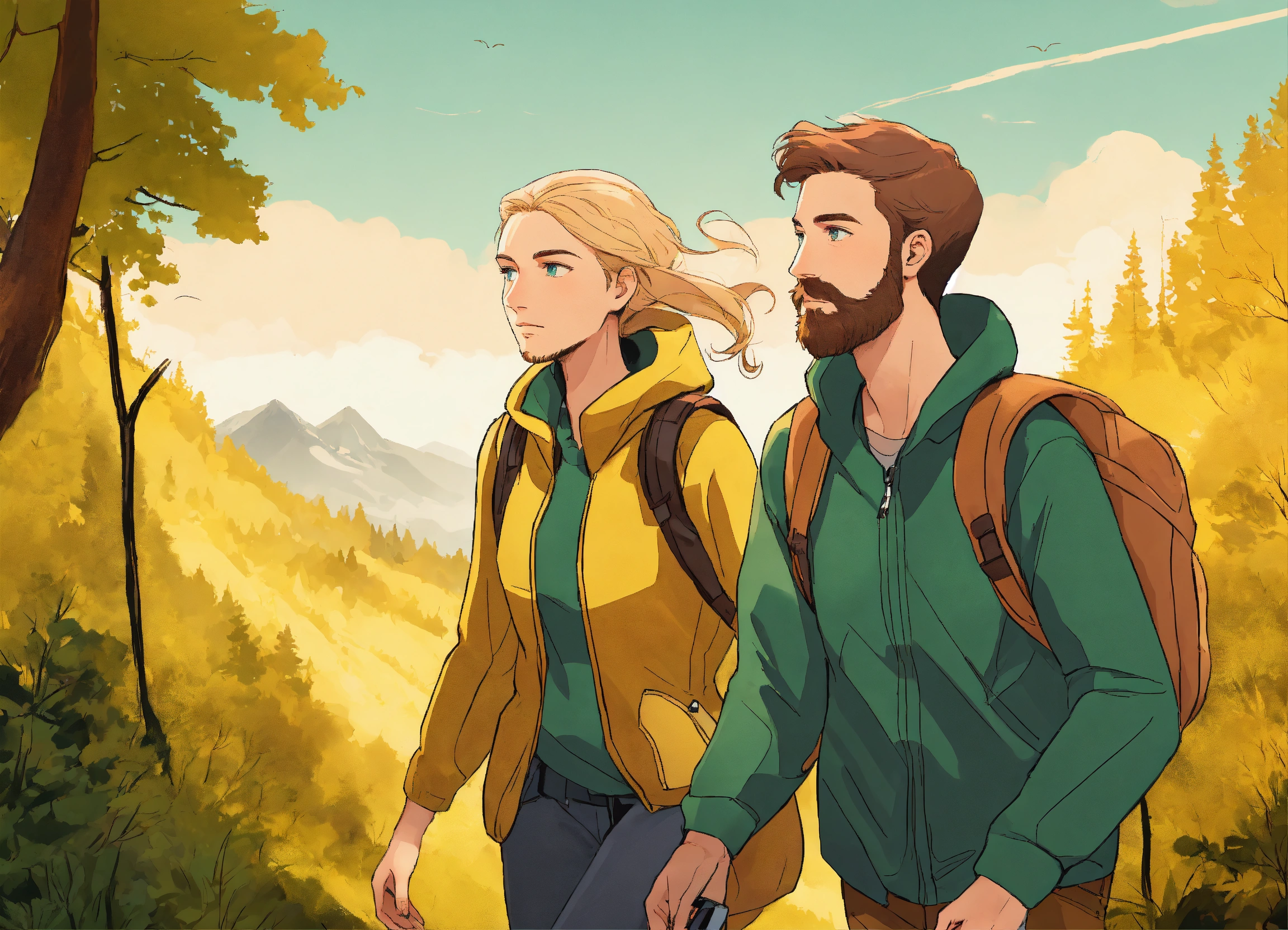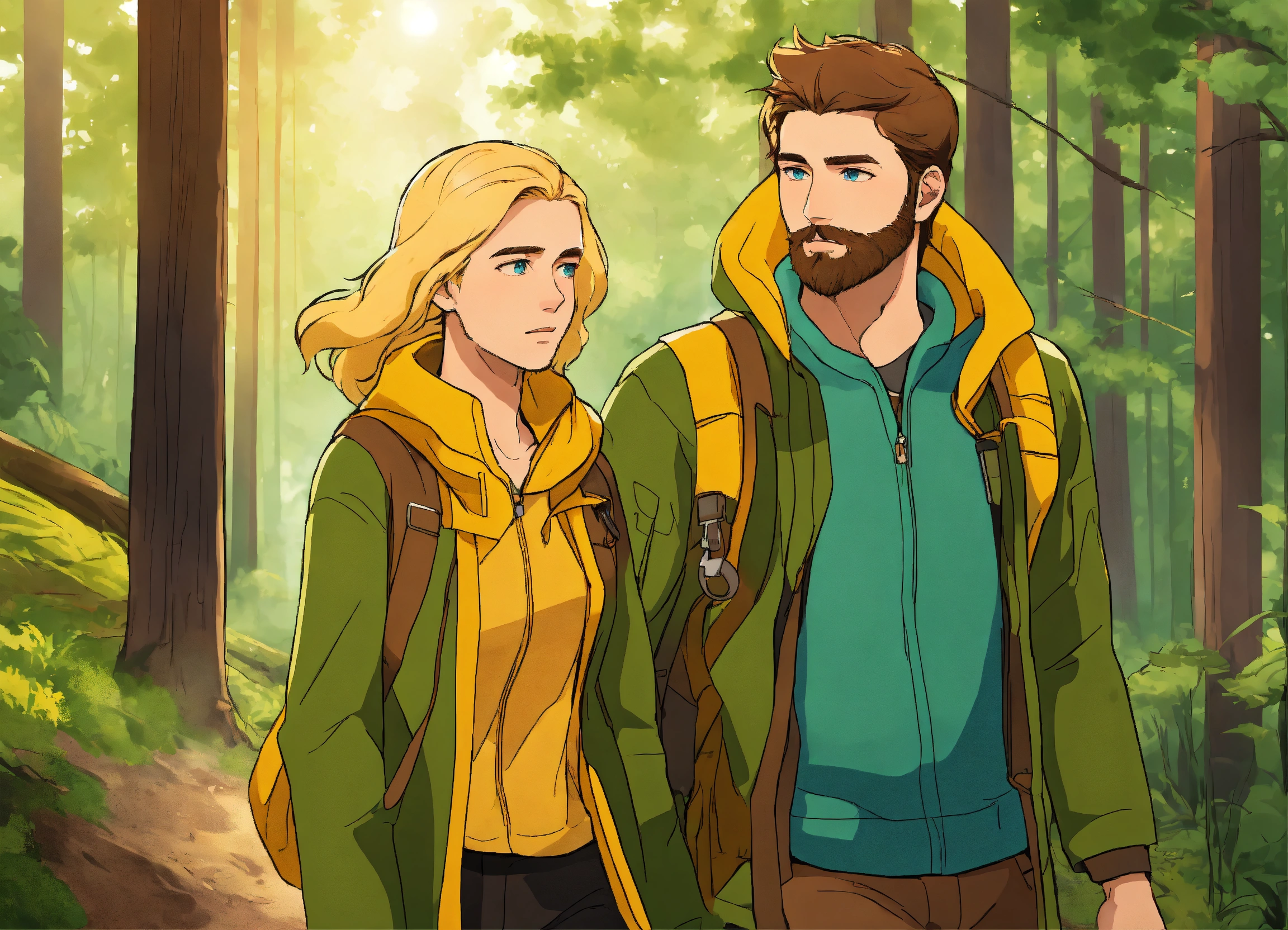 An illustration style where young man with brown hair, light thin brown beard and green eyes, yellow jacket and woman with blonde hair, blue eyes and v shape face embarks on their journey to forest where their challenges begin with the need to navigate treacherous terrain, . show wide view of background