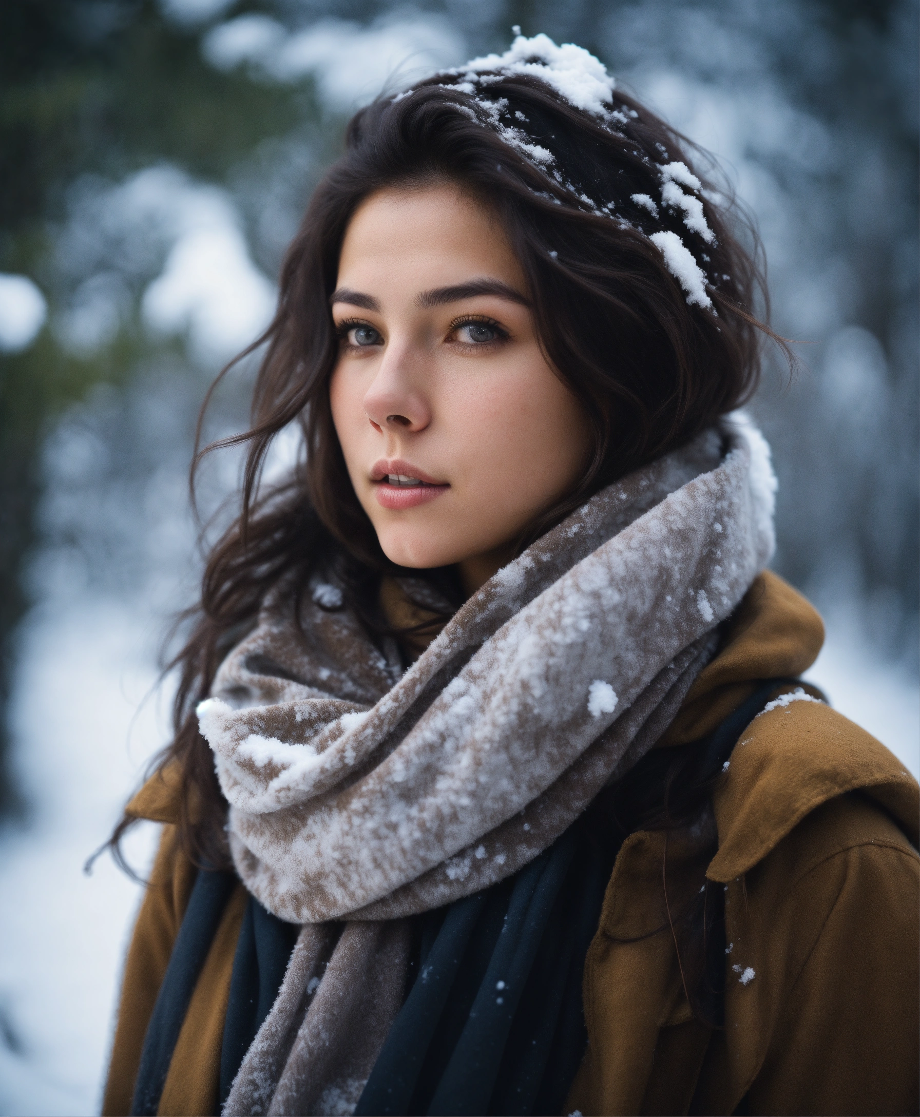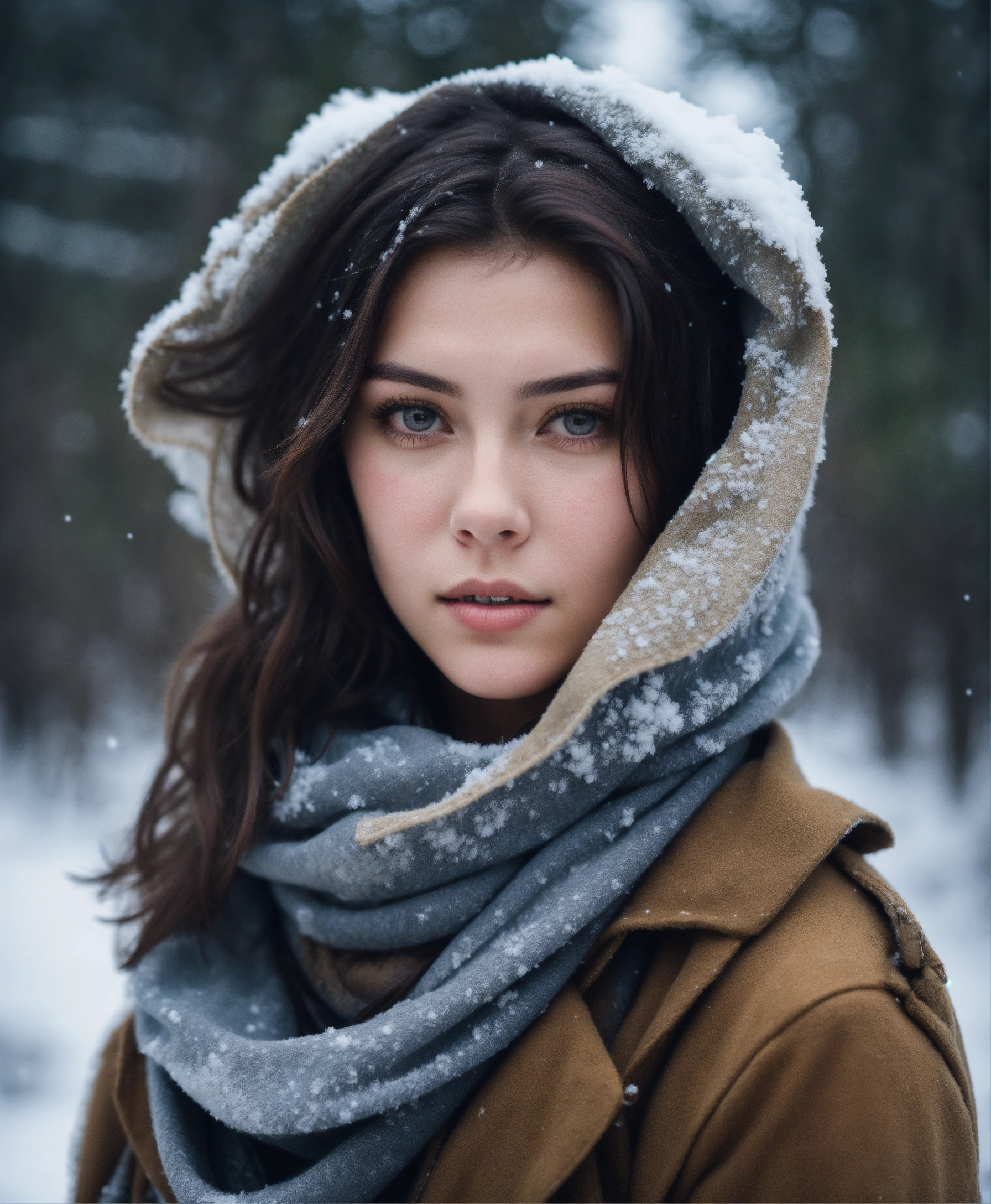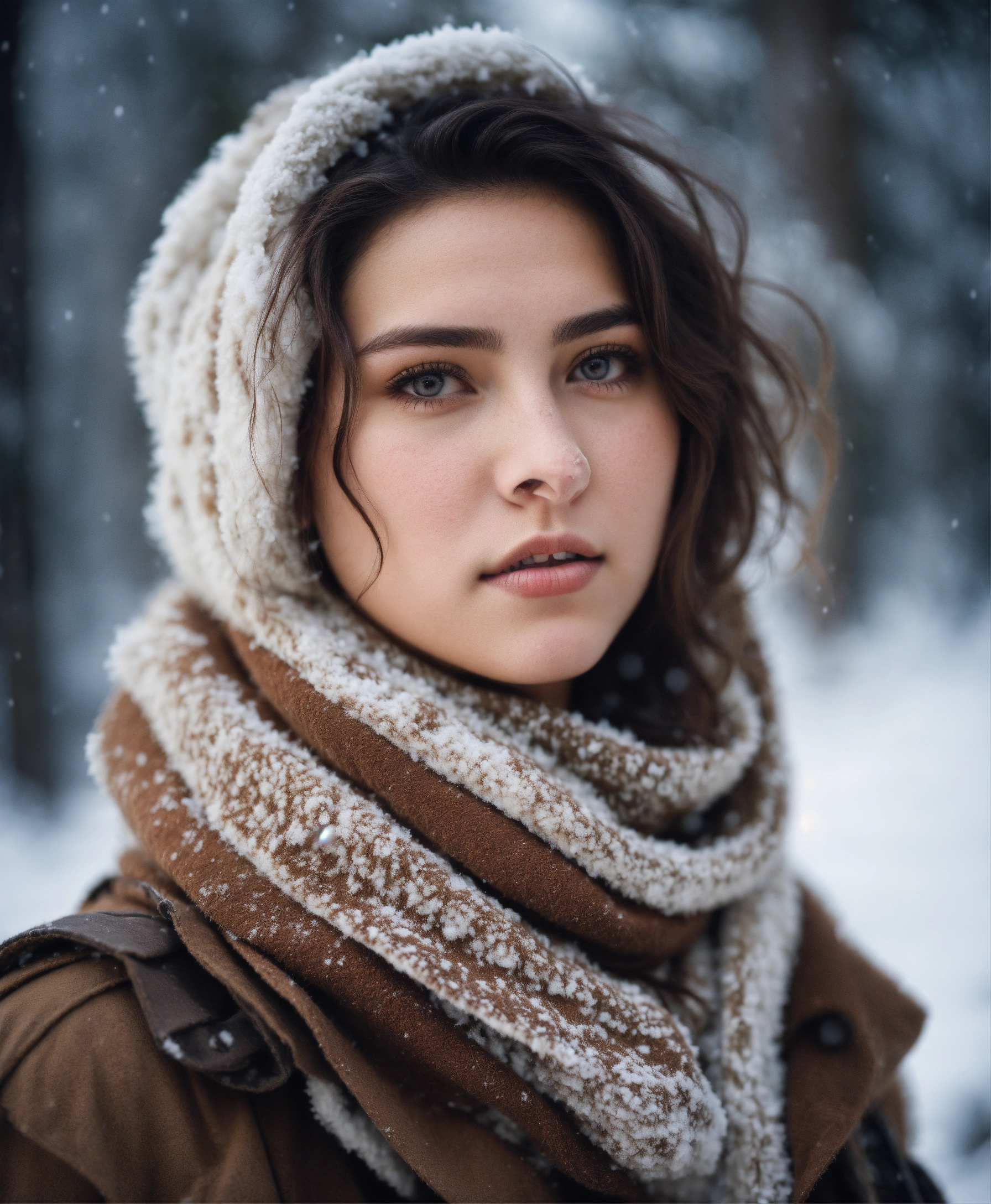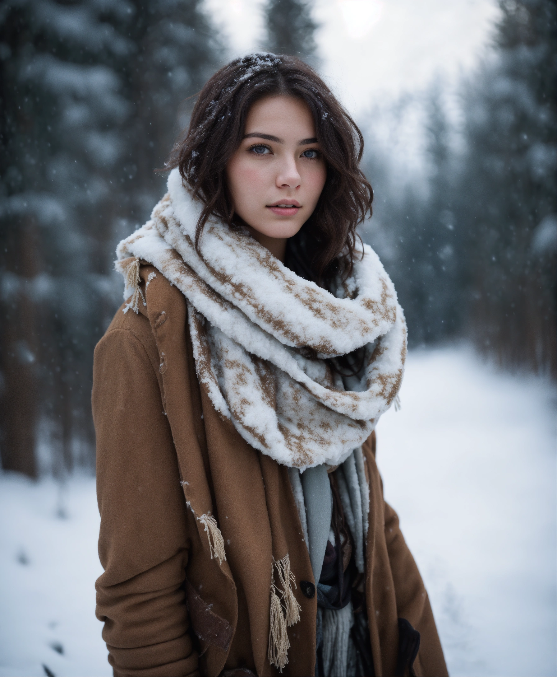 An ultra detailed photo of a 22 years old brunette girl, with mid-short loose hair, brown eyes, natural beauty, calm expression, strong body, wearing a scarf and snowy post-apocalyptic clothes, a snowed forest in the background. romantic aura. no jewelry, no makeup.