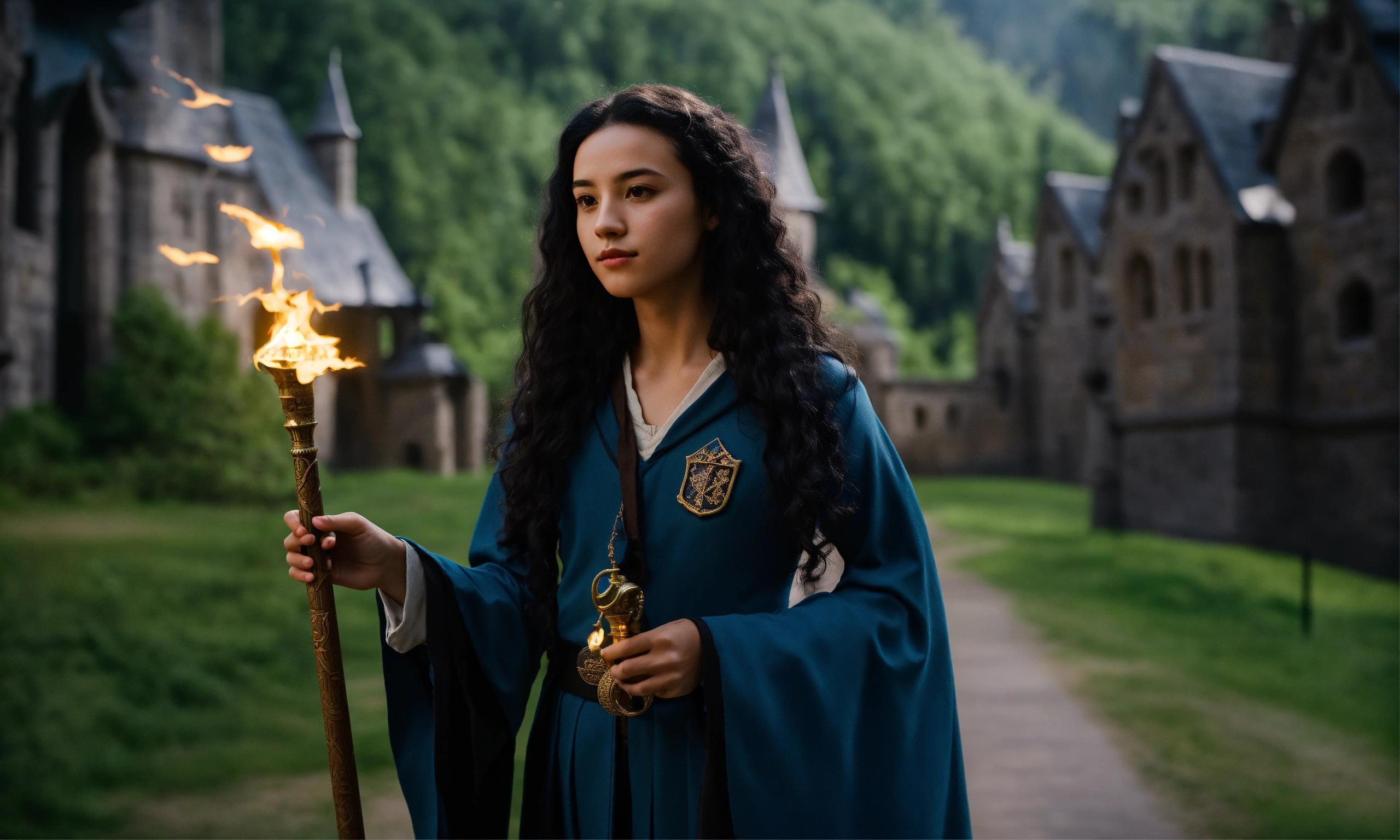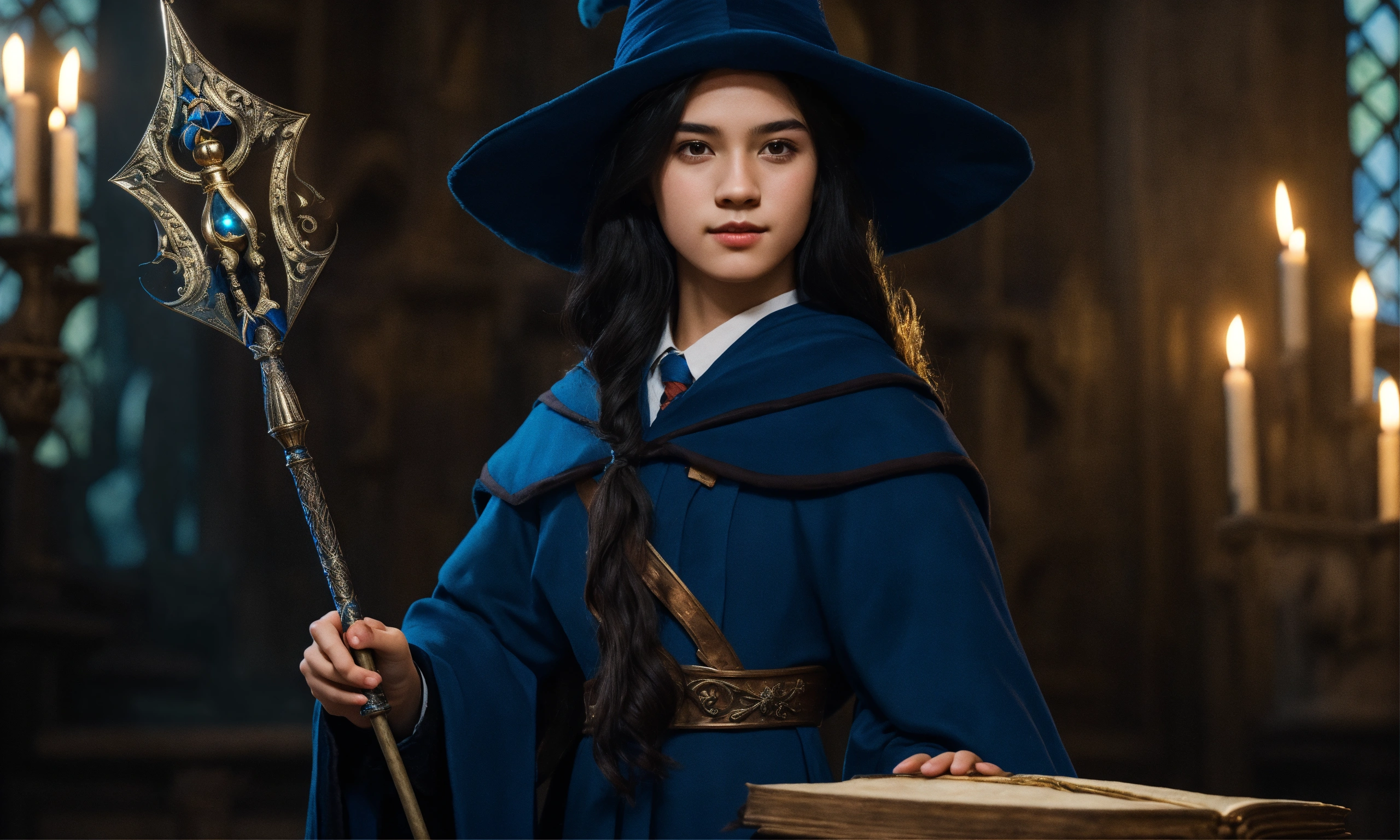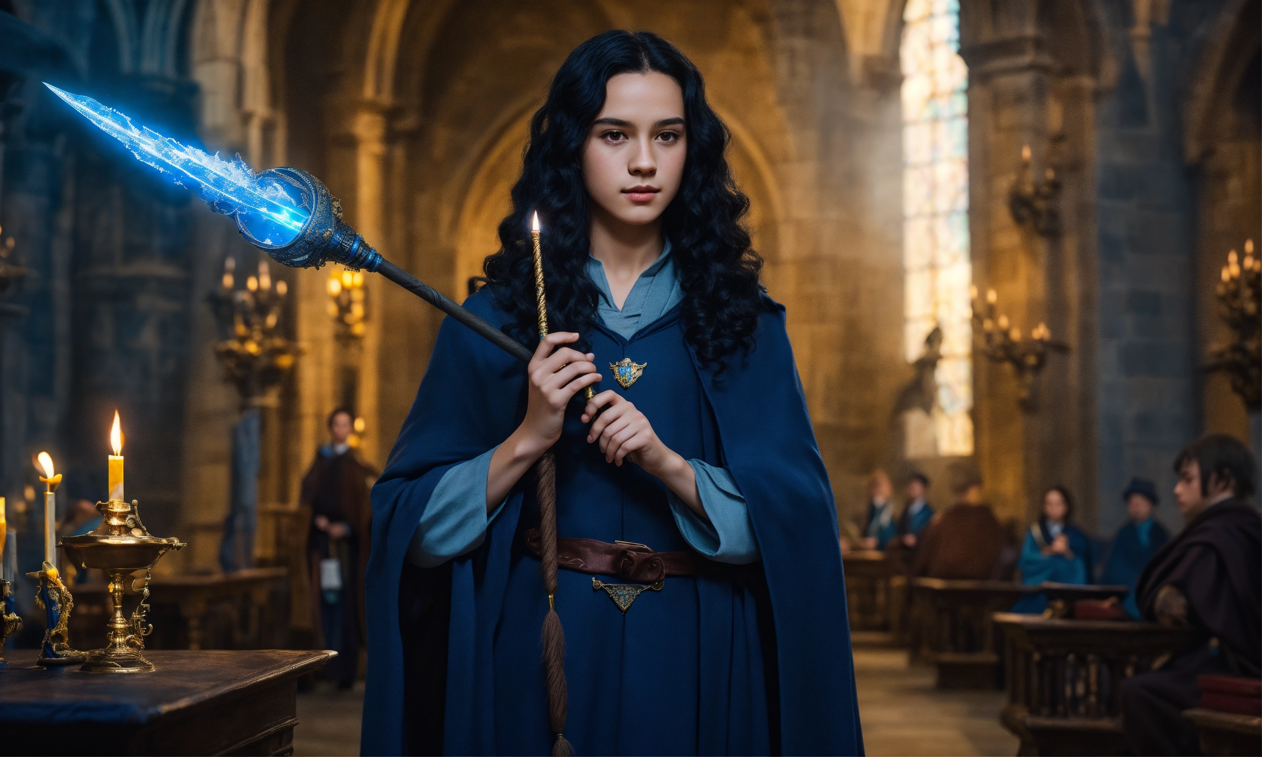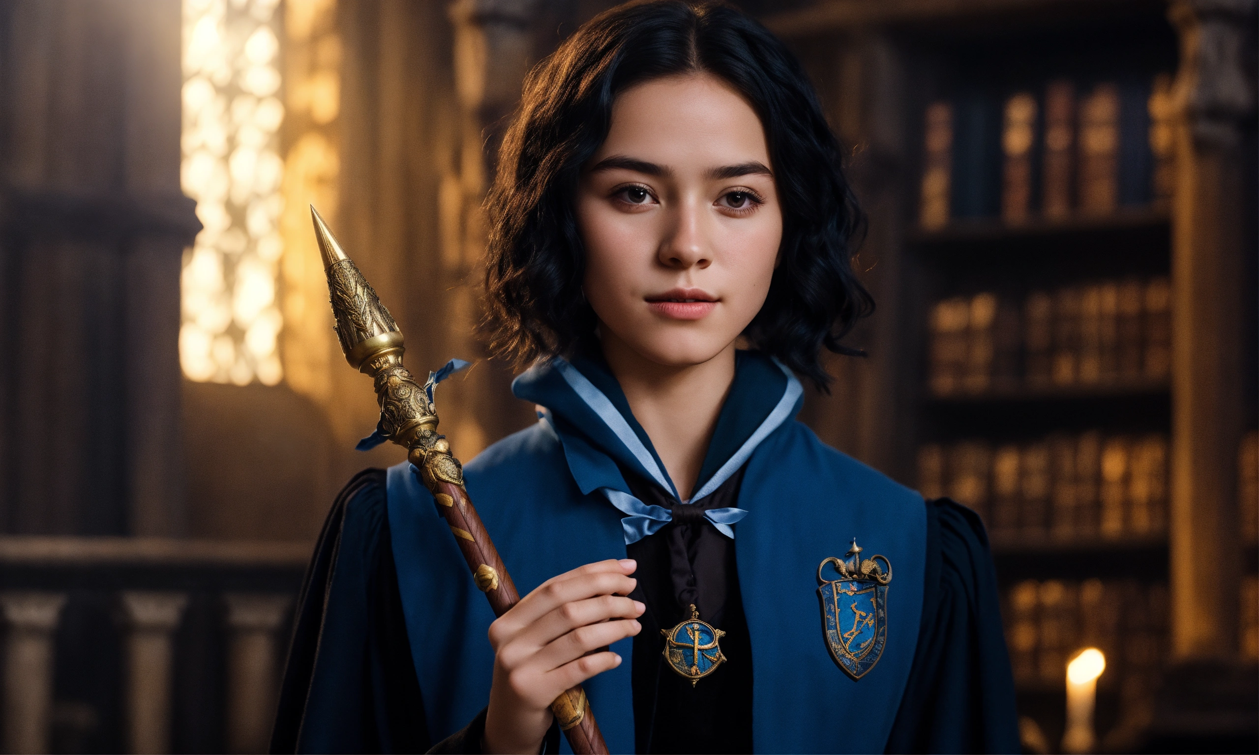 Wicked cute wooman young wizard, inside hogwarts with a mystical scepter in his hand 2023 year, ravenclaw, without fingers without showing them, black hair
