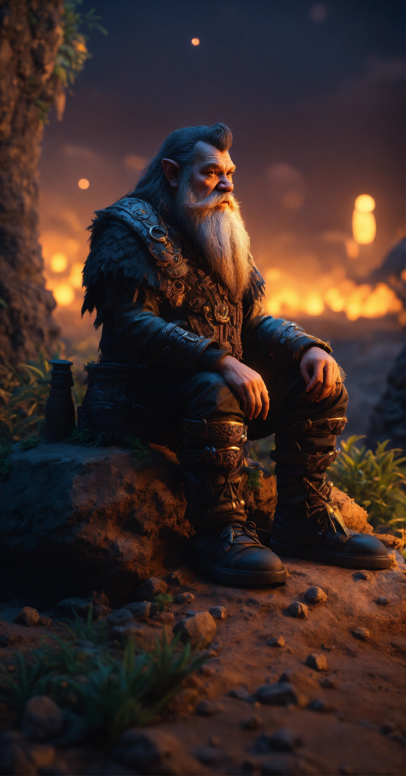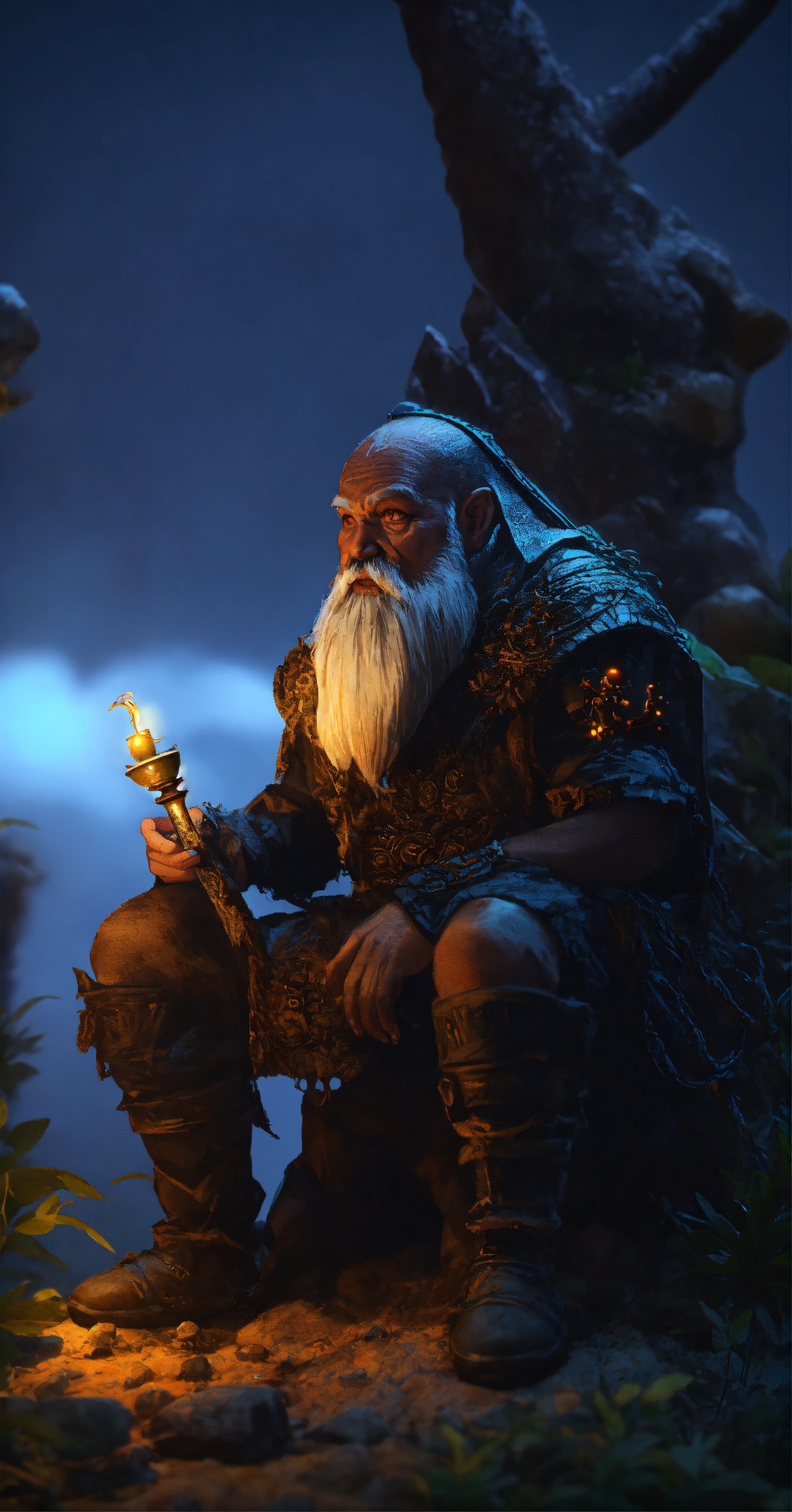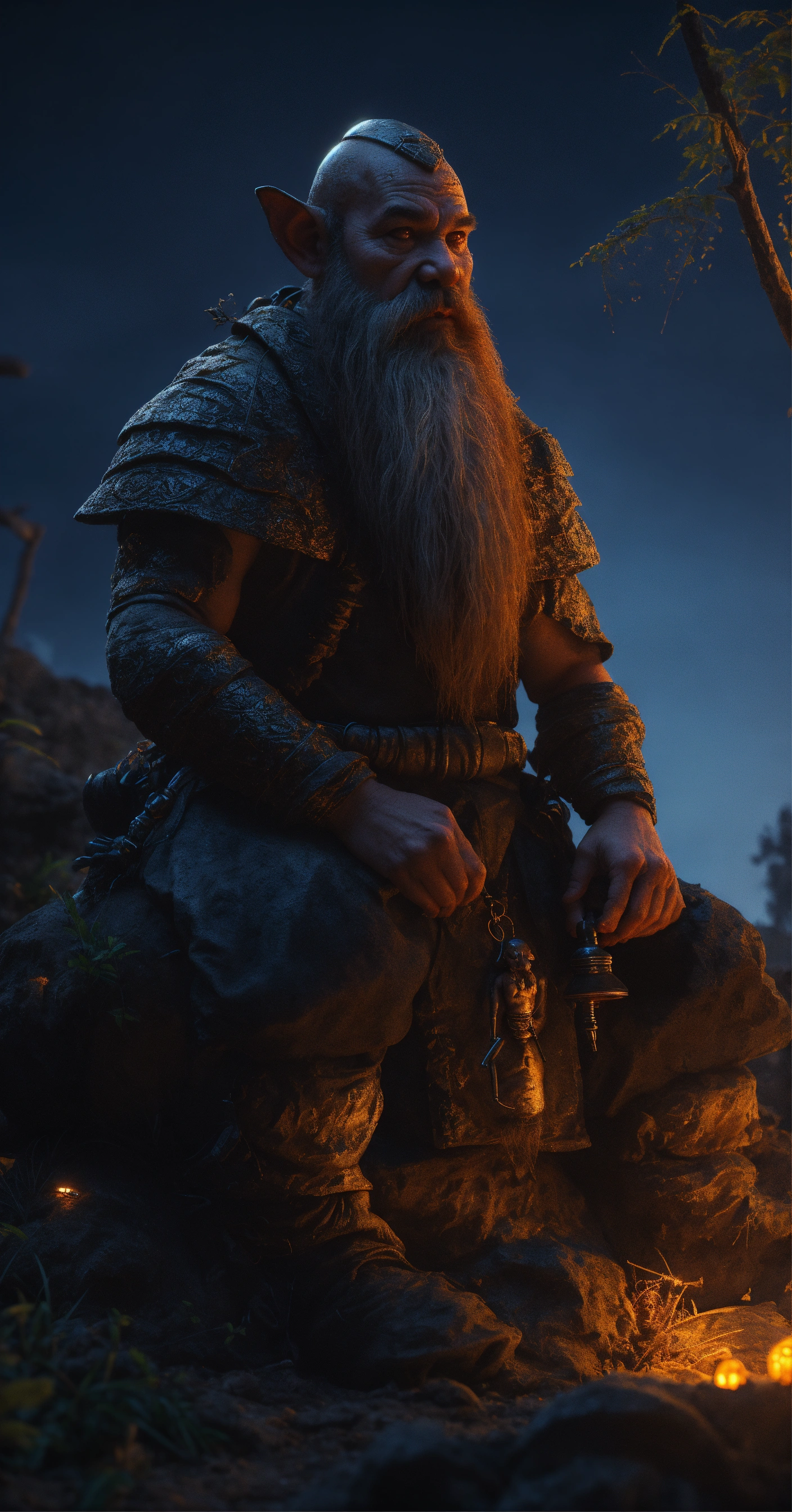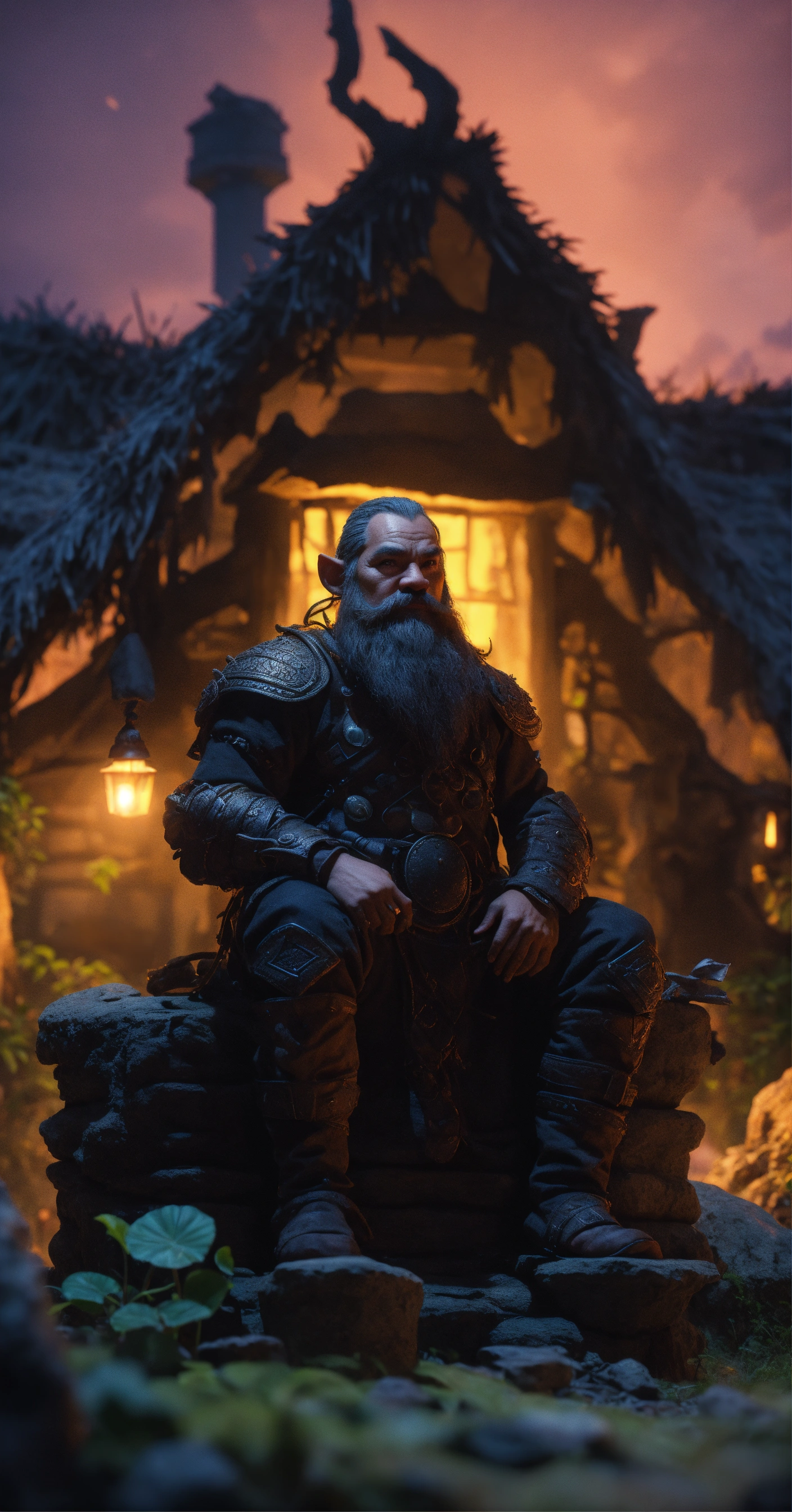 A small scary dwarf human-like creature with long beard wearing black, sitting on termite mound next to house, philippines, night light, intricate, sharf focus, concept art, artstation, fantasy, octane render, cinematic lighting, otherworldy