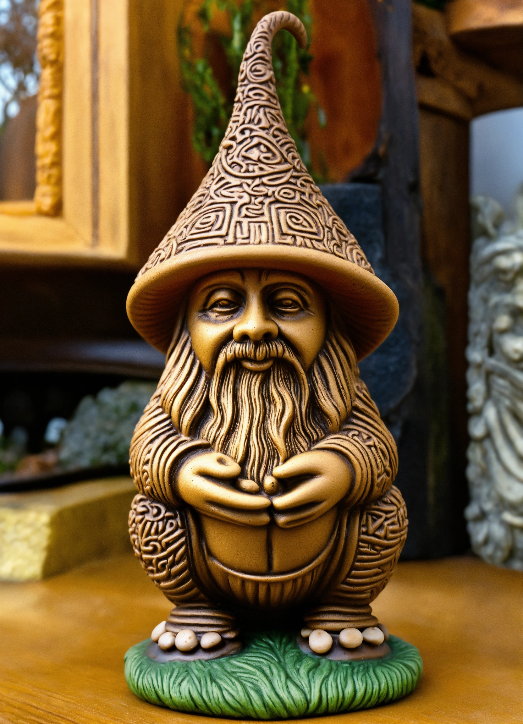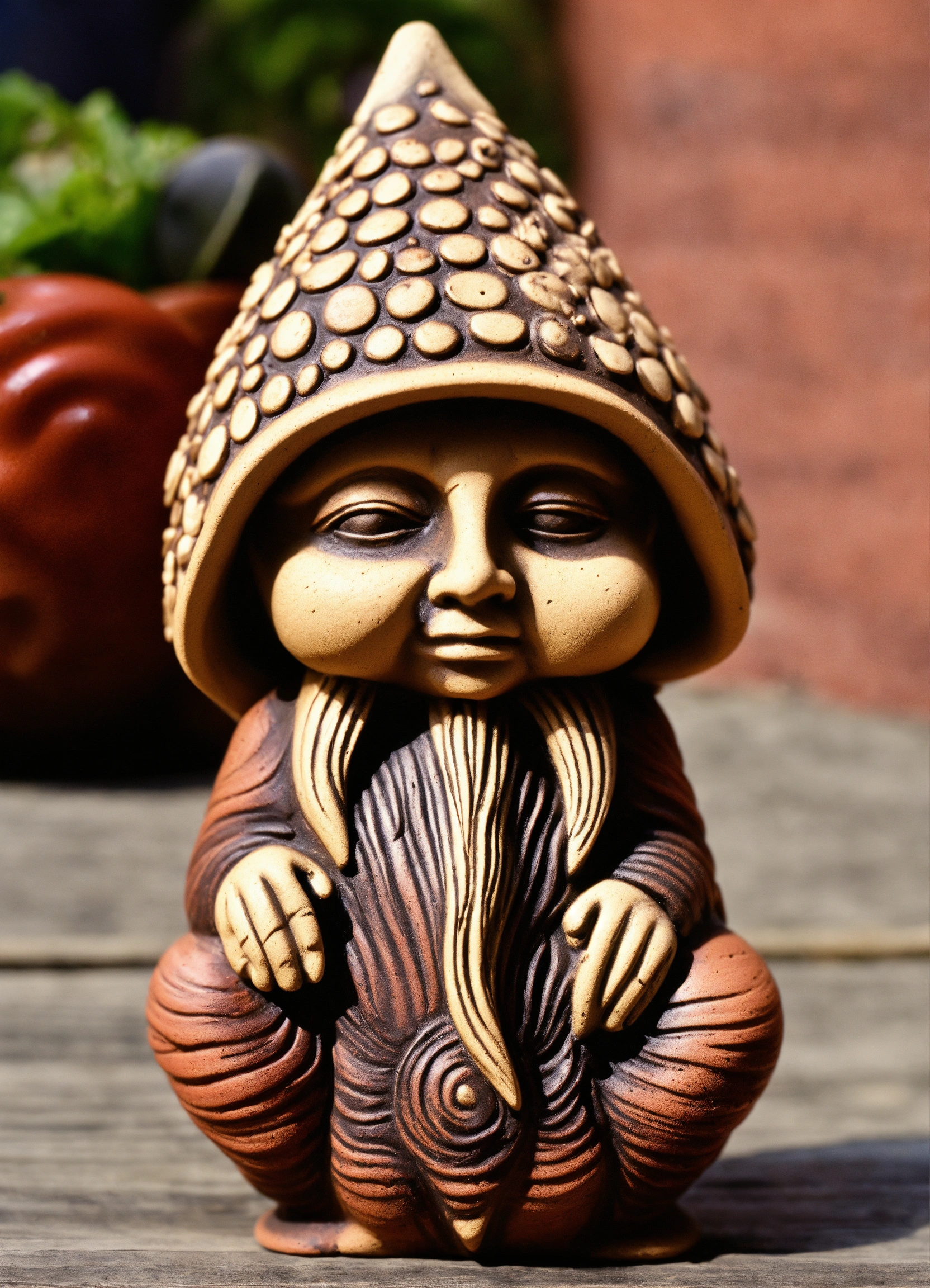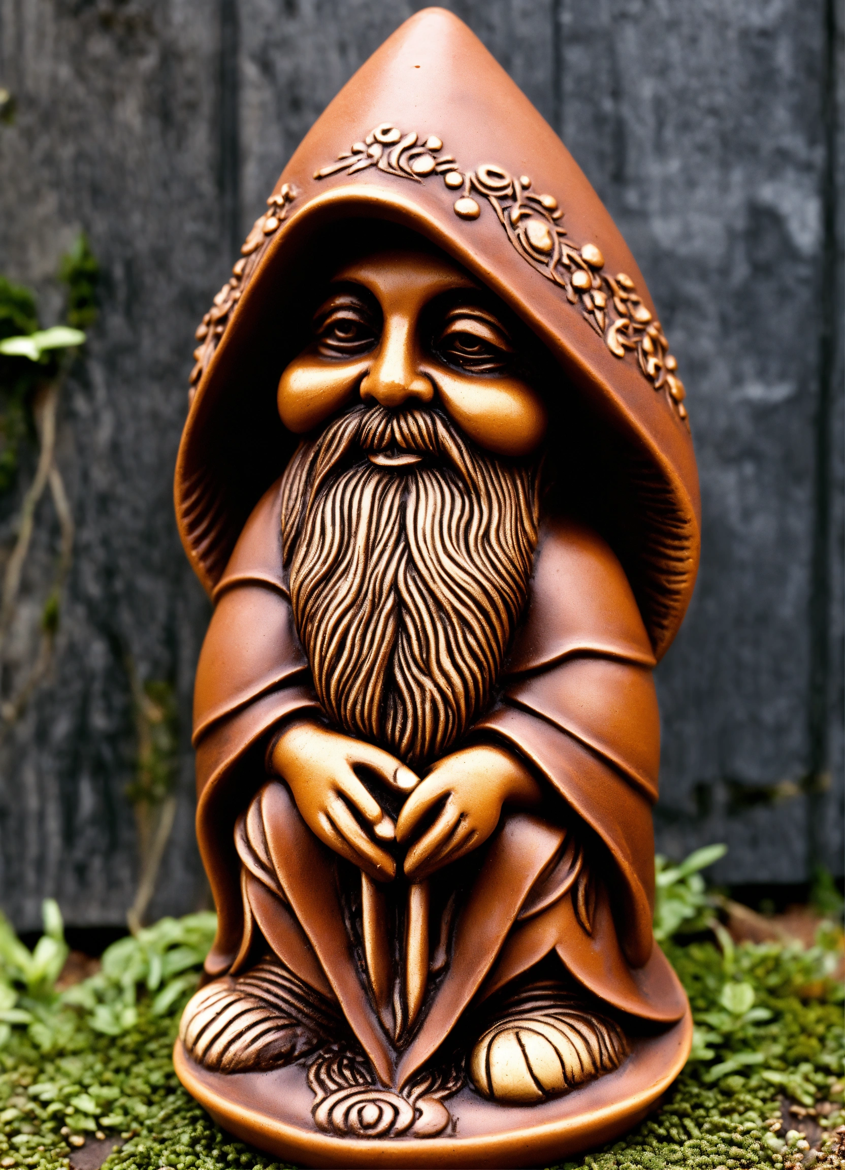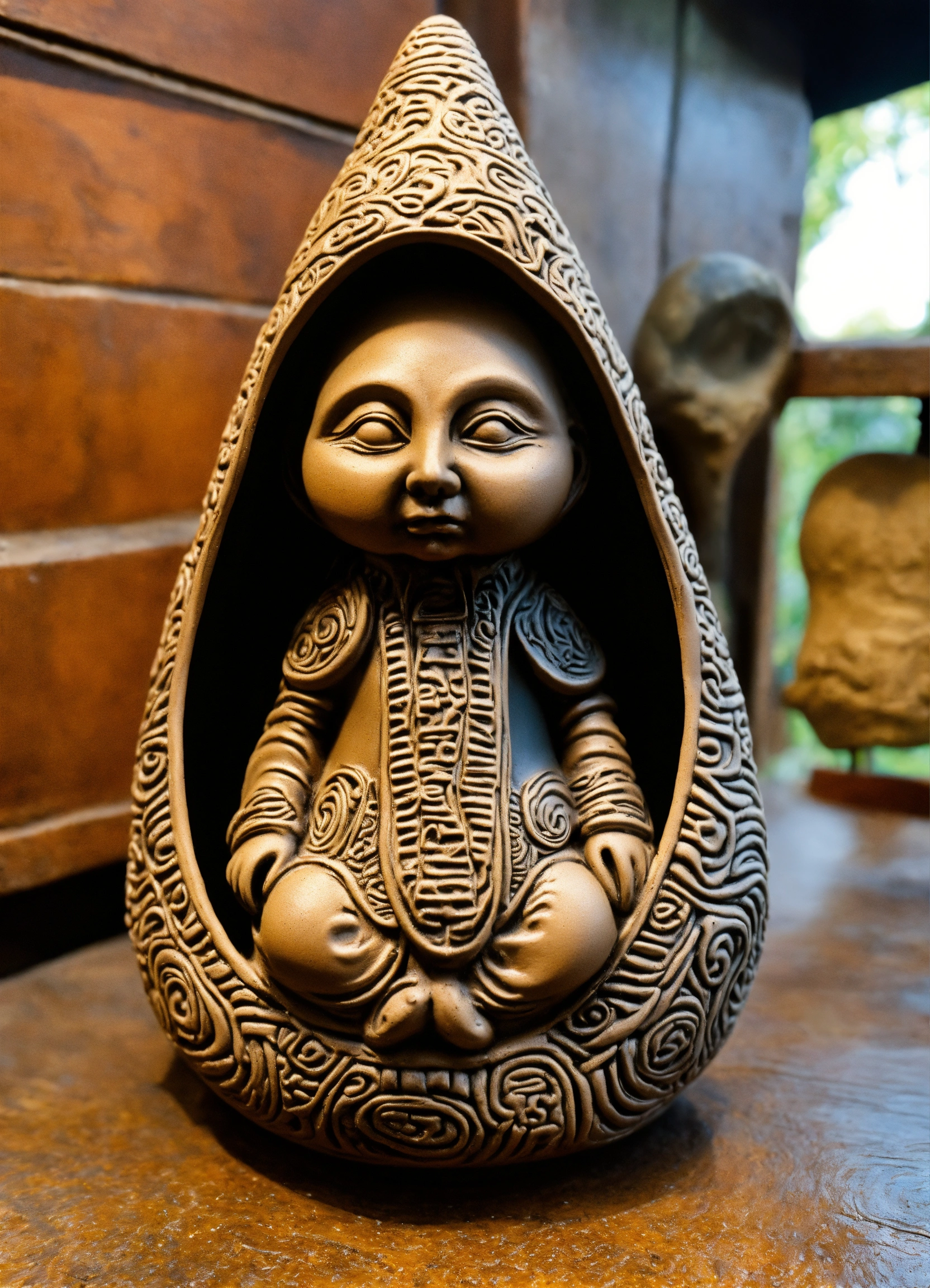 An ancient clay meditative hooded sculptured garden gnome ornament teardrop shaped, style of alex grey, h r giger, mushroom totem