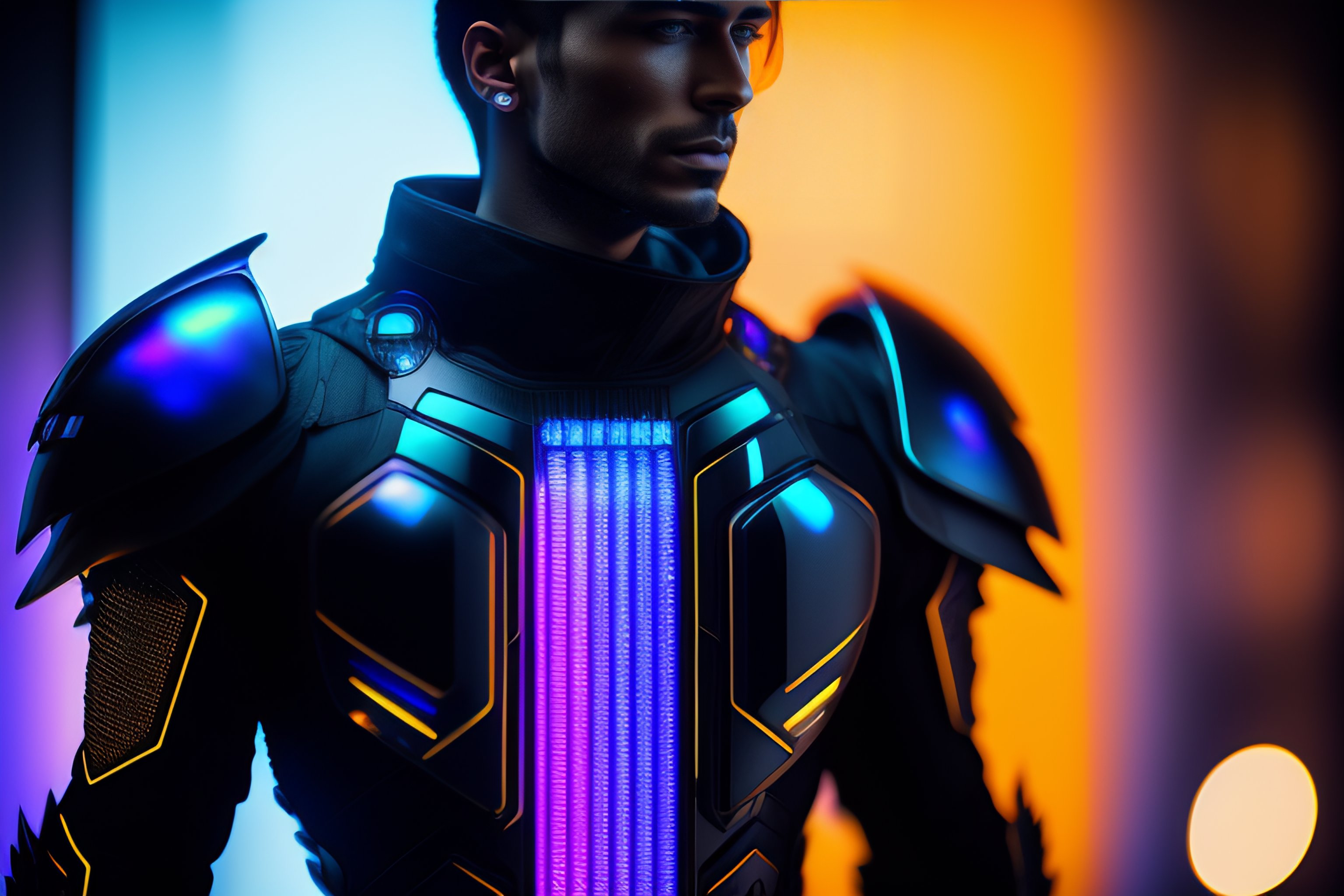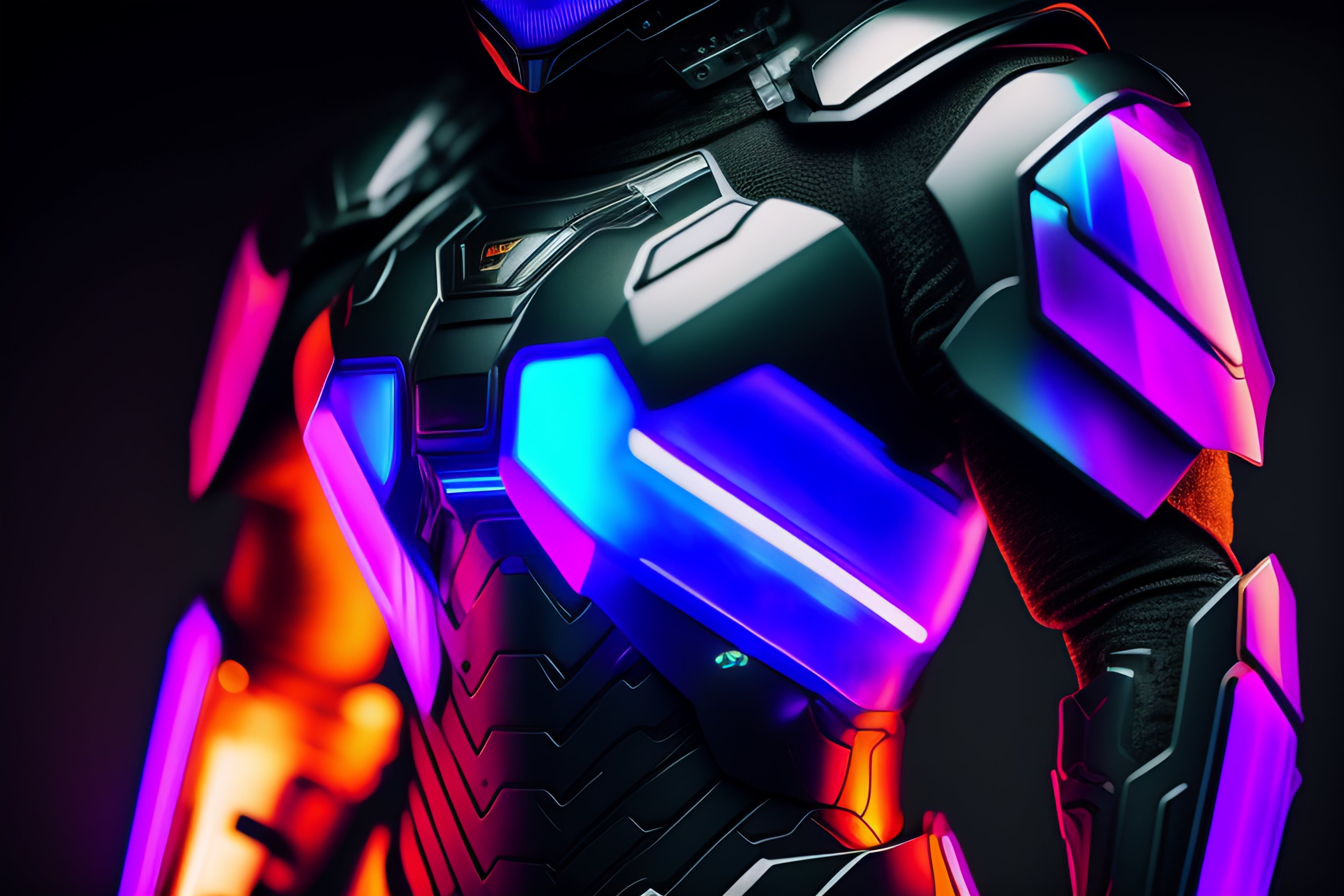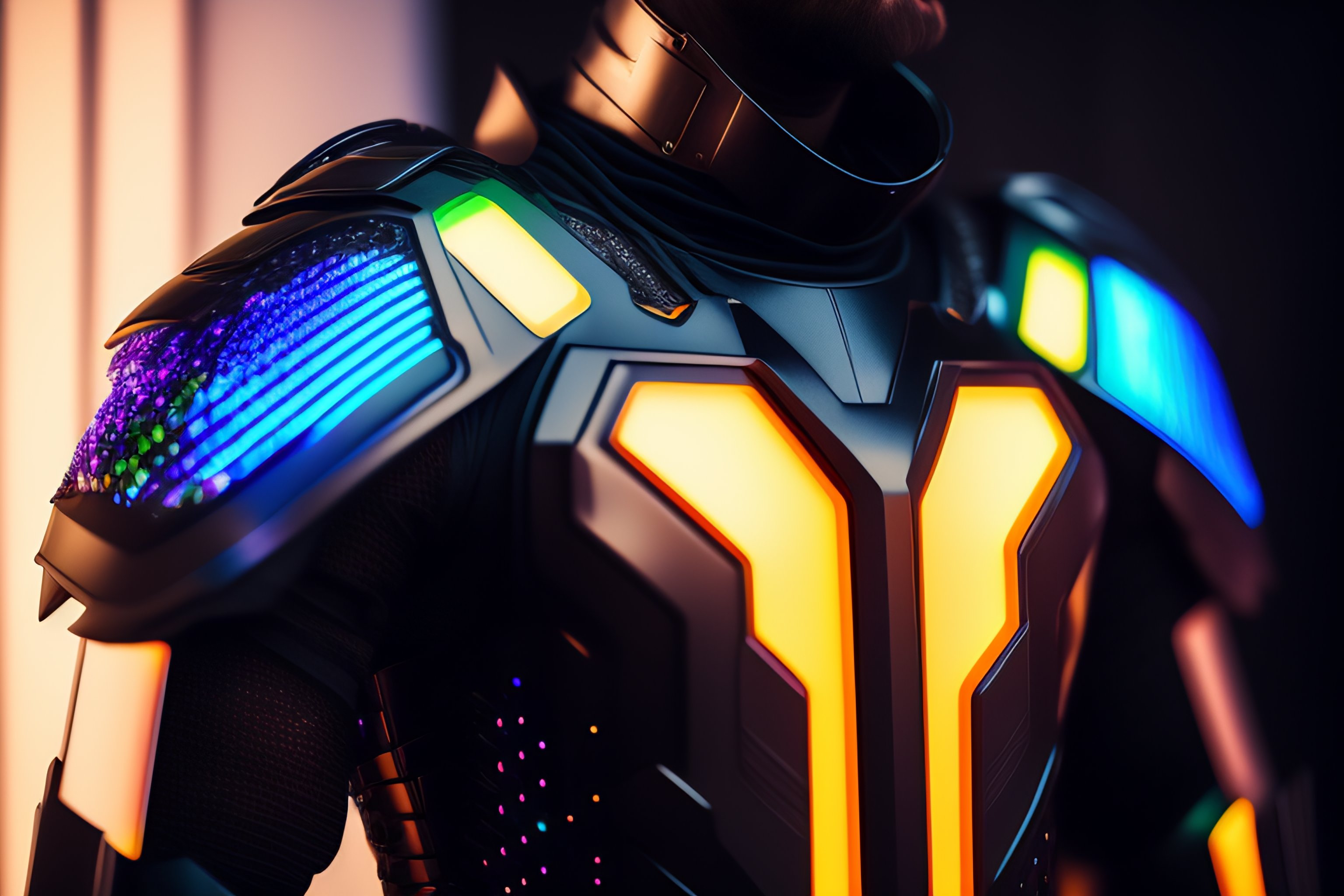 A photograph of a cyberpunk armour made of black titanium and some crystal, rgb leds rainbow, power suit, gradient, crystal, visible wires and microchip, holograph, crystal transparent torso, imposing, elegant, for men, modern minimalism, low poly lines, glitch core, dreamy, colorful, dystopia, godlike, mysterious