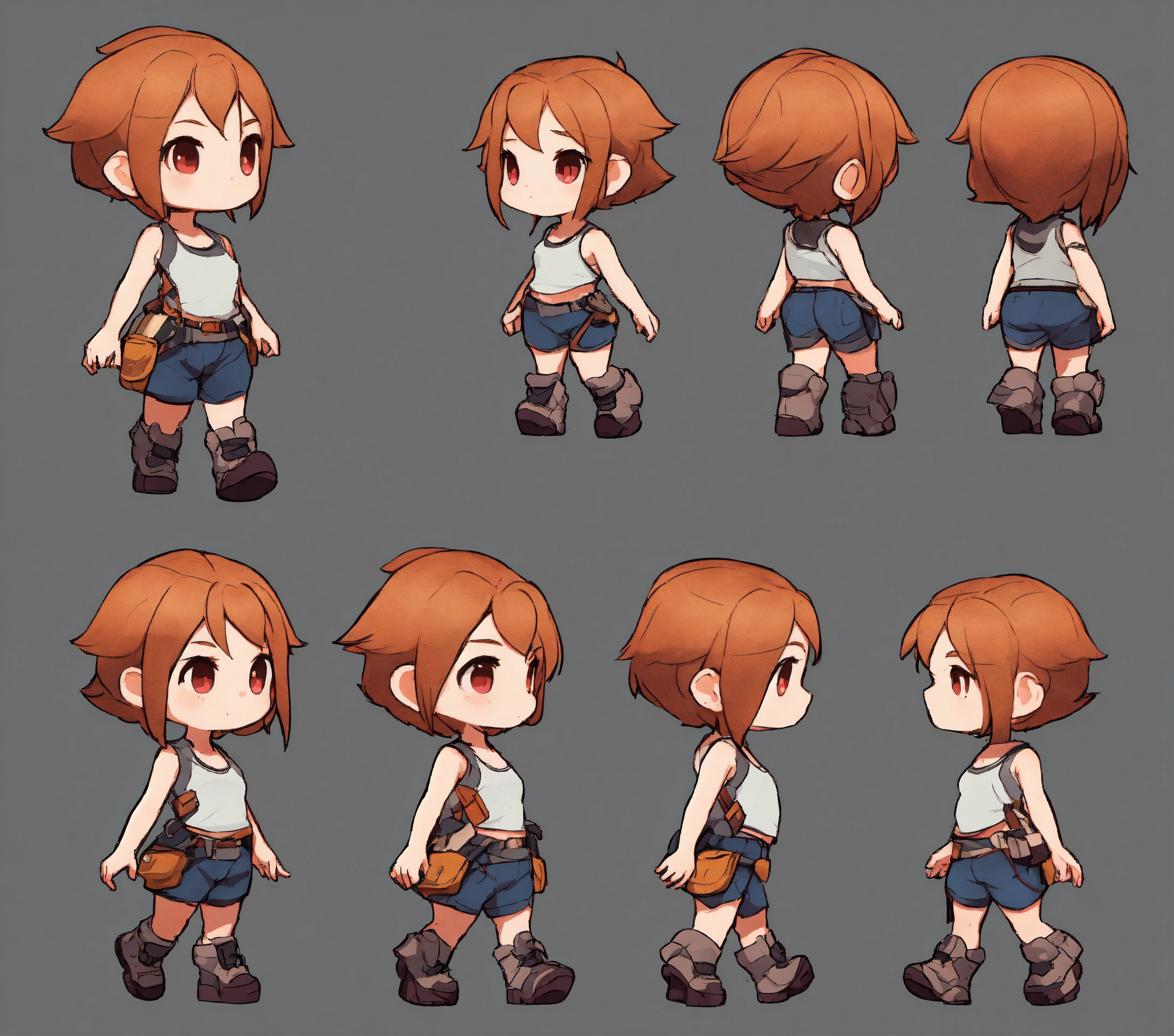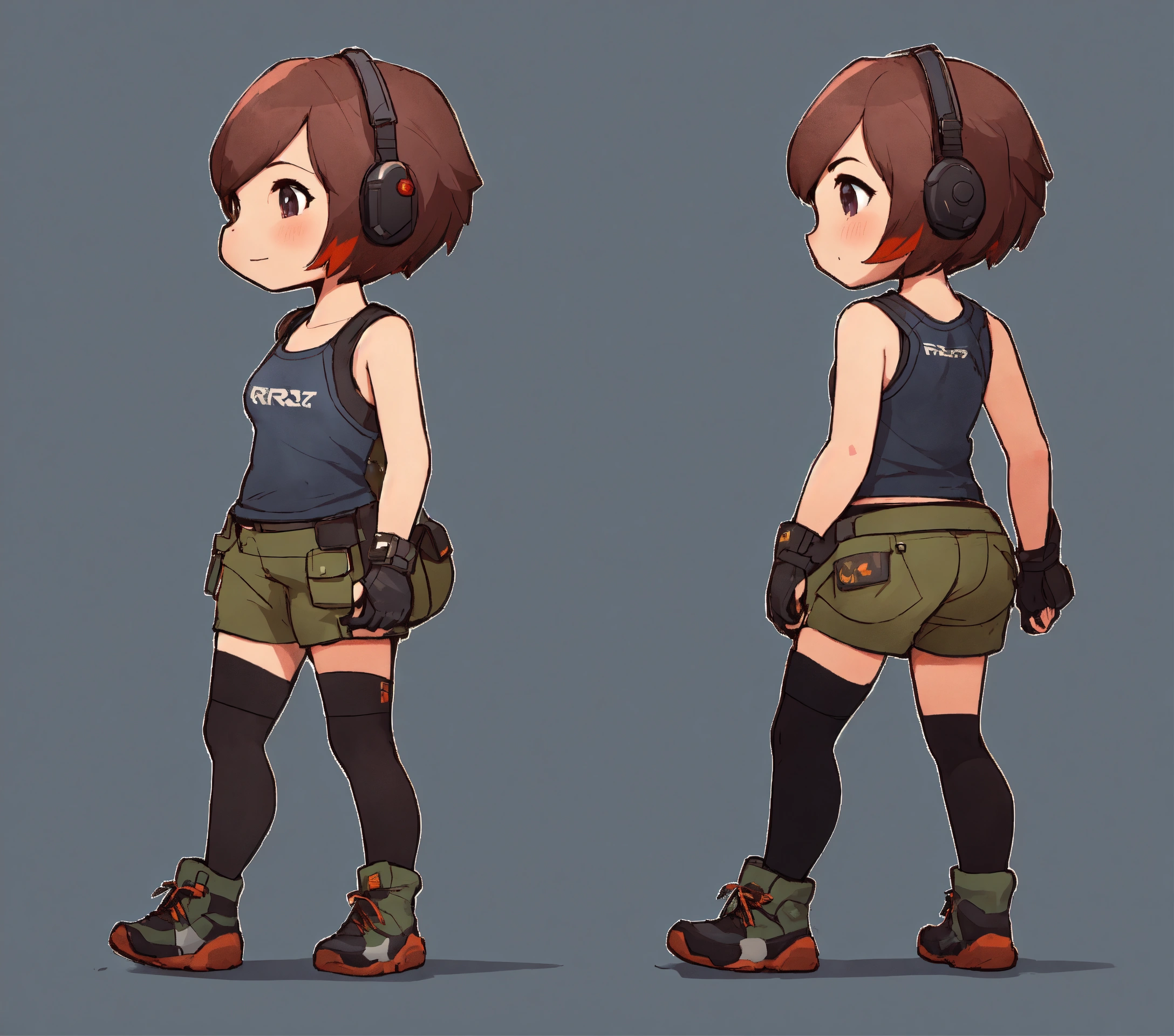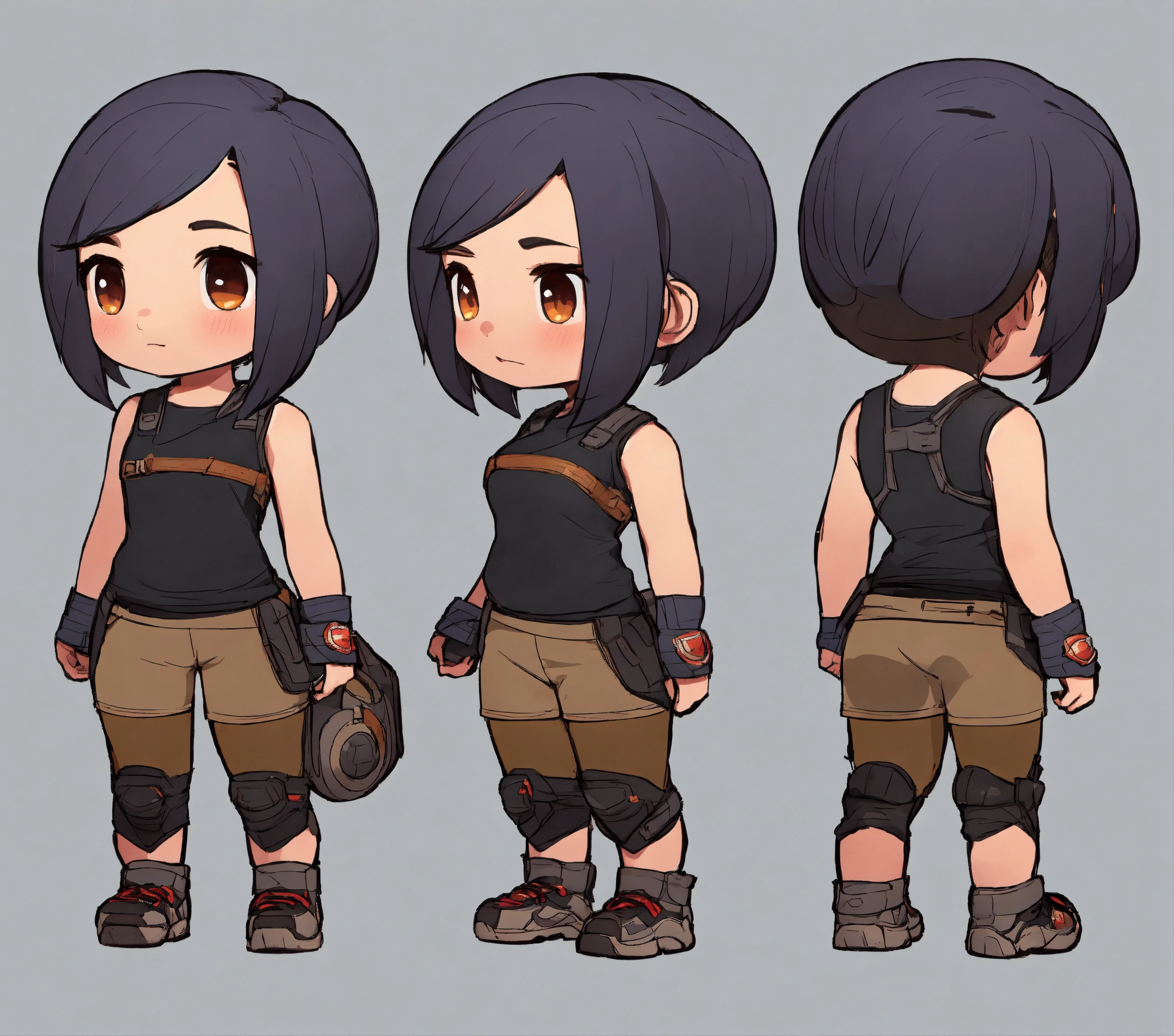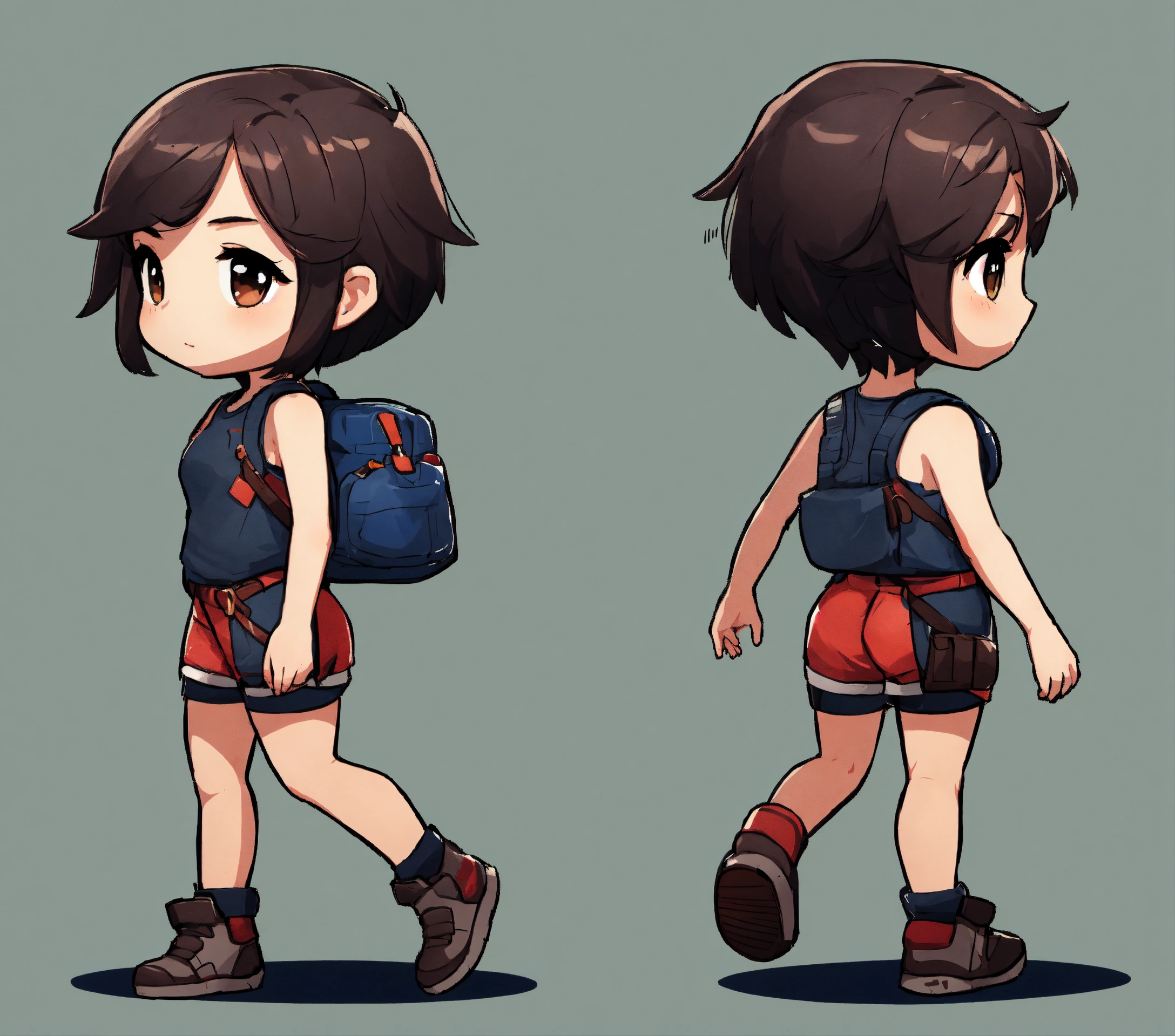 Game assets, concept art, girl, short hair, tank top, shorts, walking, full body view, side view, blank background, chibi proportions, artstyle by blizzard entertainment