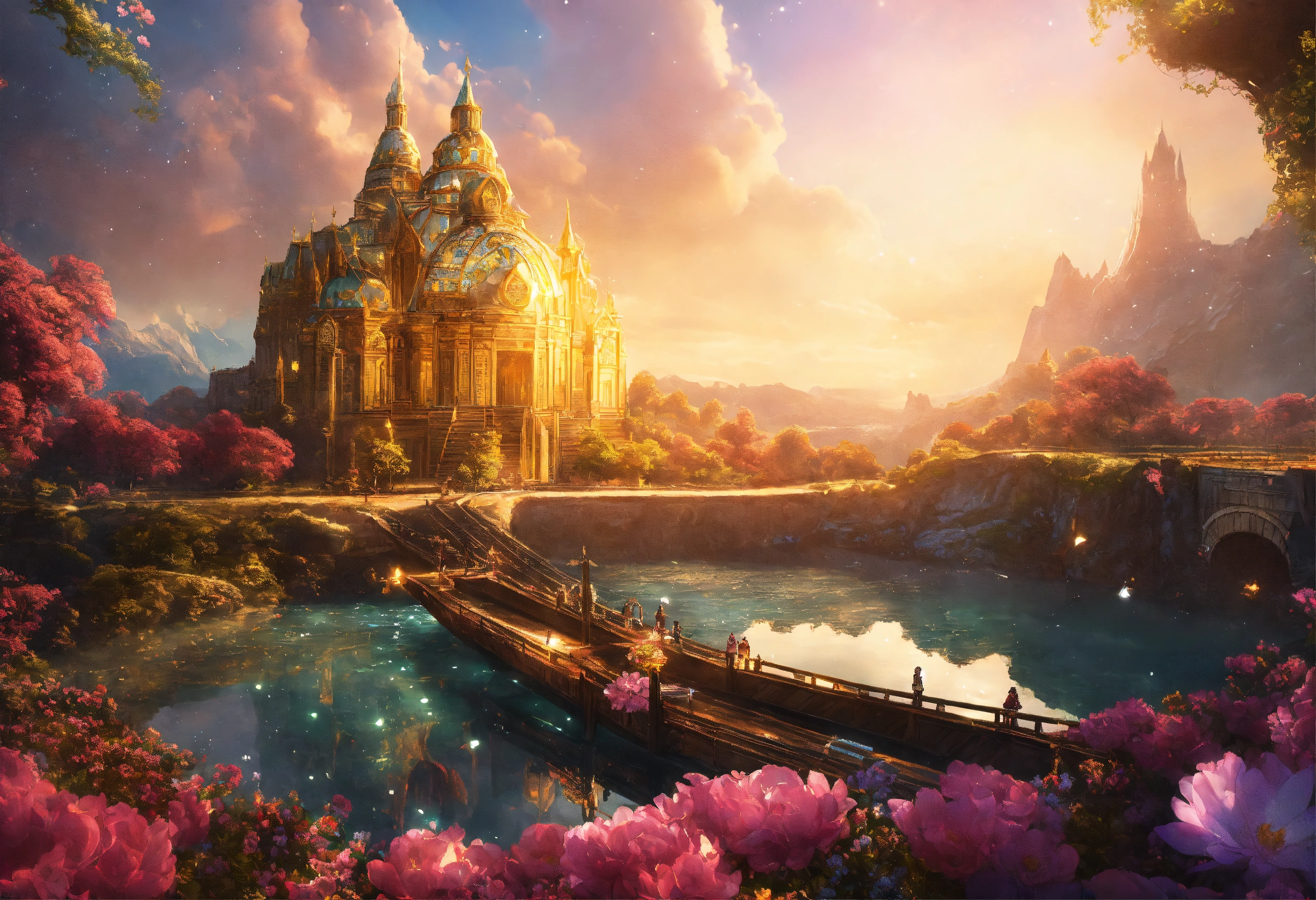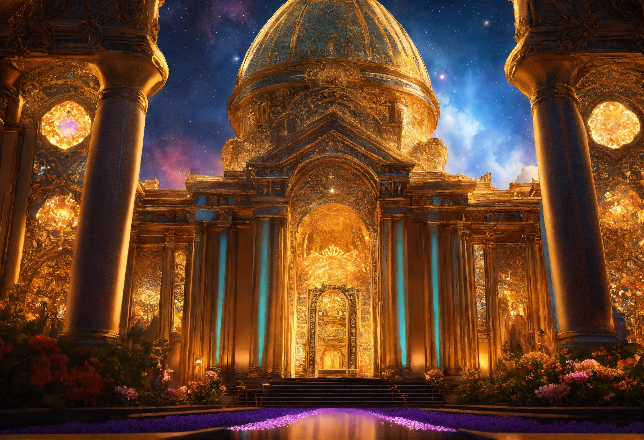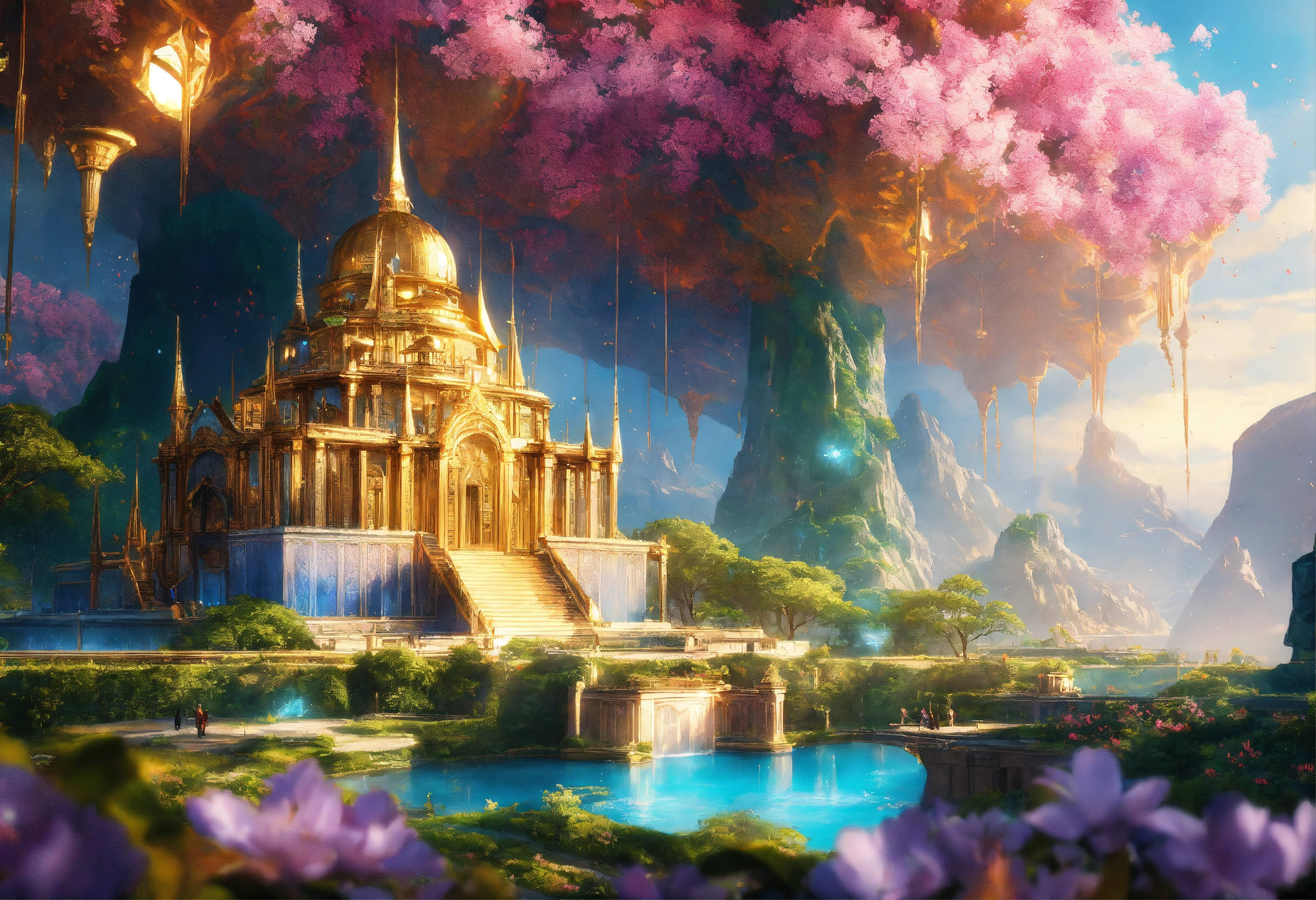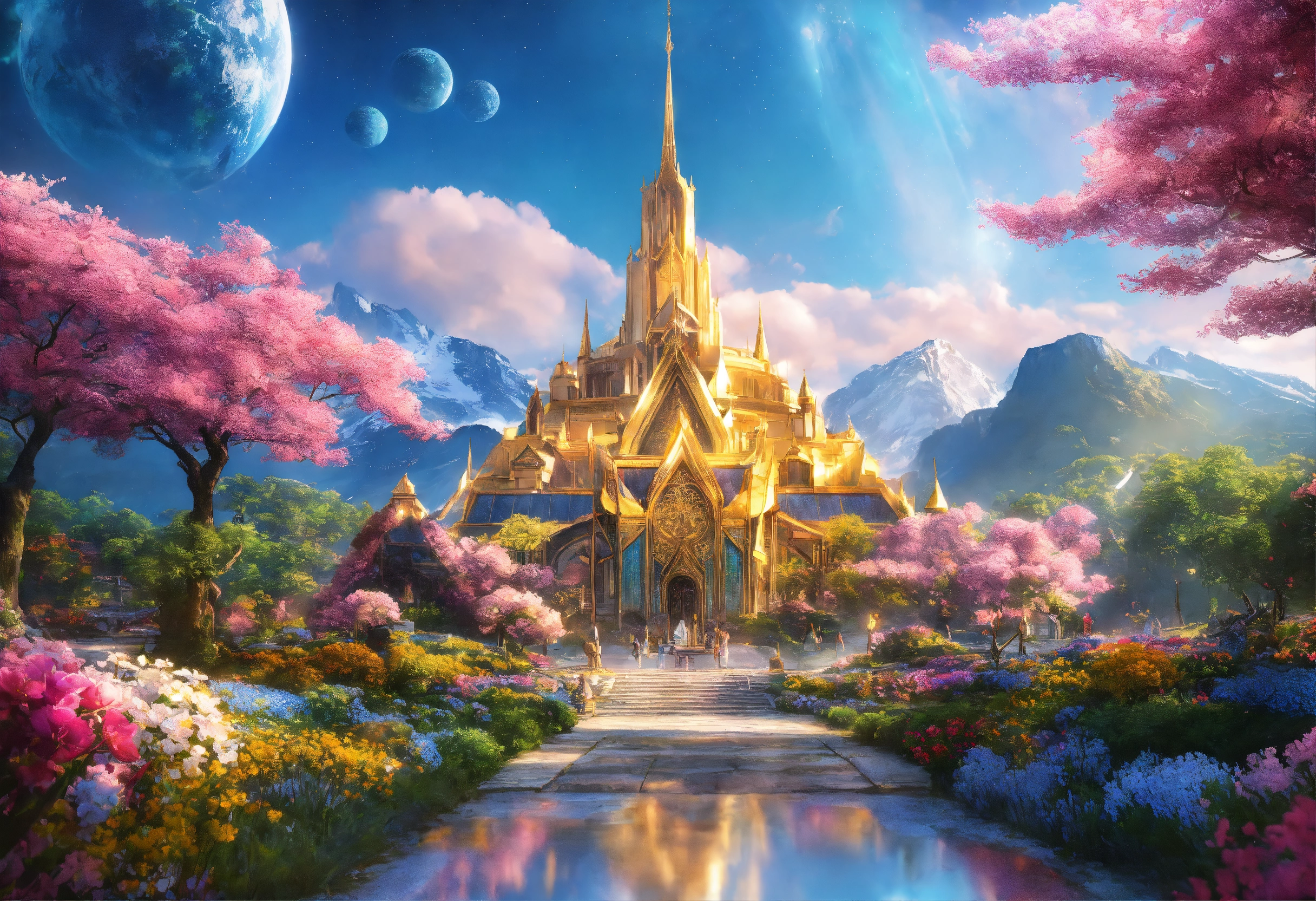 Asgard la cité celeste ou vivait les dieux faite d'une cité céleste avec des batisses et des temples d'or et de cristaux suspendu dans les étoiles, lieu de grande beauté et de luxe et une nature luxuriante de fleurs et colorées, 16k