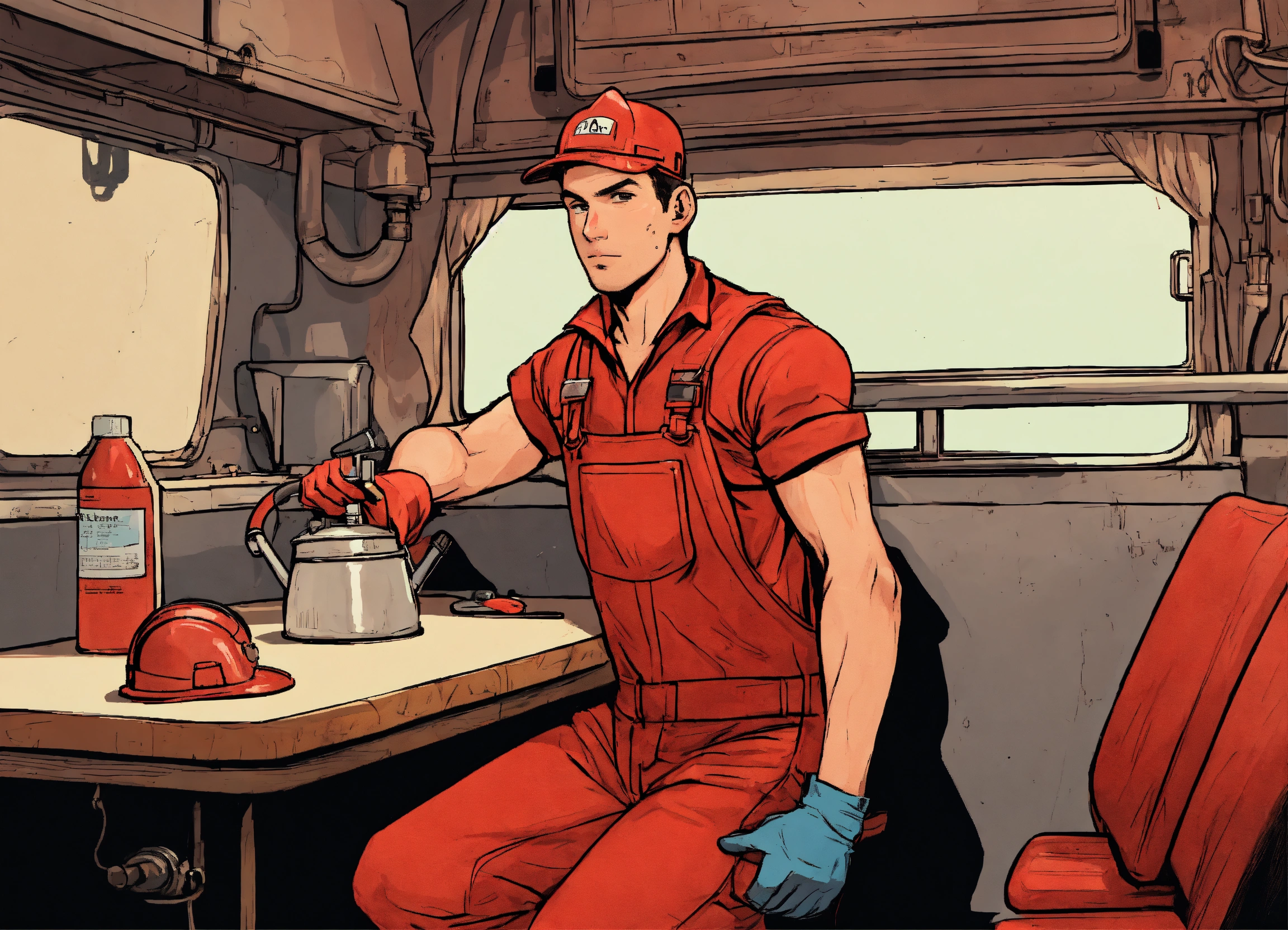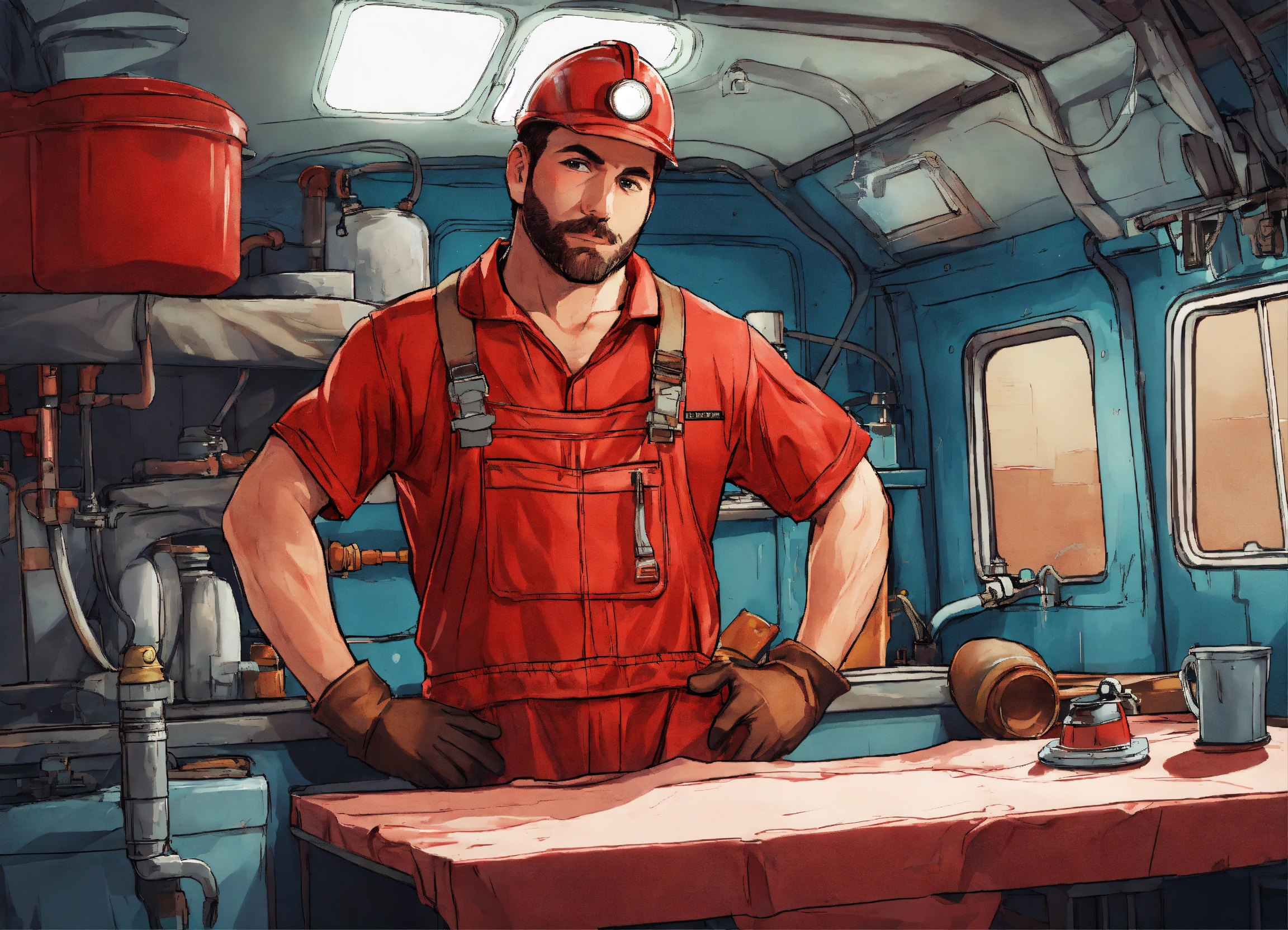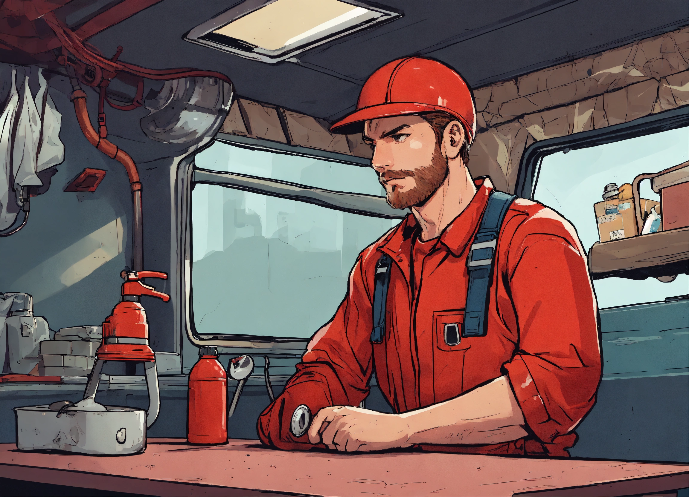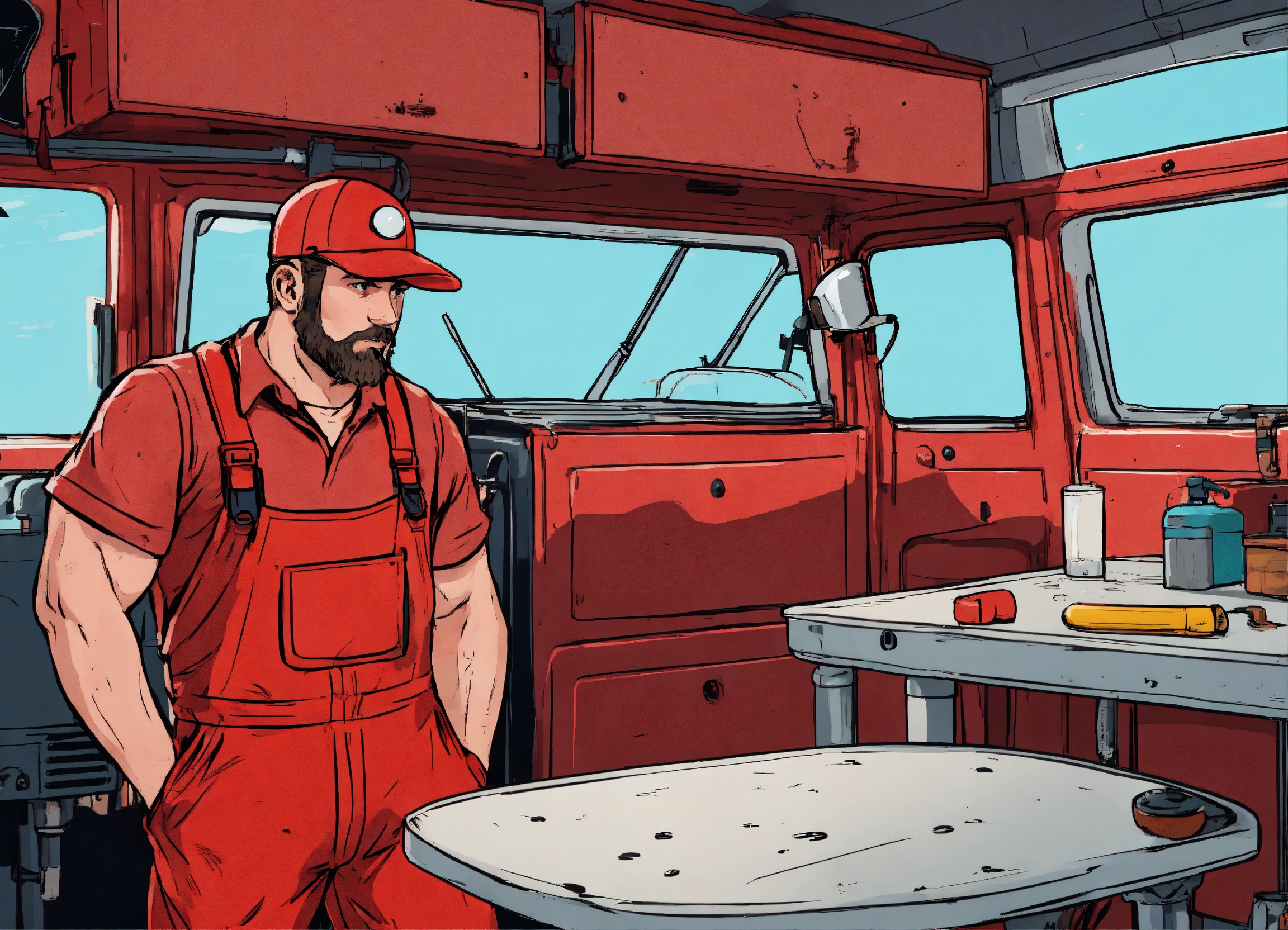 A plumber in a red overall outfit and a red hard helm is standing in front of a table inside a van, on the table lies a big and greasy cloth, comic style