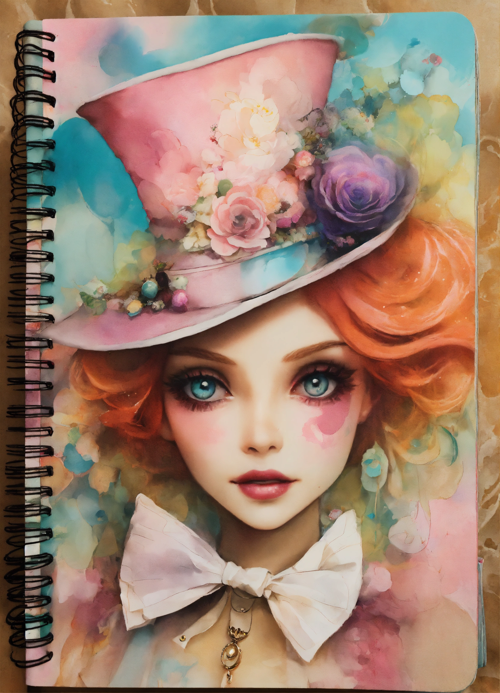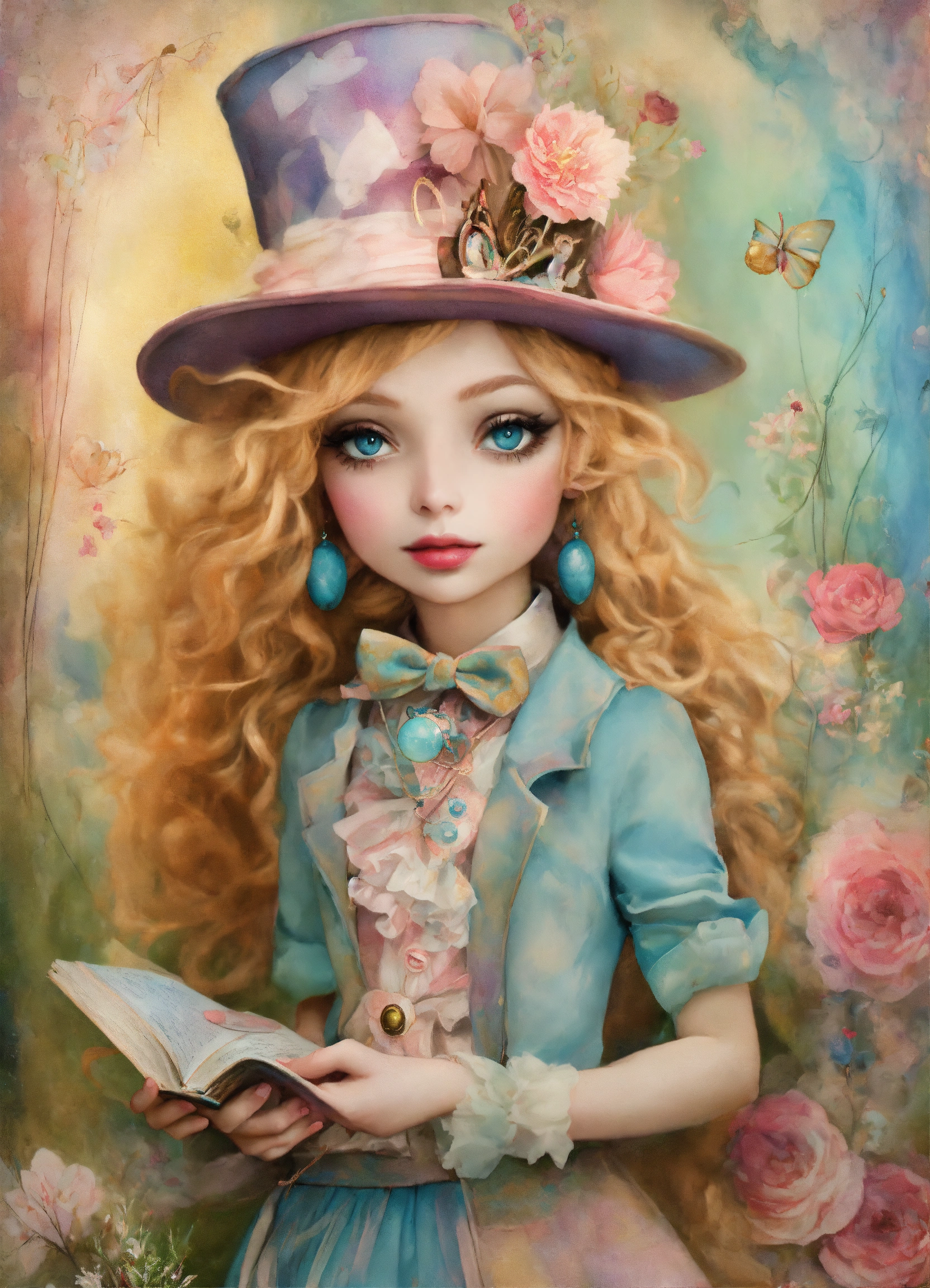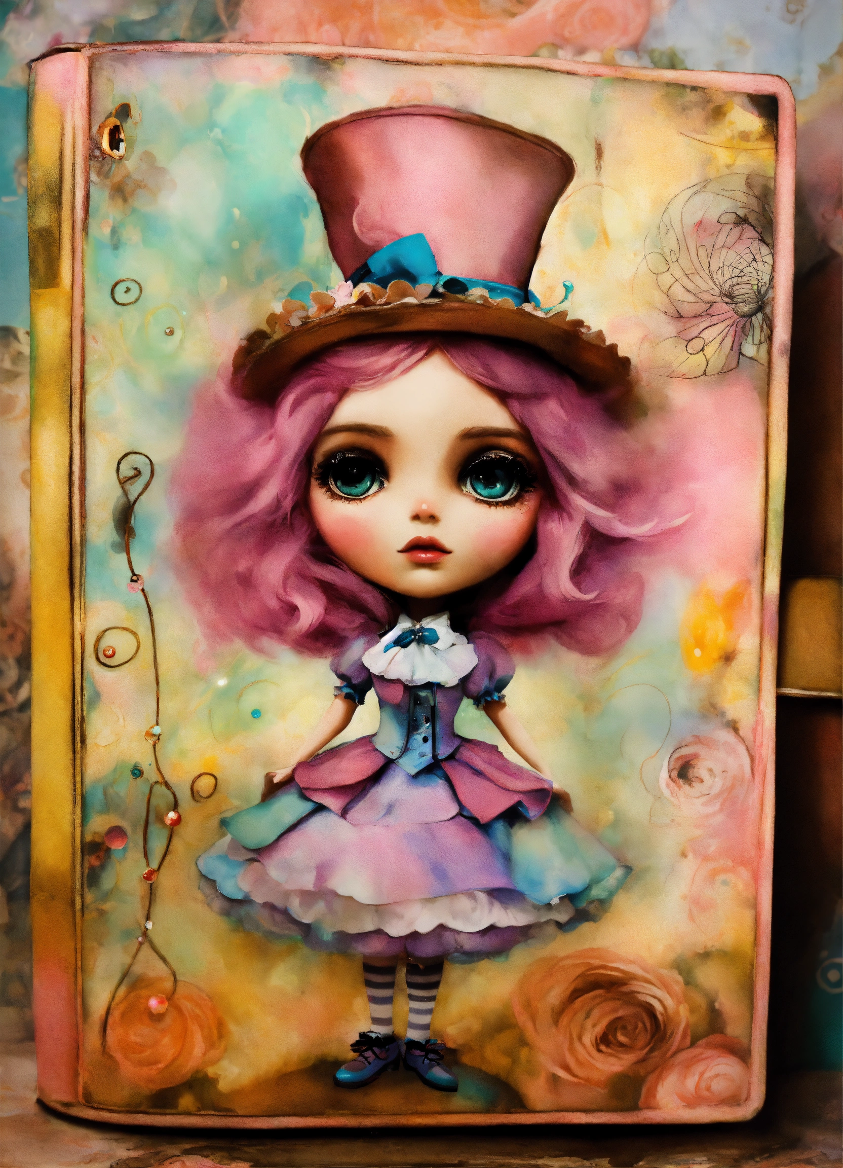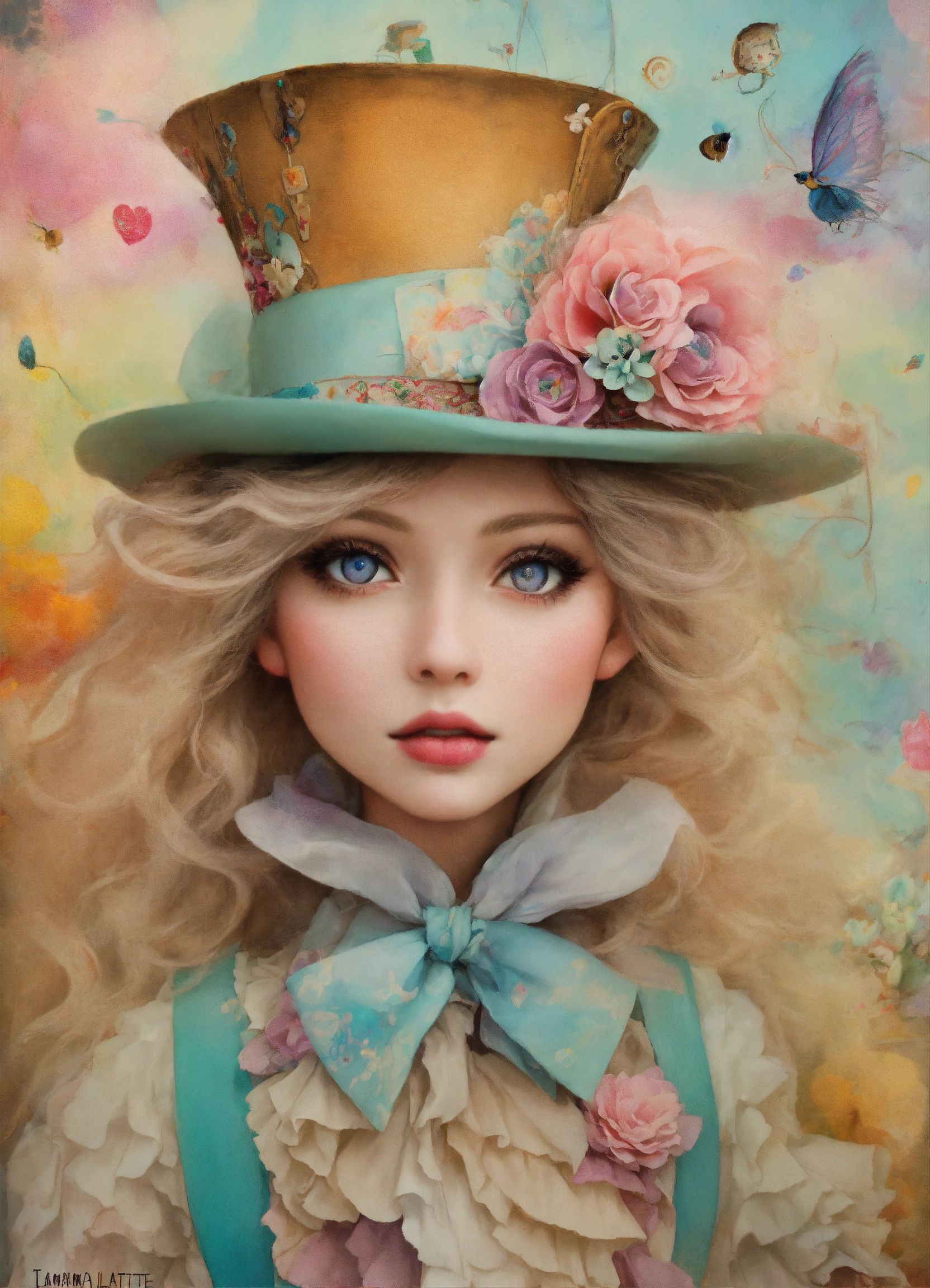 Shabby chic dreamy mist pastel junk journals whimsical cute quirky disney style the mad hatter alice in wonderland with big eyes in odd clothings, tamara laporte style, swirling magical fairytale abstract art style