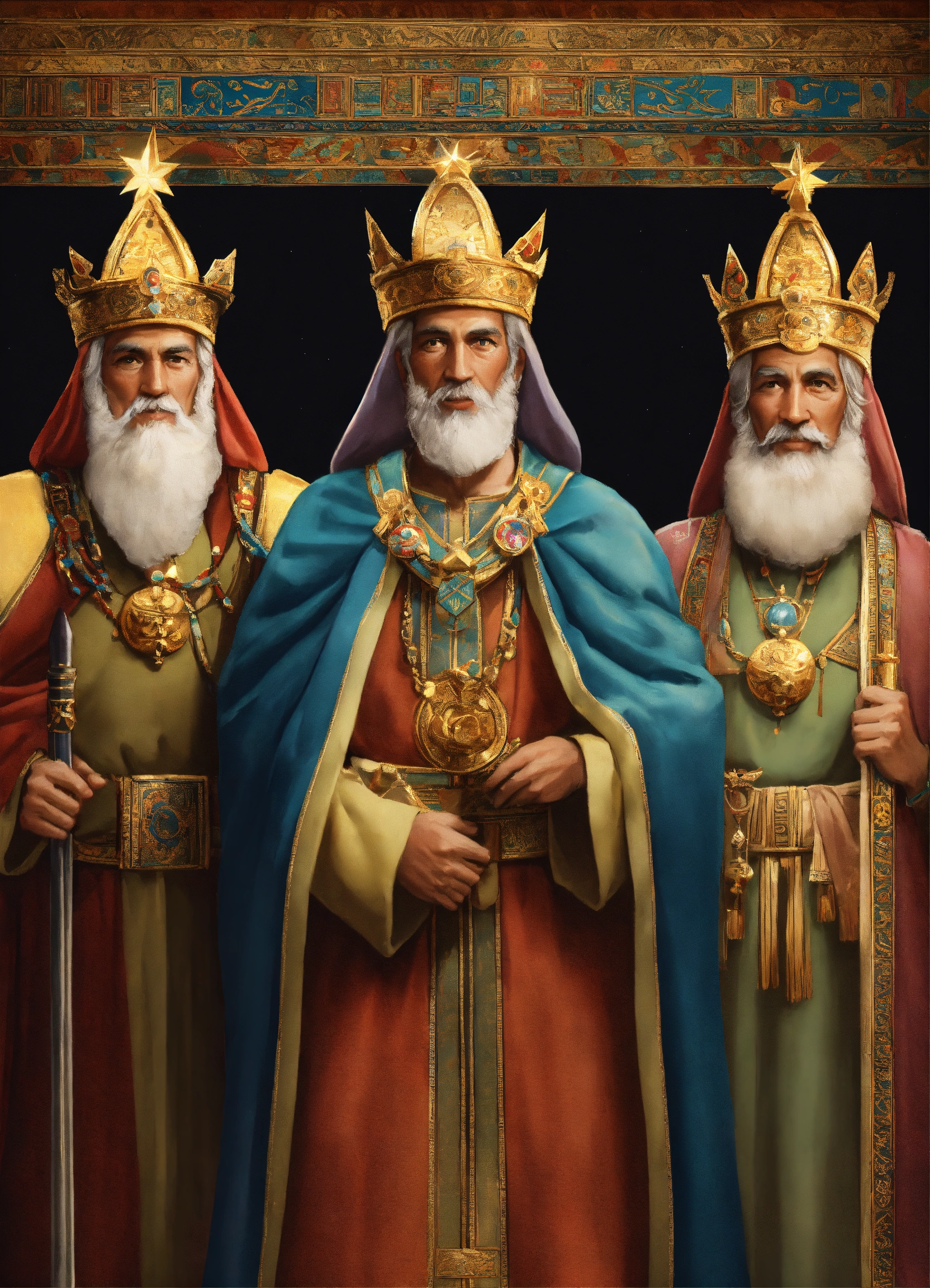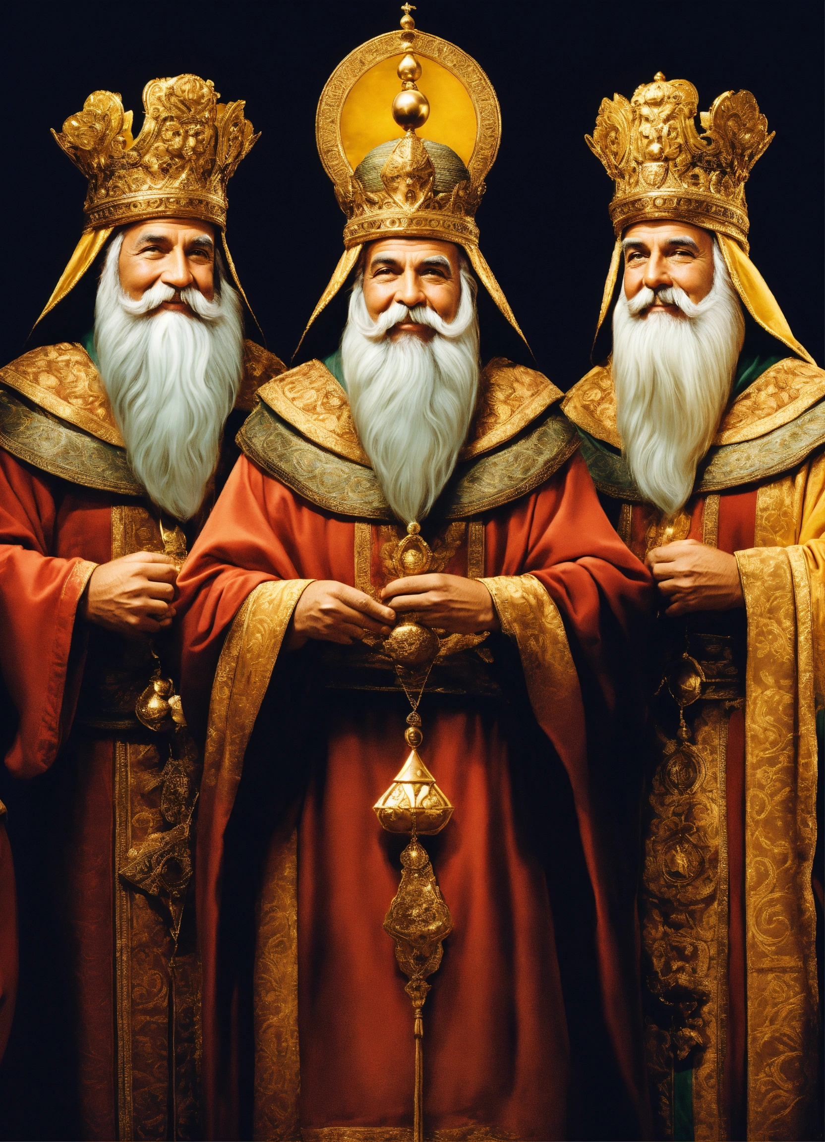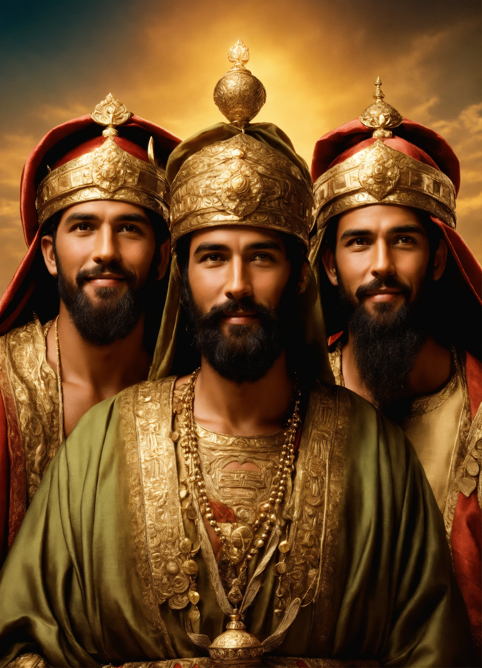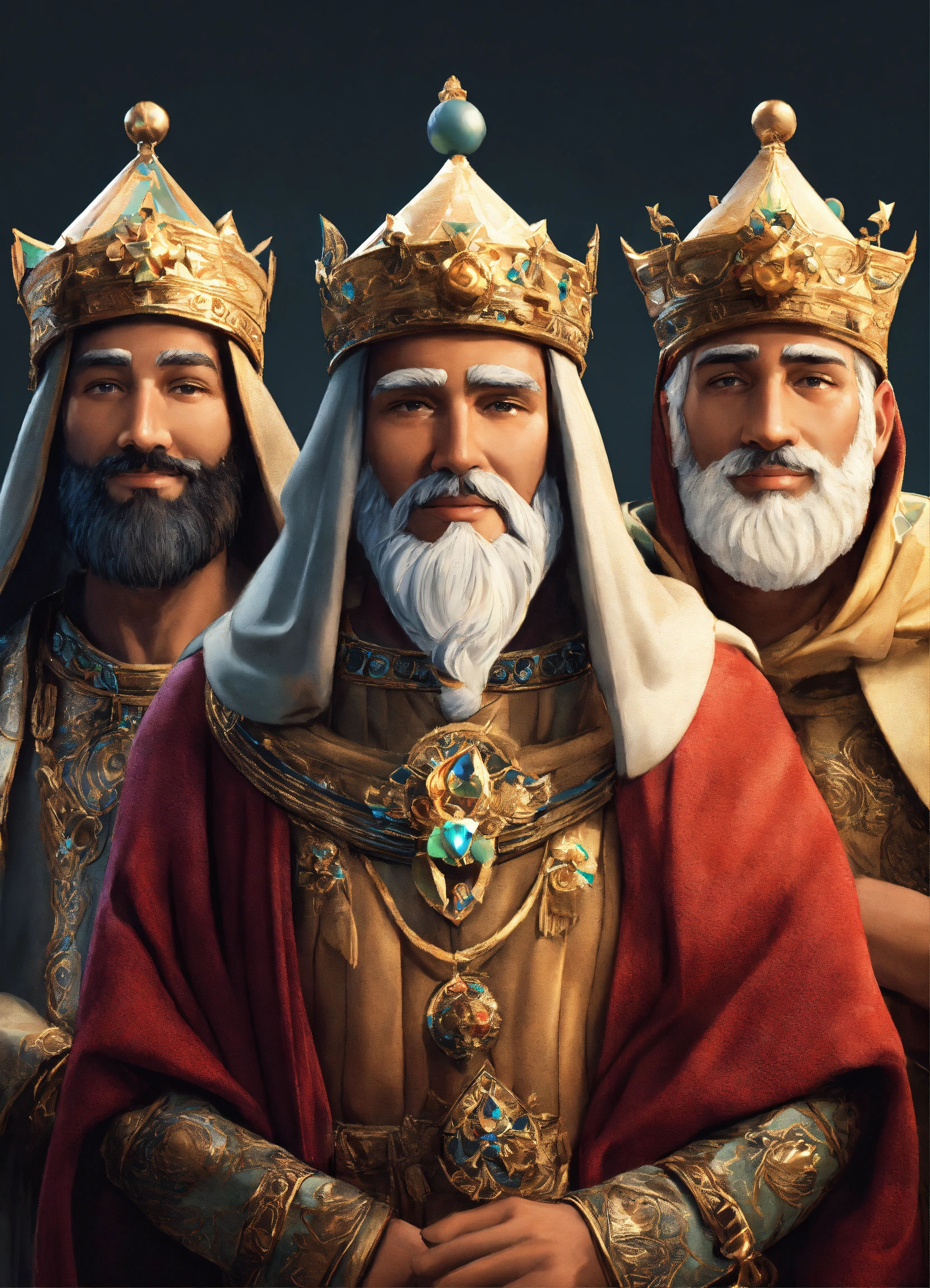 Three wise men, above head to chest level, looking straight into camera; animated, sharp edges, 16 k, smiling each differently with head garb.