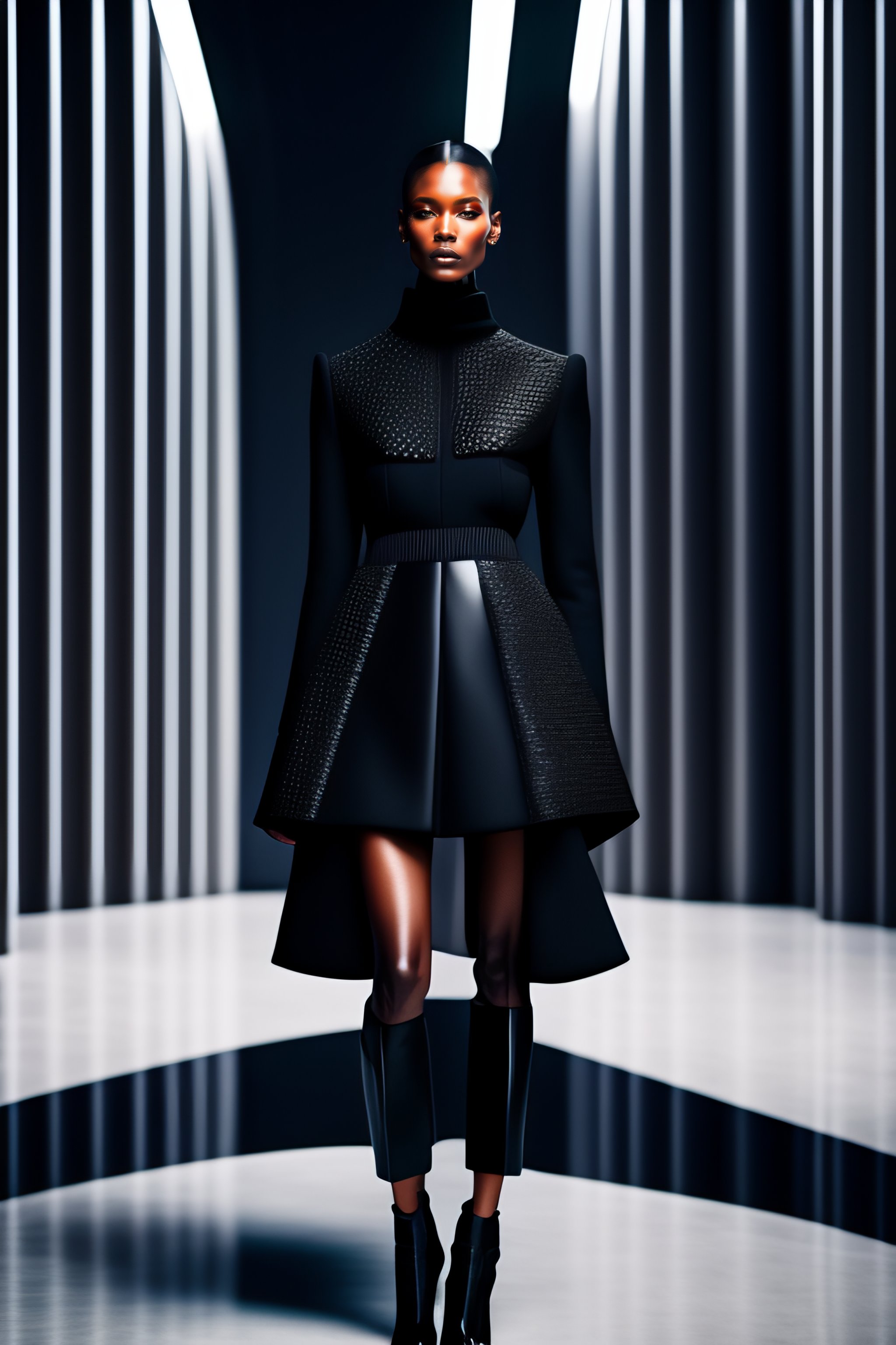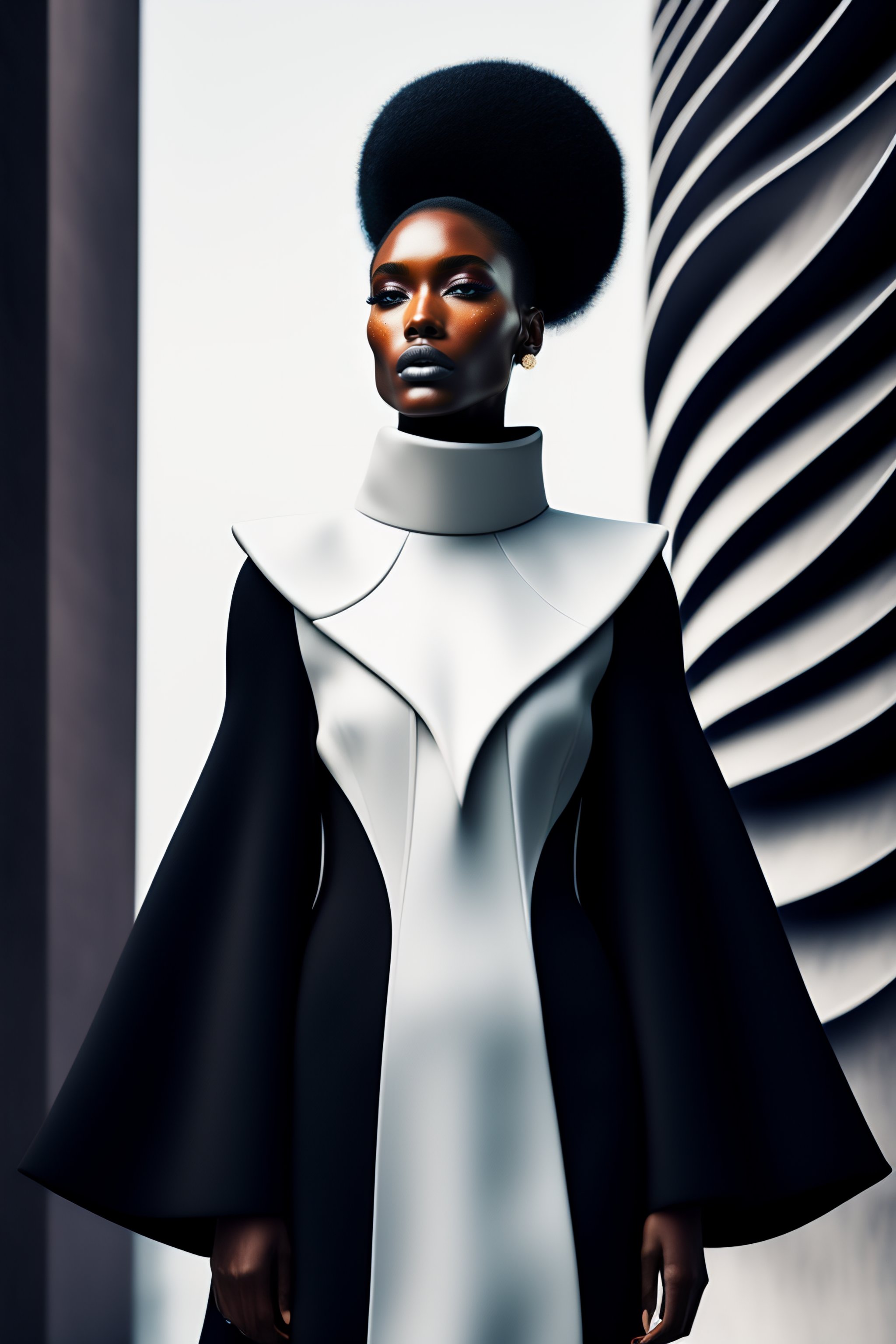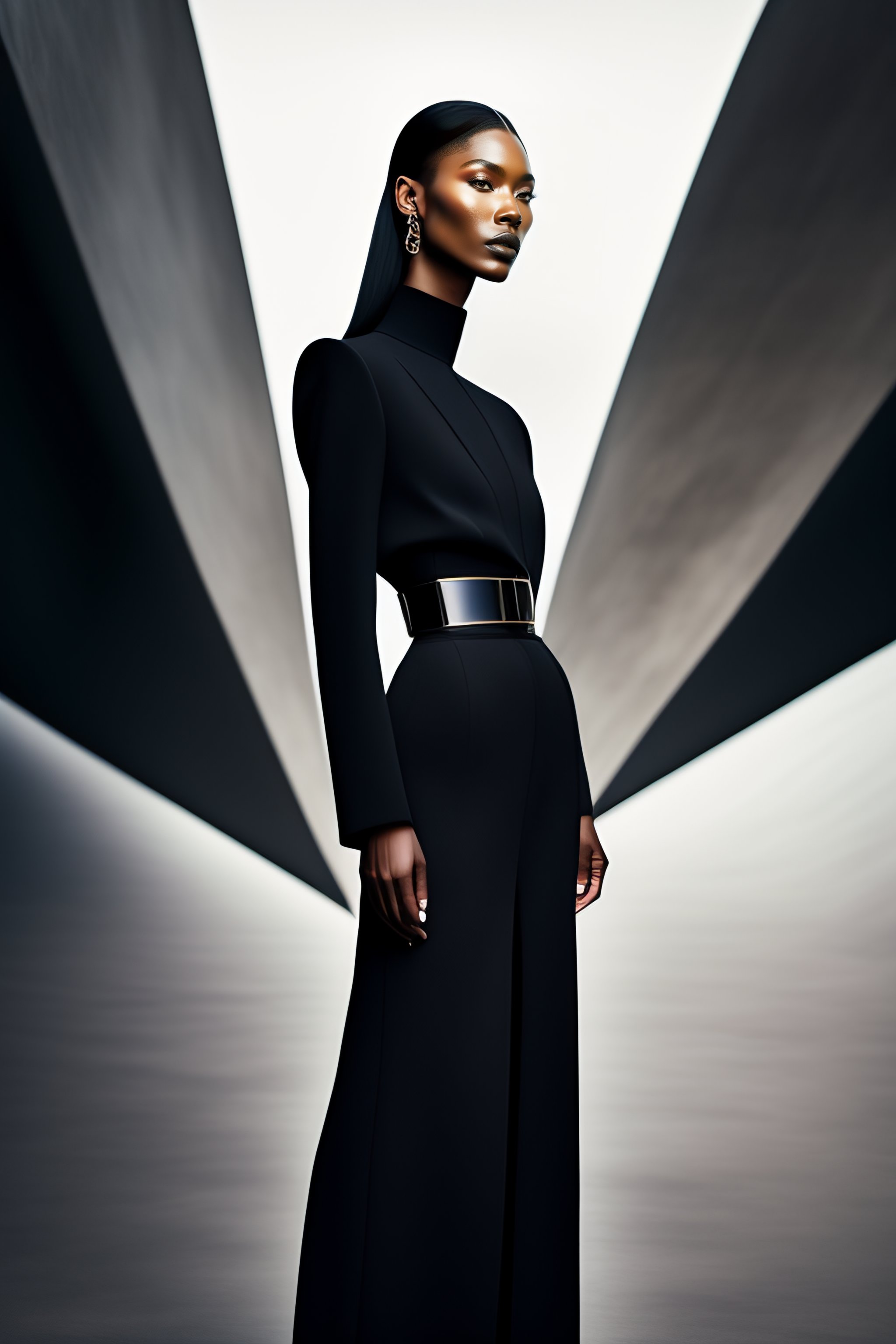 Hyperrealistic haute couture fashion model wearing black outfit by balenciaga, photoshoot in the style of kinfolk magazine in front of brutalist parametric futuristic architecture by zaha hadid, surrealism
